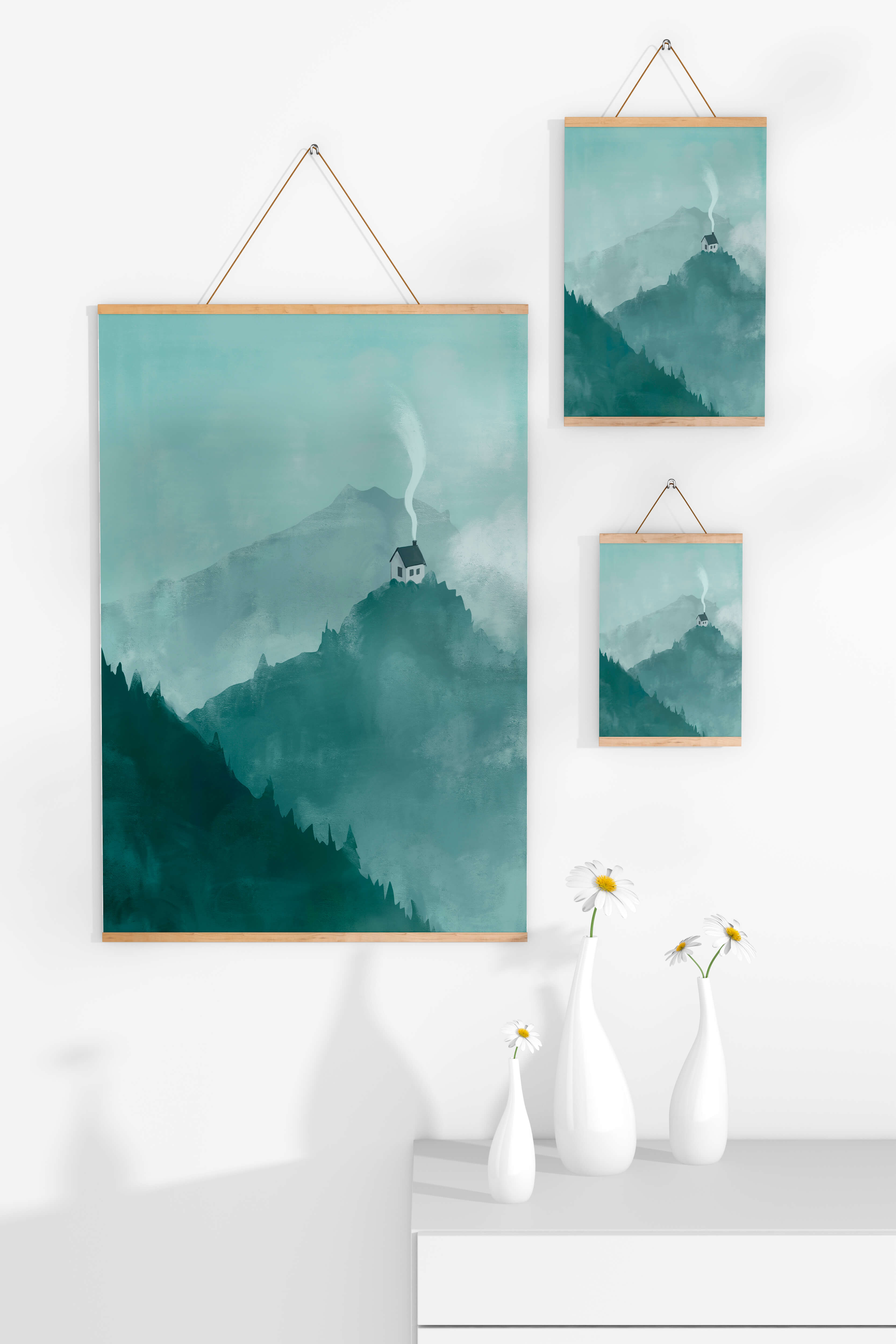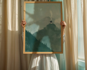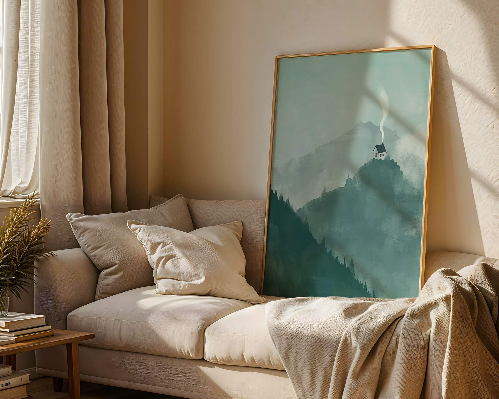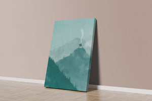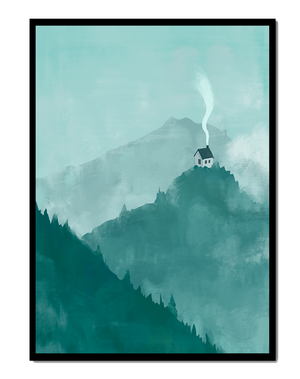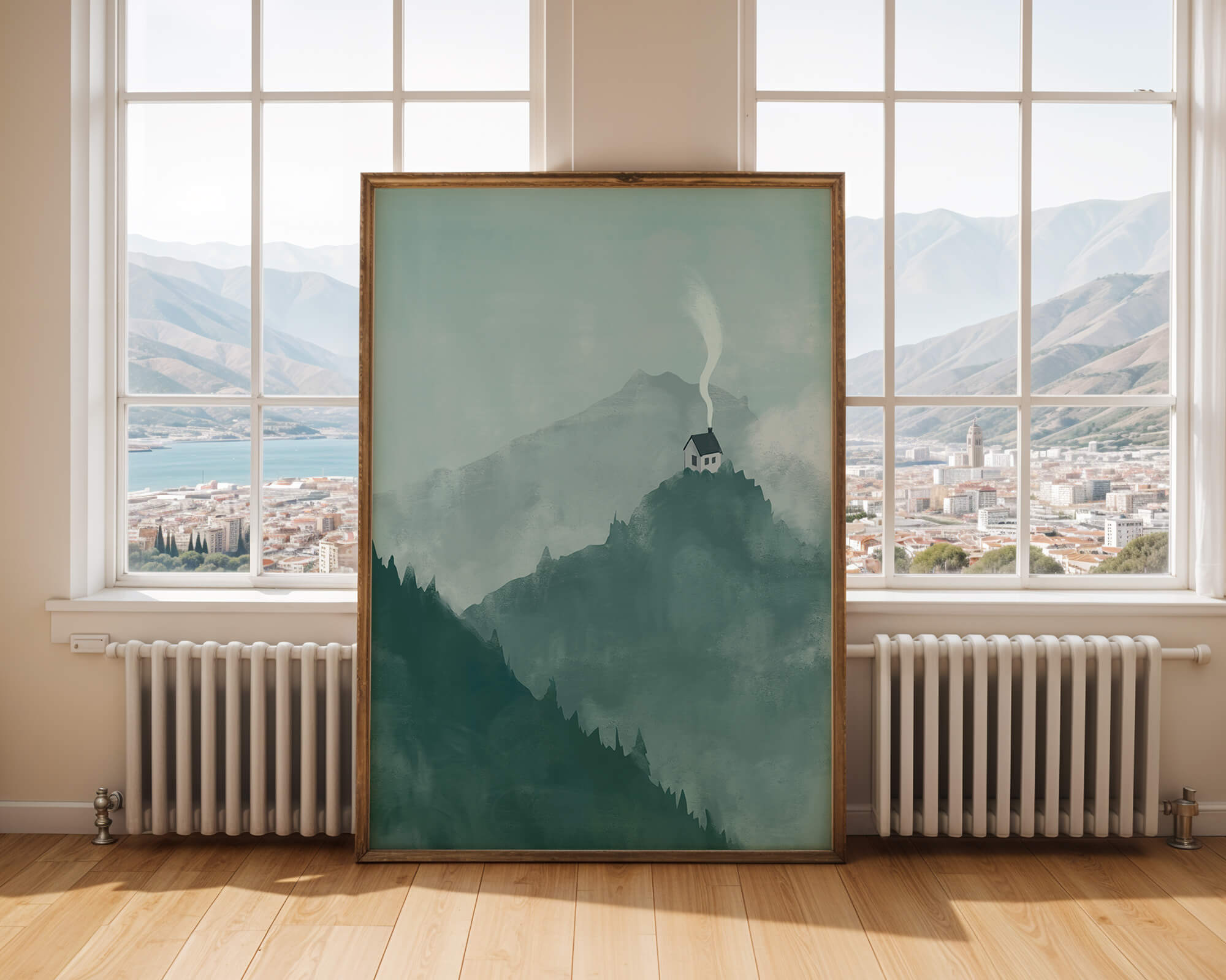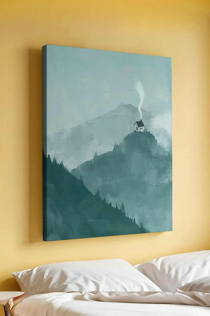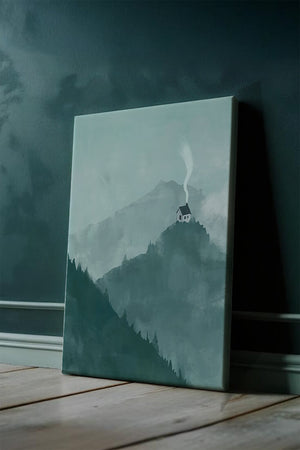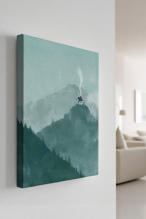 Los sutiles tonos de verde y azul crean un telón de fondo relajante, evocando sentimientos de soledad y paz. En el centro de la obra se encuentra una acogedora cabaña, posada en la cima de una montaña, con un delgado hilo de humo que se eleva suavemente desde su chimenea para desvanecerse en el cielo. Las capas de colinas brumosas en el fondo realzan la sensación de profundidad y serenidad en la escena. Ideal para los amantes de la naturaleza, esta obra lleva la esencia de un retiro montañoso remoto a cualquier espacio. La combinación del efecto acuarela y los colores suaves la convierten en una pieza perfecta para añadir tranquilidad a tu sala o dormitorio, invitando una sensación de calma y relajación a tu hogar.| Tipo |
