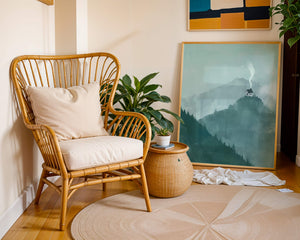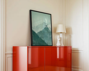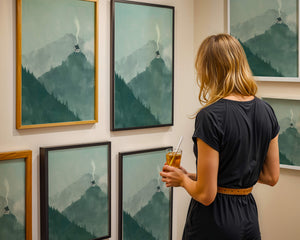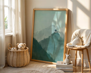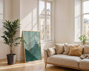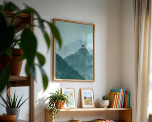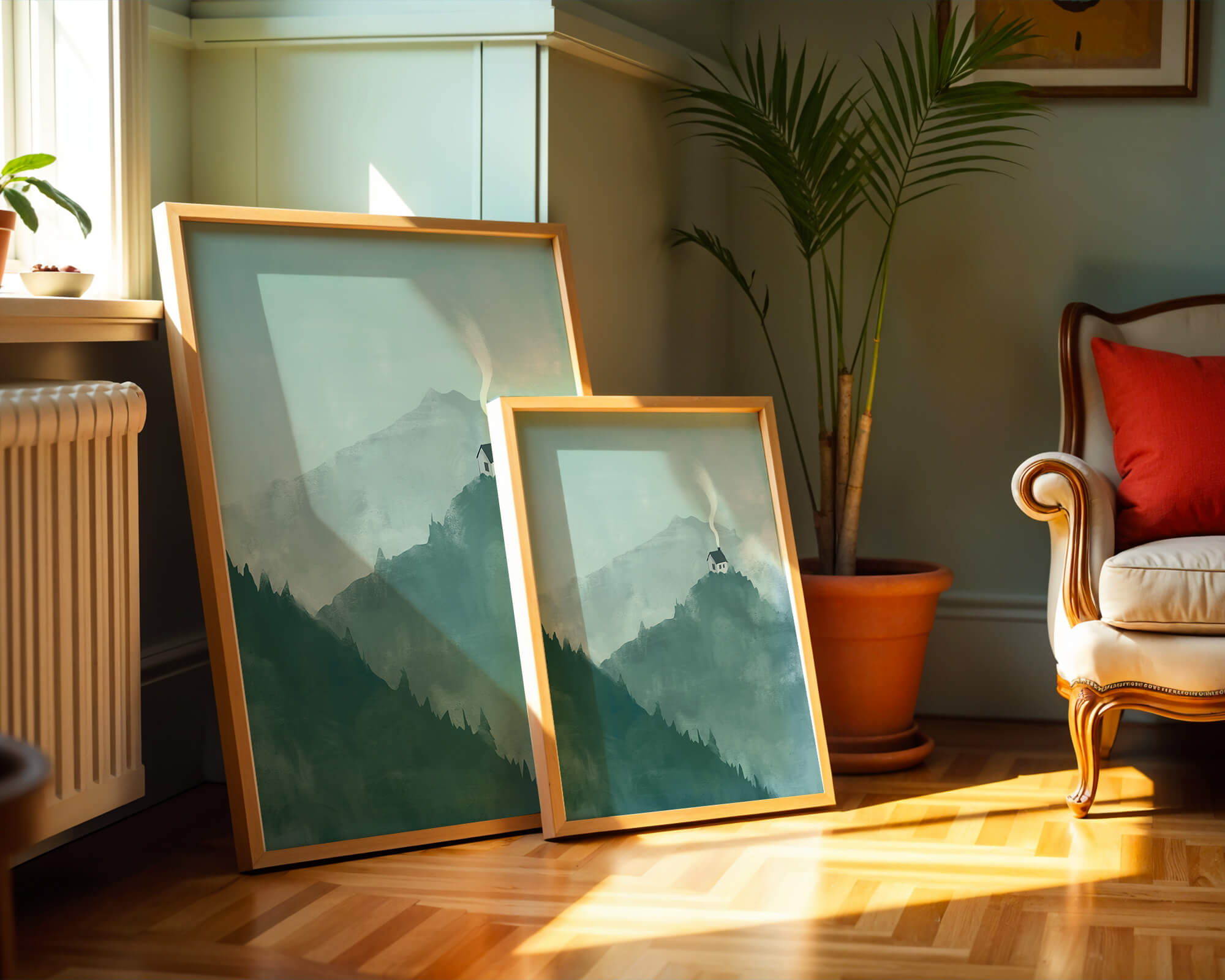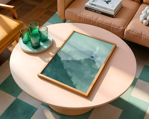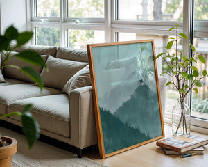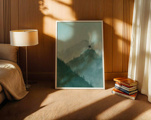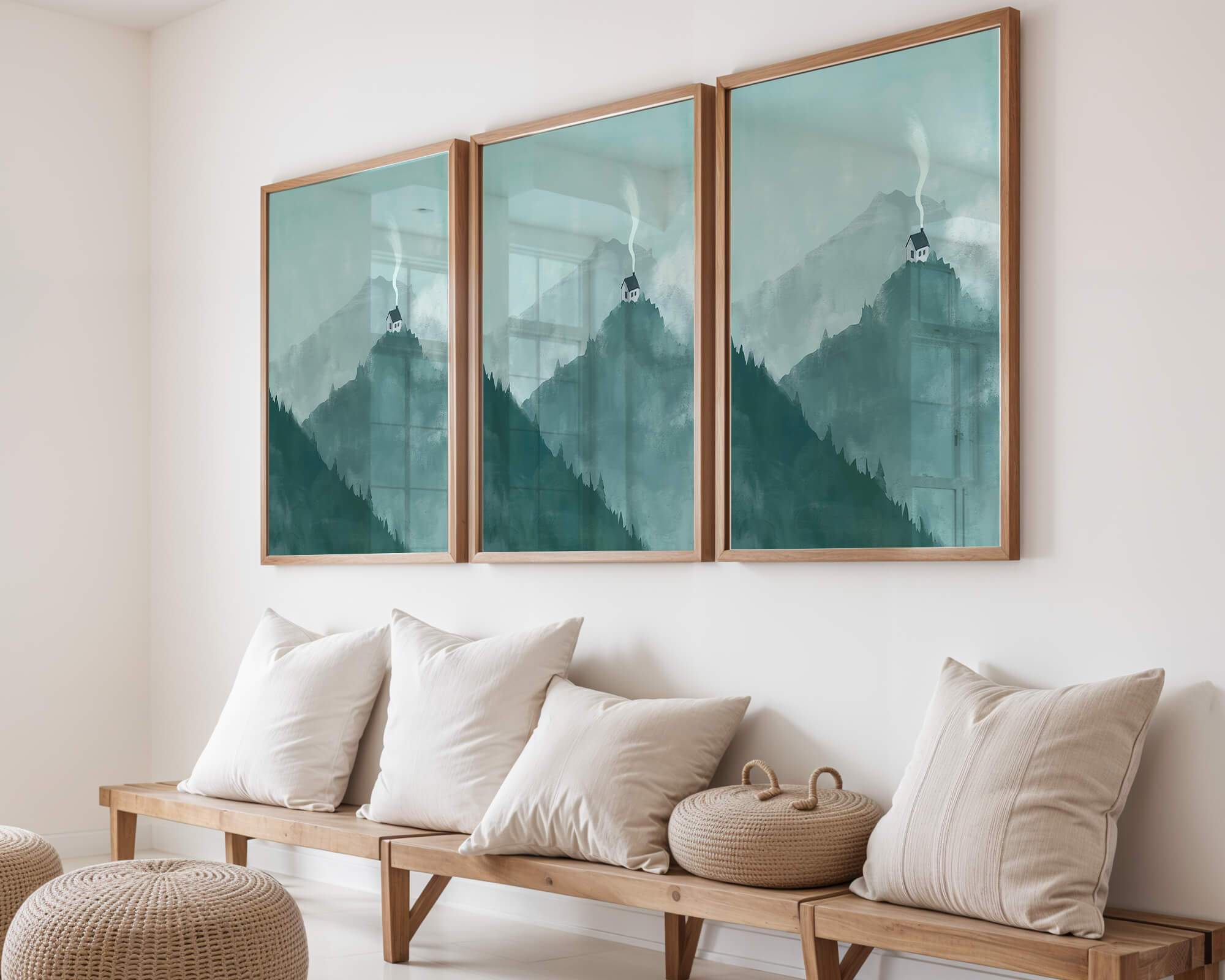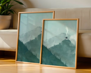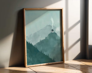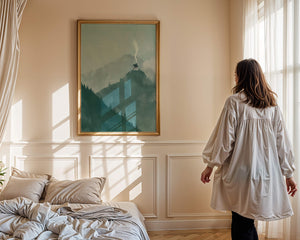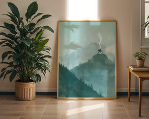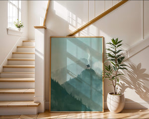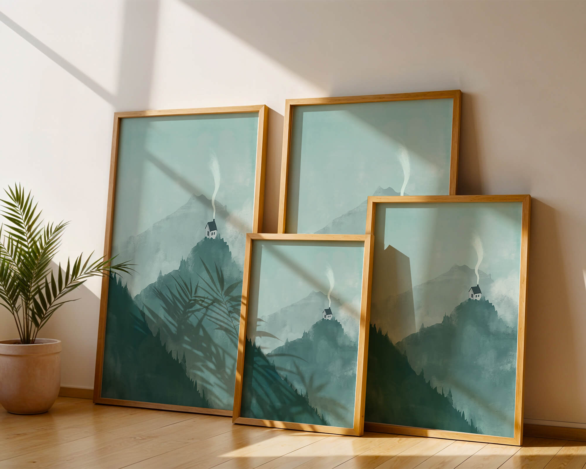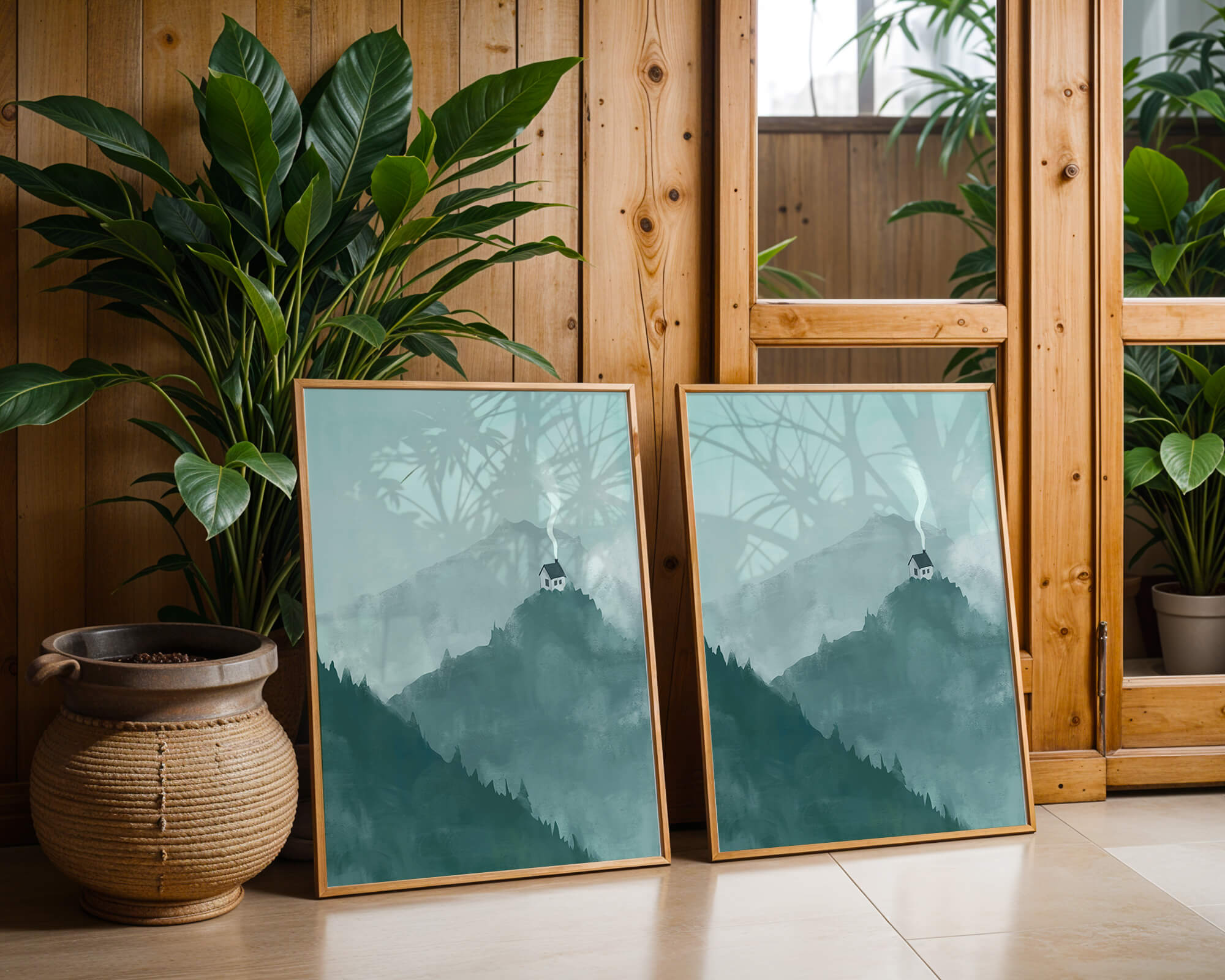 Los sutiles tonos de verde y azul crean un telón de fondo relajante, evocando sentimientos de soledad y paz. En el centro de la obra se encuentra una acogedora cabaña, posada en la cima de una montaña, con un delgado hilo de humo que se eleva suavemente desde su chimenea para desvanecerse en el cielo. Las capas de colinas brumosas en el fondo realzan la sensación de profundidad y serenidad en la escena. Ideal para los amantes de la naturaleza, esta obra lleva la esencia de un retiro montañoso remoto a cualquier espacio. La combinación del efecto acuarela y los colores suaves la convierten en una pieza perfecta para añadir tranquilidad a tu sala o dormitorio, invitando una sensación de calma y relajación a tu hogar.| Tipo |