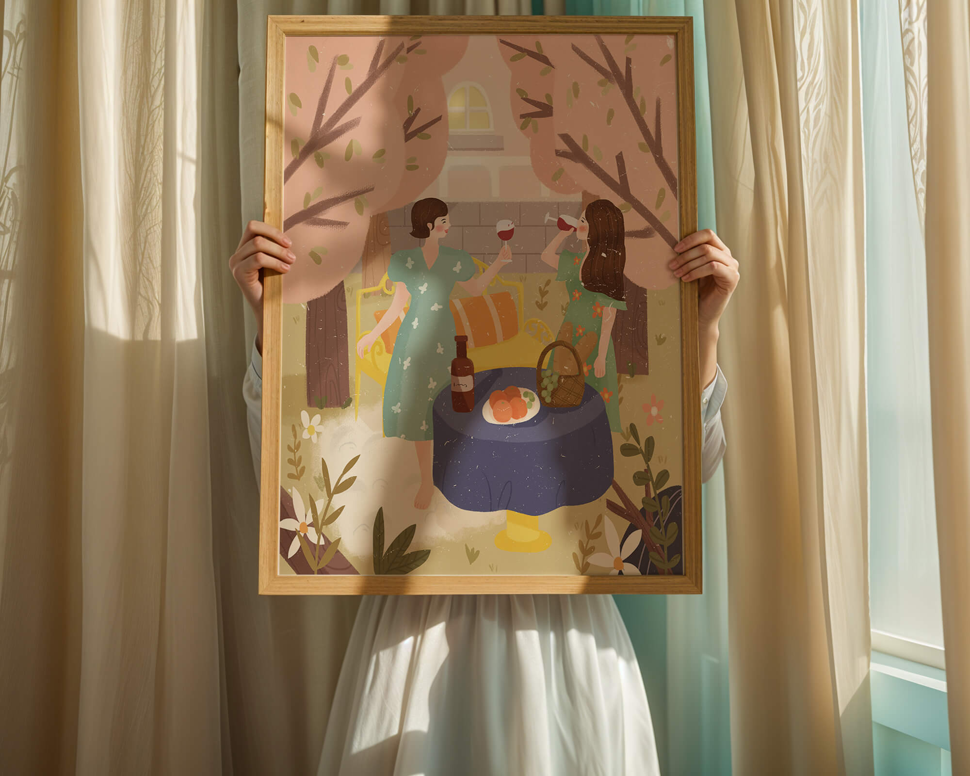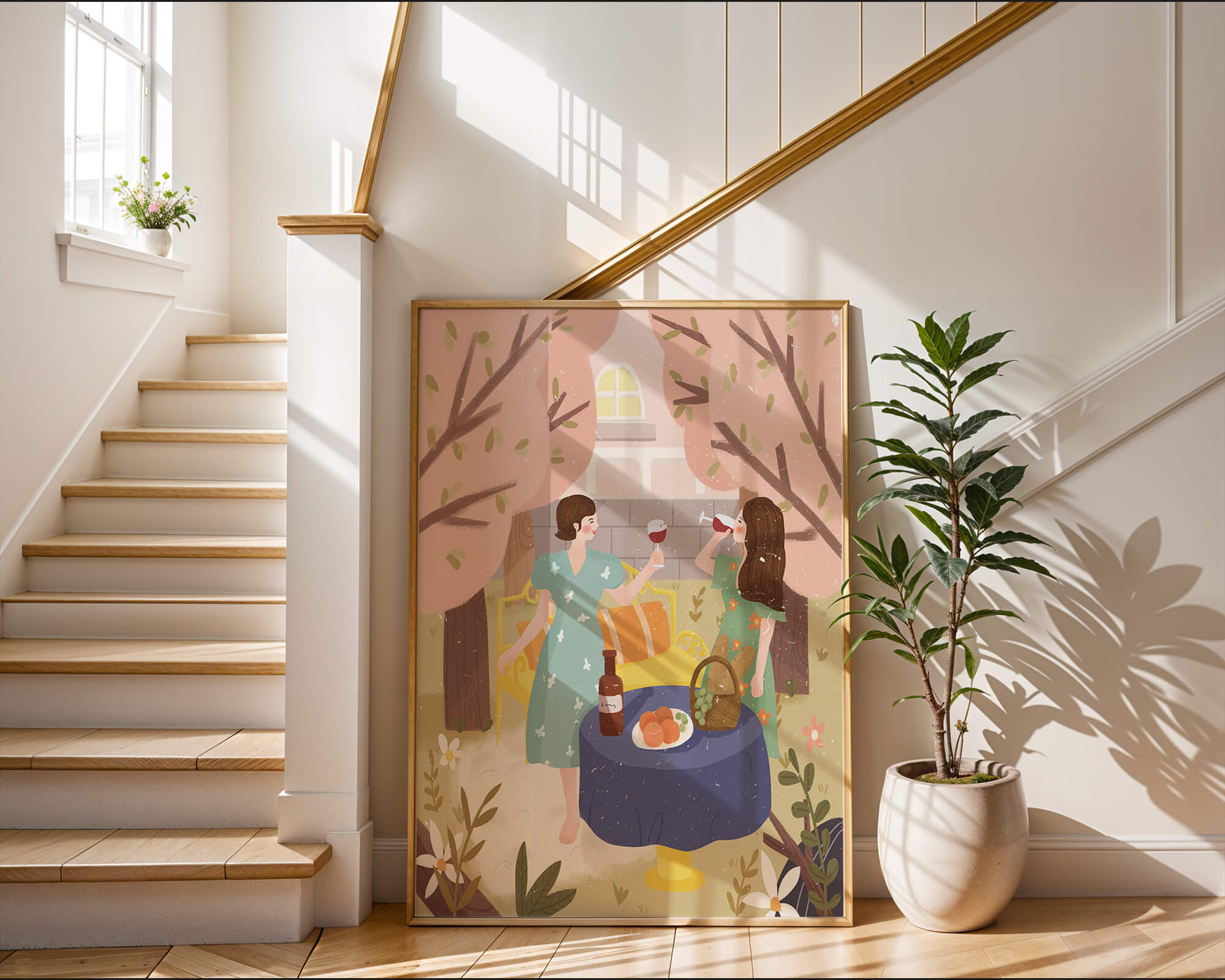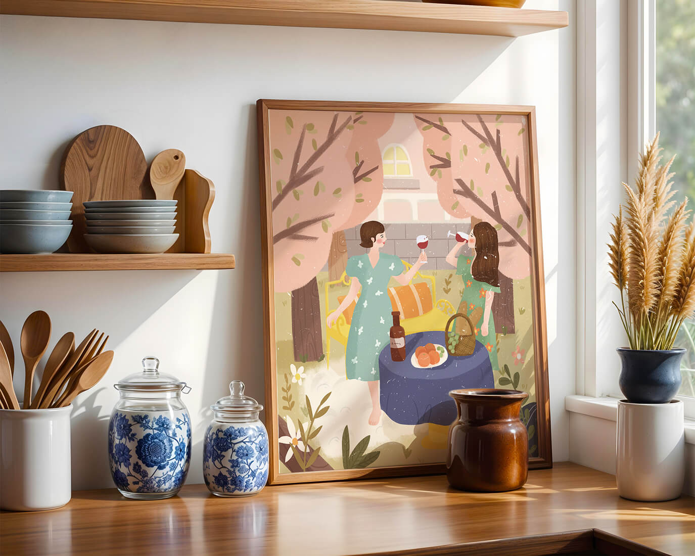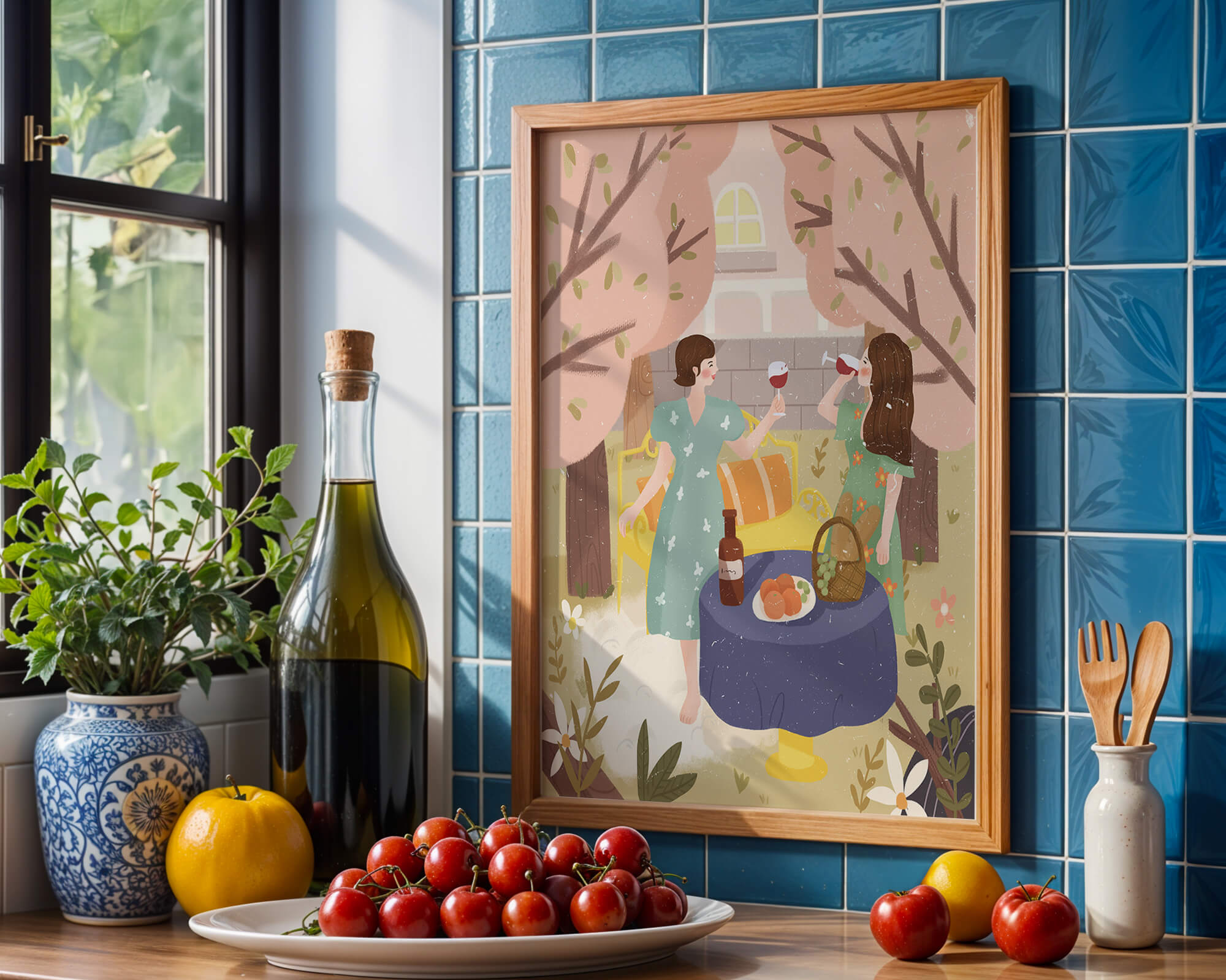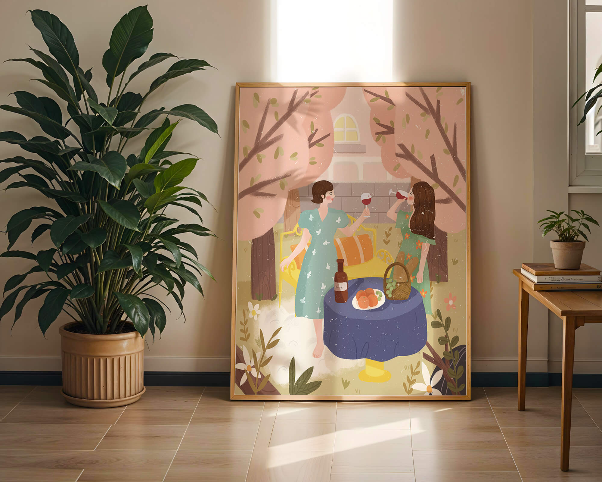 In this charming composition, two women are enjoying a serene garden setting, surrounded by blooming trees and pastel colors. Their attire — green dresses with floral patterns — enhances the spring theme of the scene. The mood is casual and inviting, painting an image of leisurely indulgence. A small table contains a variety of treats — a bottle of wine, glasses filled with red wine, fresh fruit, and a basket of bread and grapes suggest a delightful picnic setup. This illustration beautifully captures a moment that celebrates friendship, nature, and the simple pleasures of life. The warm colors and soft textures contribute to the pieces appealing aesthetic, making it a charming addition to any home decor.| Tipo |