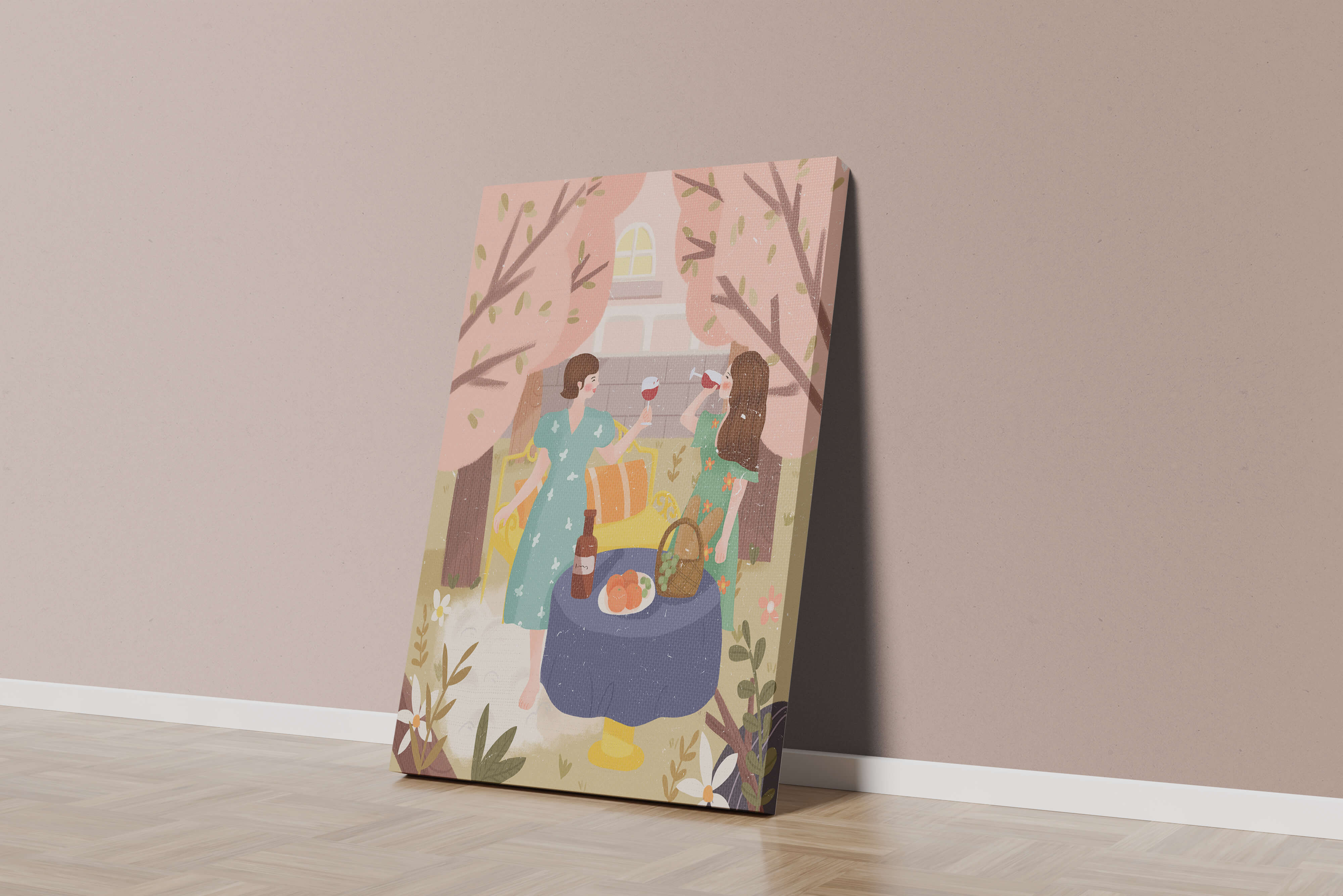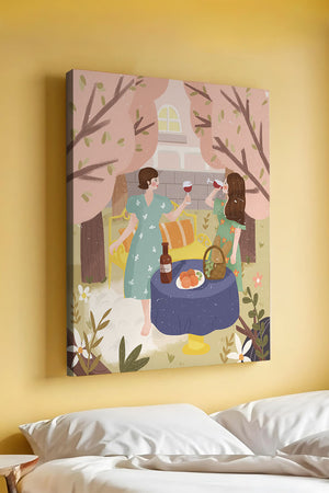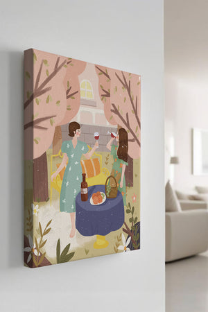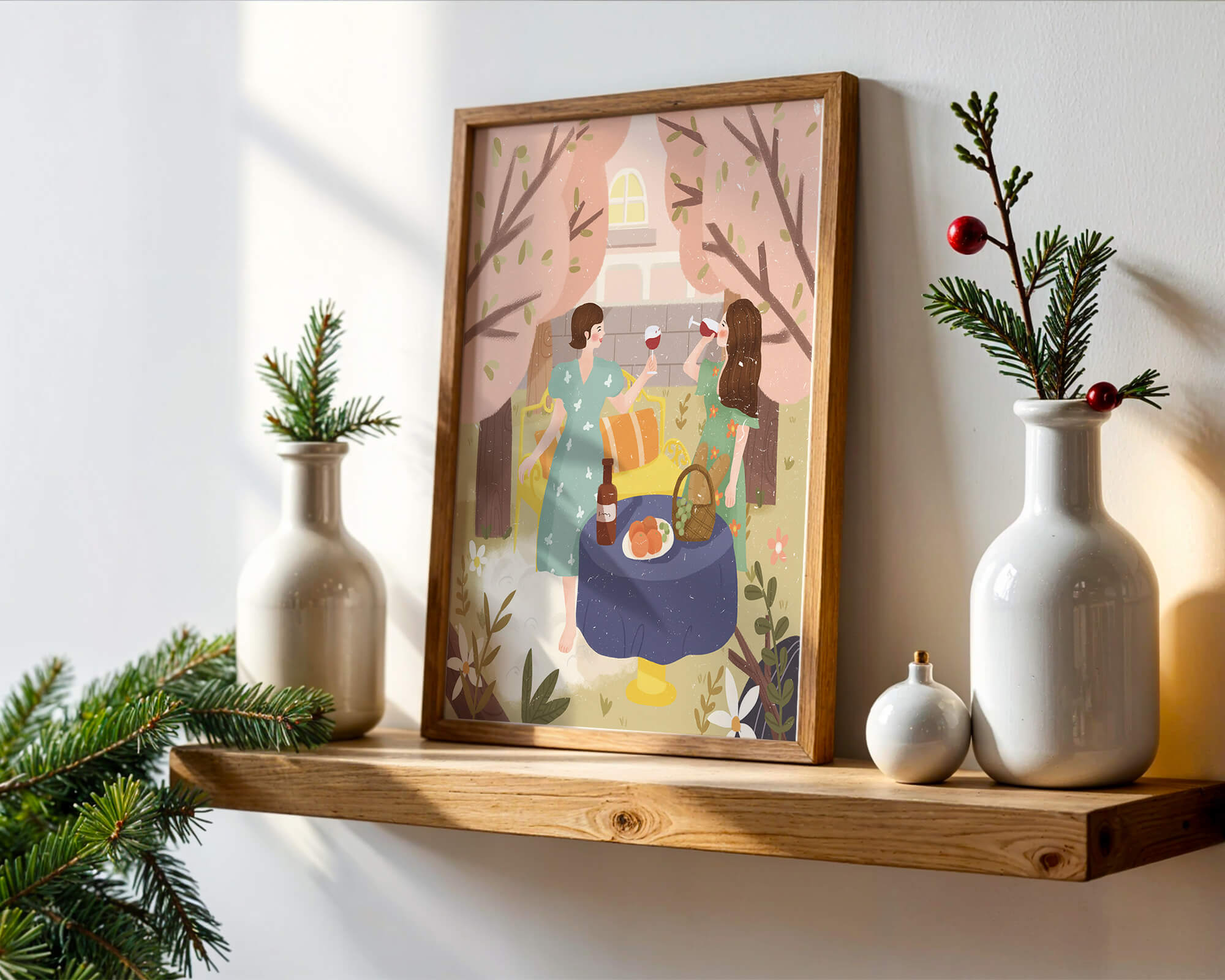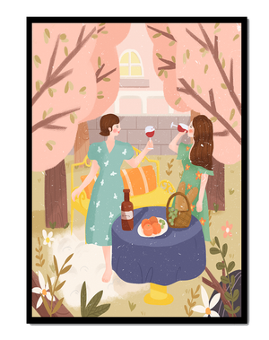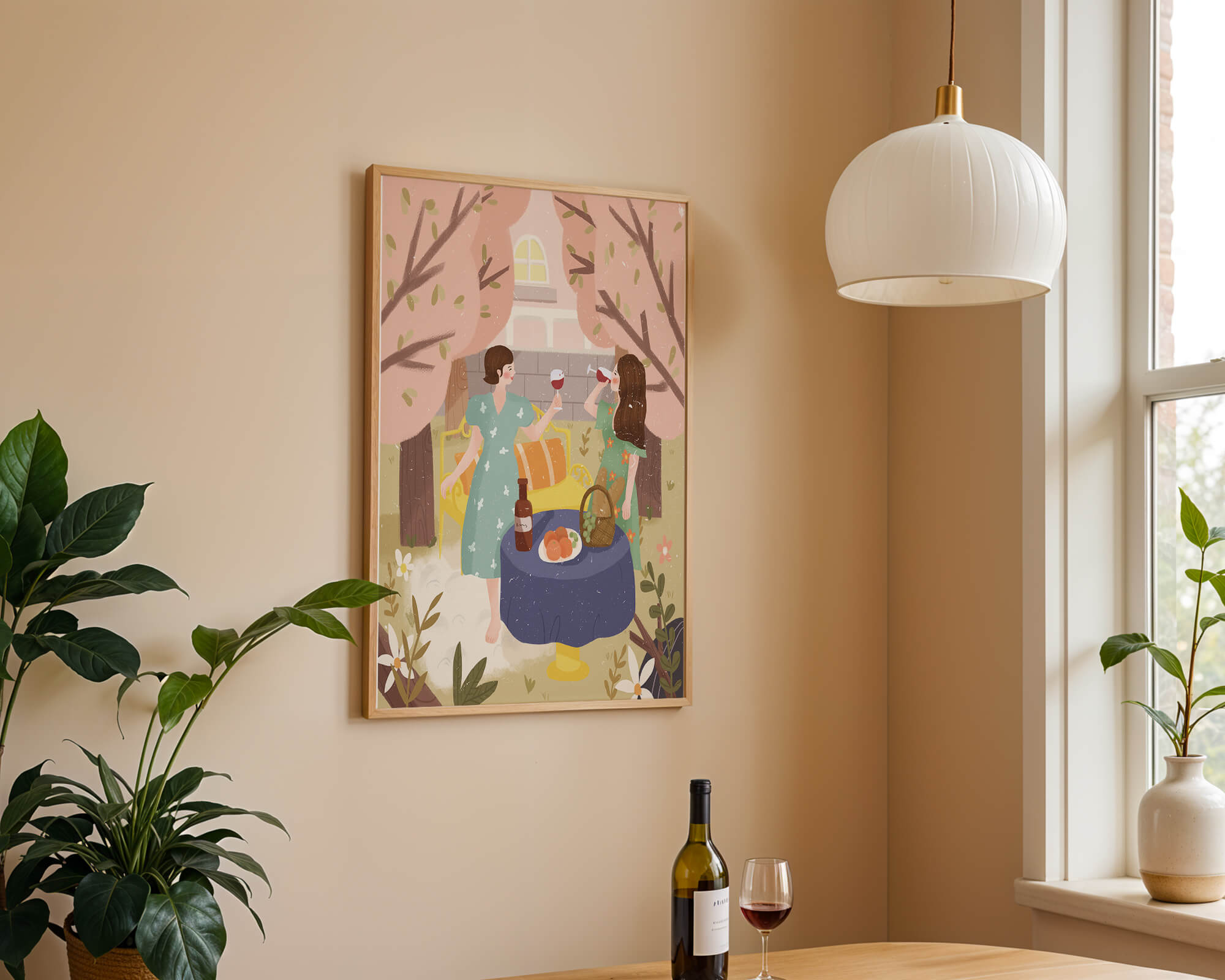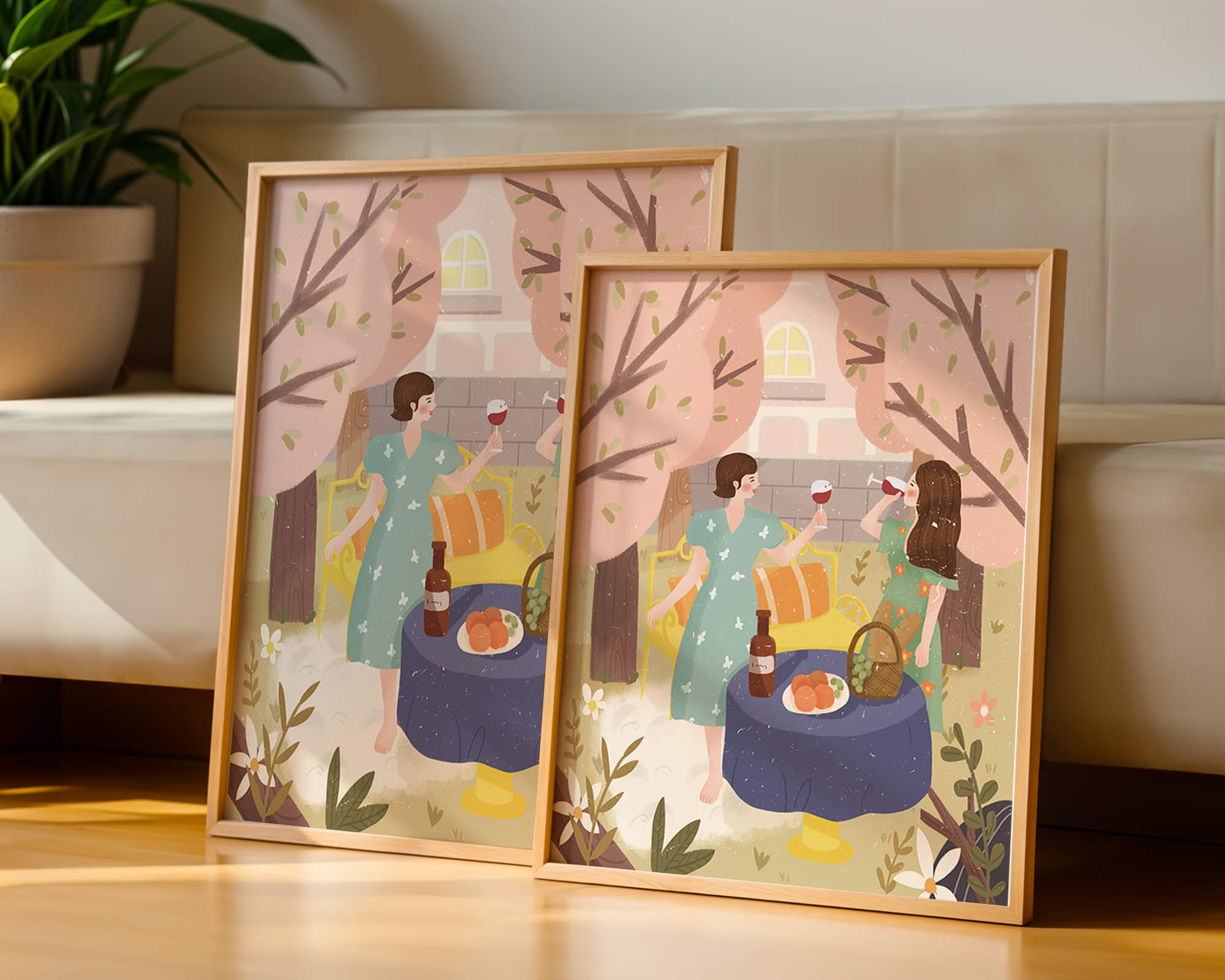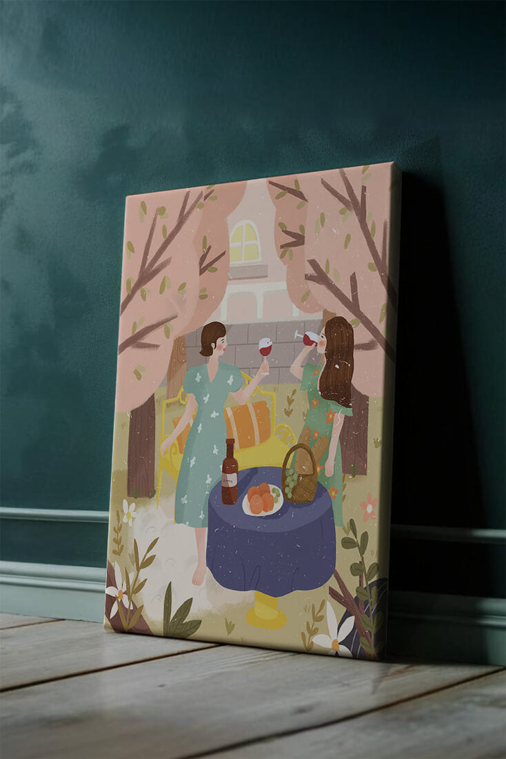 In this charming composition, two women are enjoying a serene garden setting, surrounded by blooming trees and pastel colors. Their attire — green dresses with floral patterns — enhances the spring theme of the scene. The mood is casual and inviting, painting an image of leisurely indulgence. A small table contains a variety of treats — a bottle of wine, glasses filled with red wine, fresh fruit, and a basket of bread and grapes suggest a delightful picnic setup. This illustration beautifully captures a moment that celebrates friendship, nature, and the simple pleasures of life. The warm colors and soft textures contribute to the pieces appealing aesthetic, making it a charming addition to any home decor.| Tipo |