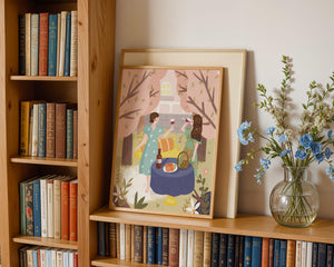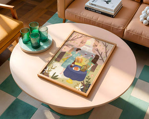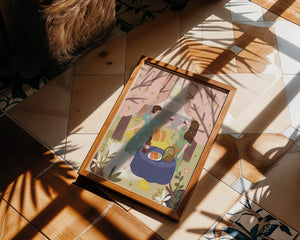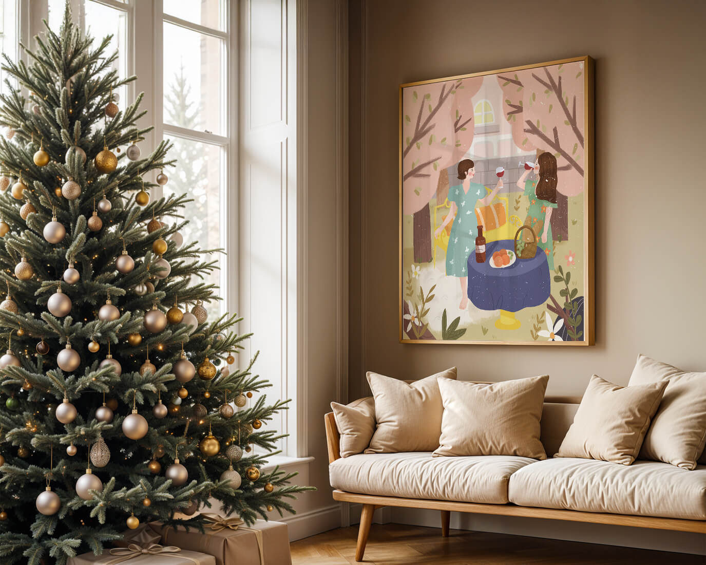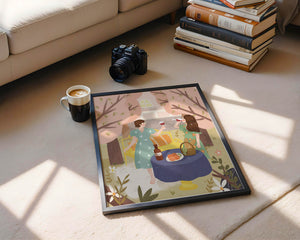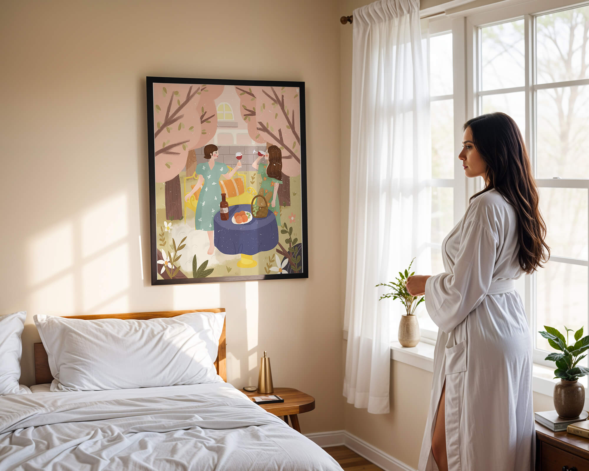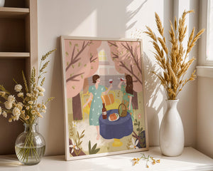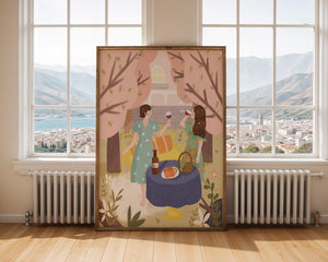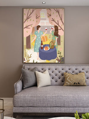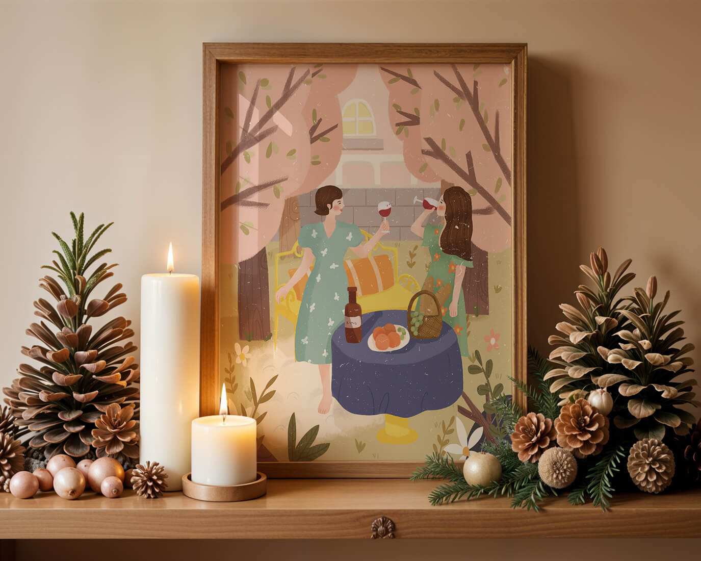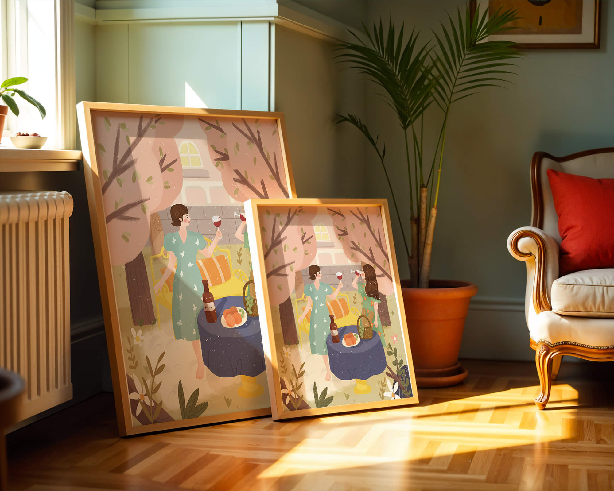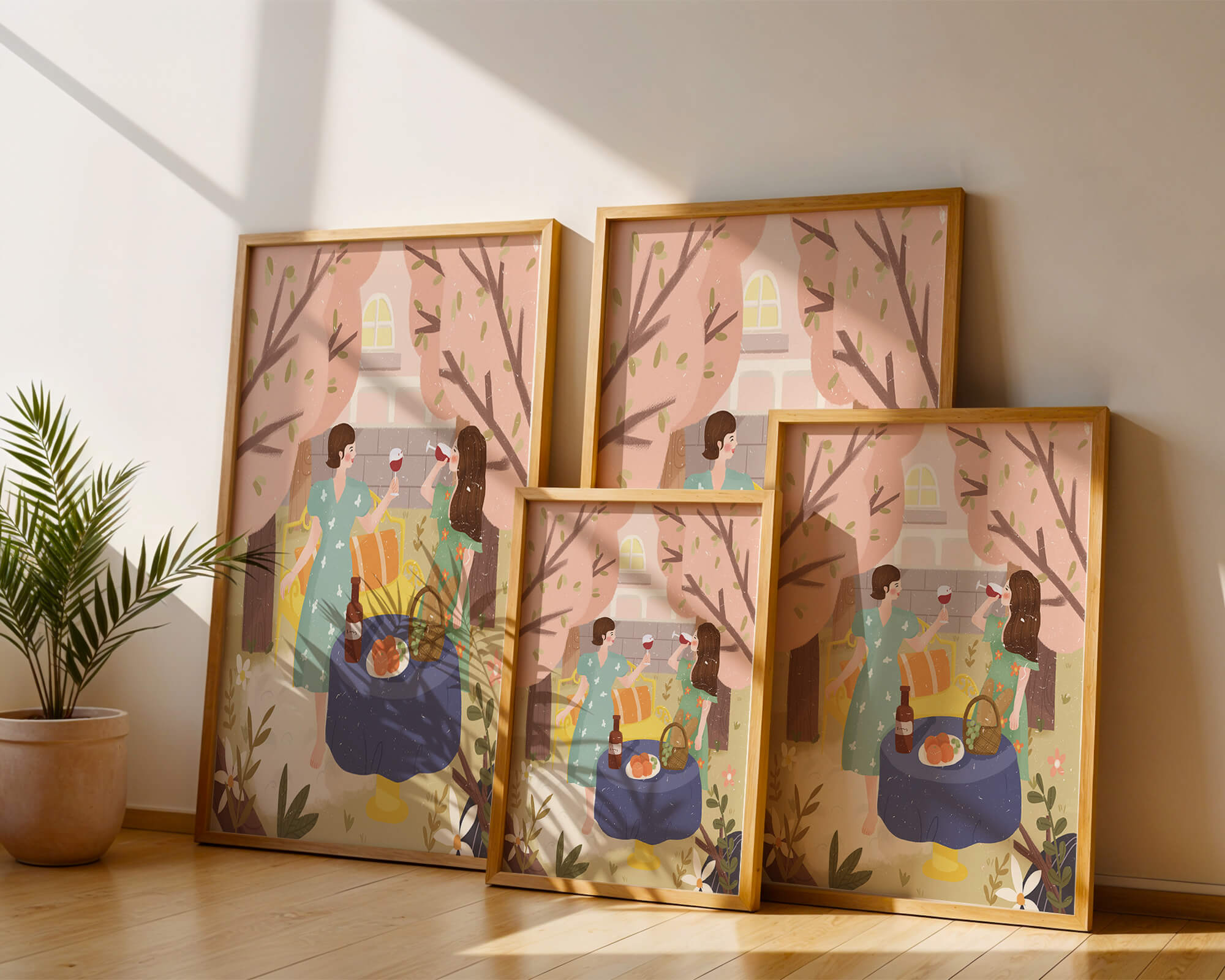 In this charming composition, two women are enjoying a serene garden setting, surrounded by blooming trees and pastel colors. Their attire — green dresses with floral patterns — enhances the spring theme of the scene. The mood is casual and inviting, painting an image of leisurely indulgence. A small table contains a variety of treats — a bottle of wine, glasses filled with red wine, fresh fruit, and a basket of bread and grapes suggest a delightful picnic setup. This illustration beautifully captures a moment that celebrates friendship, nature, and the simple pleasures of life. The warm colors and soft textures contribute to the pieces appealing aesthetic, making it a charming addition to any home decor.| Tipo |
