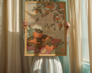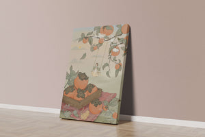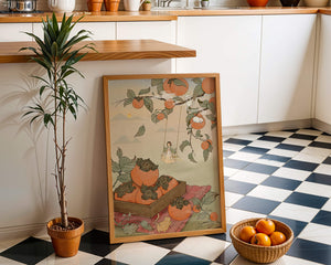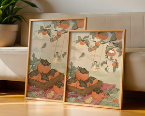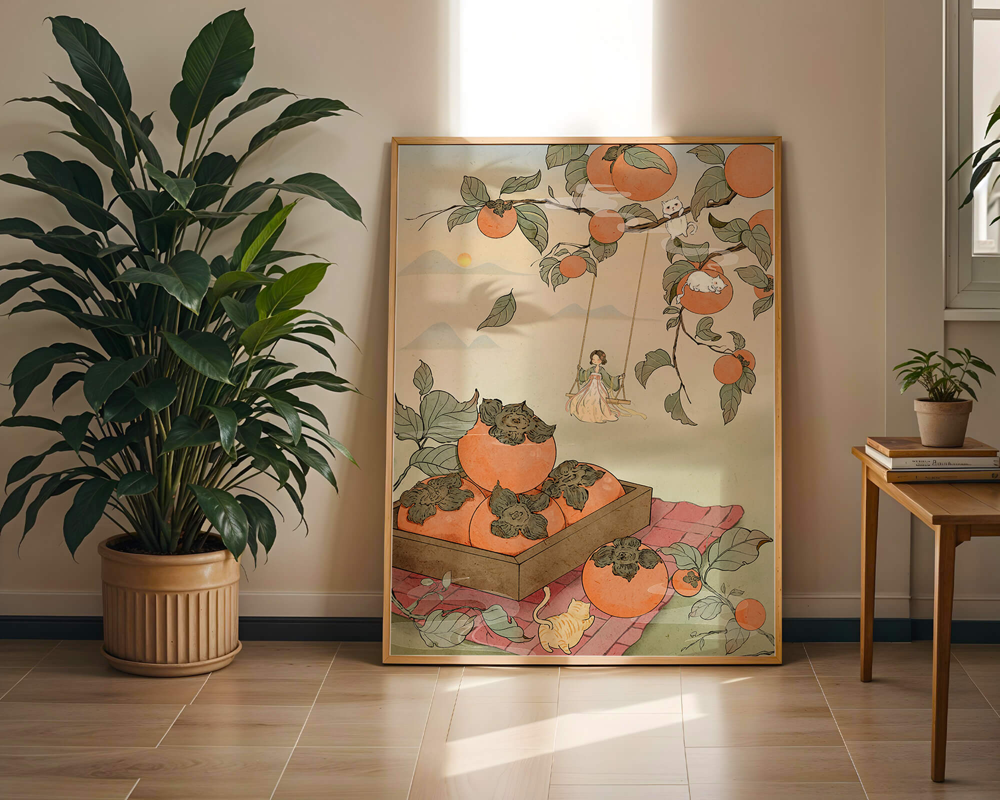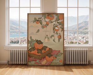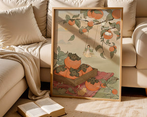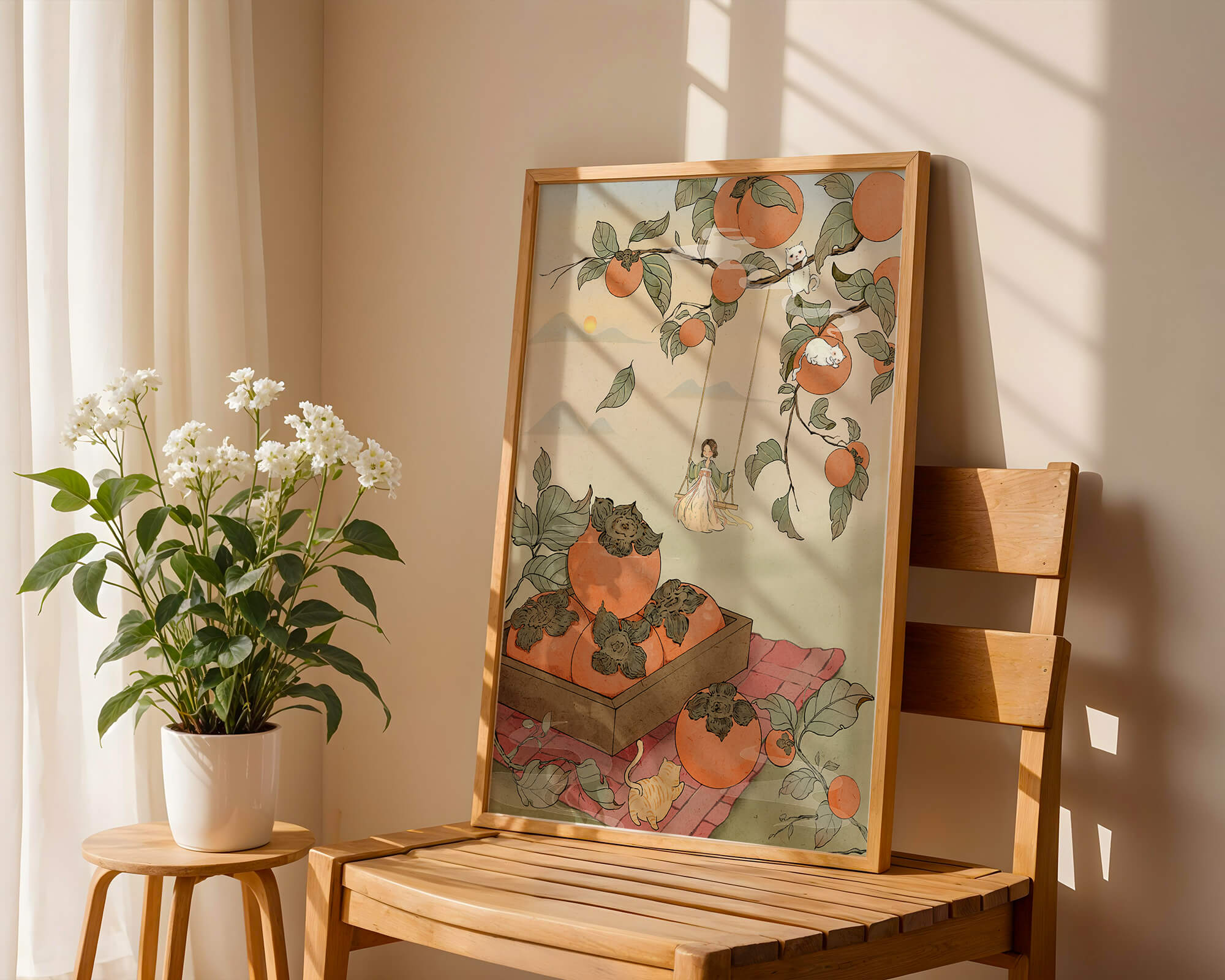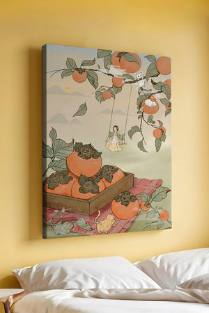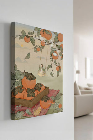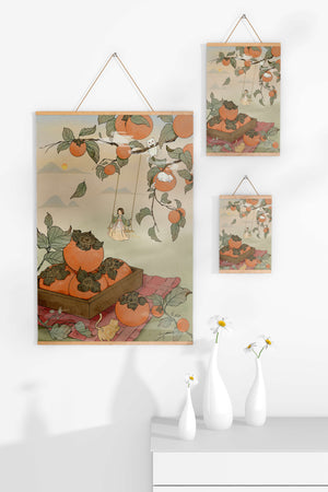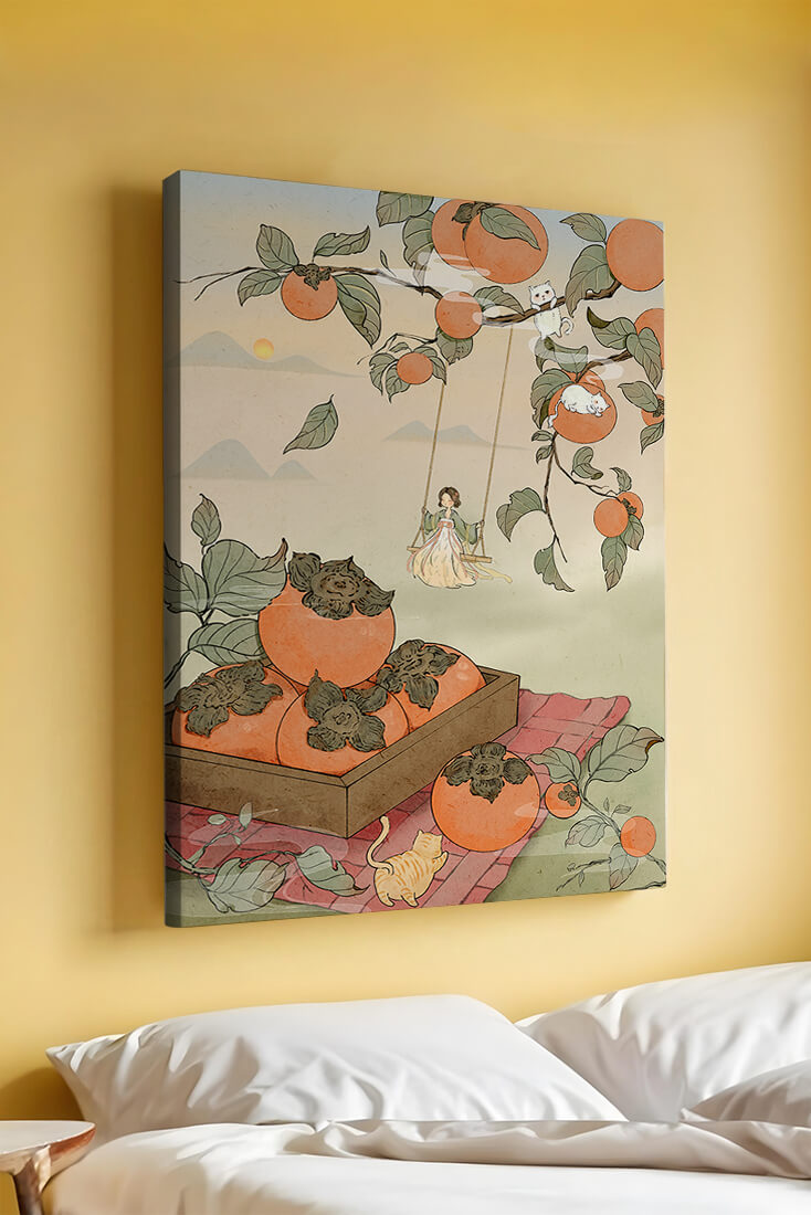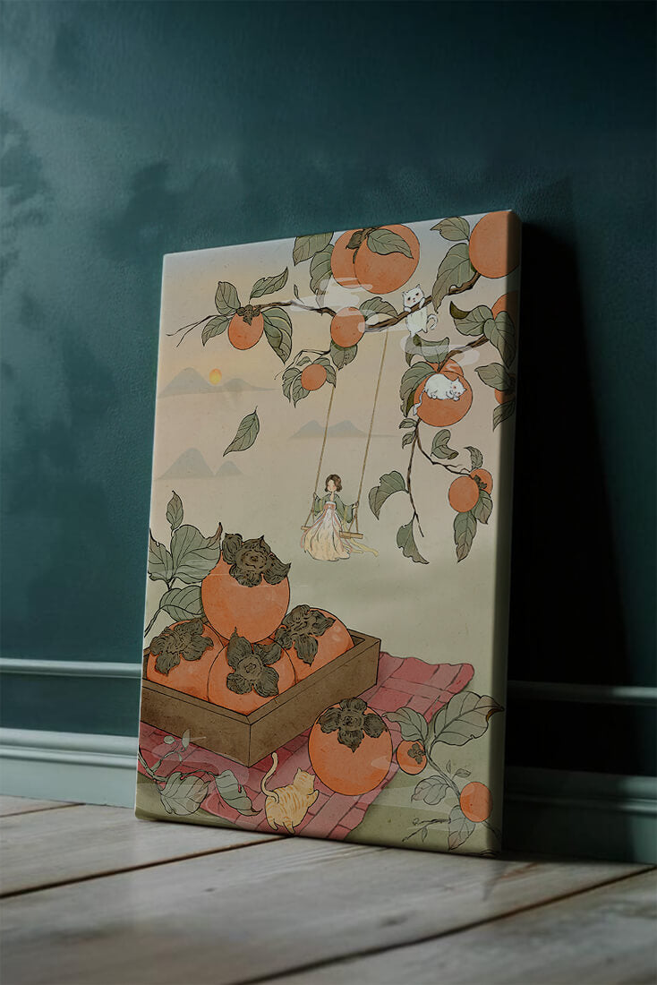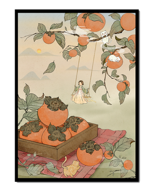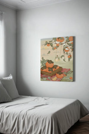 This captivating illustration depicts a fantasy world where nature and imagination coexist harmoniously. Oranges hang in abundance from leafy branches, some serving as playful perches for curious cats. A child swings gently, adding to the scenes serene charm. A soft pastel palette enhances the dreamlike quality, with the setting sun casting a warm glow over the landscape. The combination of natural elements and imaginative details evokes a sense of wonder and tranquility, making this piece a beautiful addition to any space.| Tipo |