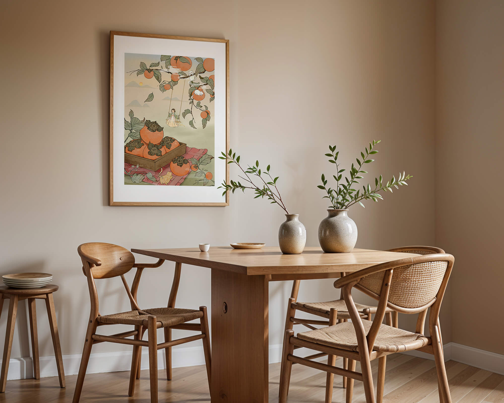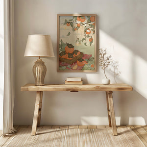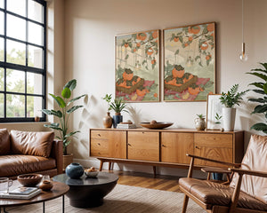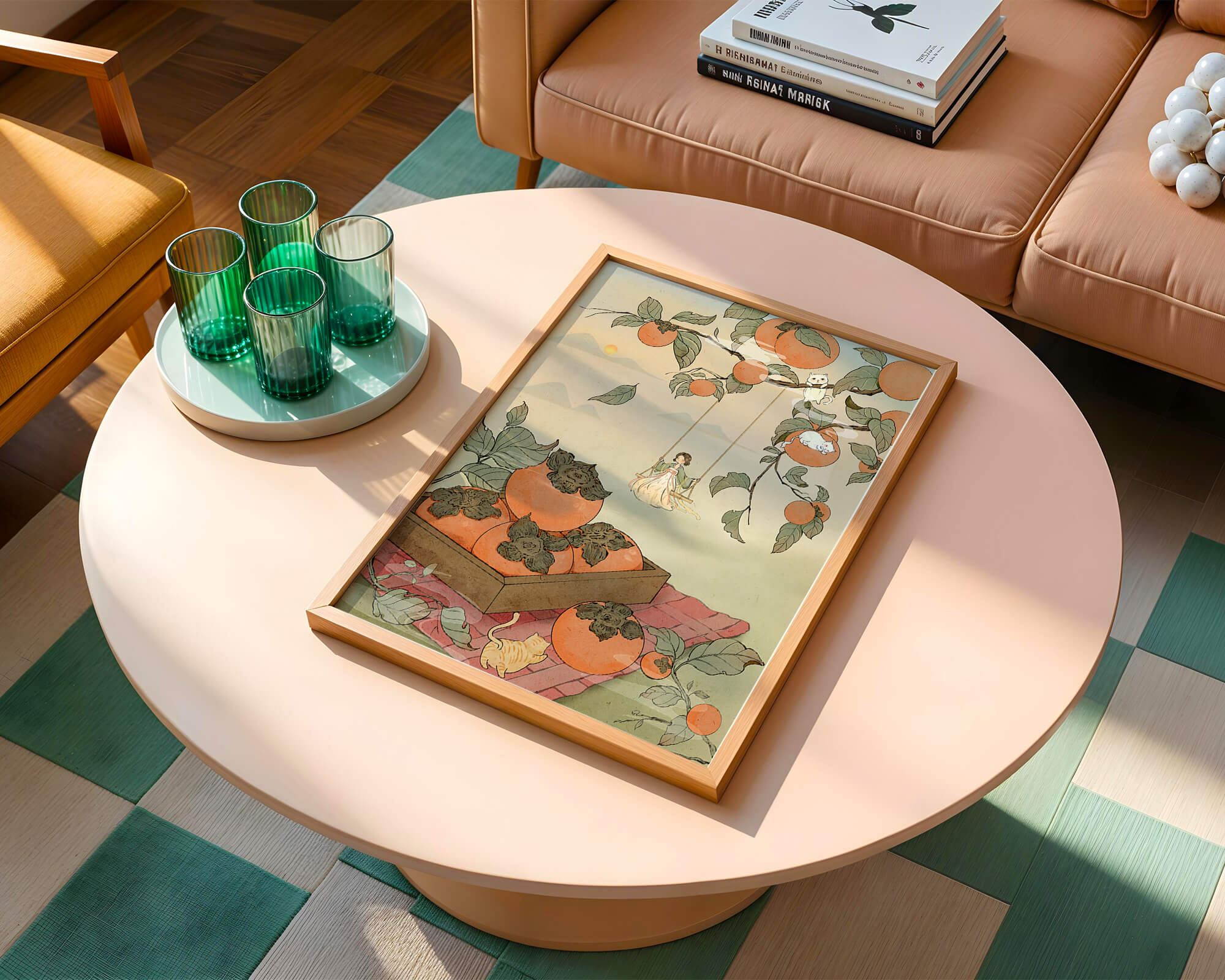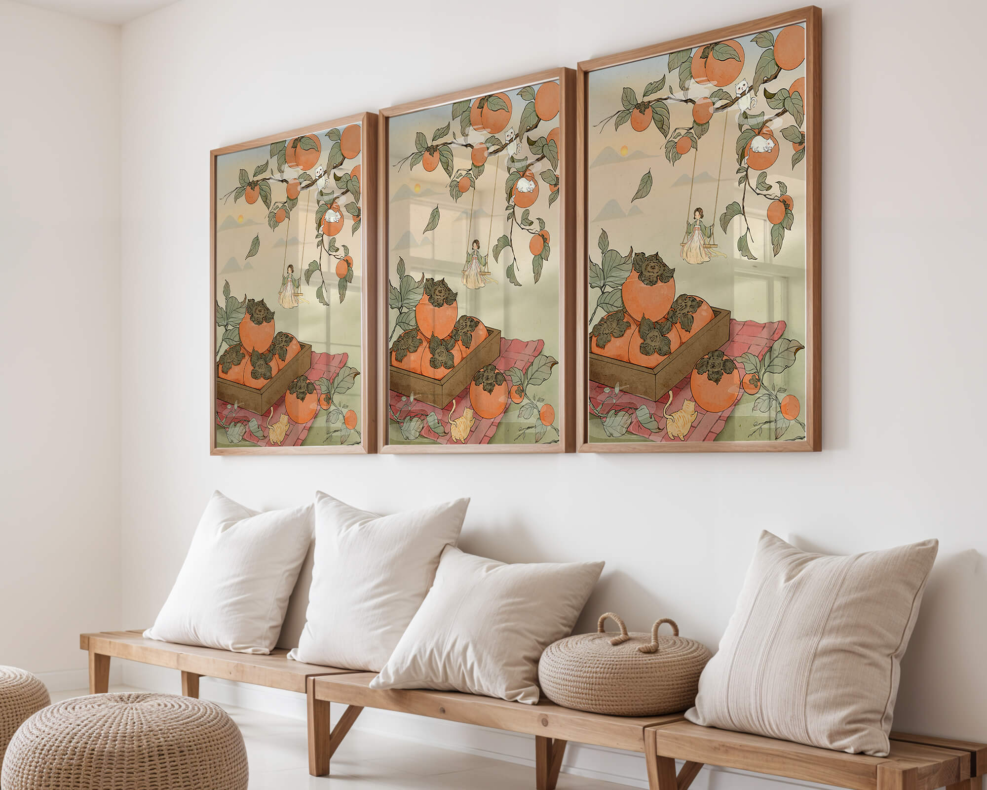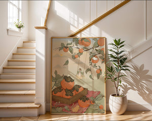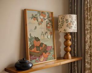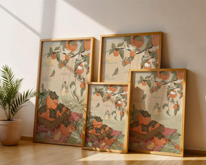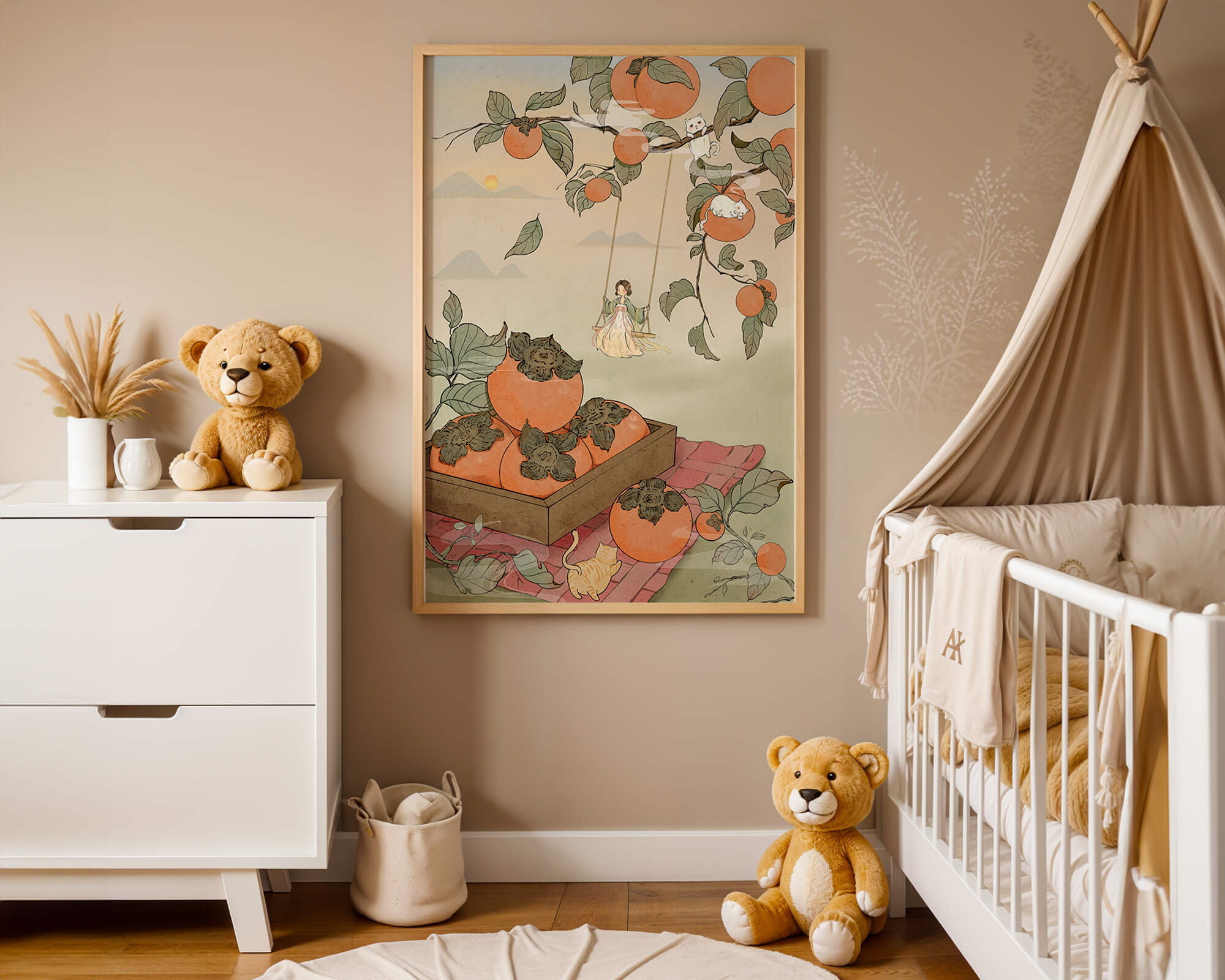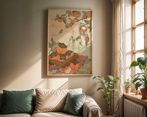 This captivating illustration depicts a fantasy world where nature and imagination coexist harmoniously. Oranges hang in abundance from leafy branches, some serving as playful perches for curious cats. A child swings gently, adding to the scenes serene charm. A soft pastel palette enhances the dreamlike quality, with the setting sun casting a warm glow over the landscape. The combination of natural elements and imaginative details evokes a sense of wonder and tranquility, making this piece a beautiful addition to any space.| Tipo |