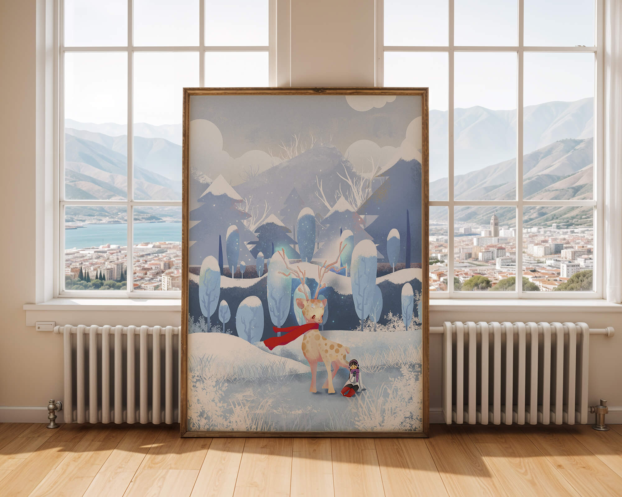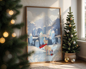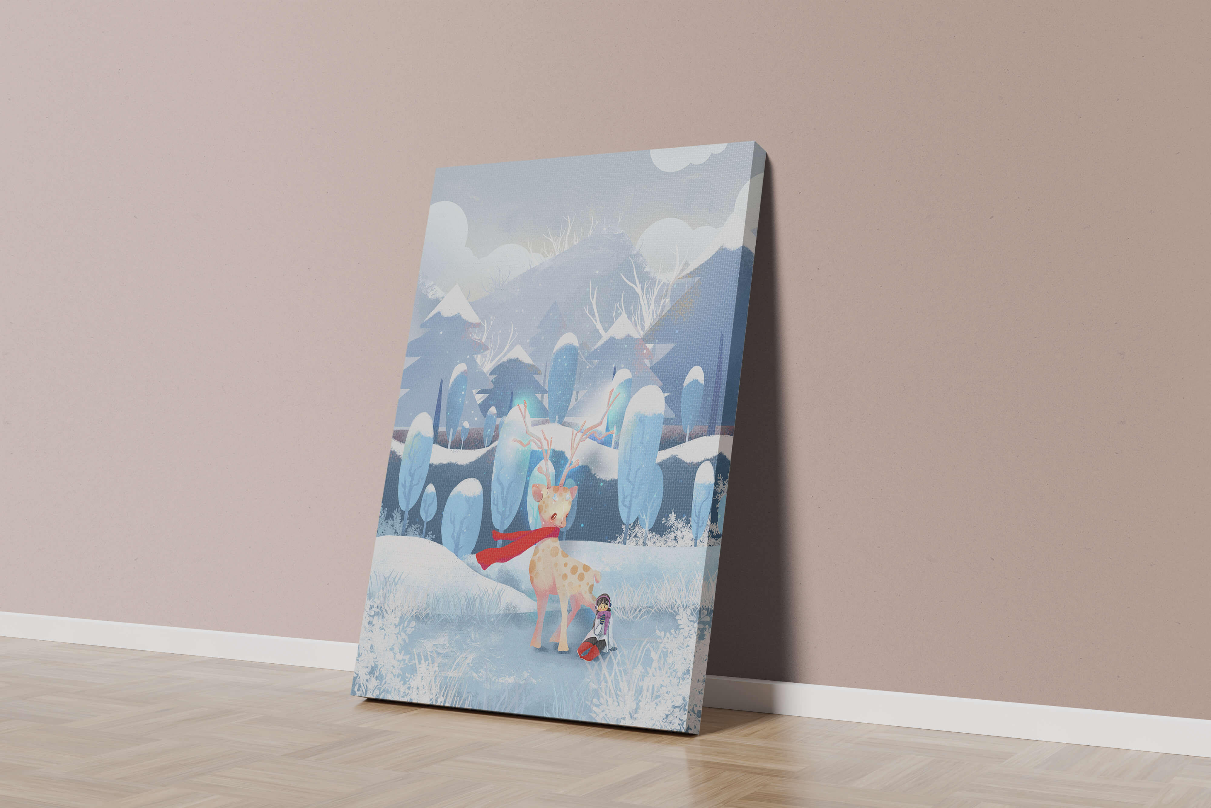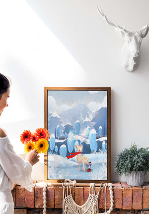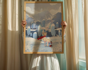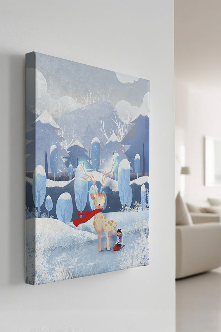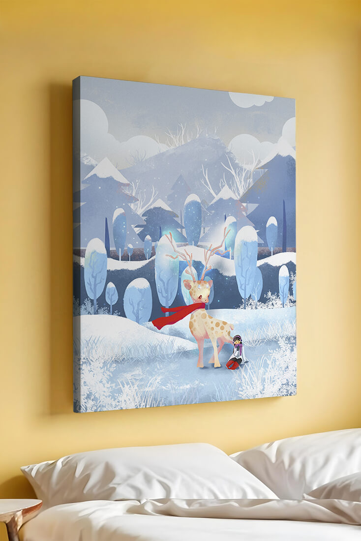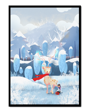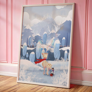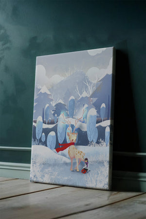 En esta encantadora ilustración, un ciervo moteado, adornado con una vibrante bufanda roja, se encuentra graciosamente en primer plano. A su lado, un niño vestido abrigadamente está sentado, añadiendo un toque caprichoso y entrañable a la escena. El telón de fondo del bosque nevado, con árboles cubiertos de escarcha y colinas ondulantes, realza la atmósfera serena y mágica. Los suaves tonos pastel de azul y blanco dominan el paisaje, transmitiendo una sensación de frío pero acogedor belleza. La suave representación de la naturaleza, combinada con elementos de fantasía, crea una experiencia reconfortante e imaginativa perfecta para habitaciones infantiles o decoración temática de invierno. Las ramas cargadas de nieve y las montañas distantes completan el entorno onírico y tranquilo.| Tipo |
