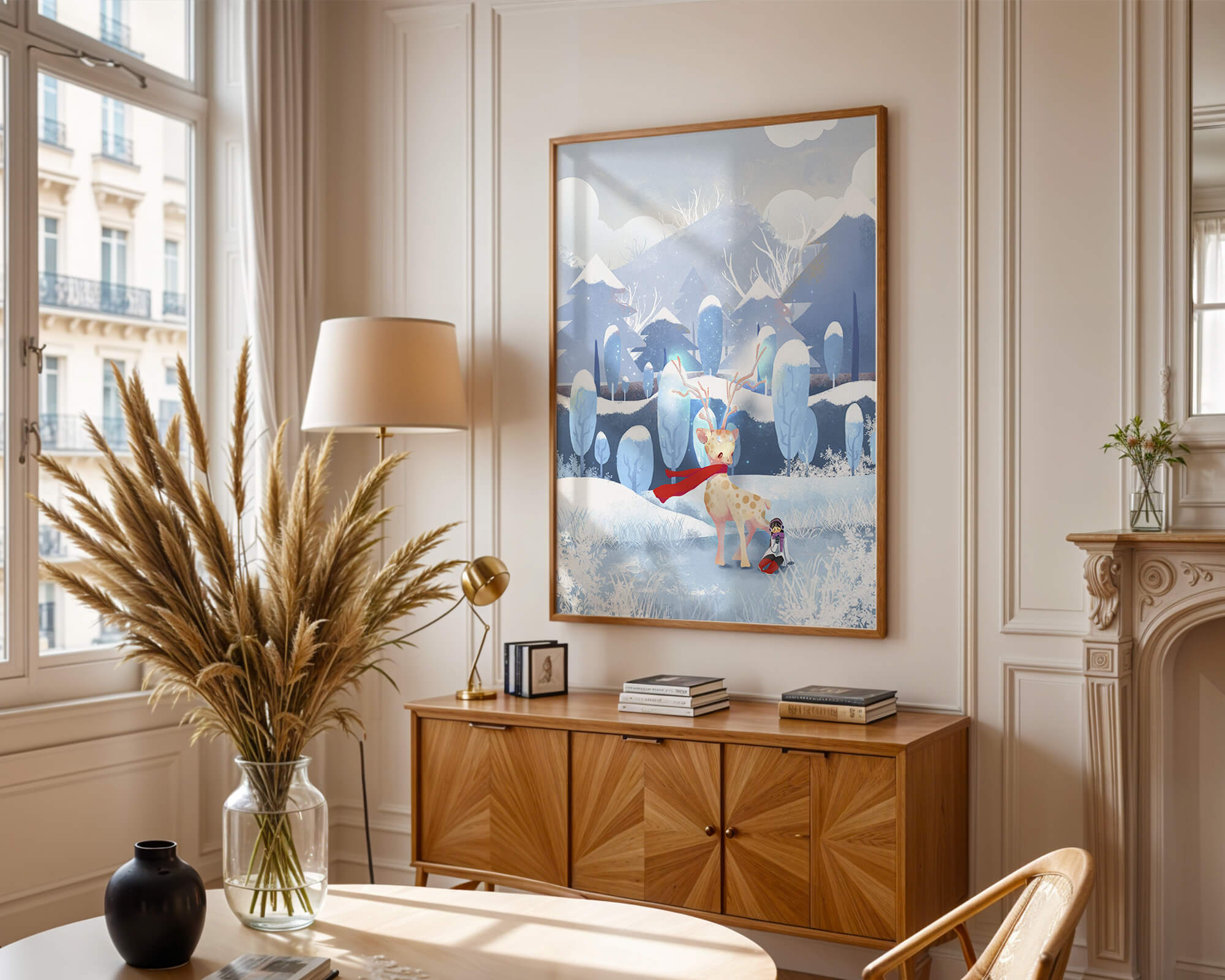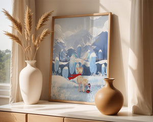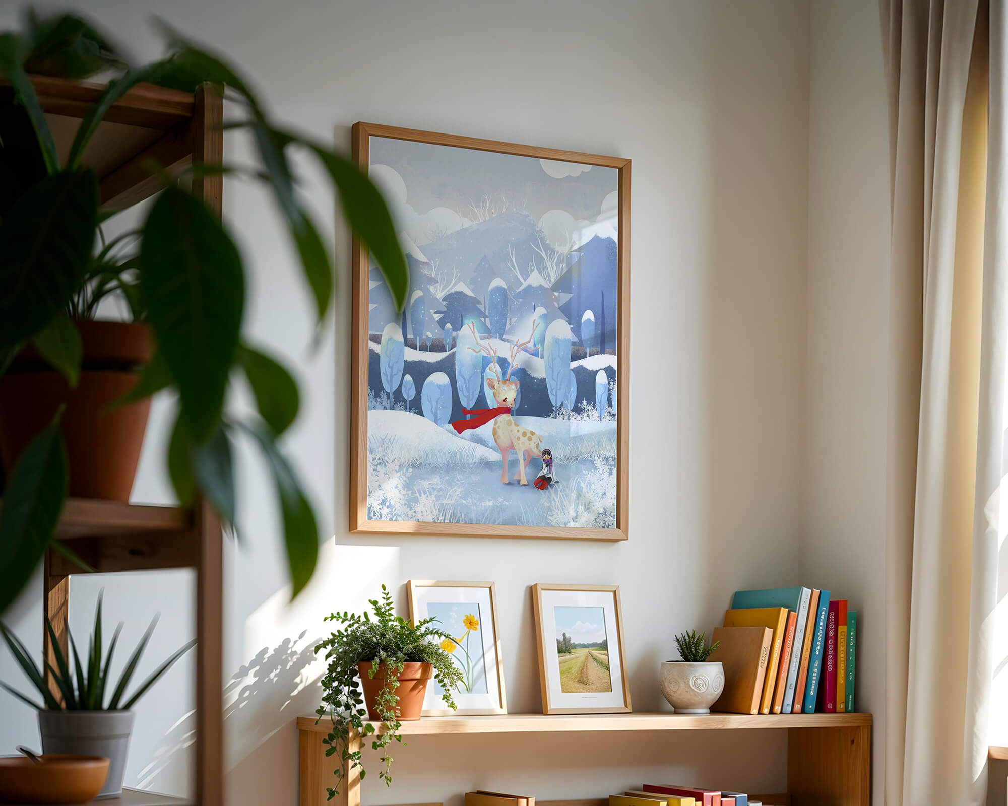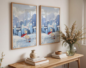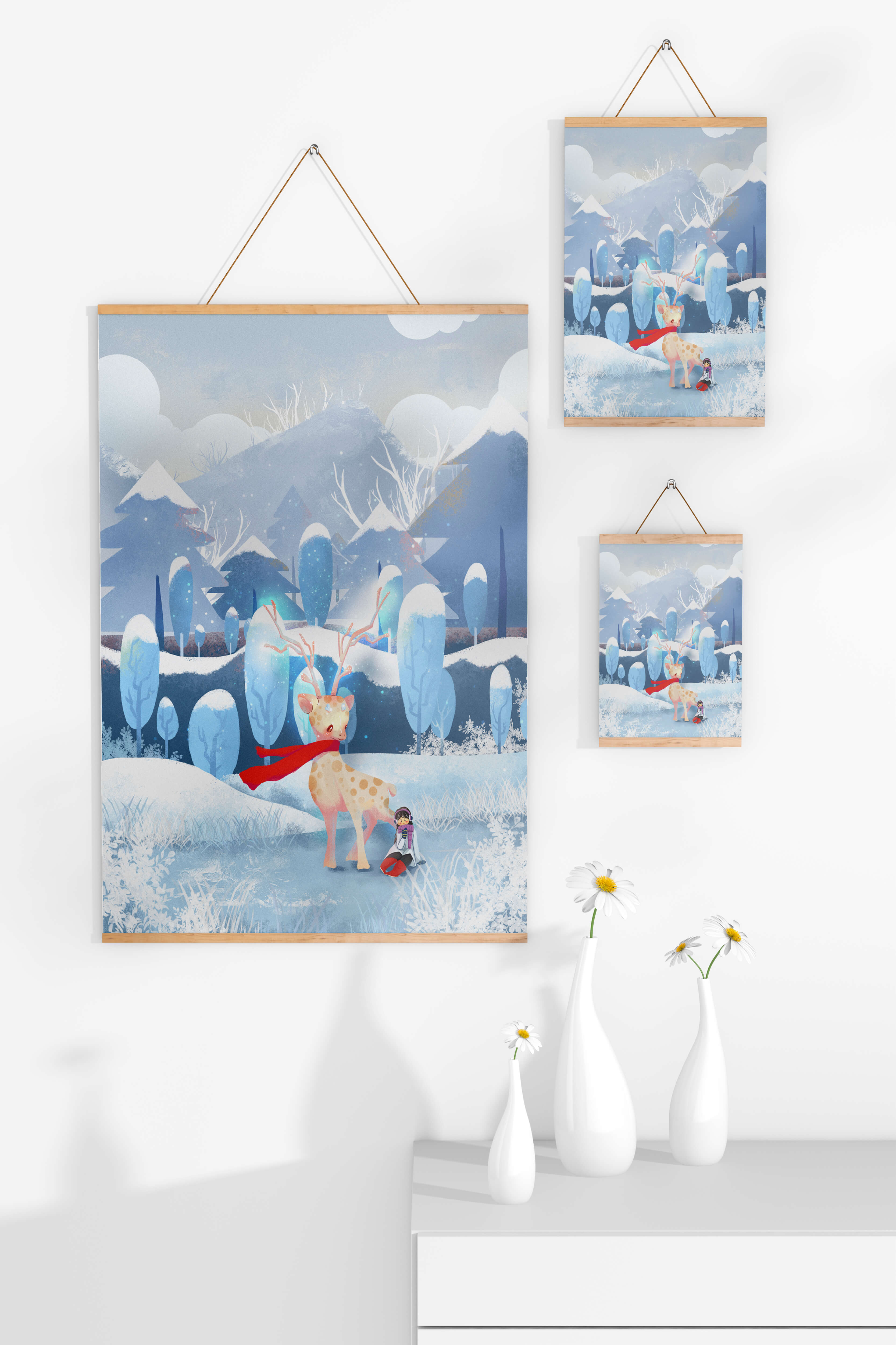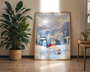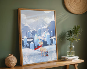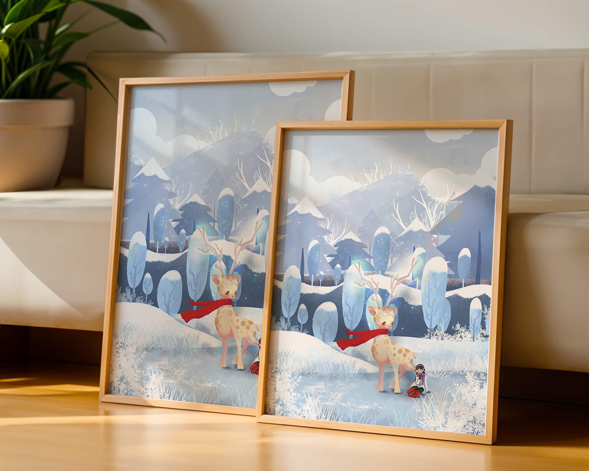 En esta encantadora ilustración, un ciervo moteado, adornado con una vibrante bufanda roja, se encuentra graciosamente en primer plano. A su lado, un niño vestido abrigadamente está sentado, añadiendo un toque caprichoso y entrañable a la escena. El telón de fondo del bosque nevado, con árboles cubiertos de escarcha y colinas ondulantes, realza la atmósfera serena y mágica. Los suaves tonos pastel de azul y blanco dominan el paisaje, transmitiendo una sensación de frío pero acogedor belleza. La suave representación de la naturaleza, combinada con elementos de fantasía, crea una experiencia reconfortante e imaginativa perfecta para habitaciones infantiles o decoración temática de invierno. Las ramas cargadas de nieve y las montañas distantes completan el entorno onírico y tranquilo.| Tipo |