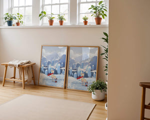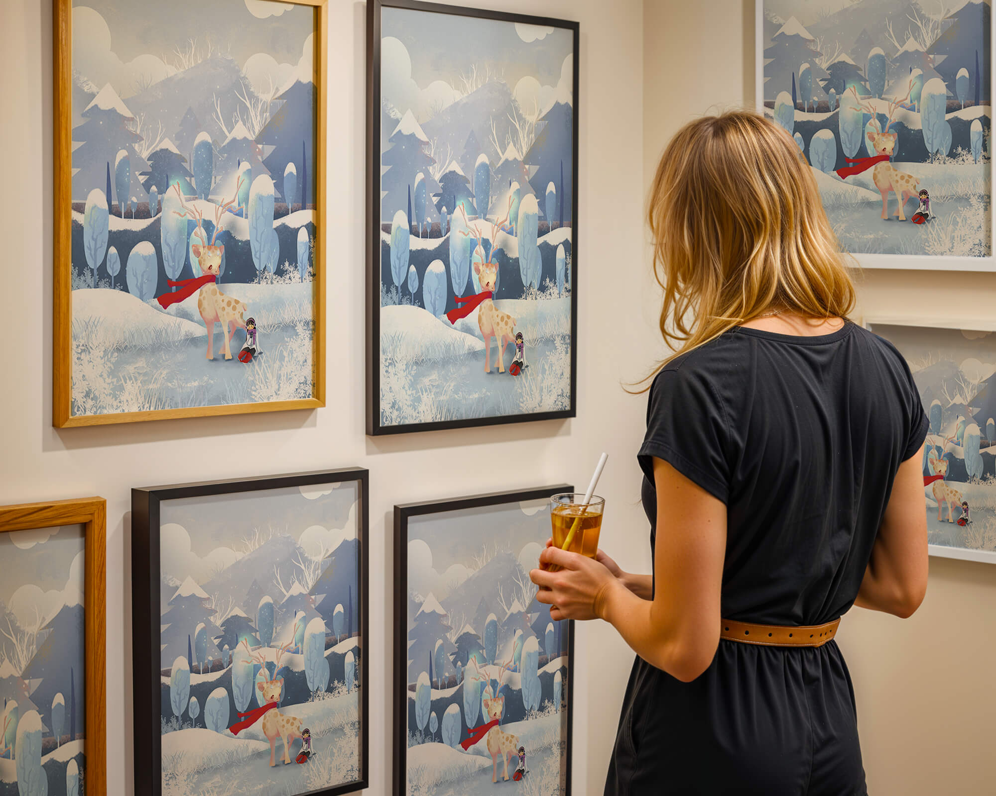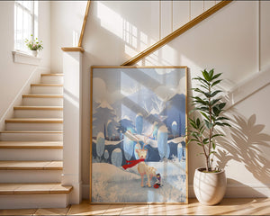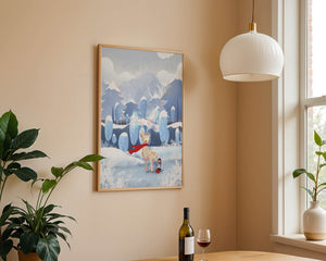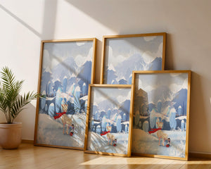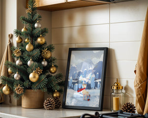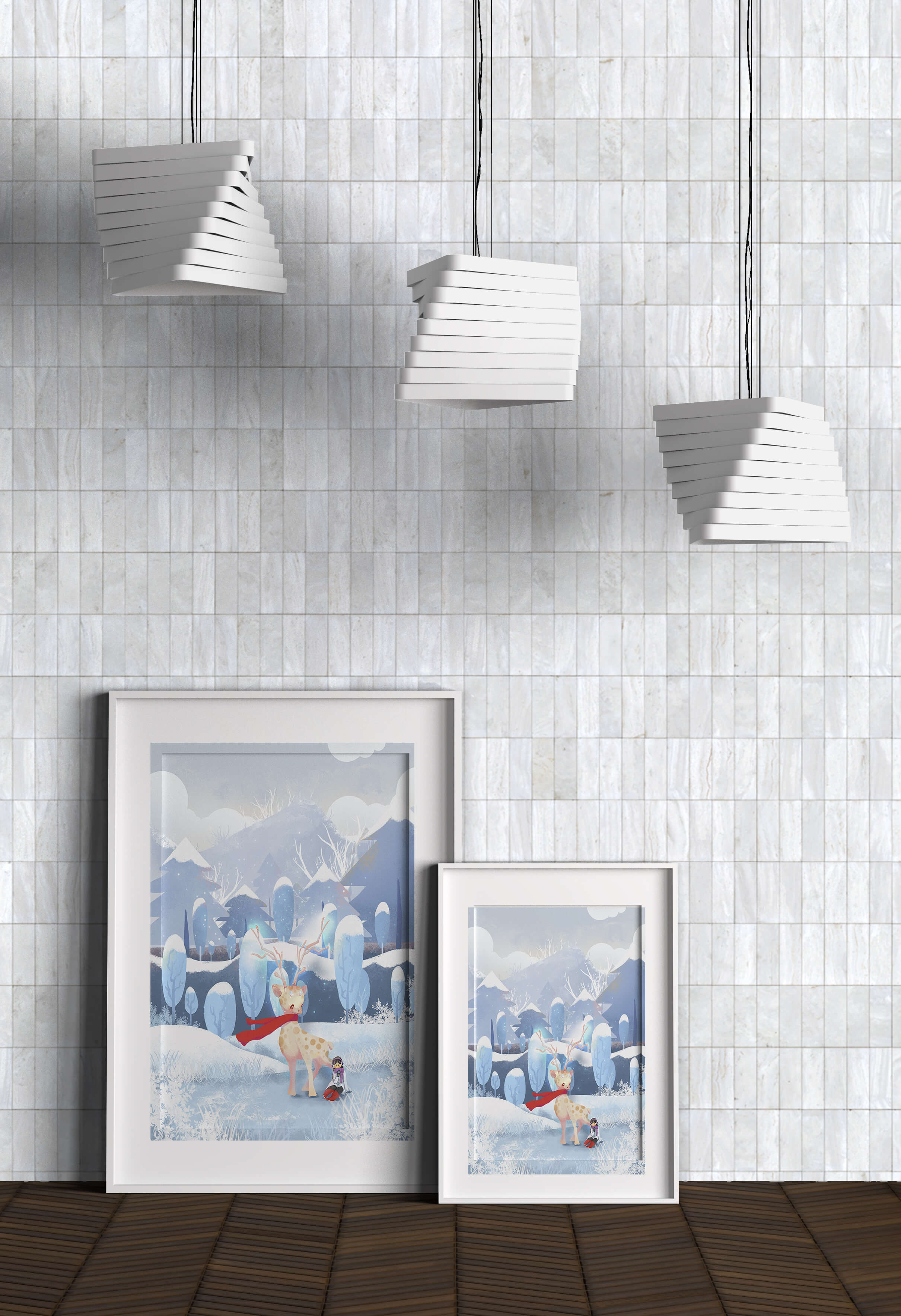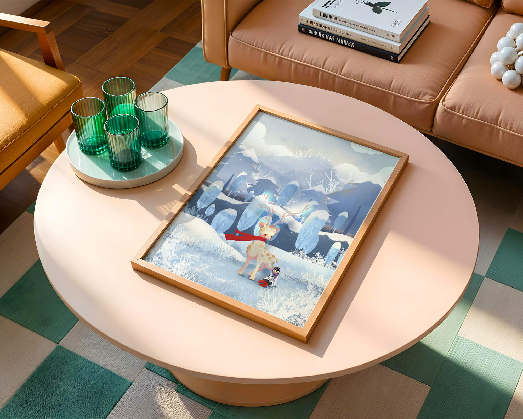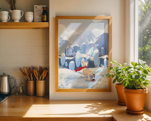 En esta encantadora ilustración, un ciervo moteado, adornado con una vibrante bufanda roja, se encuentra graciosamente en primer plano. A su lado, un niño vestido abrigadamente está sentado, añadiendo un toque caprichoso y entrañable a la escena. El telón de fondo del bosque nevado, con árboles cubiertos de escarcha y colinas ondulantes, realza la atmósfera serena y mágica. Los suaves tonos pastel de azul y blanco dominan el paisaje, transmitiendo una sensación de frío pero acogedor belleza. La suave representación de la naturaleza, combinada con elementos de fantasía, crea una experiencia reconfortante e imaginativa perfecta para habitaciones infantiles o decoración temática de invierno. Las ramas cargadas de nieve y las montañas distantes completan el entorno onírico y tranquilo.| Tipo |
