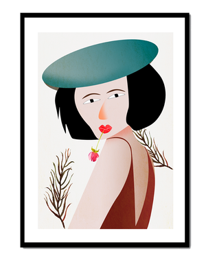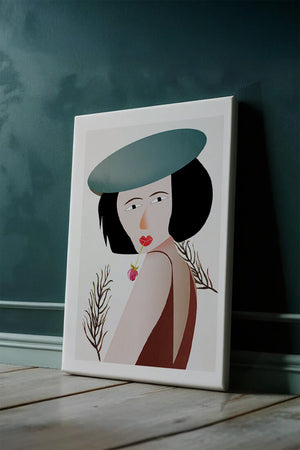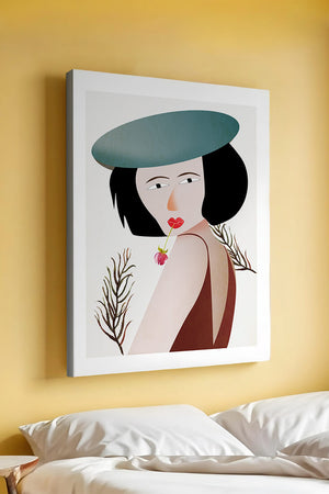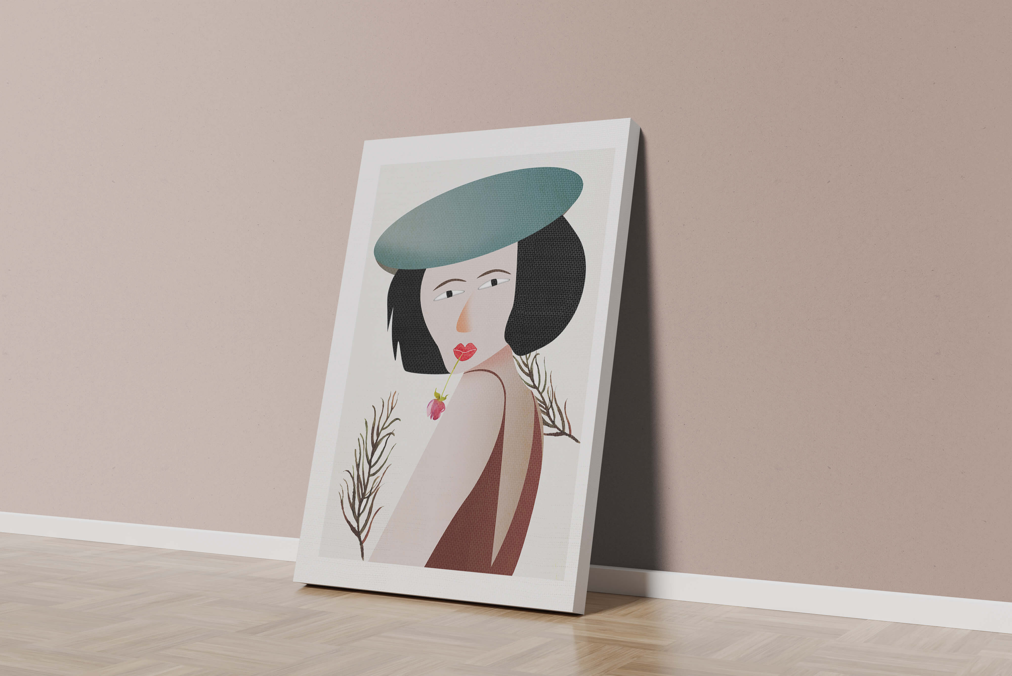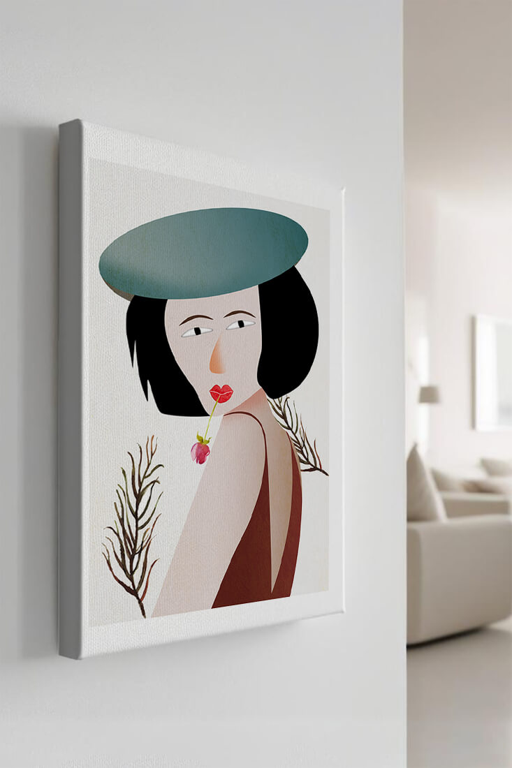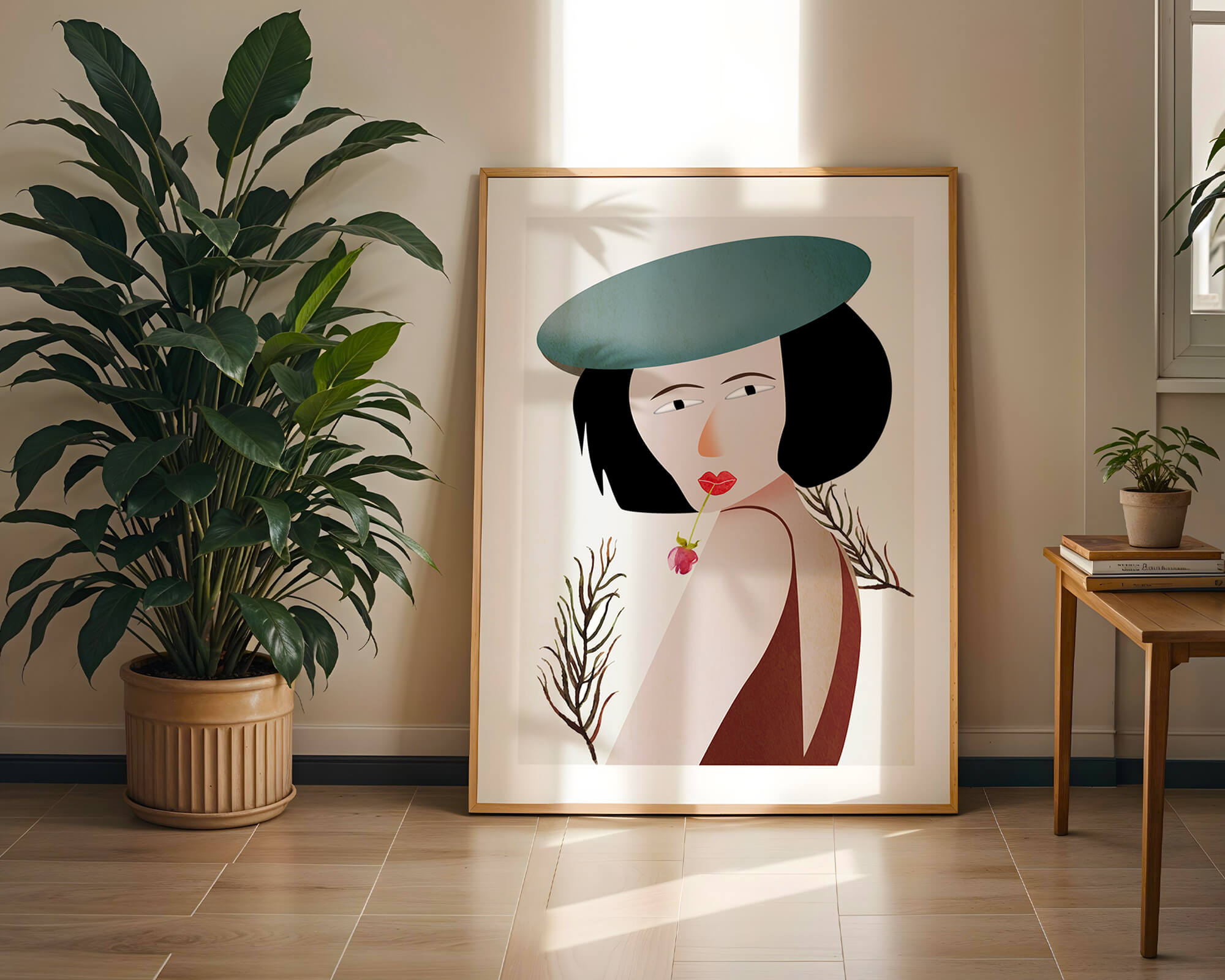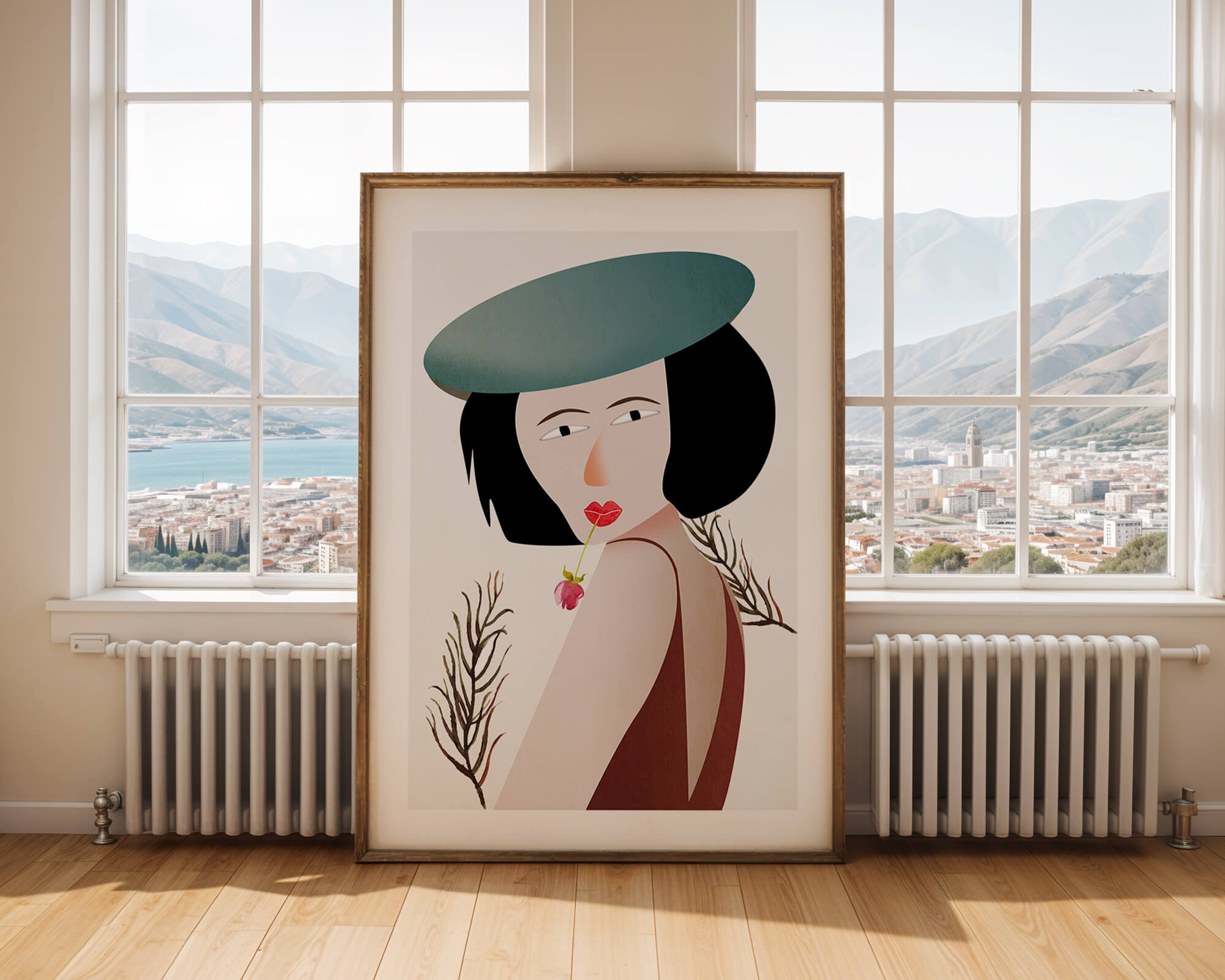 Esta obra presenta un retrato estilizado de una mujer con un sombrero azul y sosteniendo una flor en la boca. La pieza combina elementos de la moda y el arte moderno.