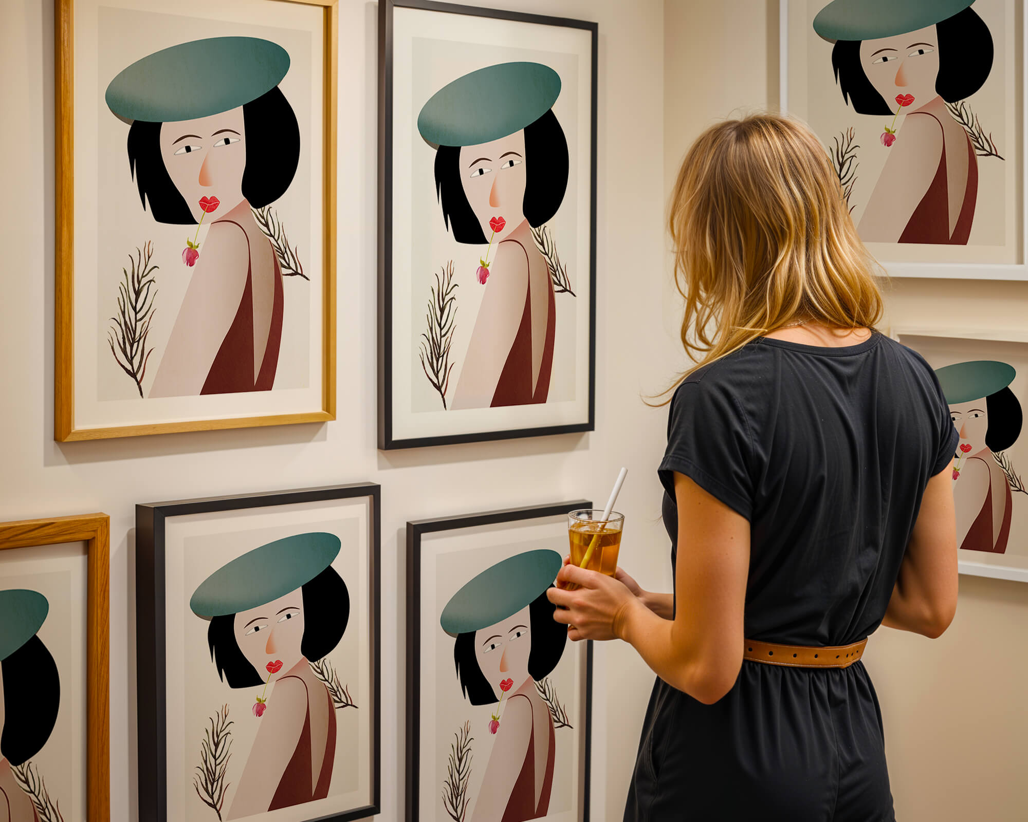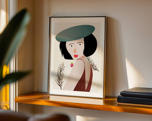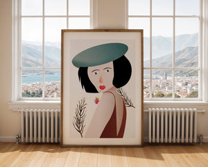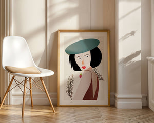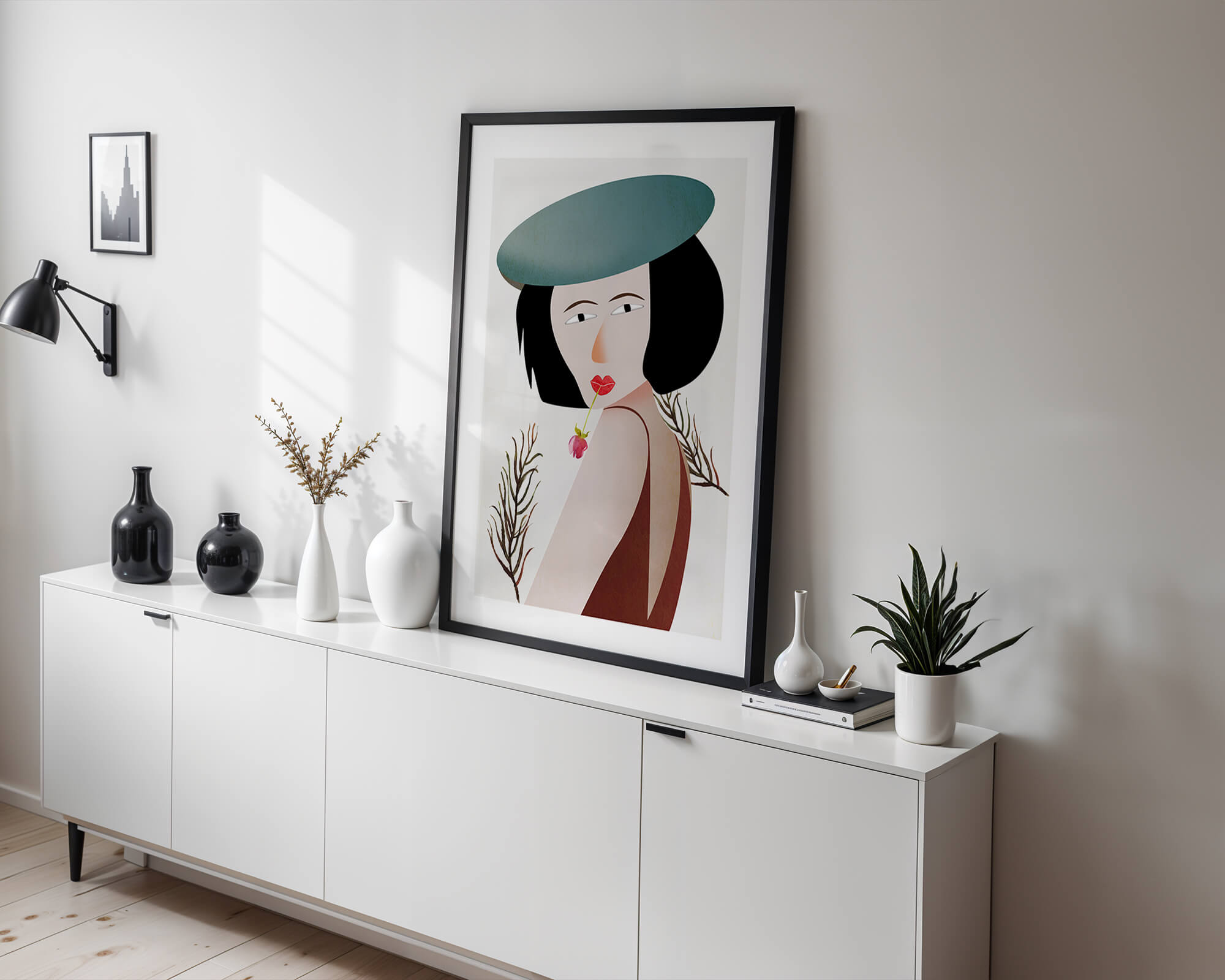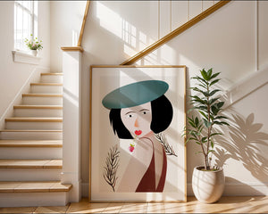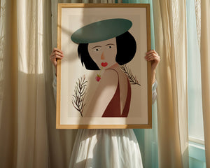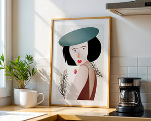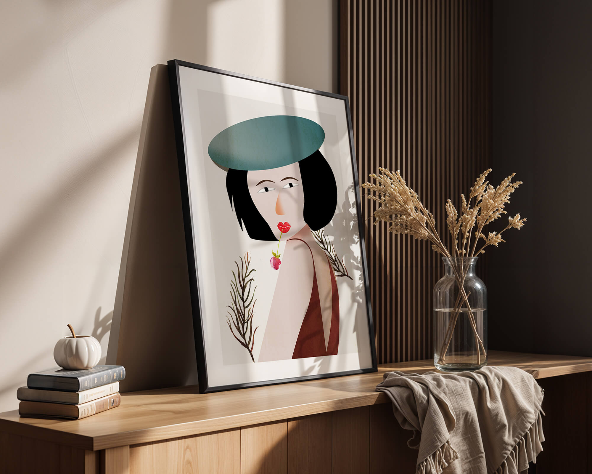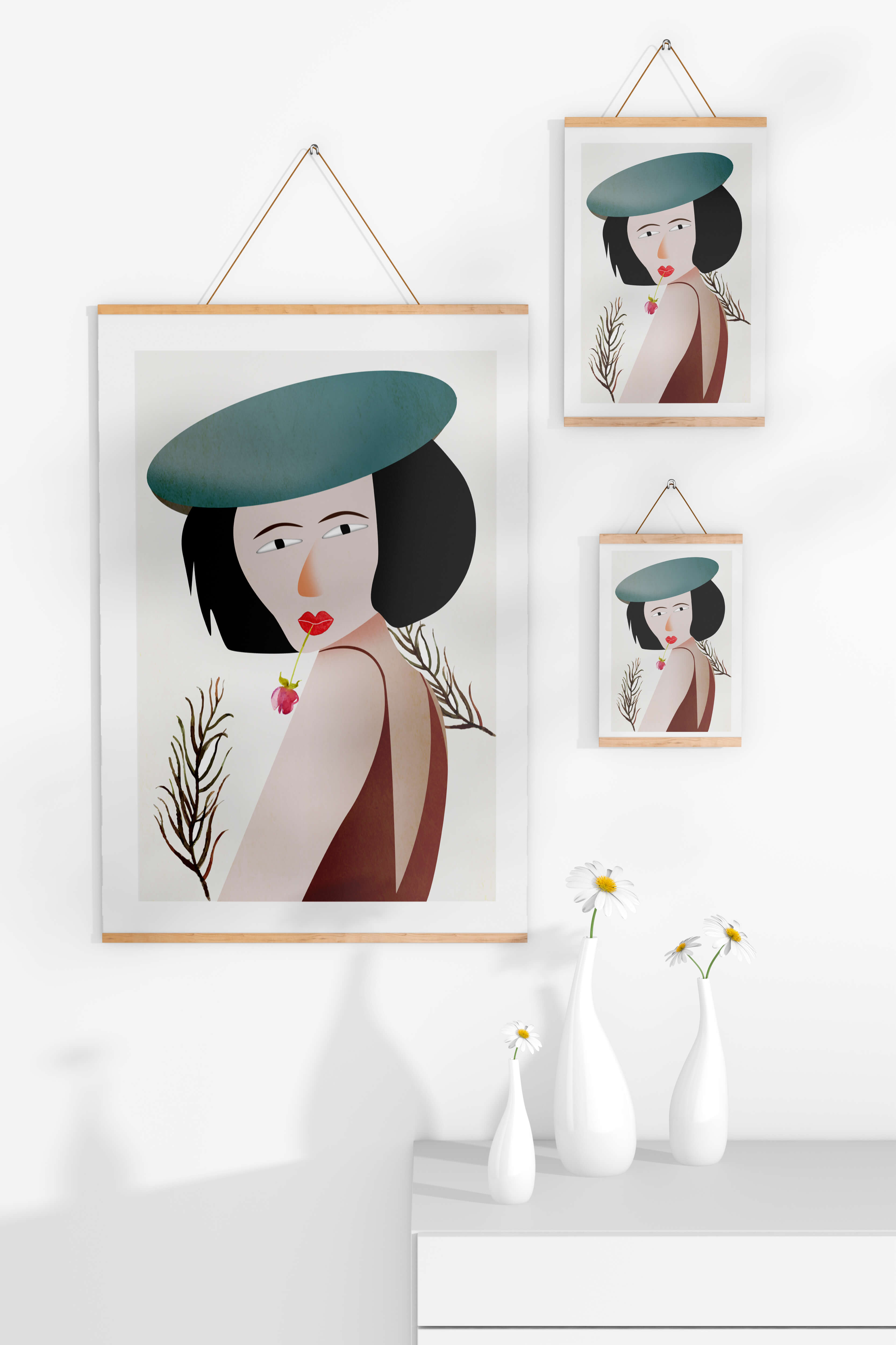 Esta obra presenta un retrato estilizado de una mujer con un sombrero azul y sosteniendo una flor en la boca. La pieza combina elementos de la moda y el arte moderno.