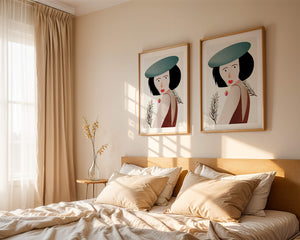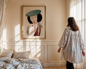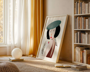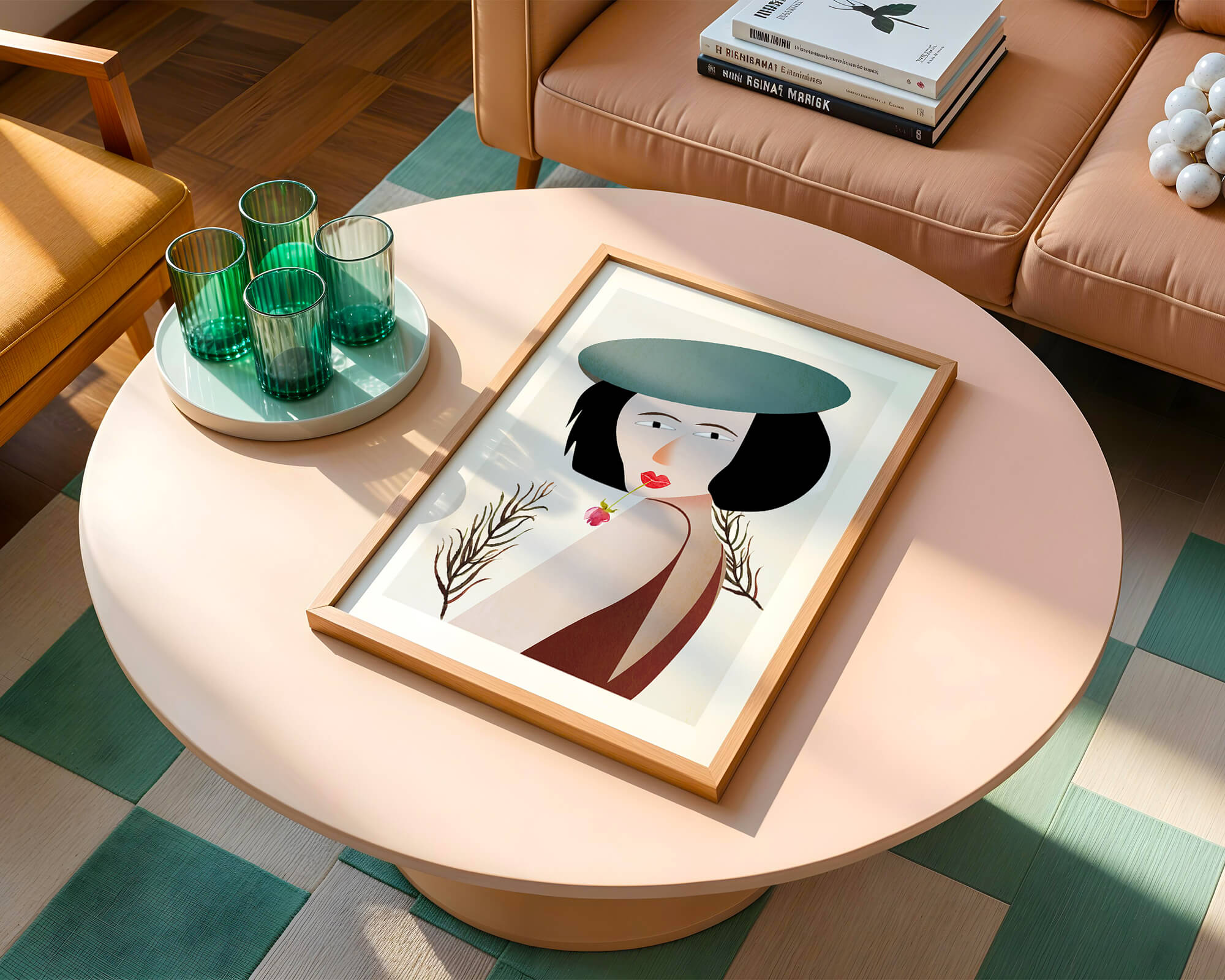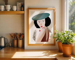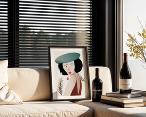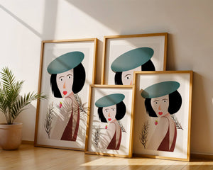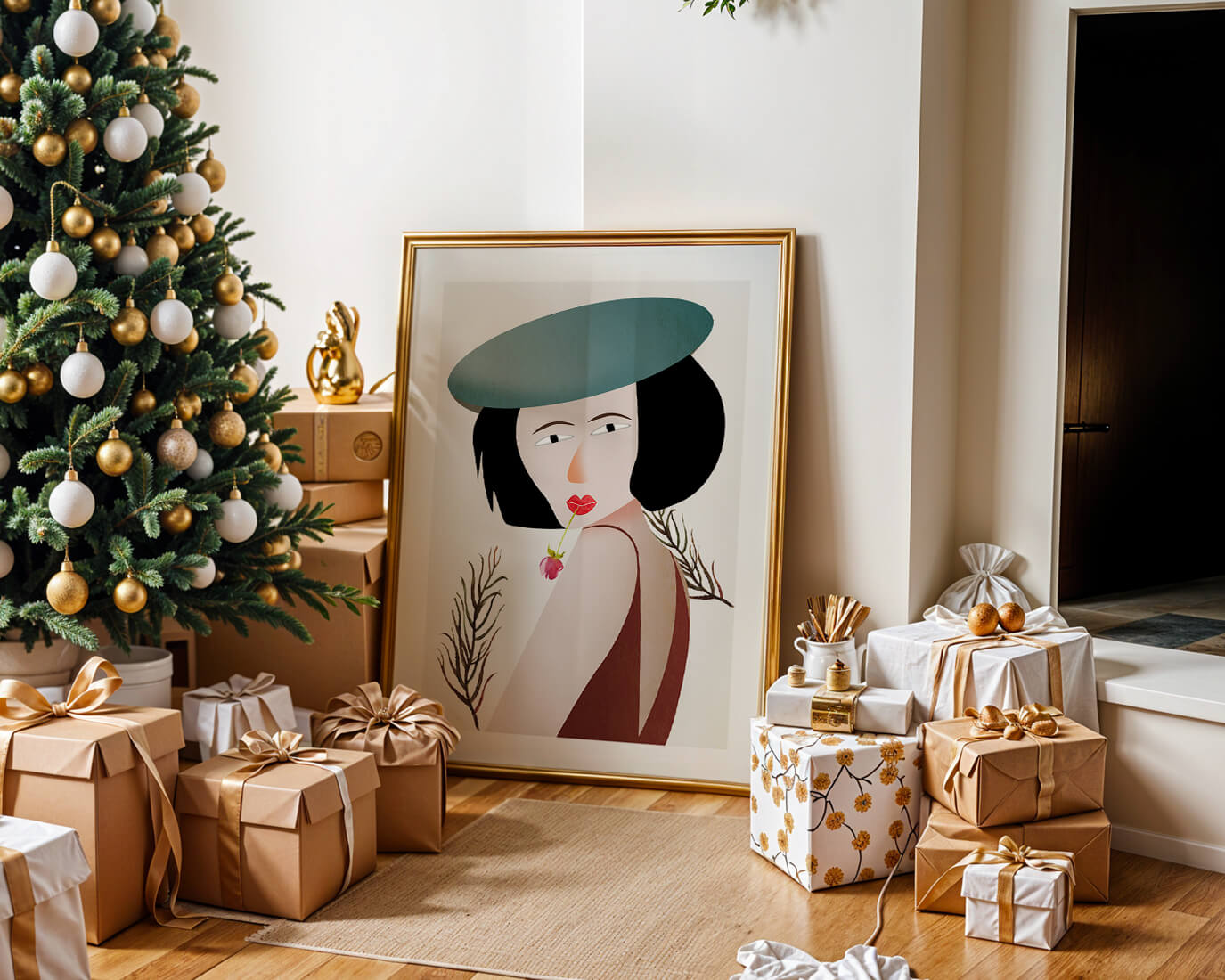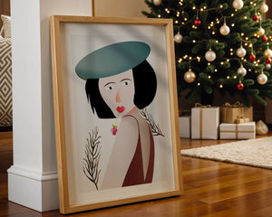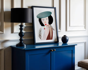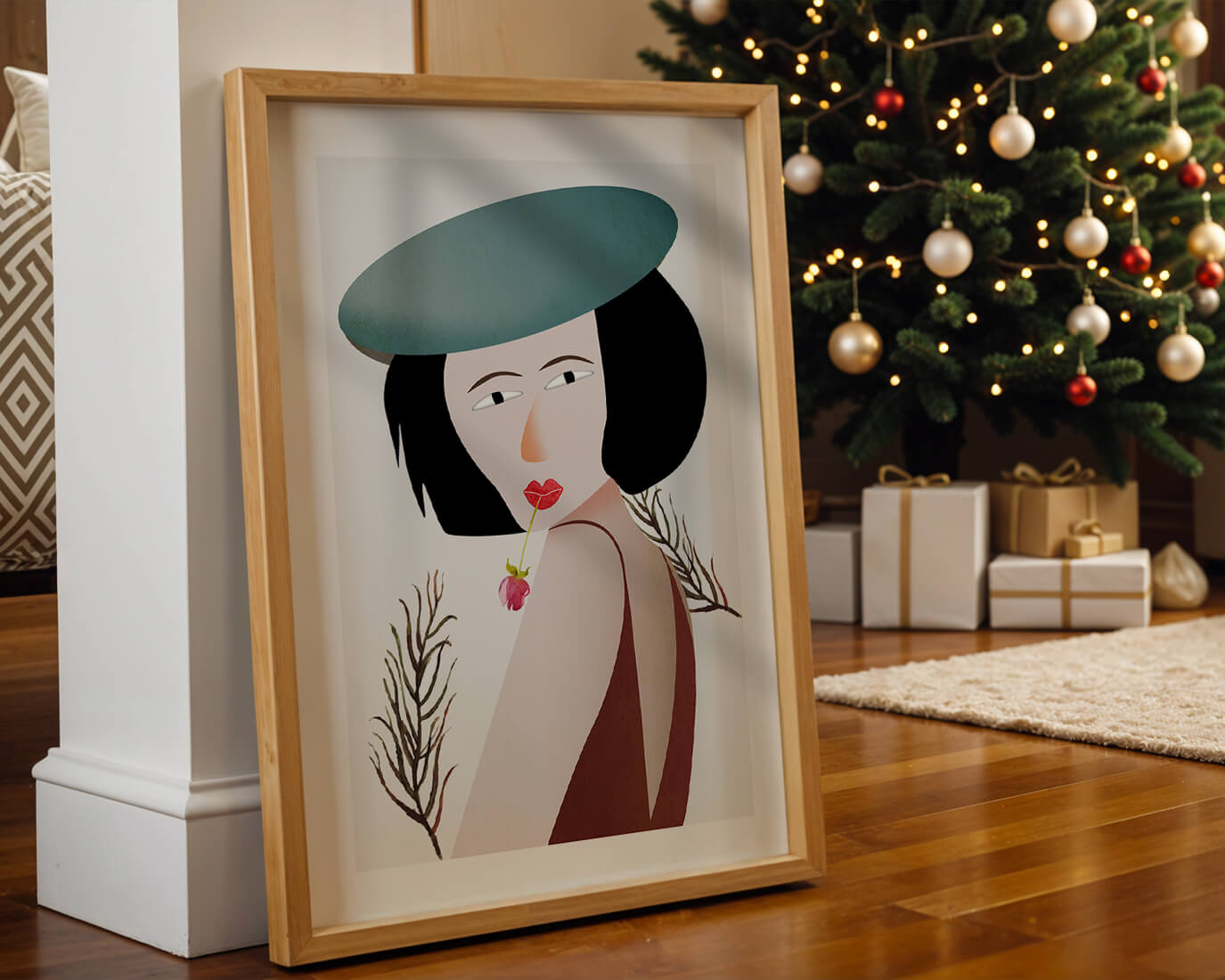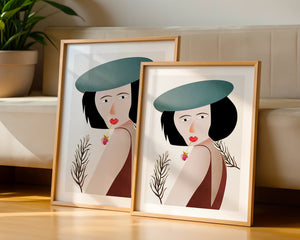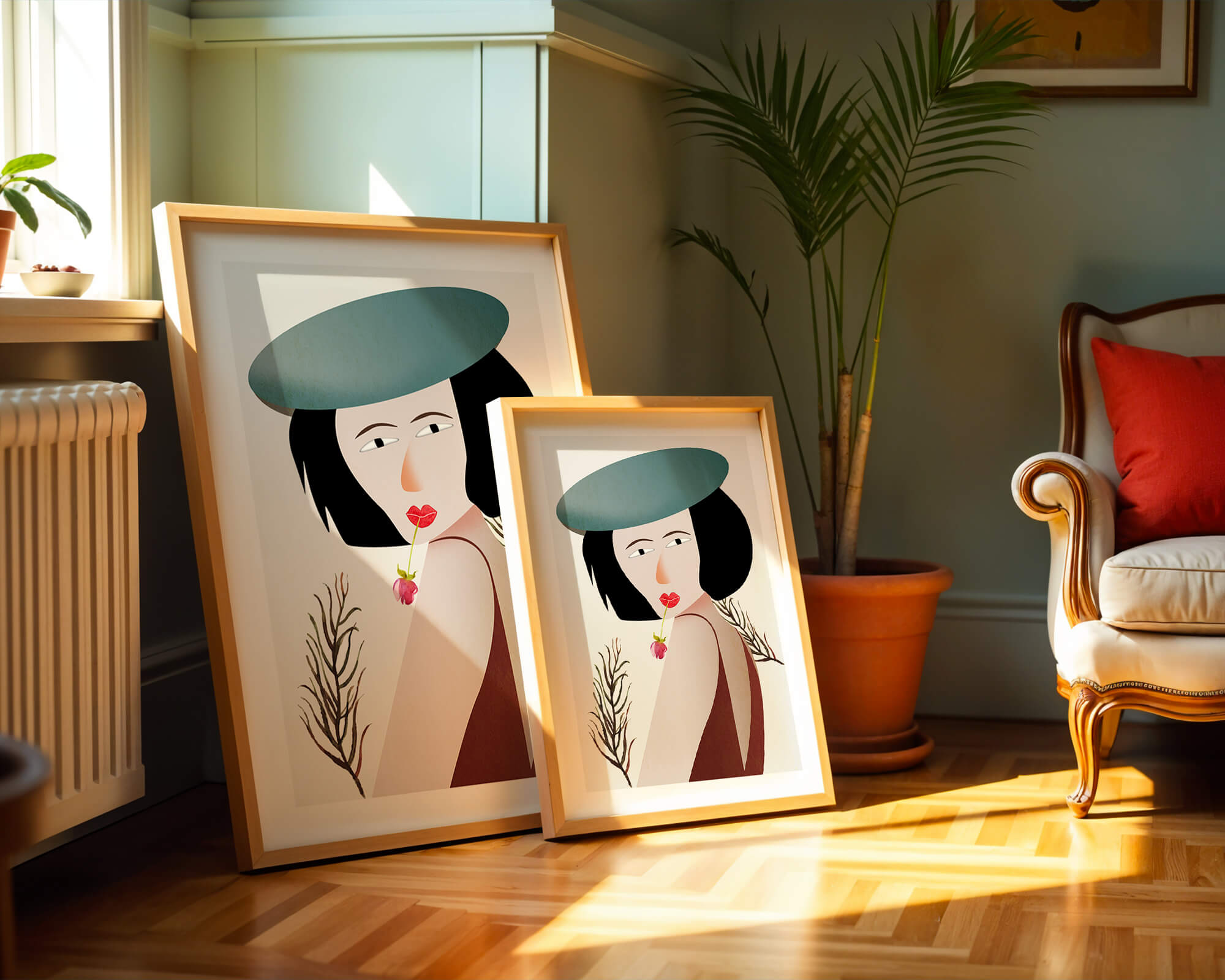 Esta obra presenta un retrato estilizado de una mujer con un sombrero azul y sosteniendo una flor en la boca. La pieza combina elementos de la moda y el arte moderno.