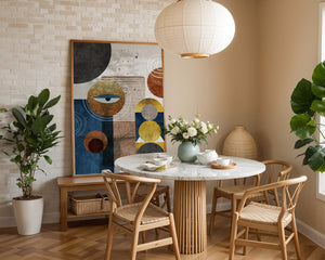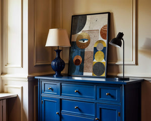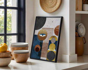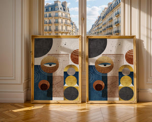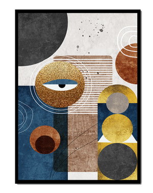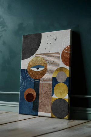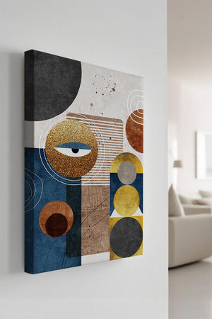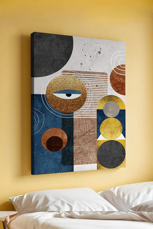 L'image présente un mélange harmonieux de cercles et de rectangles aux couleurs et textures variées, avec une utilisation prédominante des tons dorés et bleus. L'interaction de ces formes crée une composition dynamique, à la fois moderne et élégante. Au cœur du motif se trouve un cercle doré contenant une forme d'œil, entouré de motifs de lignes complexes qui ajoutent profondeur et intérêt. Avec son style contemporain, cette œuvre d'art est parfaite pour apporter une touche sophistiquée à tout espace, qu'il s'agisse d'un salon, d'une chambre ou d'un bureau. Les textures et les couleurs sont conçues pour s'harmoniser avec une grande variété d'intérieurs, ce qui en fait un ajout polyvalent à votre décoration.| Taper |