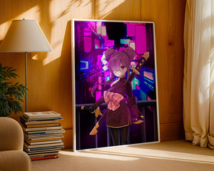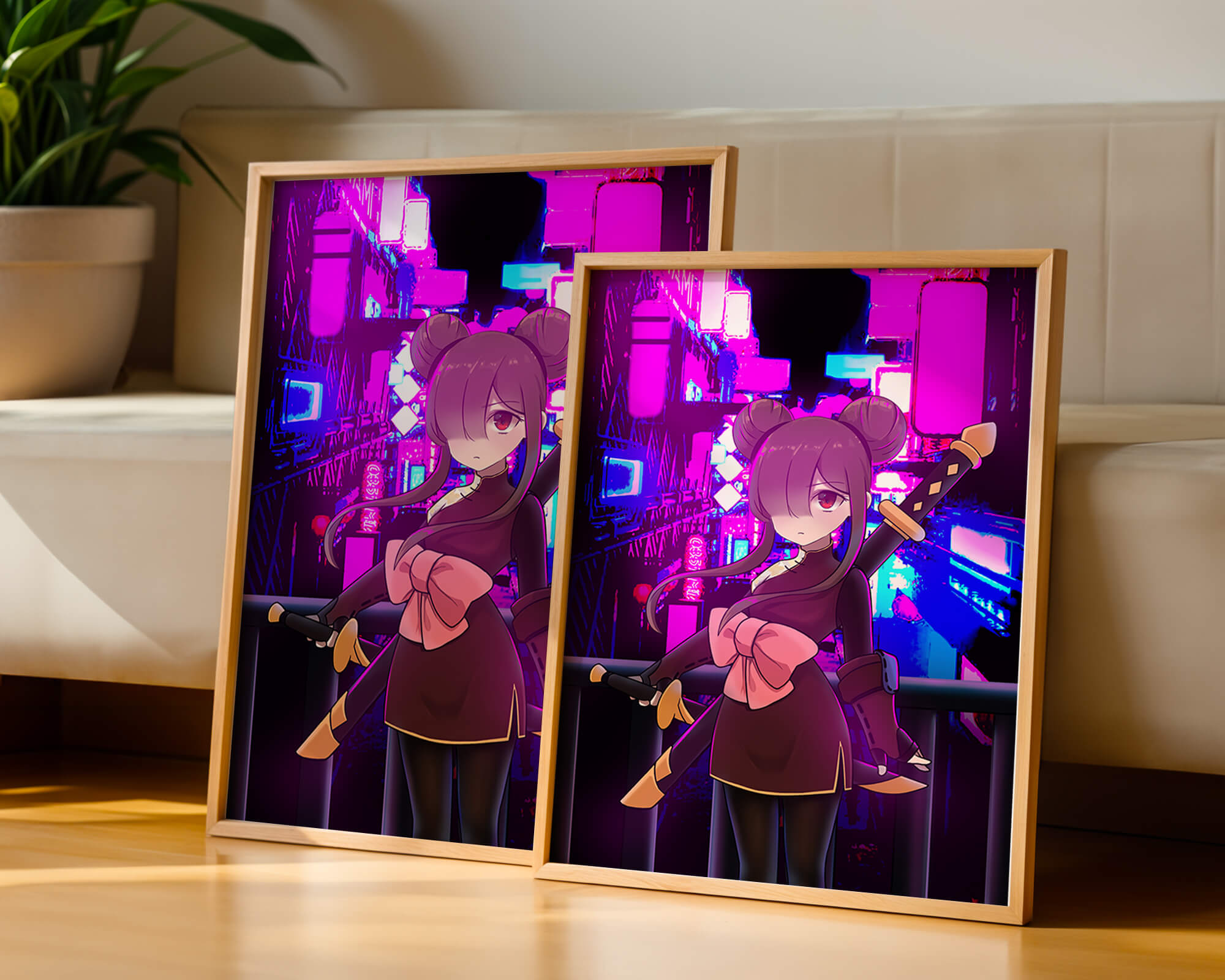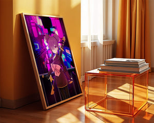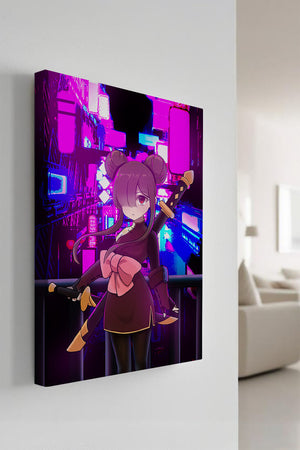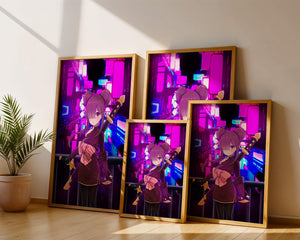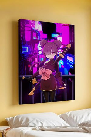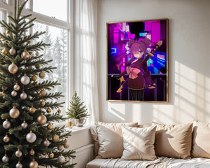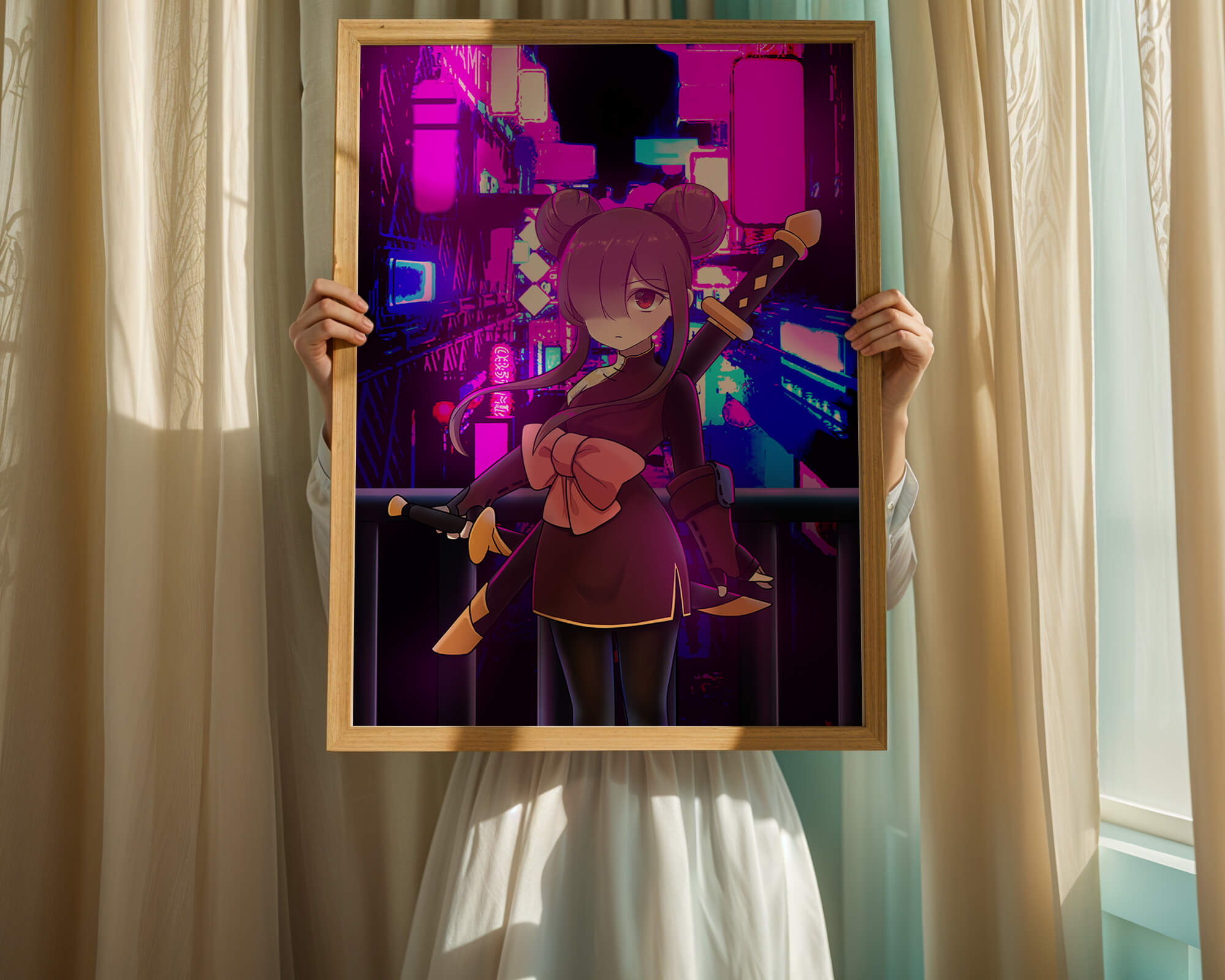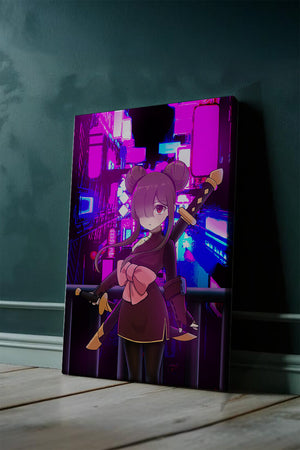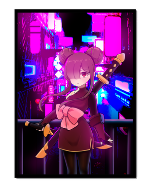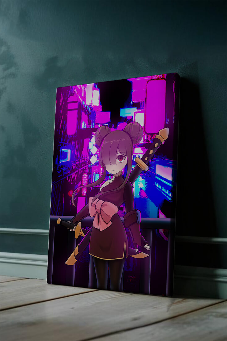 Le personnage se tient debout avec assurance, tenant des épées d'une manière qui suggère la détermination et la force. Sa tenue détaillée, mise en valeur par un grand nœud rose et des chignons élégants, apporte une touche distincte à son apparence. Les détails noirs et dorés des épées complètent son look, rehaussant l'esthétique globale de l'illustration. À l'arrière-plan, le paysage urbain au néon saisissant crée un contraste net avec ses roses, bleus et violets éclatants. Cet environnement urbain coloré apporte de la profondeur à l'image, en faisant une pièce idéale pour ceux qui apprécient l'art anime infusé de visuels modernes et dynamiques. La scène évoque un sentiment d'aventure et l'excitation d'une vie citadine moderne et animée.| Taper |