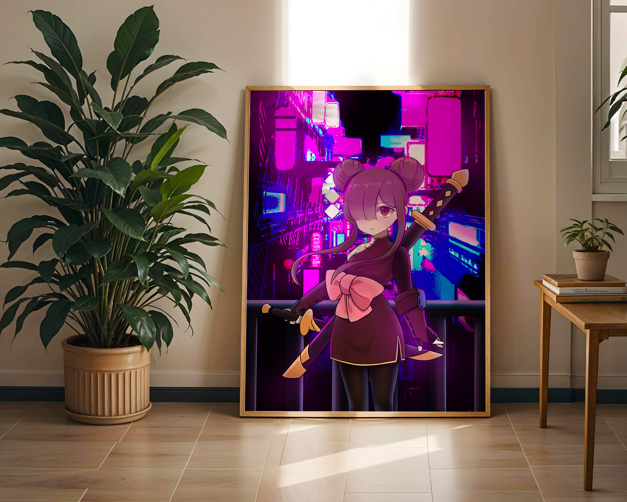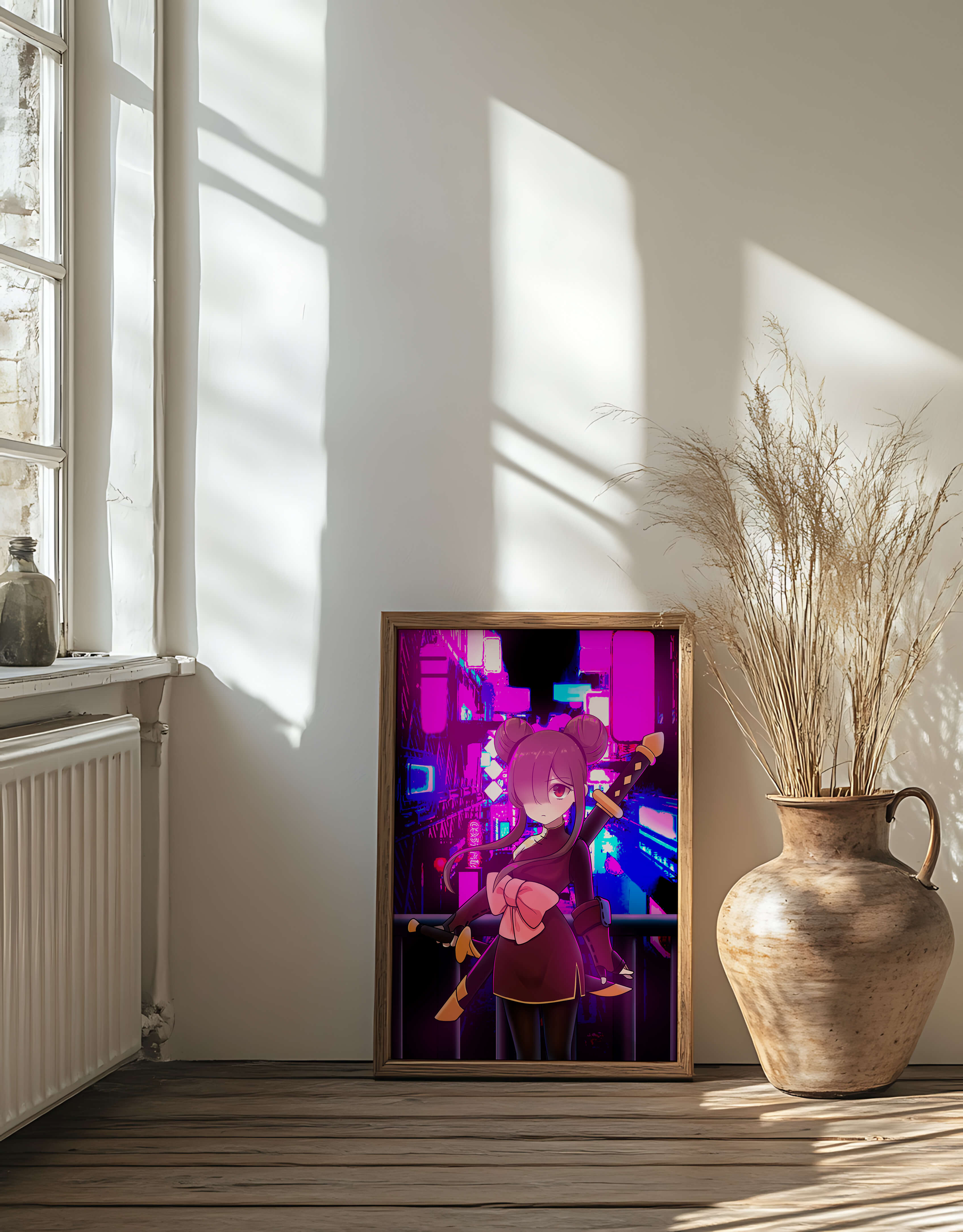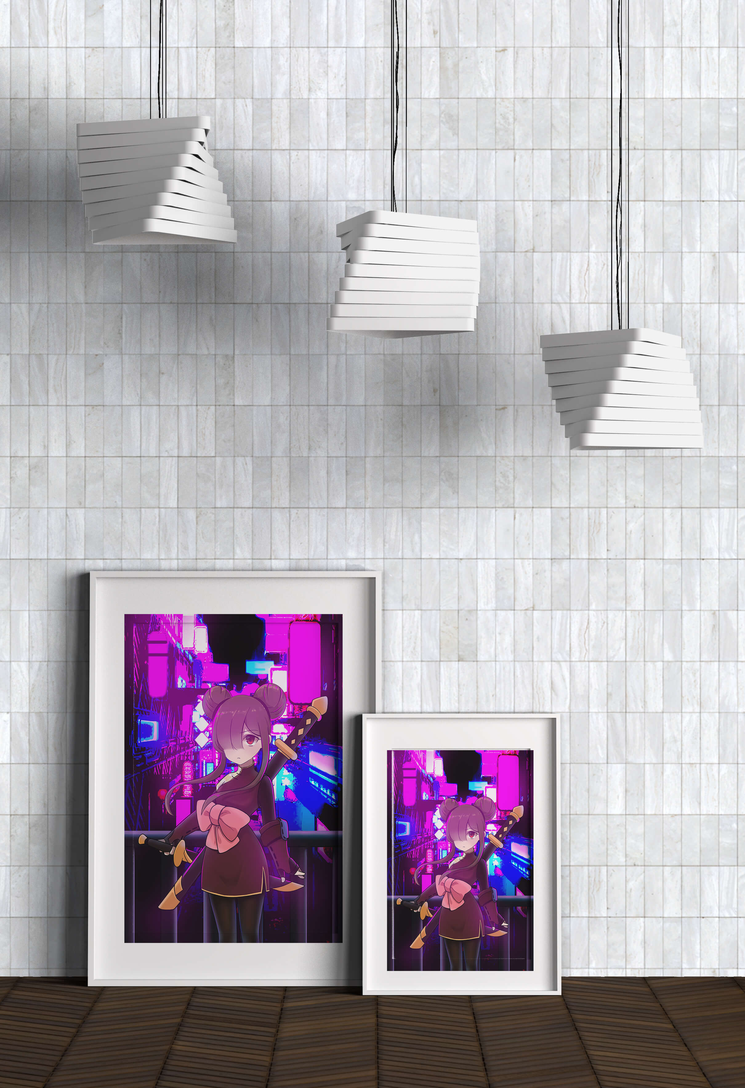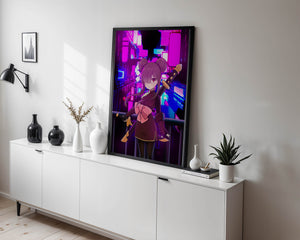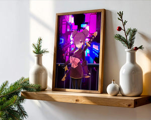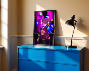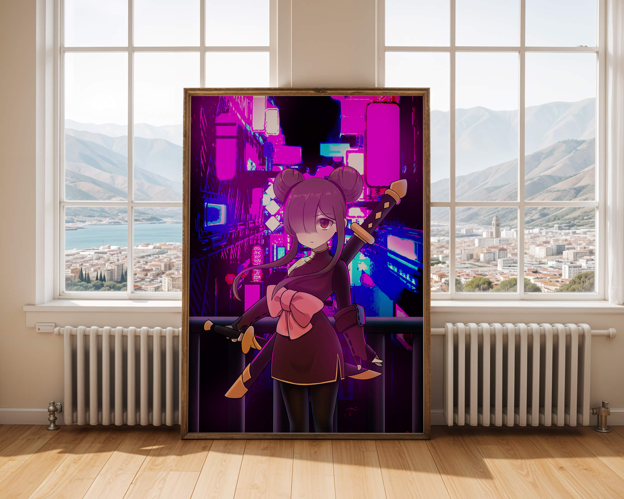 Le personnage se tient debout avec assurance, tenant des épées d'une manière qui suggère la détermination et la force. Sa tenue détaillée, mise en valeur par un grand nœud rose et des chignons élégants, apporte une touche distincte à son apparence. Les détails noirs et dorés des épées complètent son look, rehaussant l'esthétique globale de l'illustration. À l'arrière-plan, le paysage urbain au néon saisissant crée un contraste net avec ses roses, bleus et violets éclatants. Cet environnement urbain coloré apporte de la profondeur à l'image, en faisant une pièce idéale pour ceux qui apprécient l'art anime infusé de visuels modernes et dynamiques. La scène évoque un sentiment d'aventure et l'excitation d'une vie citadine moderne et animée.| Taper |