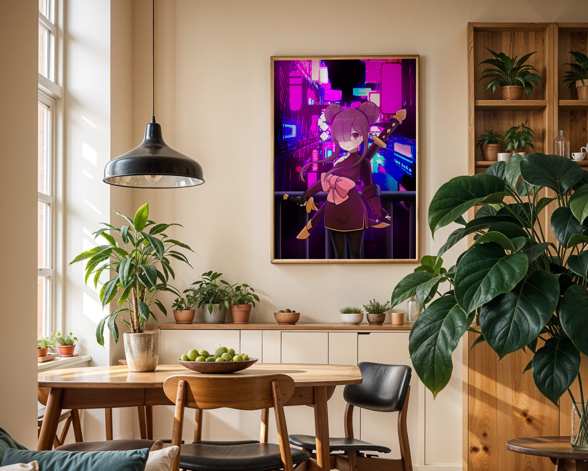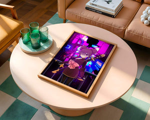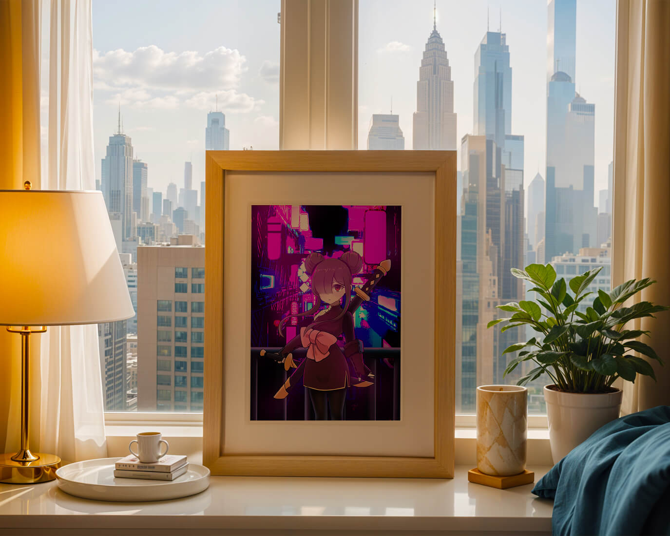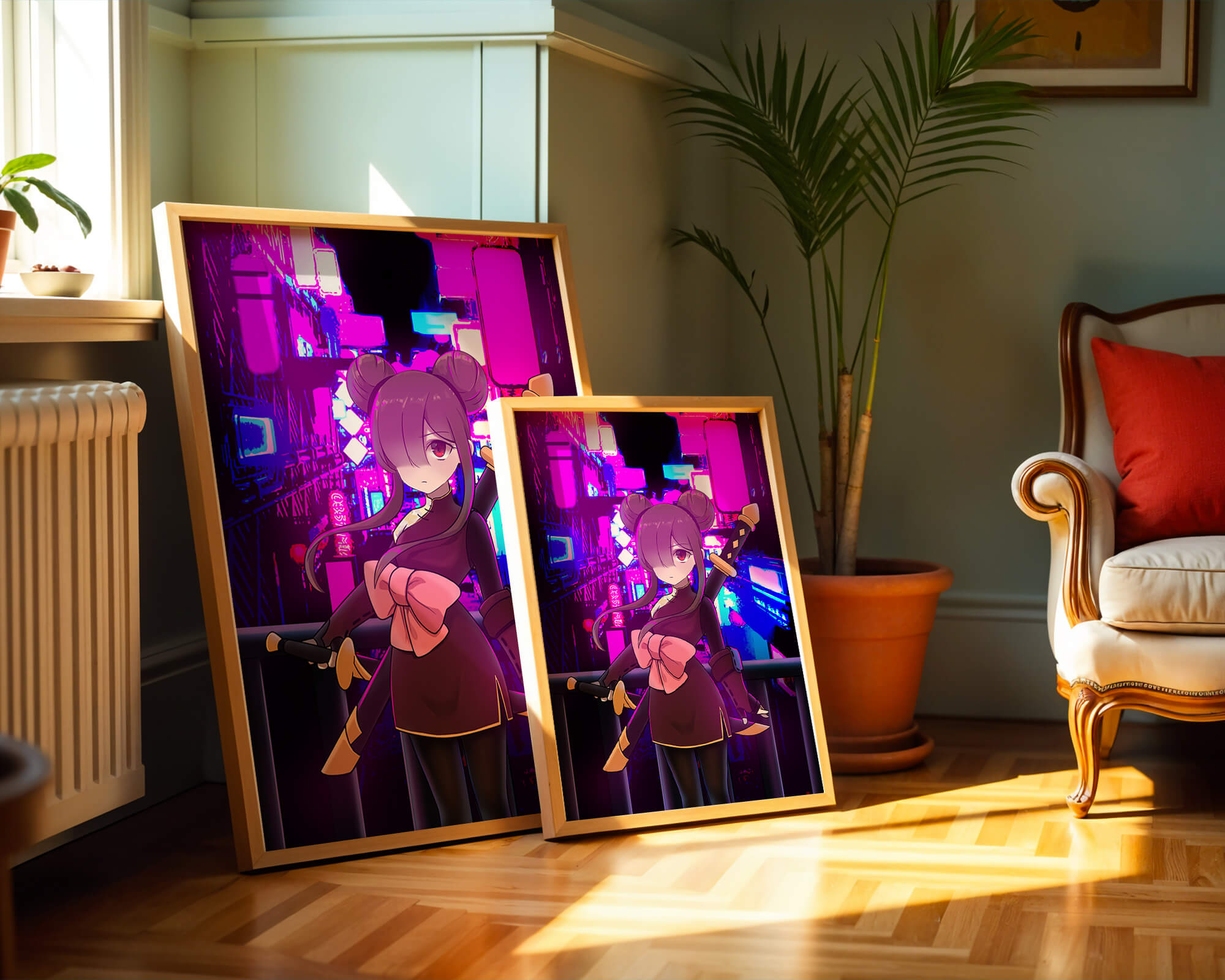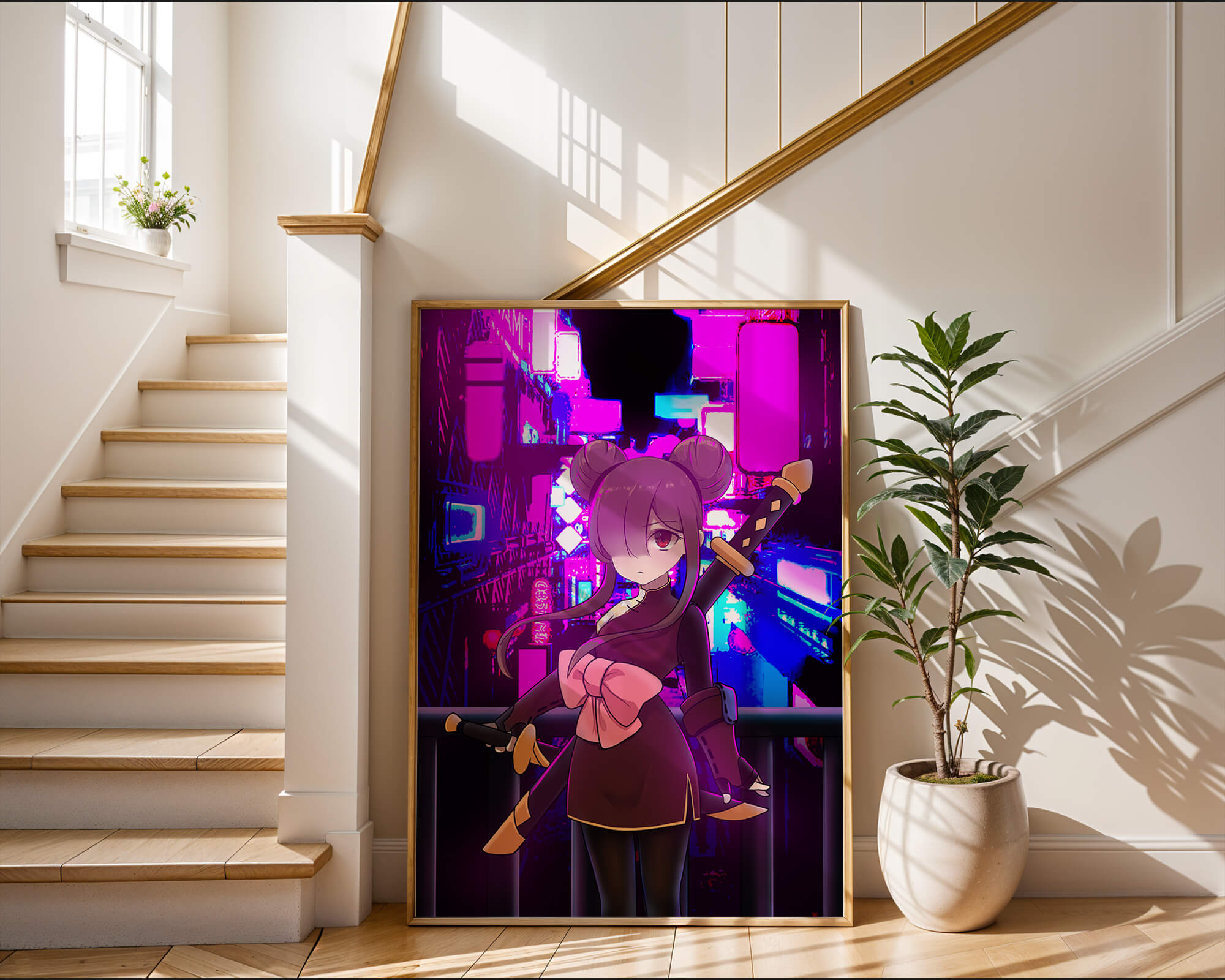 Le personnage se tient debout avec assurance, tenant des épées d'une manière qui suggère la détermination et la force. Sa tenue détaillée, mise en valeur par un grand nœud rose et des chignons élégants, apporte une touche distincte à son apparence. Les détails noirs et dorés des épées complètent son look, rehaussant l'esthétique globale de l'illustration. À l'arrière-plan, le paysage urbain au néon saisissant crée un contraste net avec ses roses, bleus et violets éclatants. Cet environnement urbain coloré apporte de la profondeur à l'image, en faisant une pièce idéale pour ceux qui apprécient l'art anime infusé de visuels modernes et dynamiques. La scène évoque un sentiment d'aventure et l'excitation d'une vie citadine moderne et animée.| Taper |