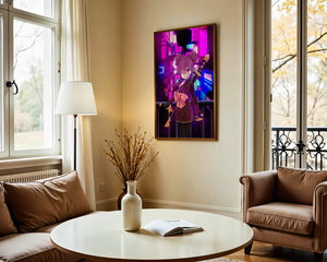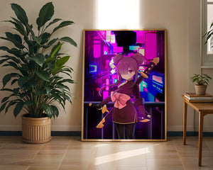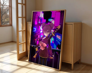 L'image capture l'essence d'une scène nocturne urbaine vibrante, mettant en scène un personnage d'anime sur fond de lumières au néon. Les couleurs vives et dynamiques offrent une atmosphère intense et captivante.