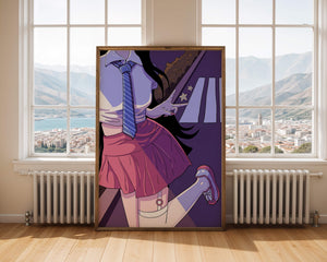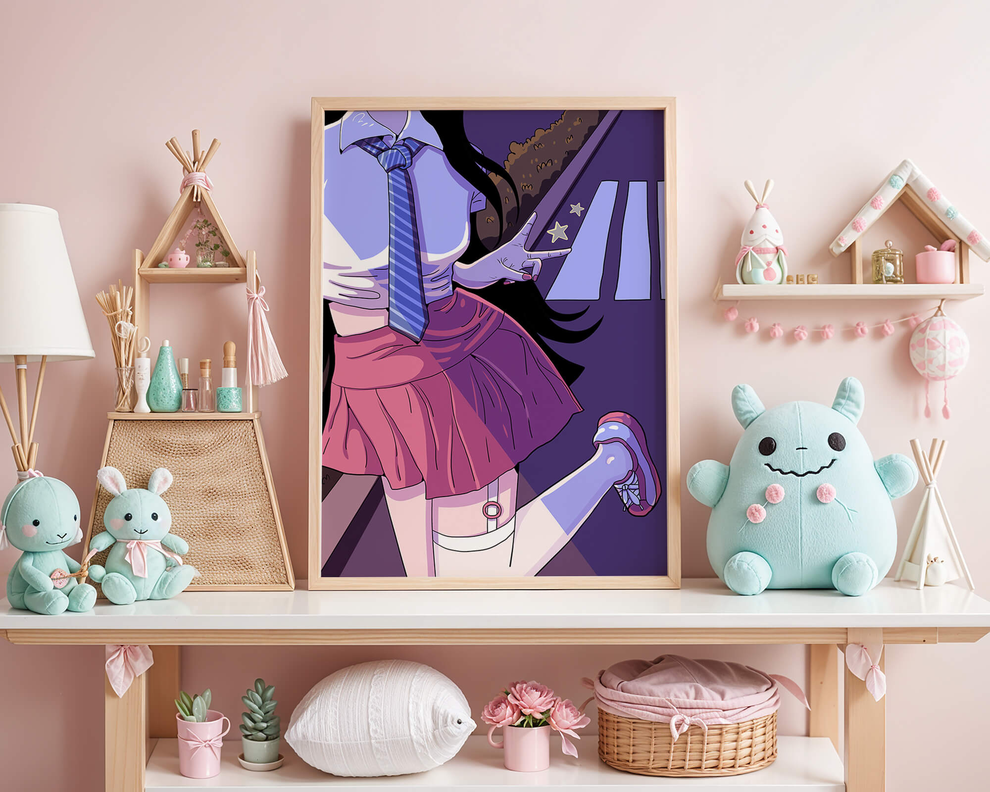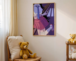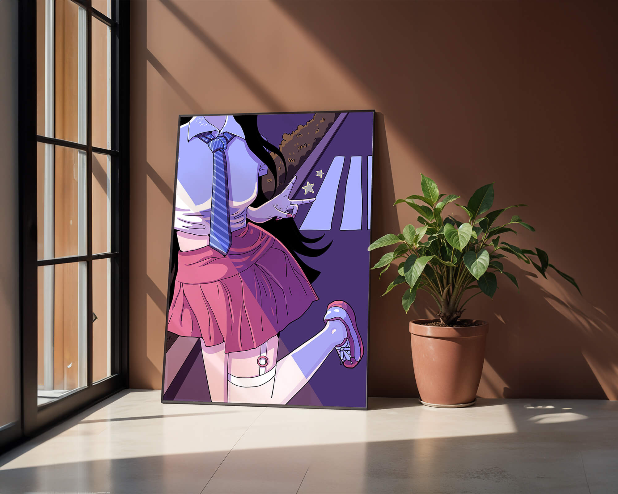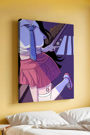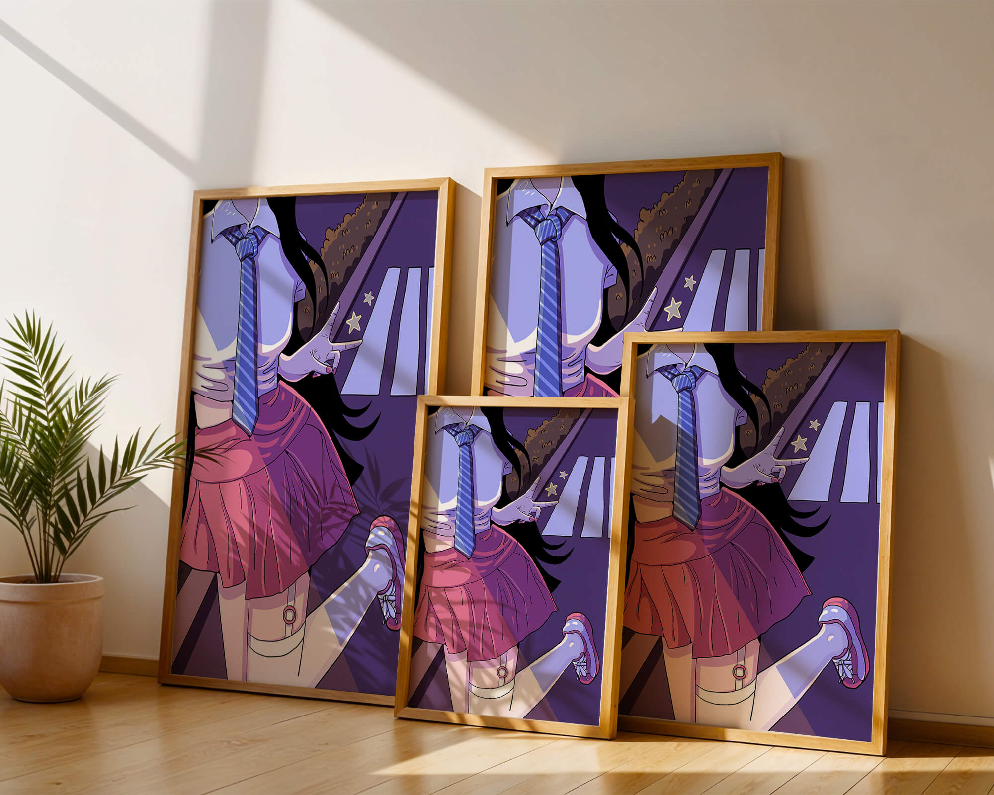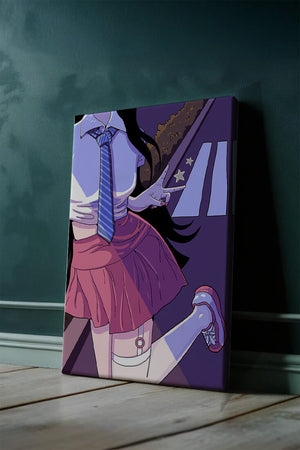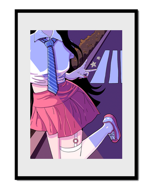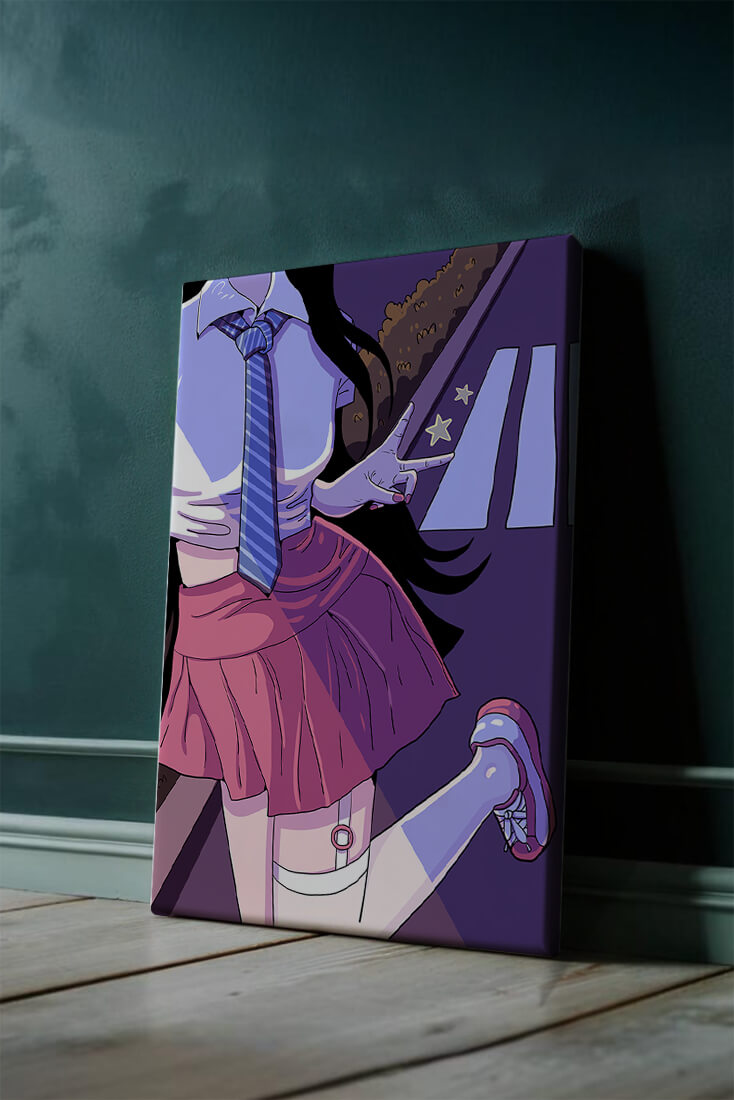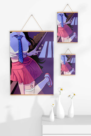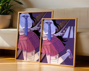 La jeune fille est saisie en plein mouvement, adoptant une pose ludique avec un signe de paix formé par ses doigts. Elle porte un uniforme scolaire classique avec une cravate à rayures bleues et une jupe rose, ajoutant à l'esthétique juvénile. Les couleurs vives créent un contraste saisissant avec l'arrière-plan sombre et chargé d'ombres, amplifiant l'attrait visuel général. Placée sur une toile de fond urbaine, l'image met en scène un passage piéton stylisé et une végétation lointaine, soulignés par des motifs d'étoiles qui évoquent une ambiance nocturne. Cette composition mêle des éléments de réalisme à une imagination artistique, en faisant une pièce captivante pour les amateurs d'anime et d'art numérique.| Taper |