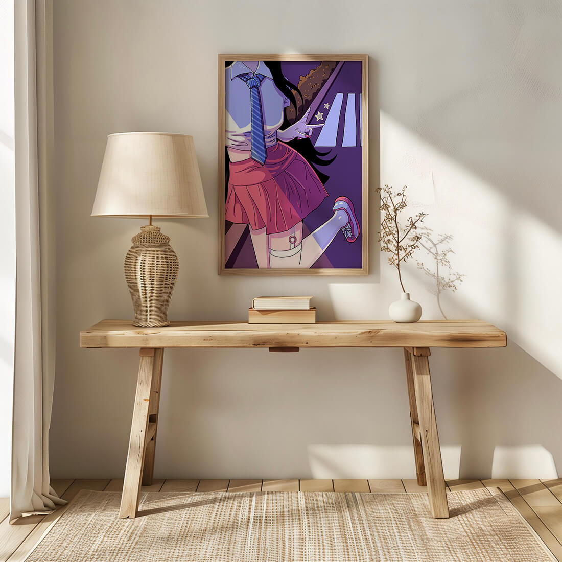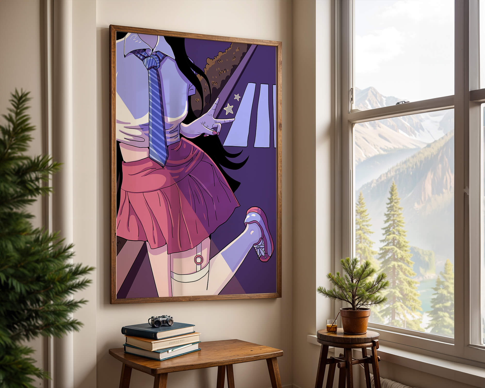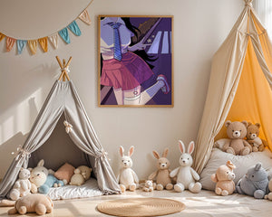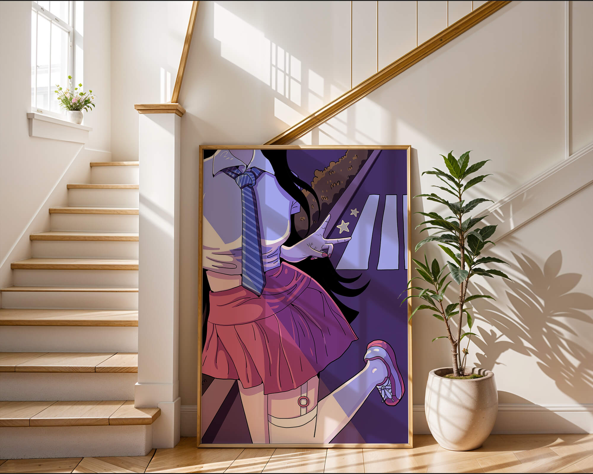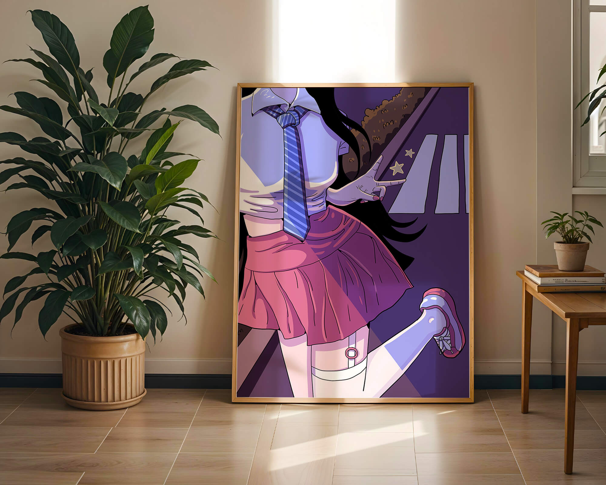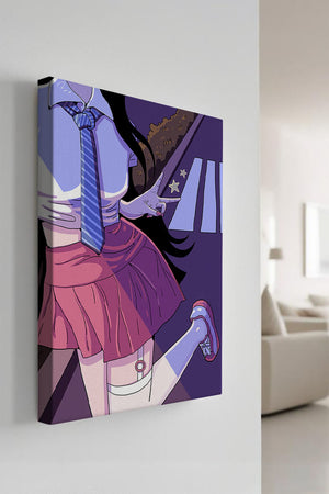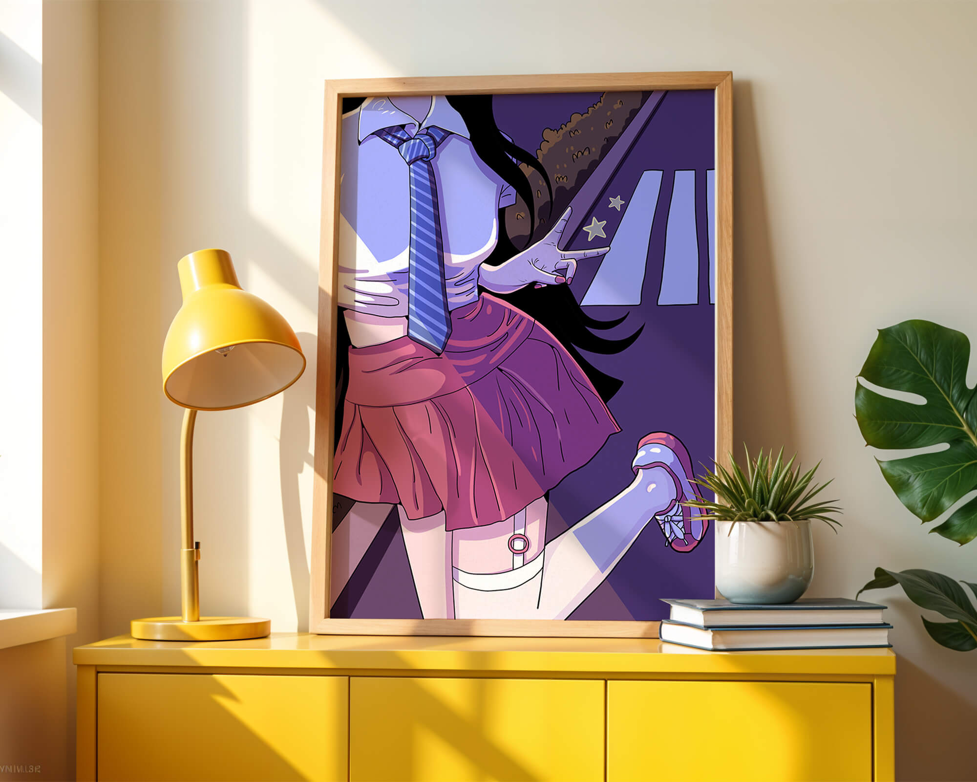 La jeune fille est saisie en plein mouvement, adoptant une pose ludique avec un signe de paix formé par ses doigts. Elle porte un uniforme scolaire classique avec une cravate à rayures bleues et une jupe rose, ajoutant à l'esthétique juvénile. Les couleurs vives créent un contraste saisissant avec l'arrière-plan sombre et chargé d'ombres, amplifiant l'attrait visuel général. Placée sur une toile de fond urbaine, l'image met en scène un passage piéton stylisé et une végétation lointaine, soulignés par des motifs d'étoiles qui évoquent une ambiance nocturne. Cette composition mêle des éléments de réalisme à une imagination artistique, en faisant une pièce captivante pour les amateurs d'anime et d'art numérique.| Taper |