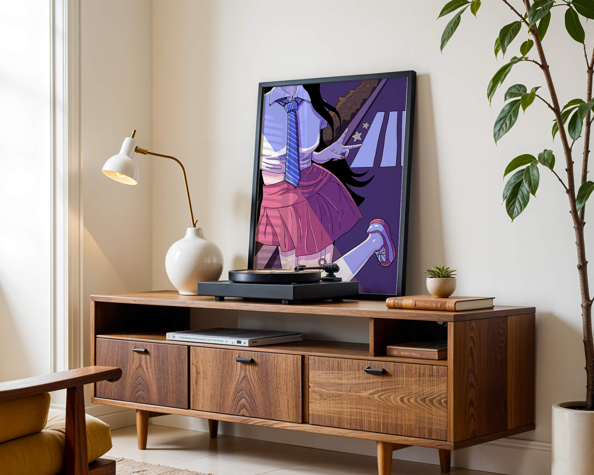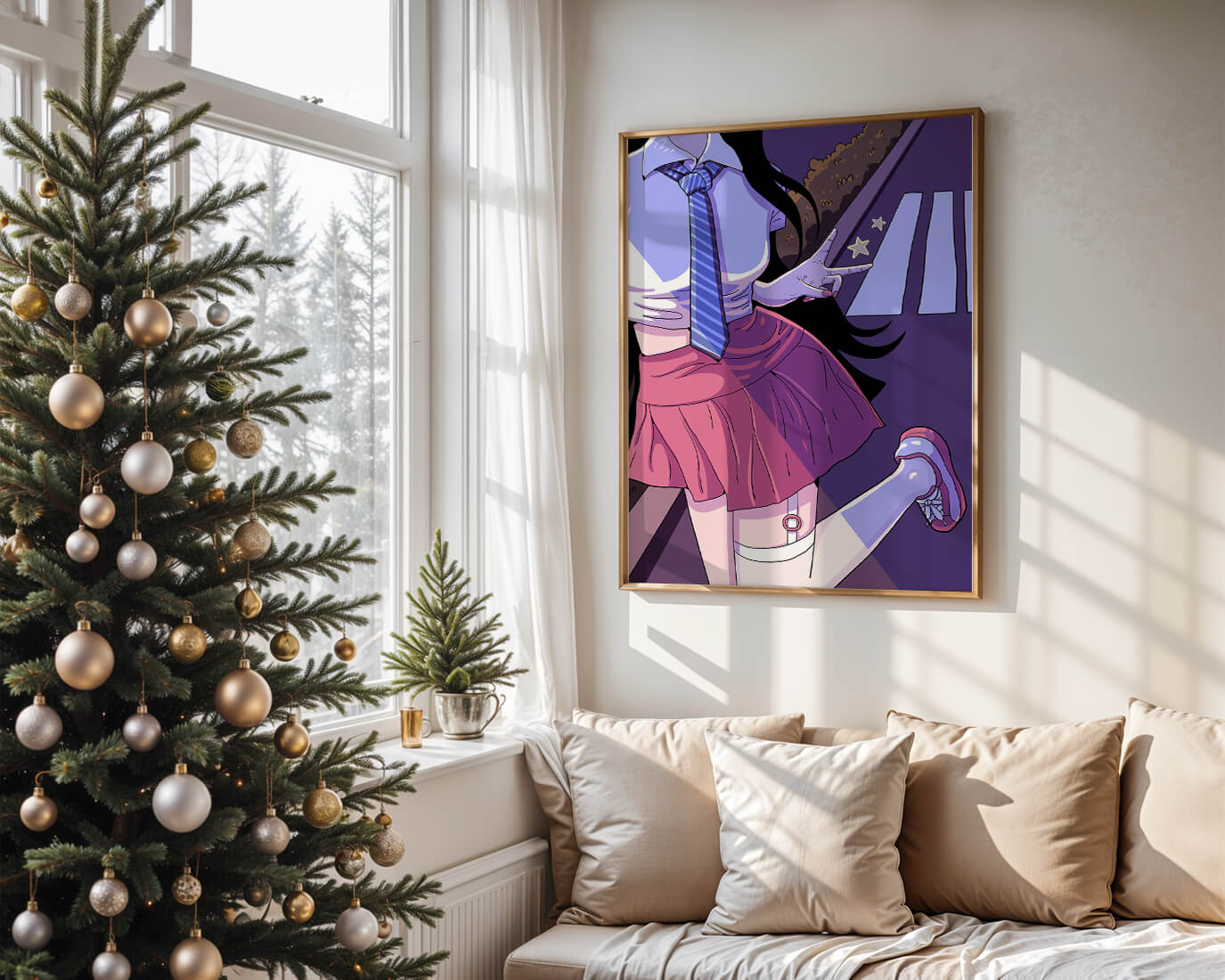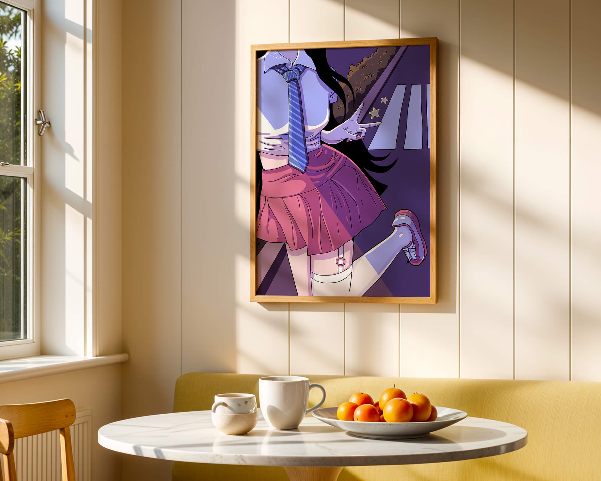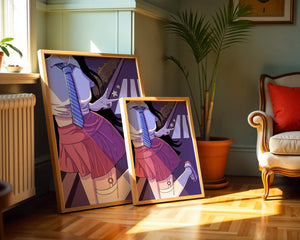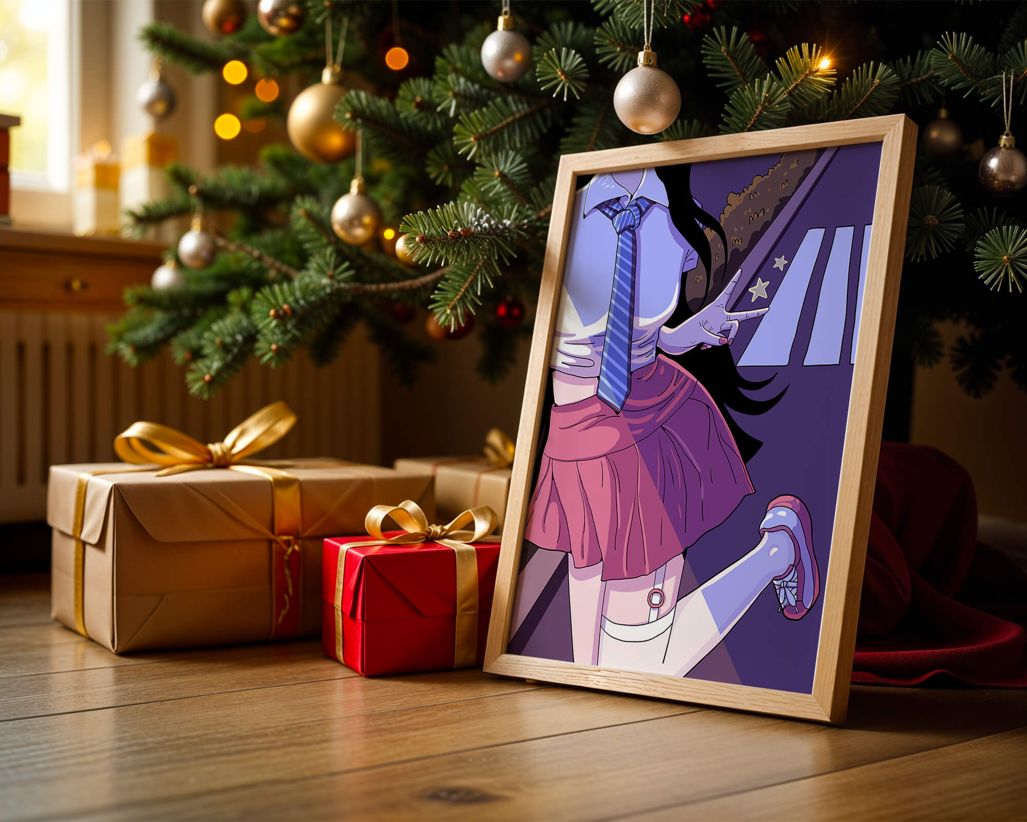 La jeune fille est saisie en plein mouvement, adoptant une pose ludique avec un signe de paix formé par ses doigts. Elle porte un uniforme scolaire classique avec une cravate à rayures bleues et une jupe rose, ajoutant à l'esthétique juvénile. Les couleurs vives créent un contraste saisissant avec l'arrière-plan sombre et chargé d'ombres, amplifiant l'attrait visuel général. Placée sur une toile de fond urbaine, l'image met en scène un passage piéton stylisé et une végétation lointaine, soulignés par des motifs d'étoiles qui évoquent une ambiance nocturne. Cette composition mêle des éléments de réalisme à une imagination artistique, en faisant une pièce captivante pour les amateurs d'anime et d'art numérique.| Taper |