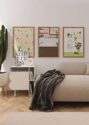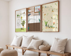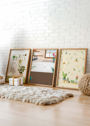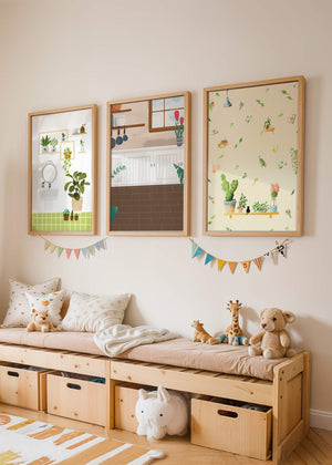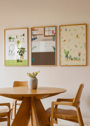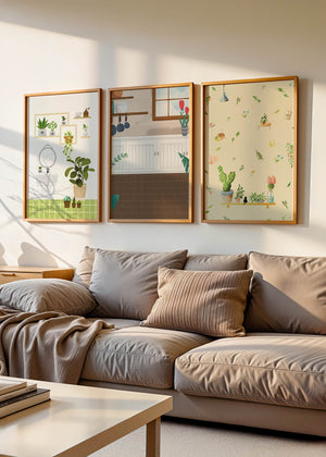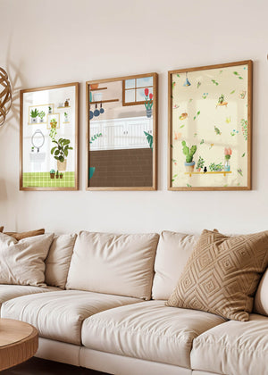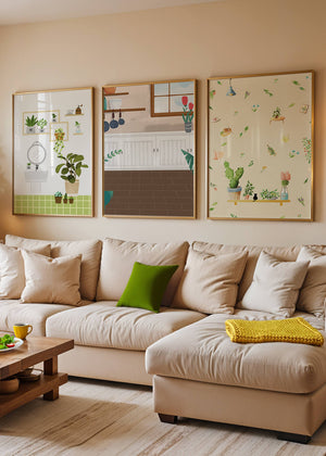 Cet ensemble d'art mural combine la fraîcheur des plantes avec des éléments du design intérieur moderne. La première toile, à gauche, montre une série de plantes disposées dans une salle de bain stylisée, apportant une sensation de fraîcheur et de vie naturelle. La deuxième toile présente une cuisine moderne, idéale pour inspirer chaleur et confort dans l'espace. La troisième toile inclut un design avec des motifs botaniques et des cactus, aidant à évoquer la simplicité et la beauté de la nature. Ces toiles décoratives sont idéales pour tout foyer souhaitant ajouter une esthétique verte et contemporaine à ses espaces. La haute qualité d'impression garantit que les détails et les couleurs de chaque design restent éclatants et durables. Parfaites pour être accrochées dans un salon, une cuisine| Taper |
