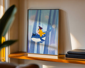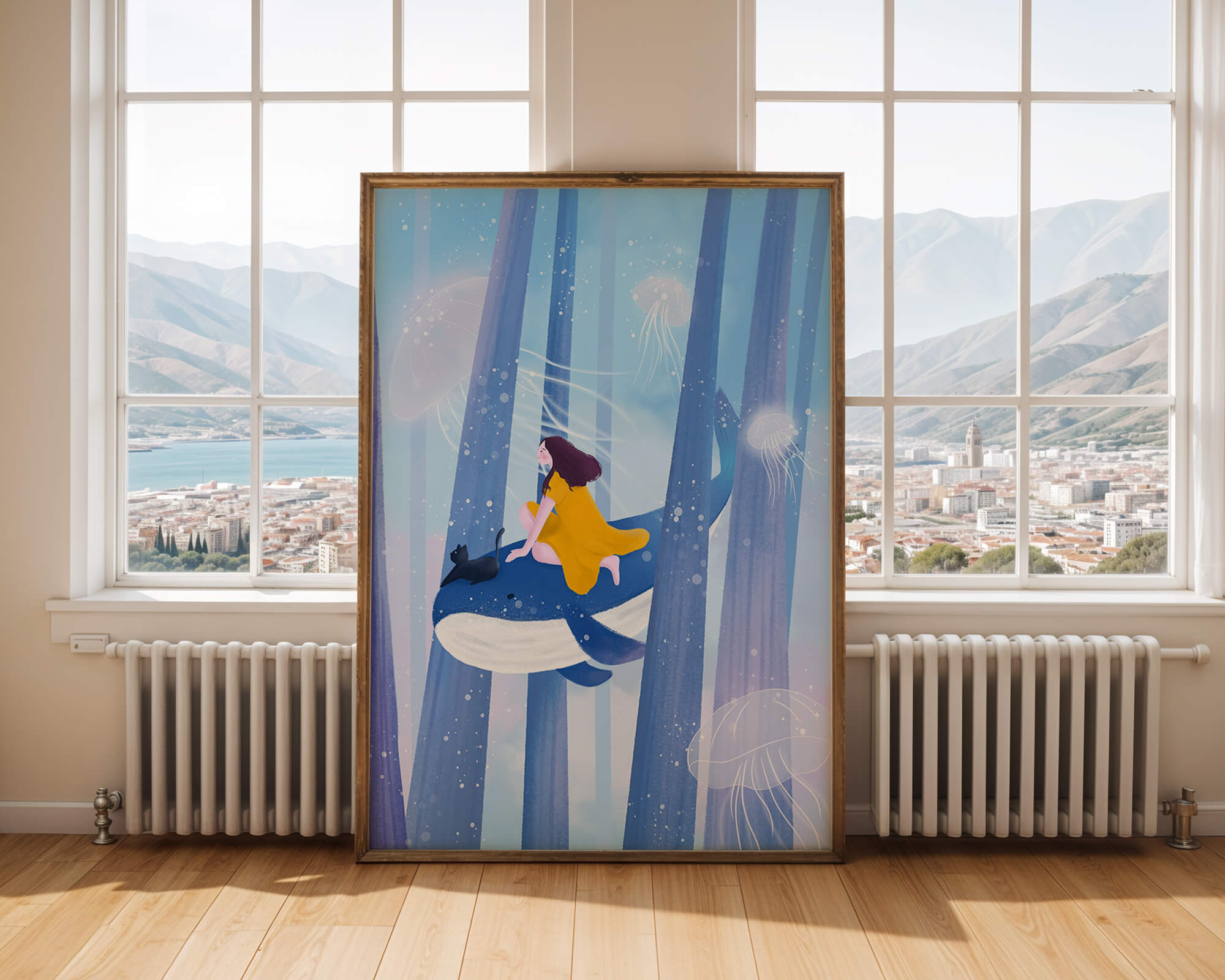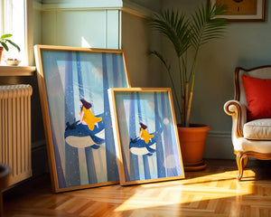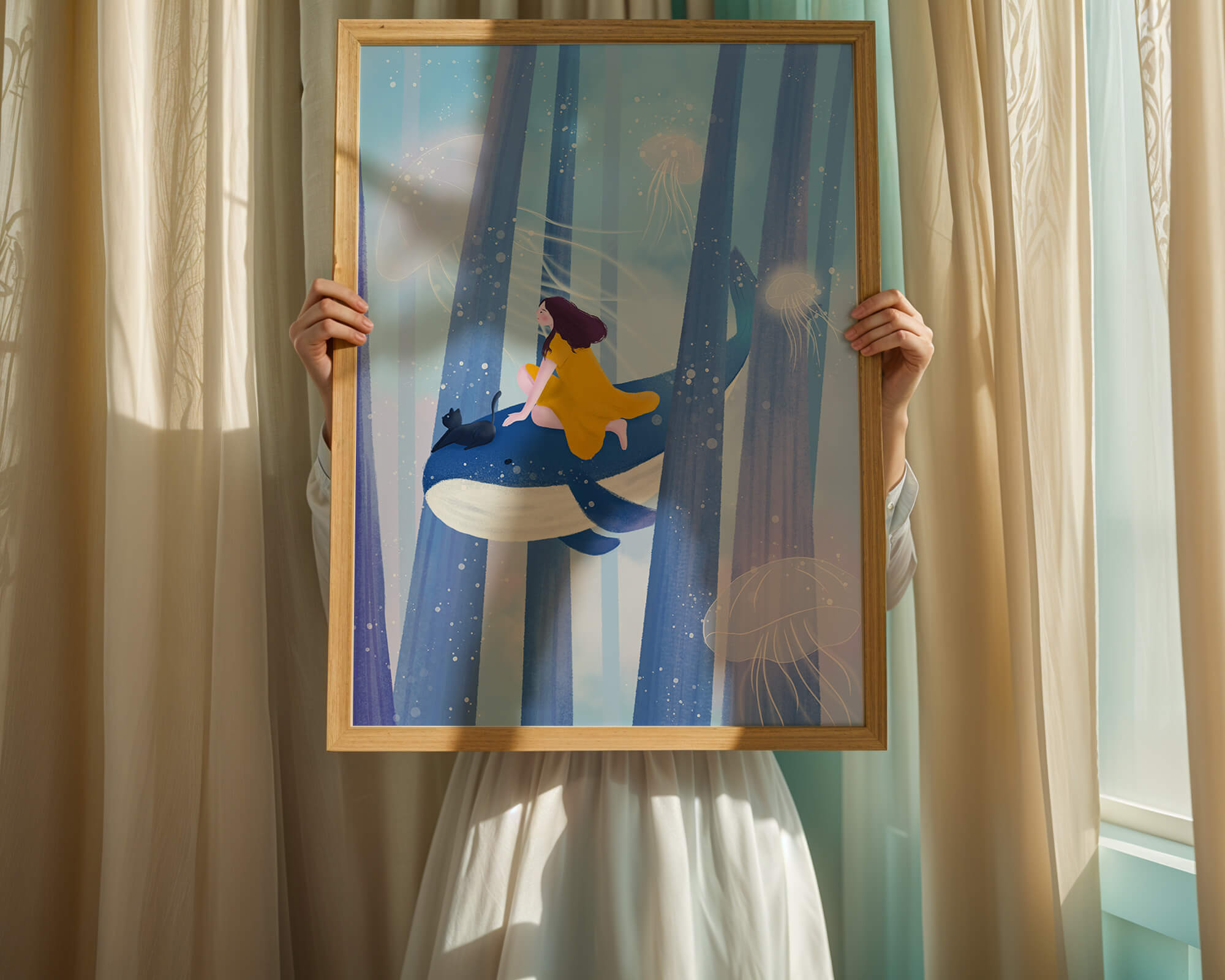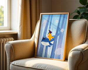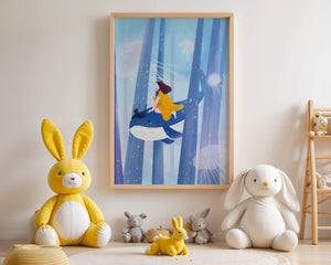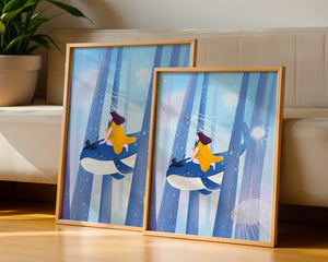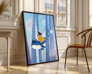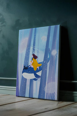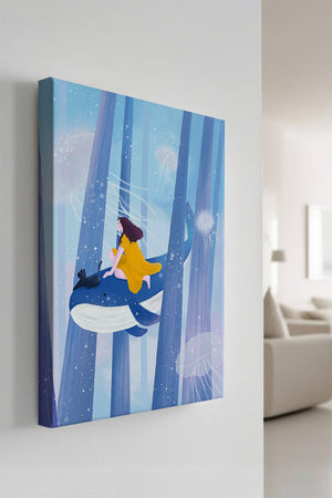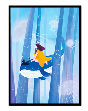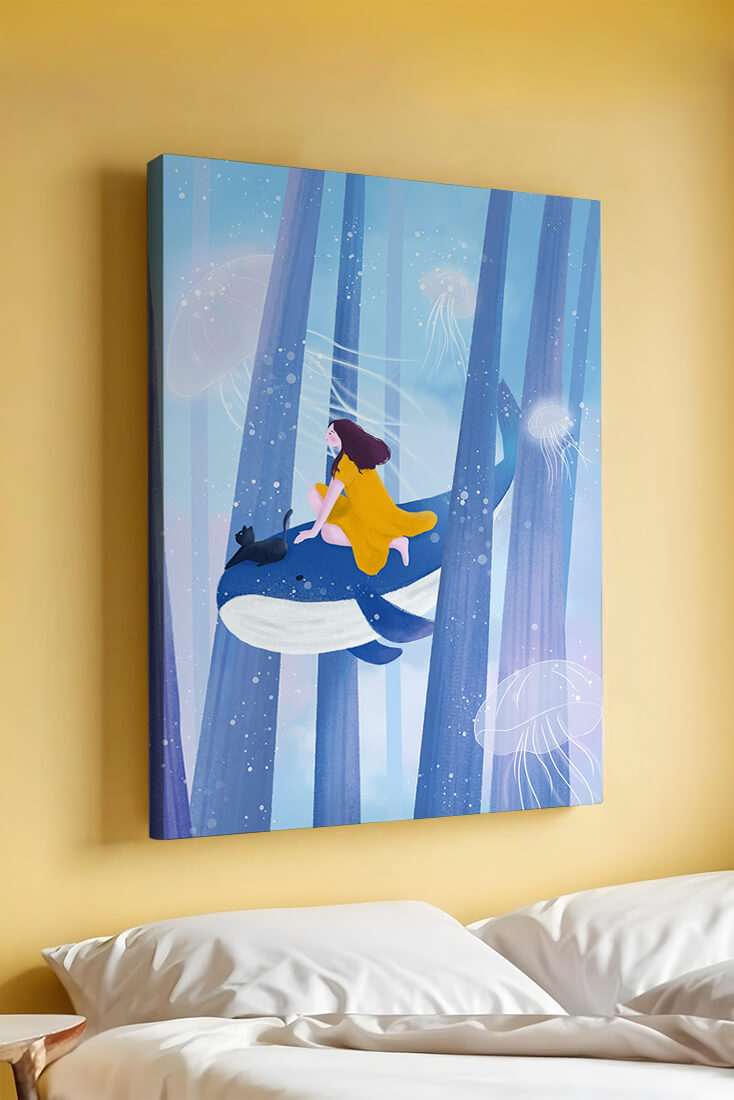 Dans cette scène sereine et onirique, une jeune fille vêtue d'une robe jaune vif et son fidèle chat noir se lancent dans une aventure magique. Assis sur une gracieuse baleine, ils flottent doucement dans un océan surréaliste orné d'imposantes structures arborescentes et de méduses luminescentes. La palette de bleus et de blancs doux crée une ambiance paisible, tandis que le subtil jeu de bulles et de lumière rehausse le côté éthéré de ce voyage fantastique. L'illustration capture un sentiment d'émerveillement et de fantaisie, invitant le spectateur à rêver et à explorer des mondes au-delà de la réalité. C'est une œuvre idéale pour stimuler l'imagination, idéale pour une chambre d'enfant ou tout espace en quête d'une touche de magie. Le mélange harmonieux d'éléments naturels et de fantaisie invite à la contemplation et à un sentiment d'évasion bienheureuse.| Taper |
