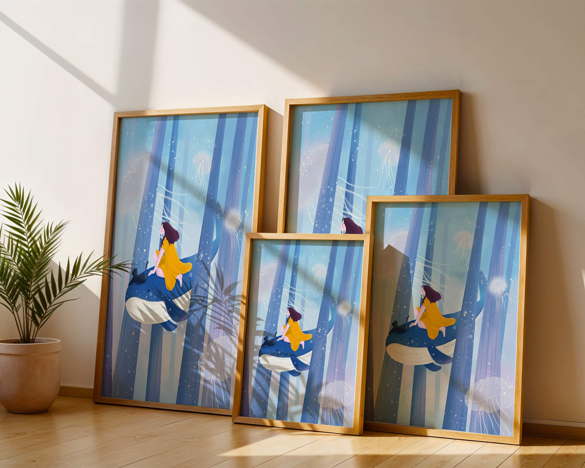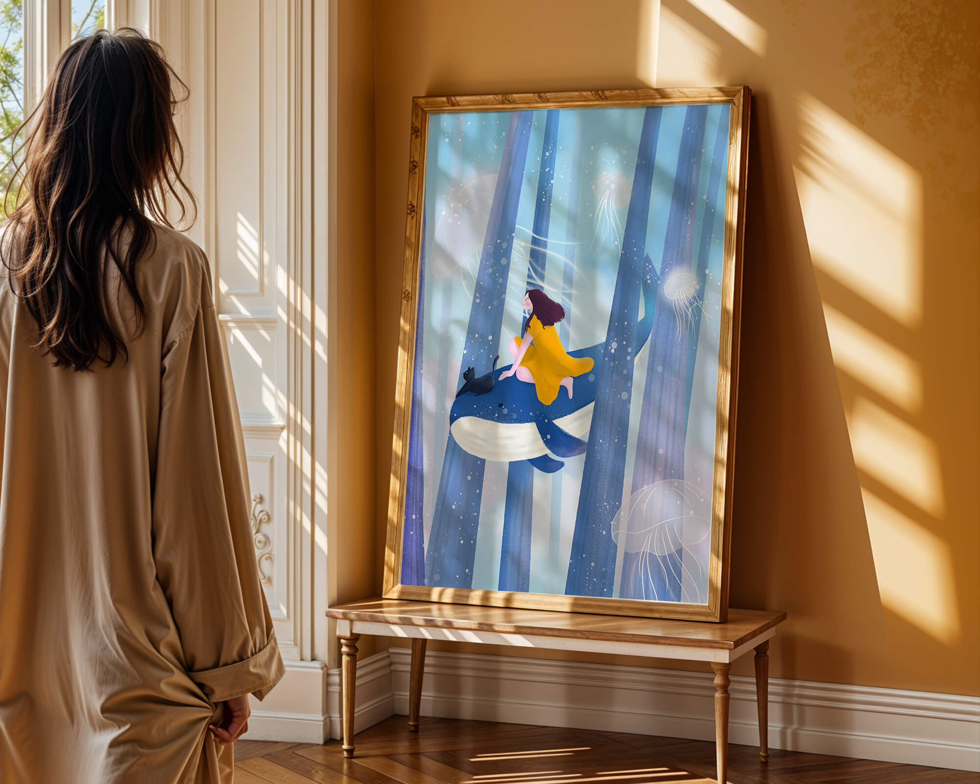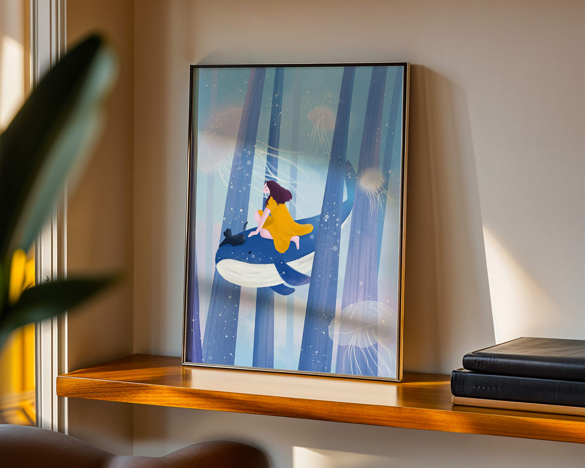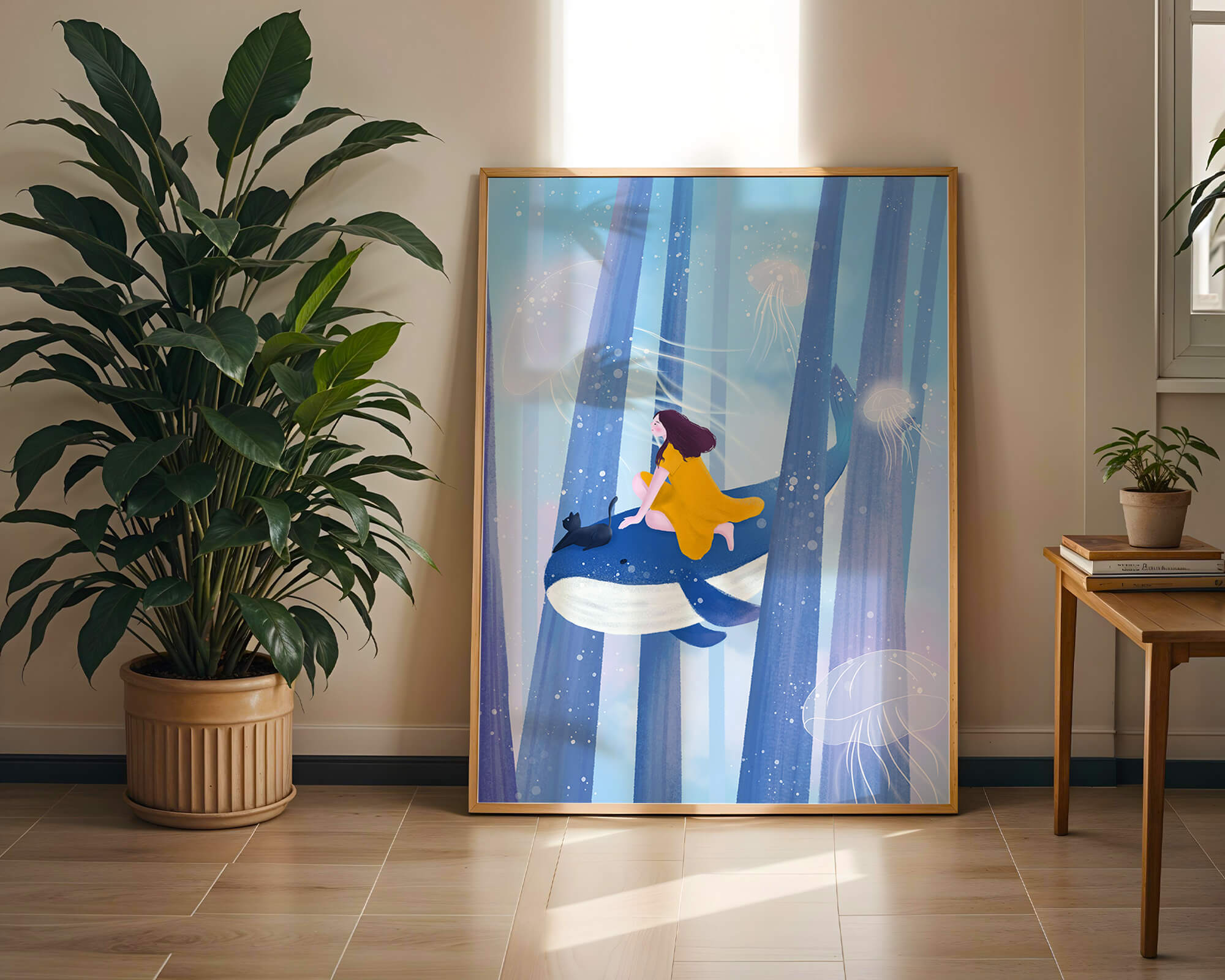 Dans cette scène sereine et onirique, une jeune fille vêtue d'une robe jaune vif et son fidèle chat noir se lancent dans une aventure magique. Assis sur une gracieuse baleine, ils flottent doucement dans un océan surréaliste orné d'imposantes structures arborescentes et de méduses luminescentes. La palette de bleus et de blancs doux crée une ambiance paisible, tandis que le subtil jeu de bulles et de lumière rehausse le côté éthéré de ce voyage fantastique. L'illustration capture un sentiment d'émerveillement et de fantaisie, invitant le spectateur à rêver et à explorer des mondes au-delà de la réalité. C'est une œuvre idéale pour stimuler l'imagination, idéale pour une chambre d'enfant ou tout espace en quête d'une touche de magie. Le mélange harmonieux d'éléments naturels et de fantaisie invite à la contemplation et à un sentiment d'évasion bienheureuse.| Taper |