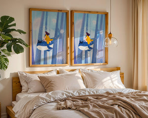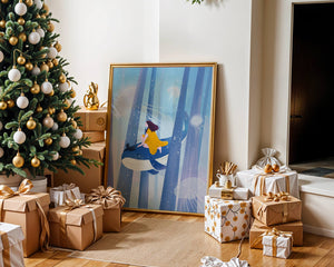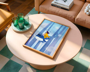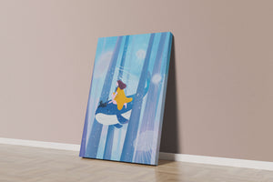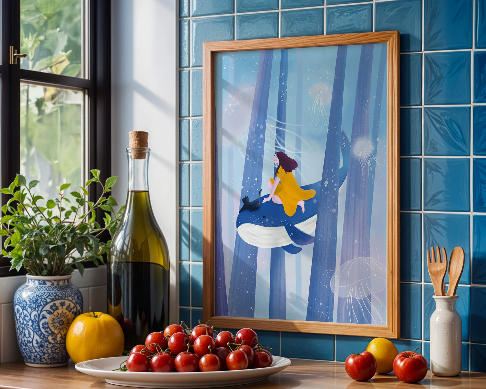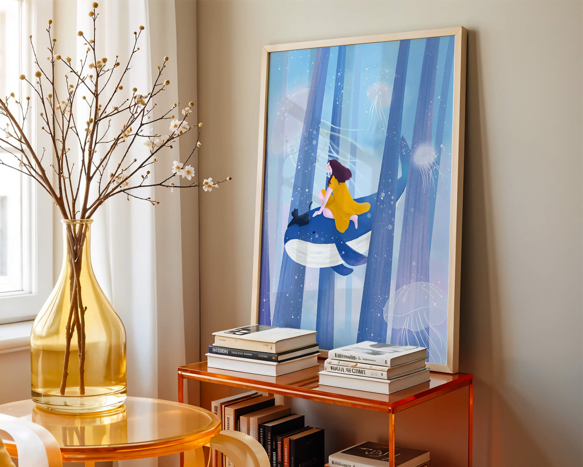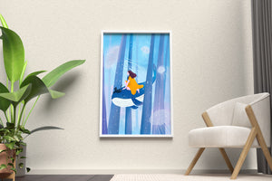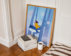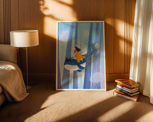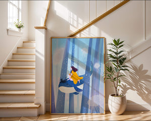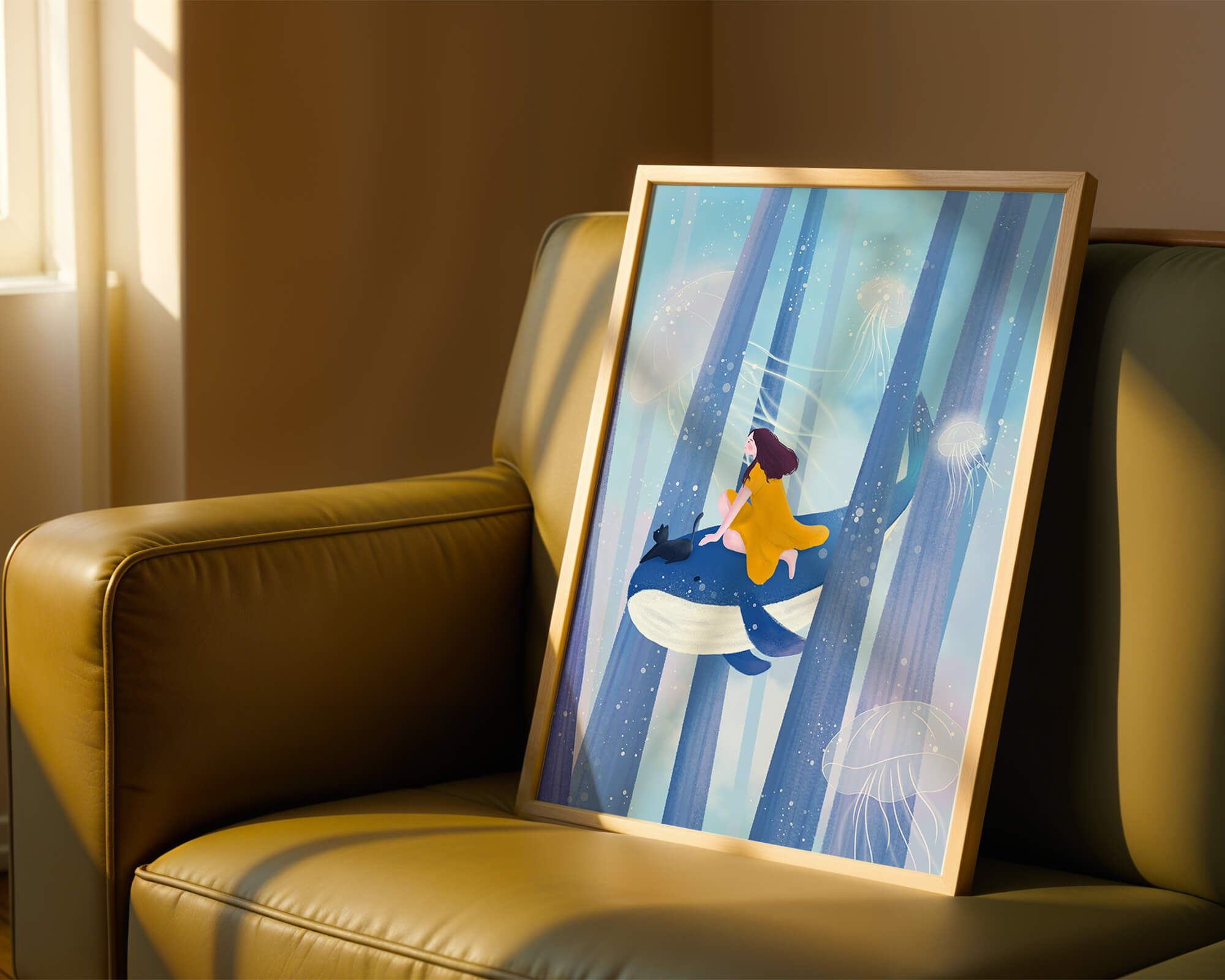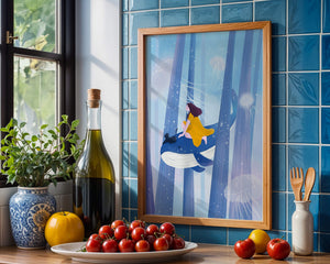 Dans cette scène sereine et onirique, une jeune fille vêtue d'une robe jaune vif et son fidèle chat noir se lancent dans une aventure magique. Assis sur une gracieuse baleine, ils flottent doucement dans un océan surréaliste orné d'imposantes structures arborescentes et de méduses luminescentes. La palette de bleus et de blancs doux crée une ambiance paisible, tandis que le subtil jeu de bulles et de lumière rehausse le côté éthéré de ce voyage fantastique. L'illustration capture un sentiment d'émerveillement et de fantaisie, invitant le spectateur à rêver et à explorer des mondes au-delà de la réalité. C'est une œuvre idéale pour stimuler l'imagination, idéale pour une chambre d'enfant ou tout espace en quête d'une touche de magie. Le mélange harmonieux d'éléments naturels et de fantaisie invite à la contemplation et à un sentiment d'évasion bienheureuse.| Taper |