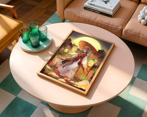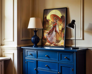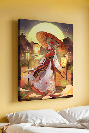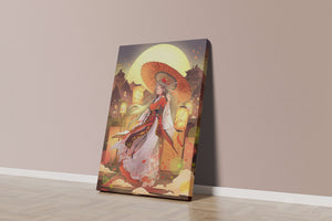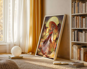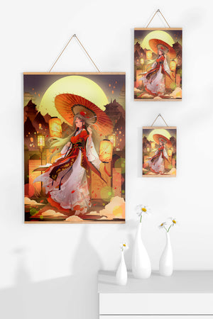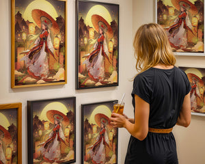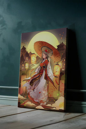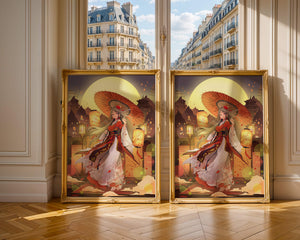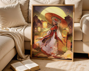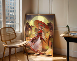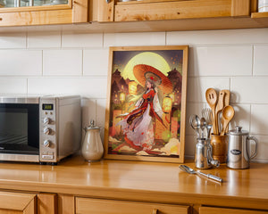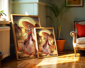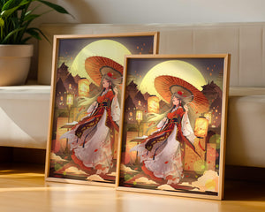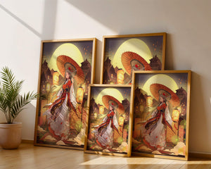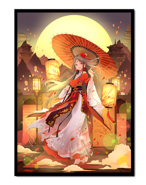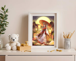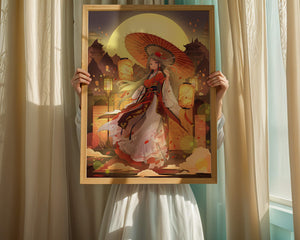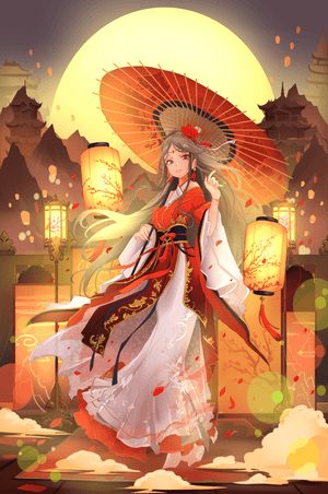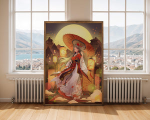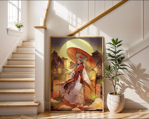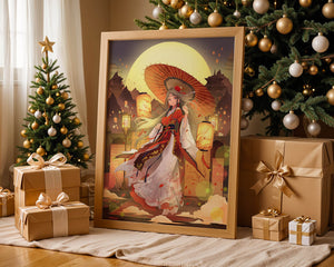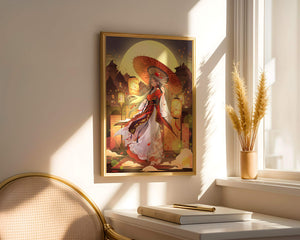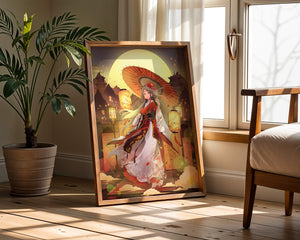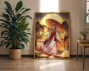 L'illustration capture magnifiquement l'essence de la culture japonaise, mettant en valeur les motifs complexes et les couleurs éclatantes de la tenue de la femme. Sa pose dégage confiance et grâce, soulignant les couches fluides de son kimono orné de motifs floraux et dorés. L'ombrelle qu'elle tient est tout aussi détaillée, projetant une ombre sereine sur son expression. L'arrière-plan met en valeur le personnage, avec une architecture japonaise traditionnelle sur fond de montagnes et d'un coucher de soleil lumineux. Des feuilles tombent doucement autour d'elle, ajoutant du mouvement et de la profondeur à l'image. Cette œuvre d'art n'est pas seulement un plaisir visuel mais aussi un hommage au patrimoine culturel, en faisant un ajout parfait à toute collection d'art ou décoration intérieure.| Taper |