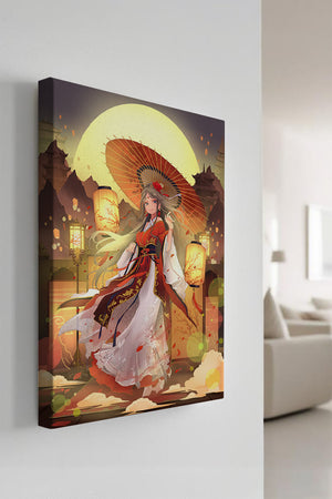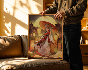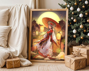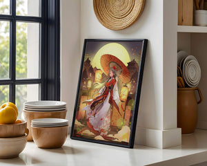 Cette image captivante dépeint une scène gracieuse avec une femme vêtue d'un kimono japonais traditionnel. Elle se tient élégamment sous une vibrante ombrelle, entourée de lanternes lumineuses et d'un paysage aux couleurs automnales.