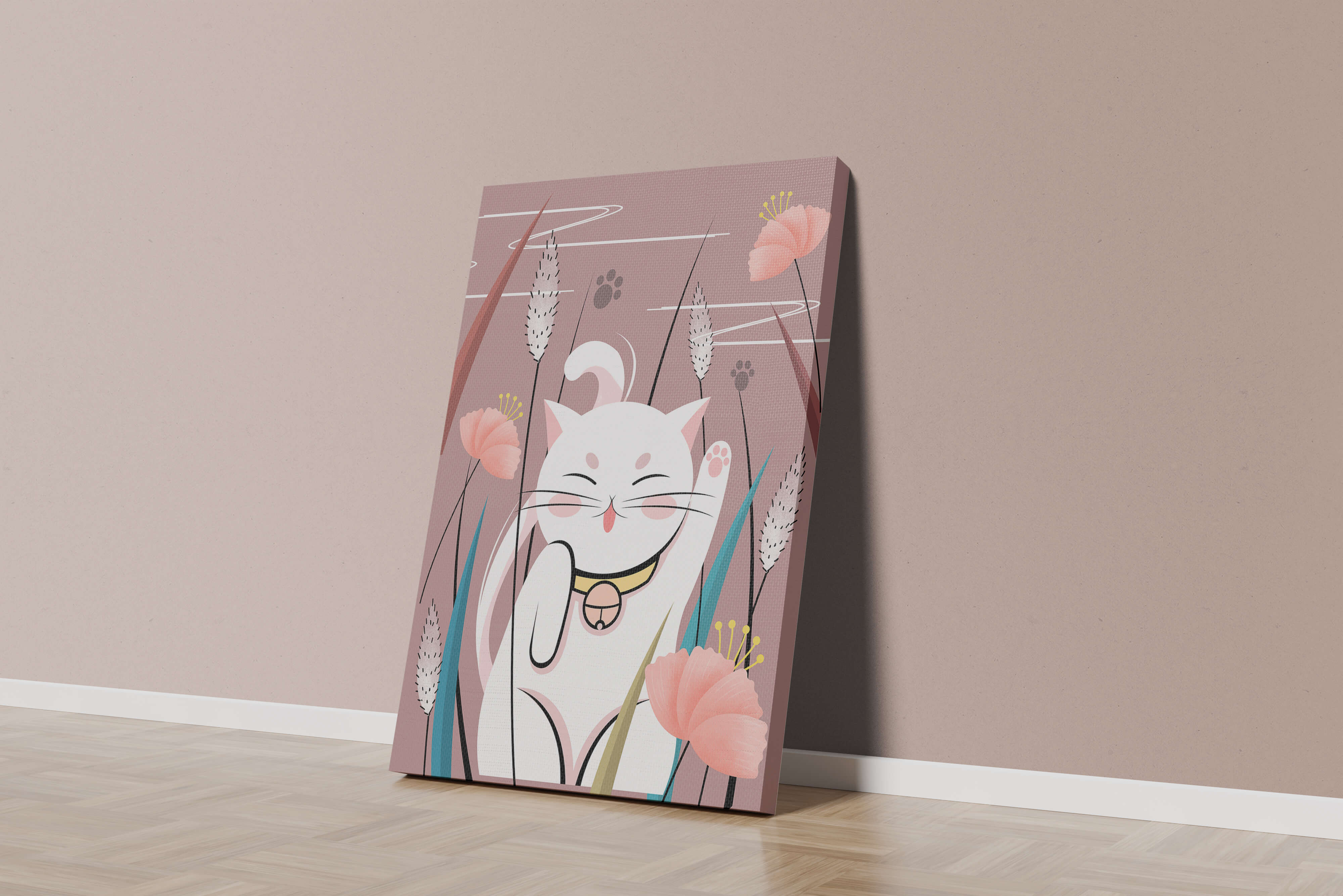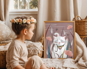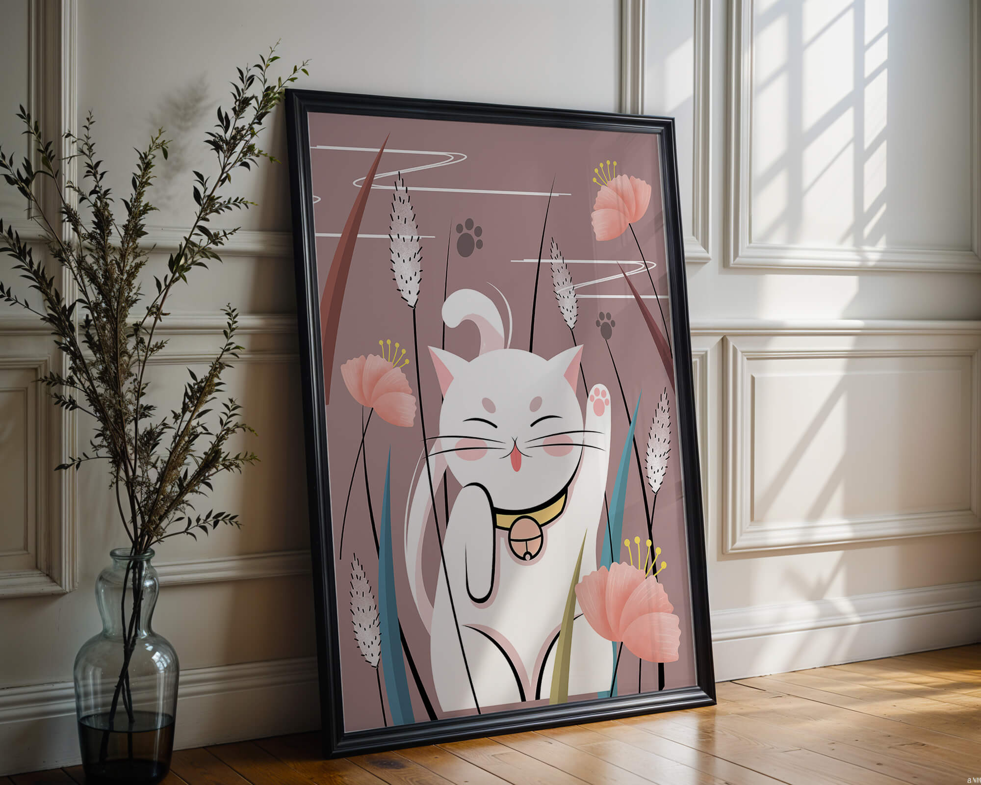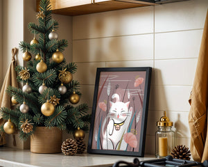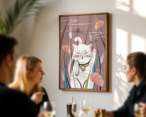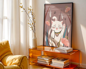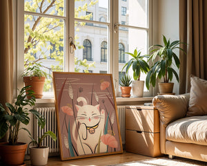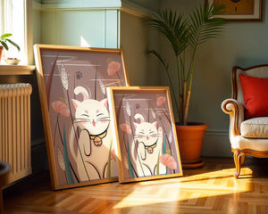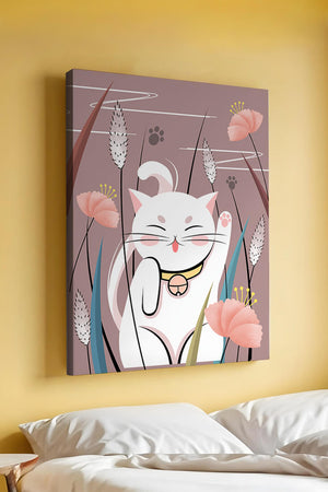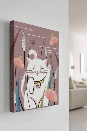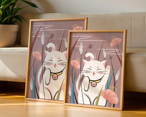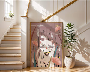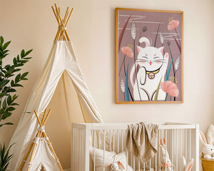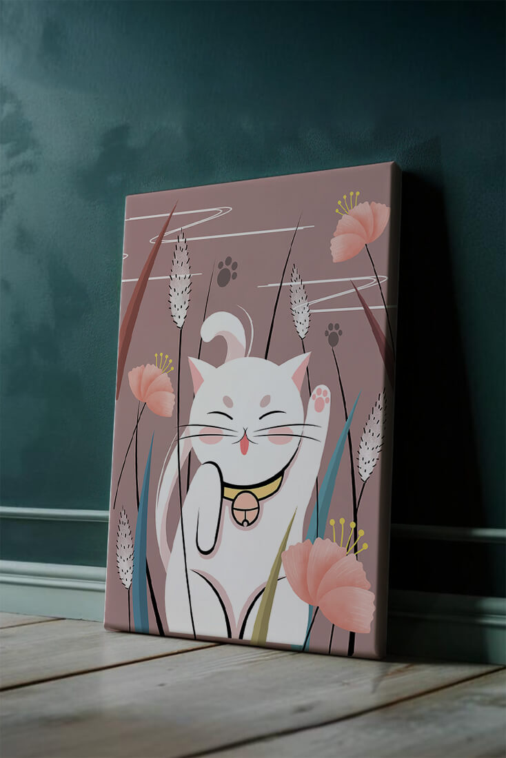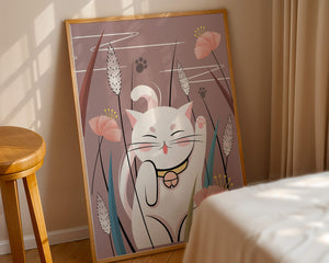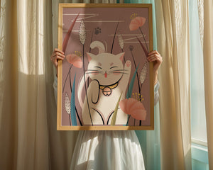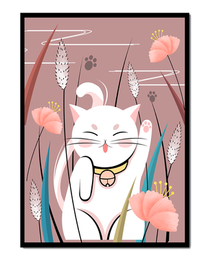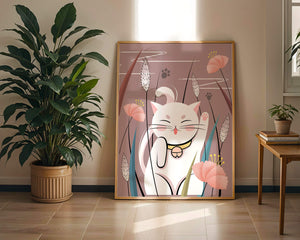 Cette illustration capture l'essence même de la chance et de la fortune avec un chat maneki-neko traditionnel, connu pour porter bonheur à son propriétaire. Le chat est paisiblement entouré de fleurs aux couleurs pastel et de feuilles délicates, créant une ambiance harmonieuse. L'utilisation de nuances de rose et de blanc renforce l'effet apaisant, ce qui rend cette image idéale pour diverses pièces, comme une chambre d'enfant ou un salon. La pose enjouée du chat, associée à son expression charmante, ajoute une touche de fantaisie et de joie à cette œuvre. C'est un choix idéal pour ceux qui apprécient les symboles culturels et souhaitent apporter une touche de légèreté et de sens à leur décoration intérieure. Qu'elle soit exposée dans un espace personnel ou offerte en cadeau, cette œuvre incarne le bonheur et la positivité.| Taper |