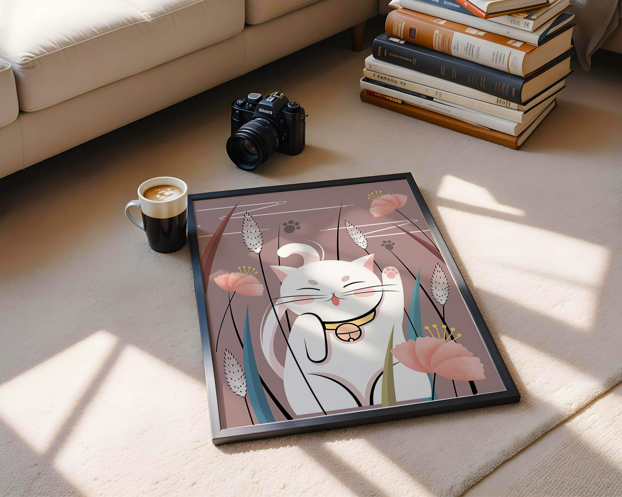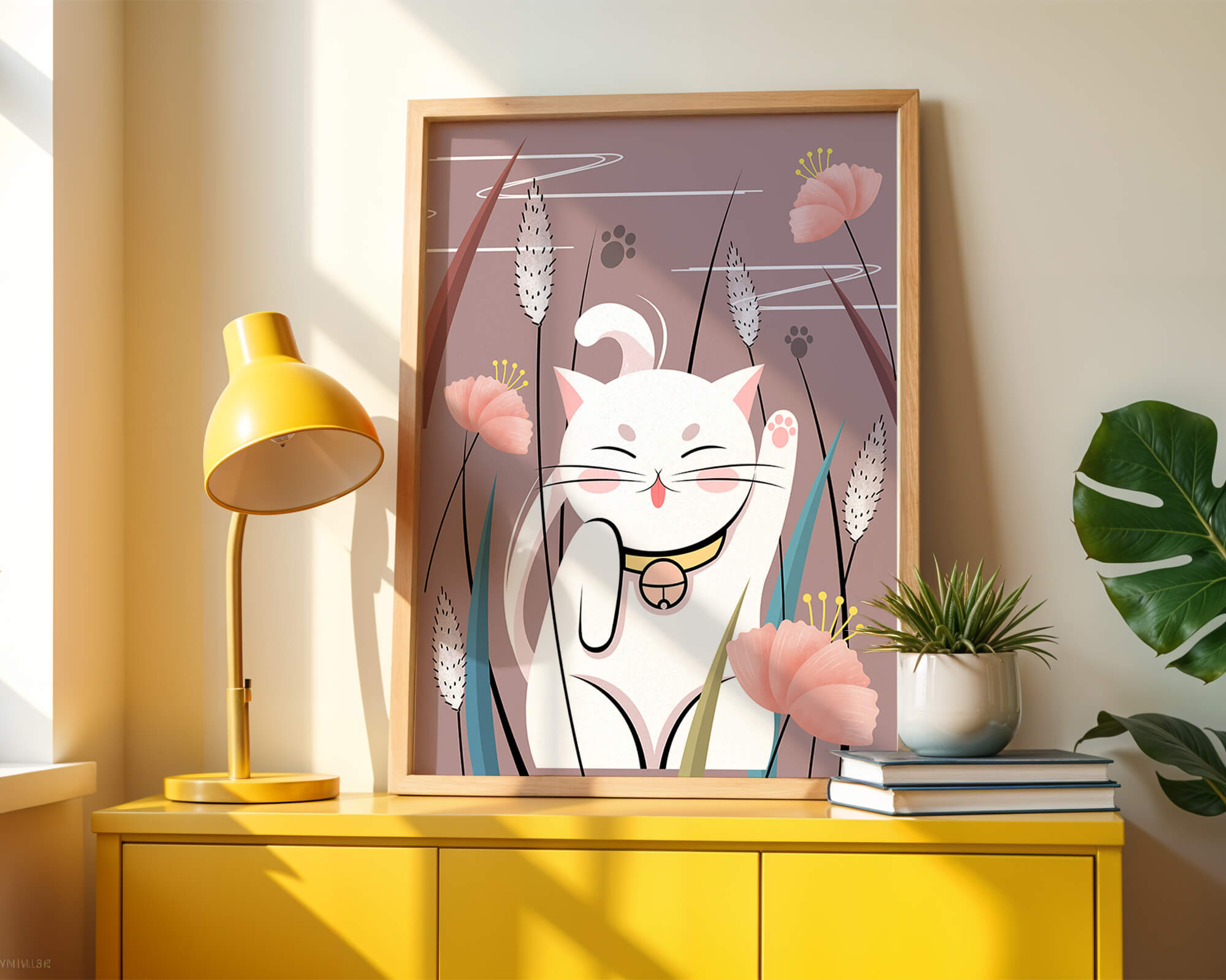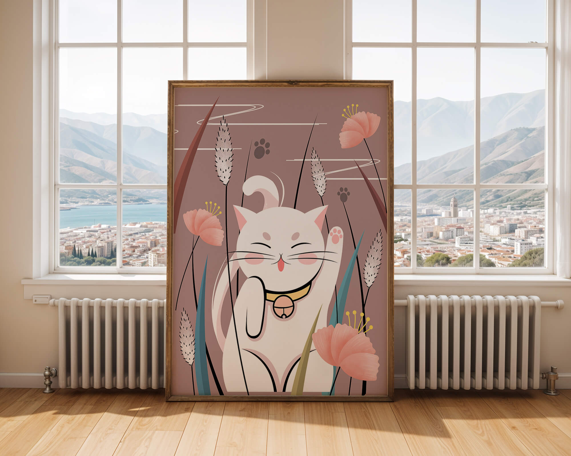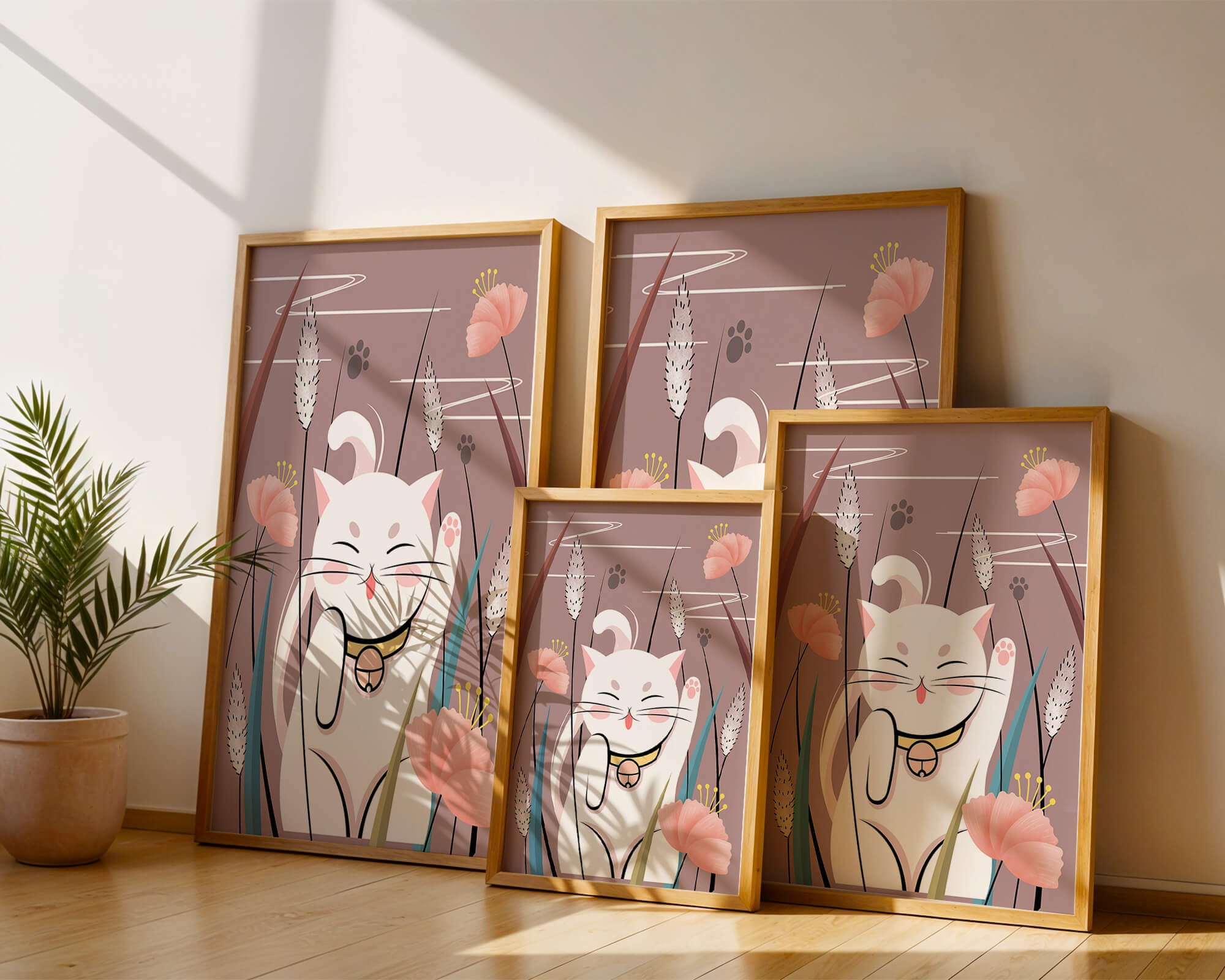 Cette illustration capture l'essence même de la chance et de la fortune avec un chat maneki-neko traditionnel, connu pour porter bonheur à son propriétaire. Le chat est paisiblement entouré de fleurs aux couleurs pastel et de feuilles délicates, créant une ambiance harmonieuse. L'utilisation de nuances de rose et de blanc renforce l'effet apaisant, ce qui rend cette image idéale pour diverses pièces, comme une chambre d'enfant ou un salon. La pose enjouée du chat, associée à son expression charmante, ajoute une touche de fantaisie et de joie à cette œuvre. C'est un choix idéal pour ceux qui apprécient les symboles culturels et souhaitent apporter une touche de légèreté et de sens à leur décoration intérieure. Qu'elle soit exposée dans un espace personnel ou offerte en cadeau, cette œuvre incarne le bonheur et la positivité.| Taper |