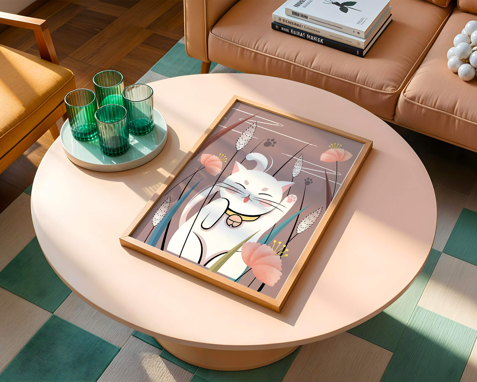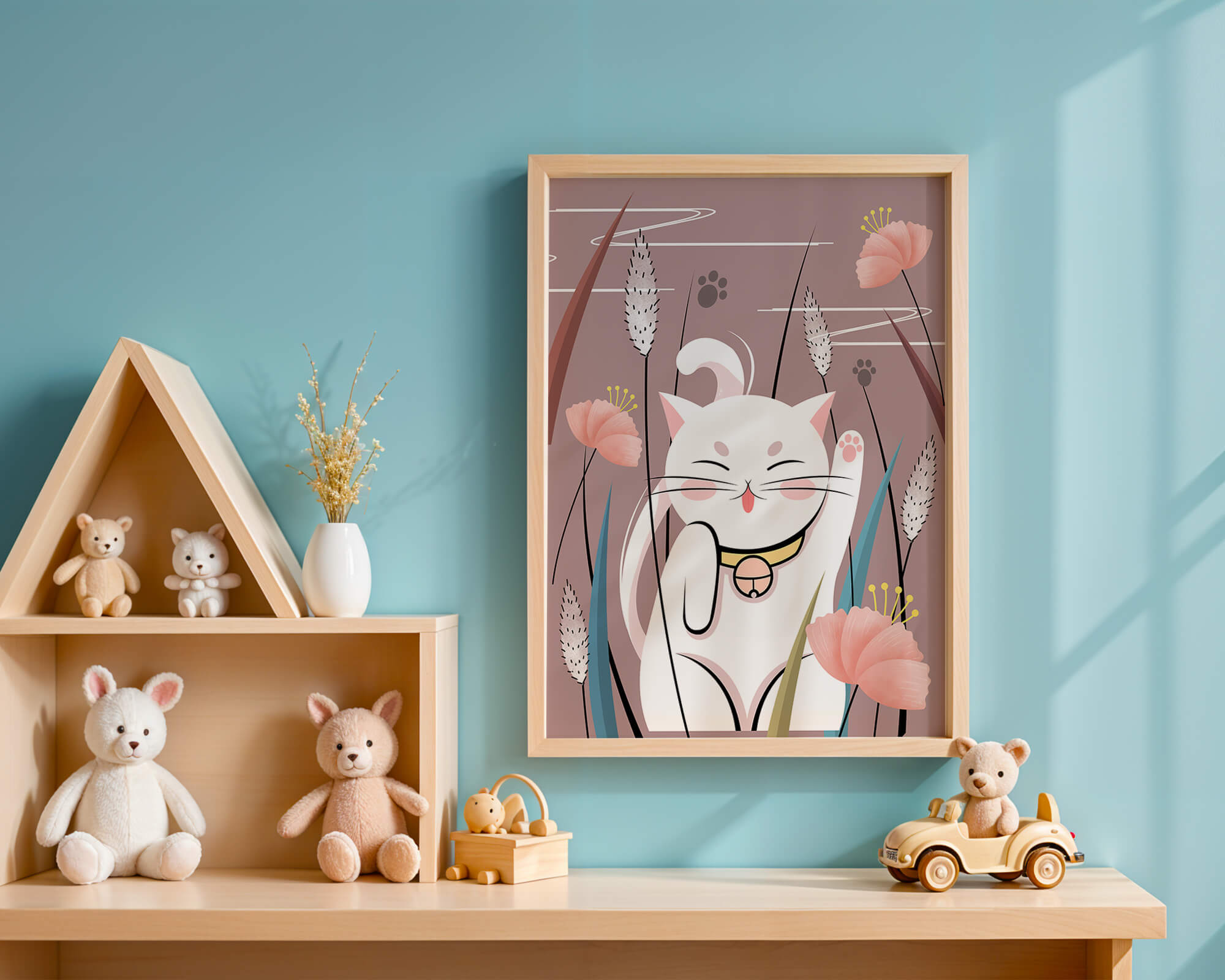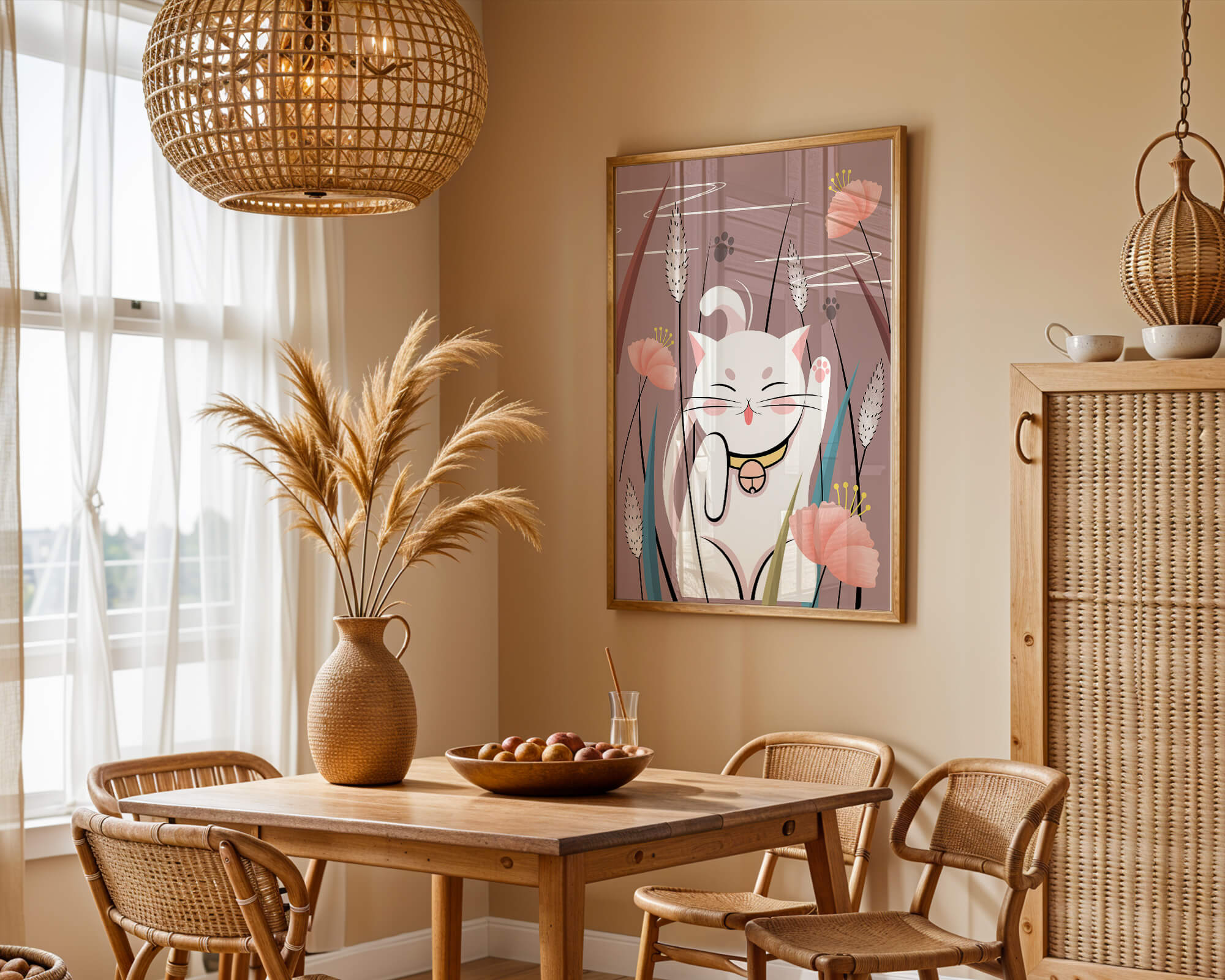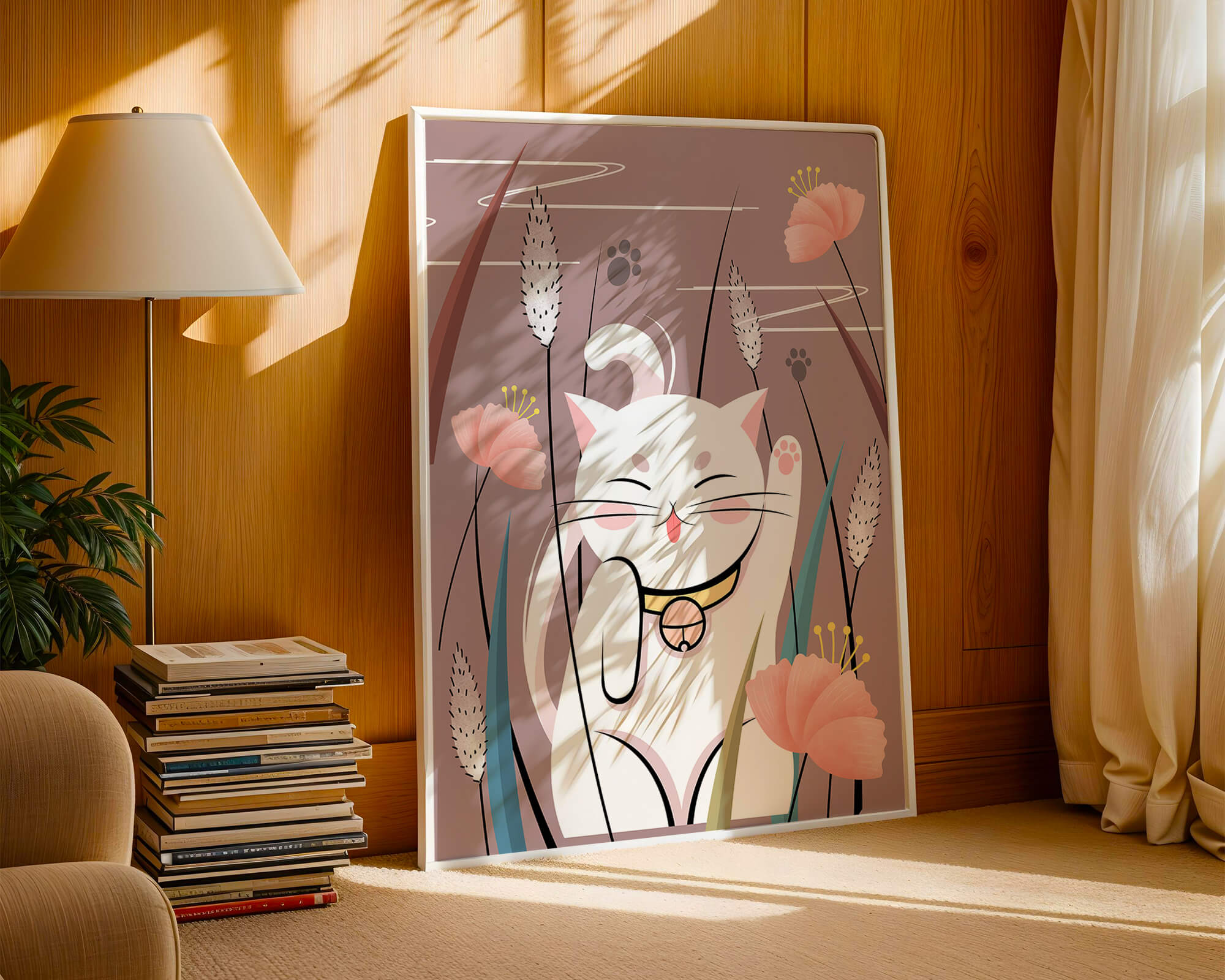 Cette illustration capture l'essence même de la chance et de la fortune avec un chat maneki-neko traditionnel, connu pour porter bonheur à son propriétaire. Le chat est paisiblement entouré de fleurs aux couleurs pastel et de feuilles délicates, créant une ambiance harmonieuse. L'utilisation de nuances de rose et de blanc renforce l'effet apaisant, ce qui rend cette image idéale pour diverses pièces, comme une chambre d'enfant ou un salon. La pose enjouée du chat, associée à son expression charmante, ajoute une touche de fantaisie et de joie à cette œuvre. C'est un choix idéal pour ceux qui apprécient les symboles culturels et souhaitent apporter une touche de légèreté et de sens à leur décoration intérieure. Qu'elle soit exposée dans un espace personnel ou offerte en cadeau, cette œuvre incarne le bonheur et la positivité.| Taper |