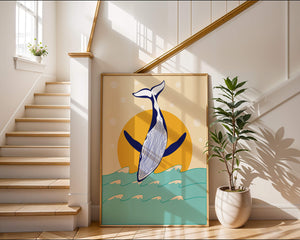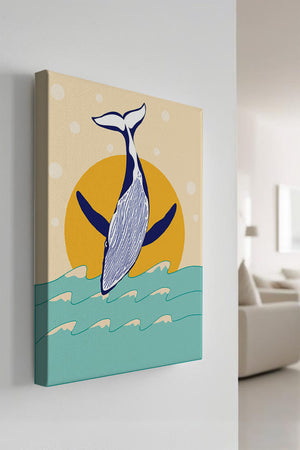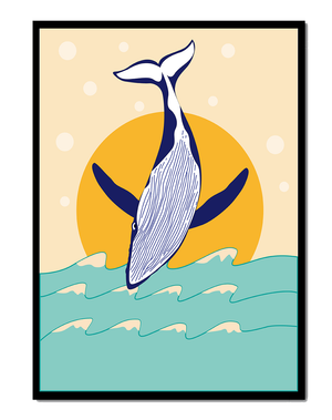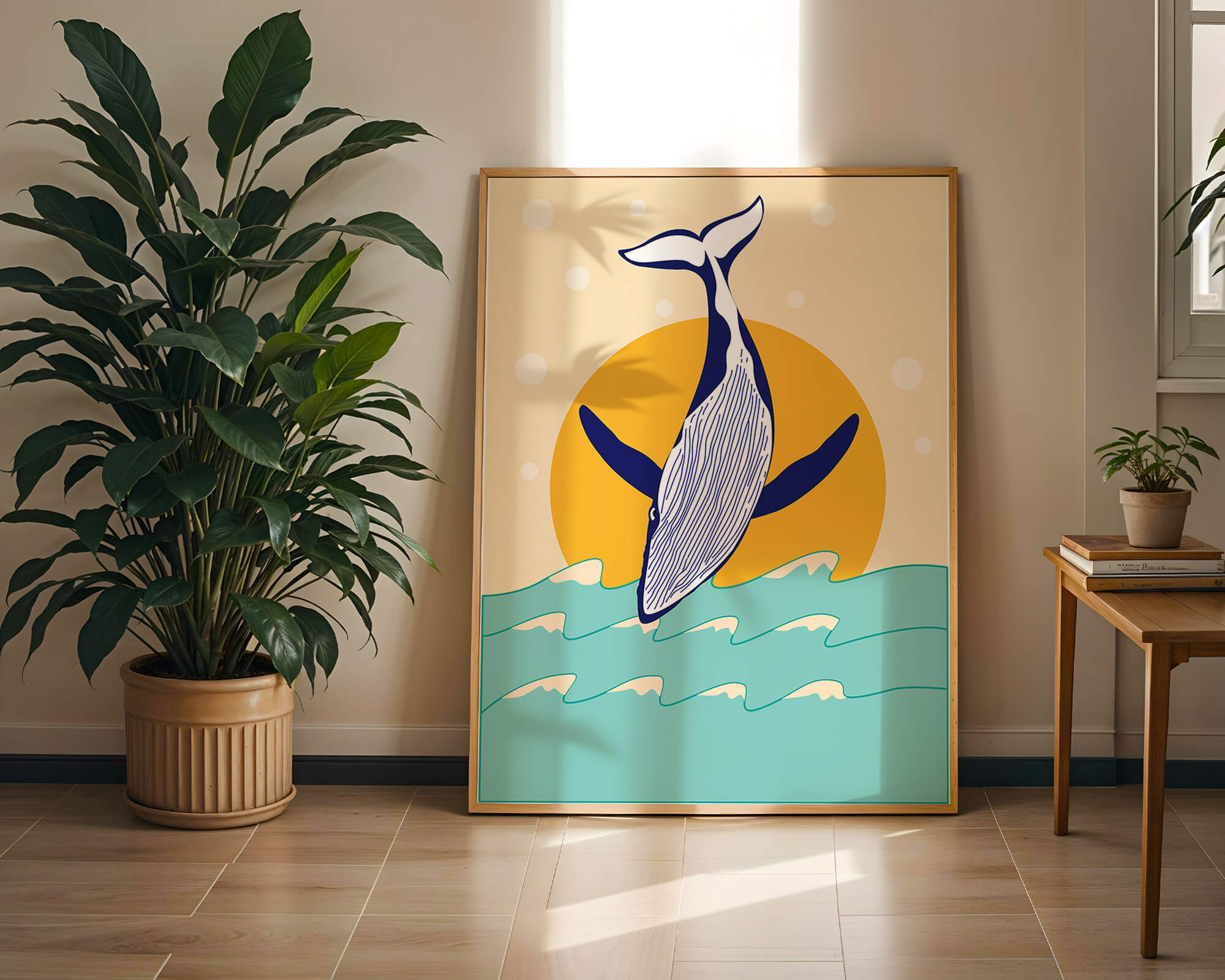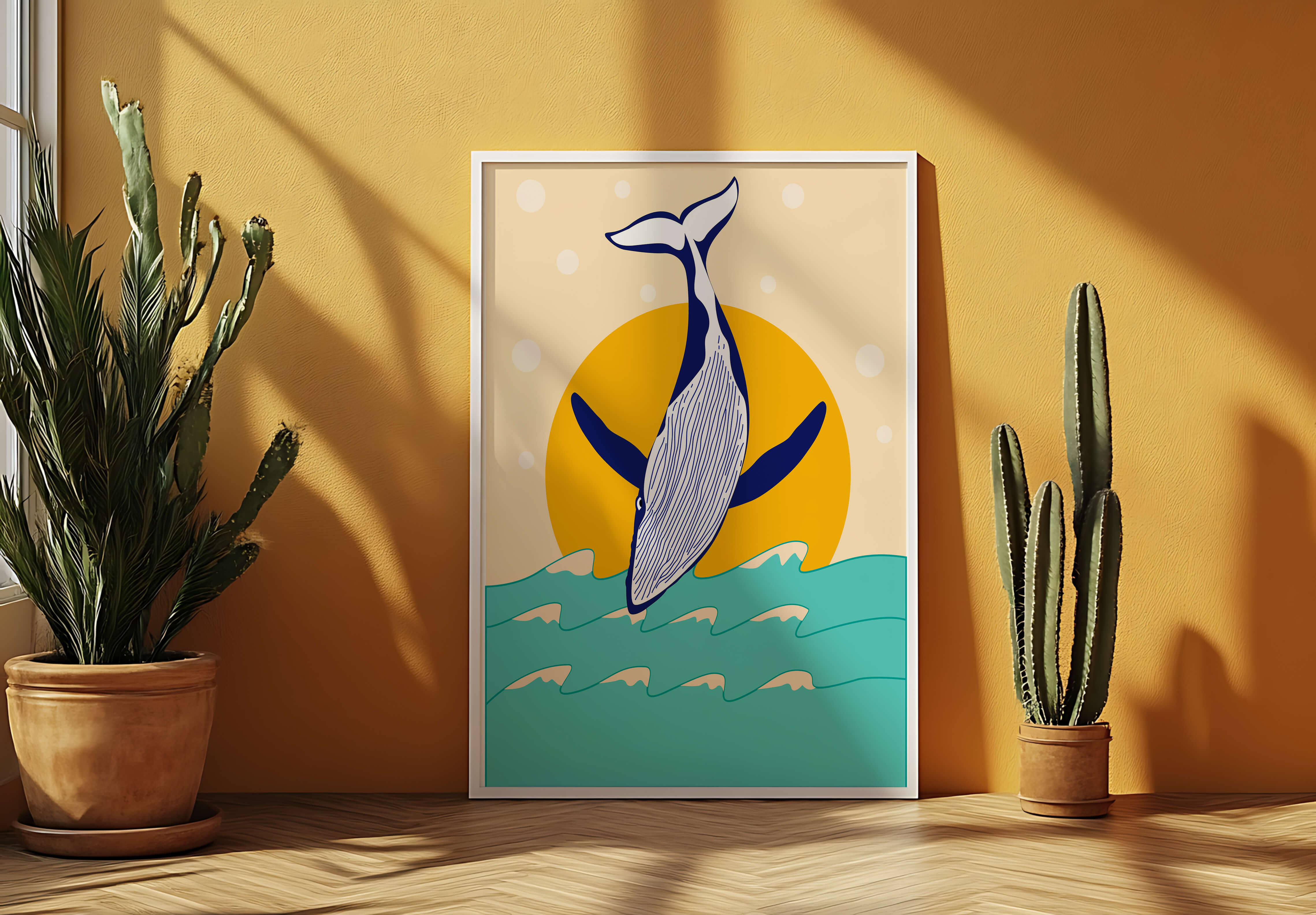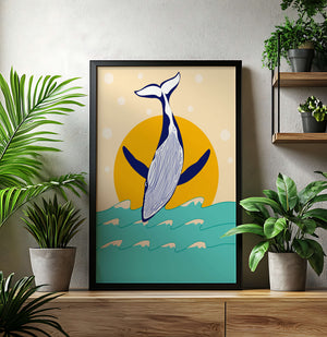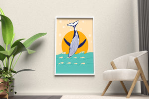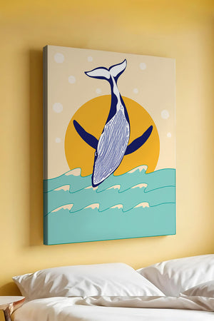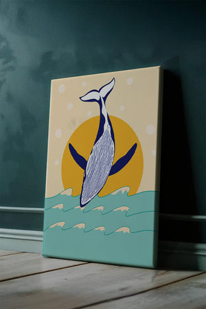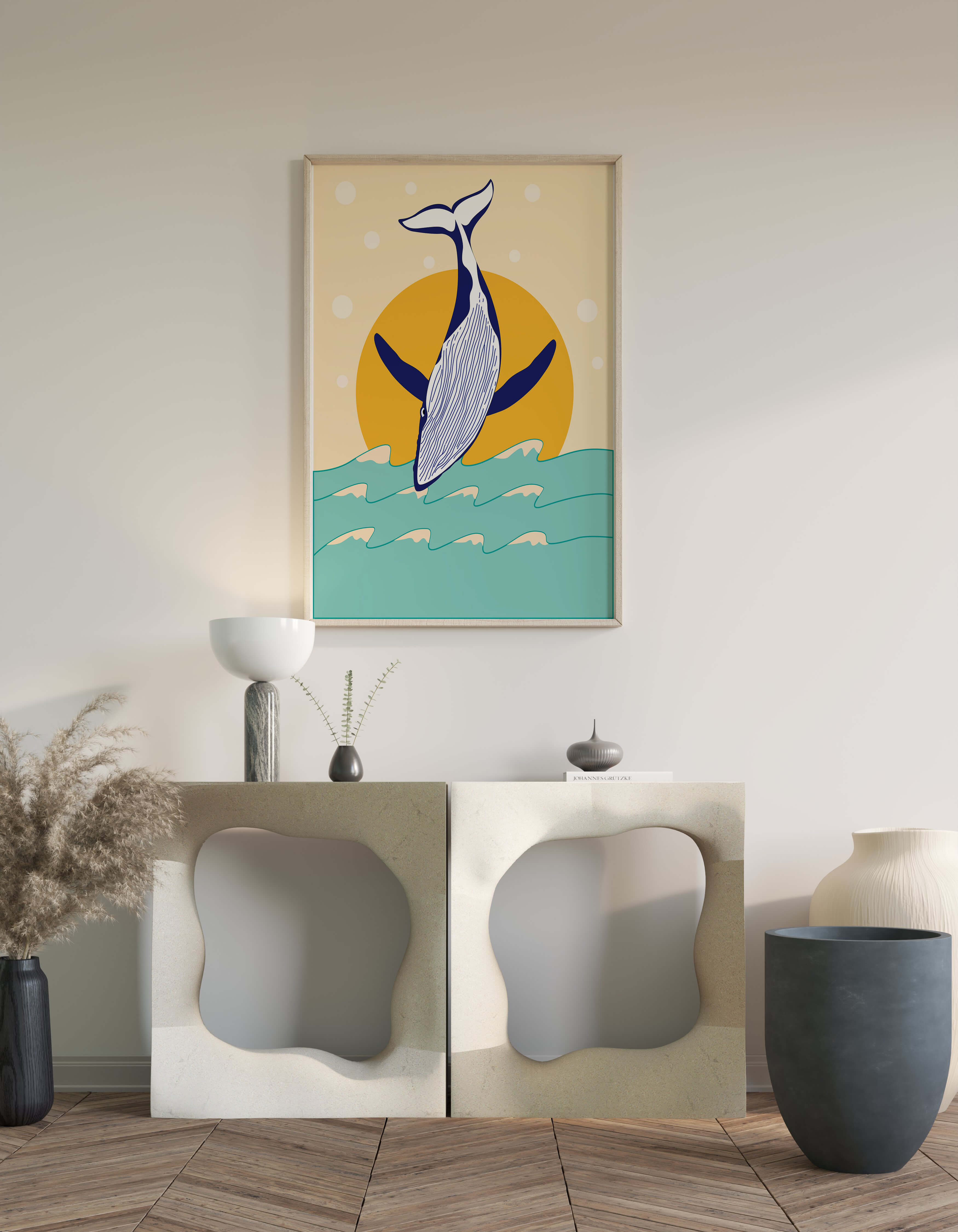 Cette œuvre d'art dynamique capture une illustration saisissante d'une baleine bondissant au-dessus des vagues de l'océan, sur fond de soleil vibrant. Les couleurs audacieuses et les formes simplifiées créent un sentiment de mouvement et de joie, faisant de cette pièce un élément captivant pour n'importe quelle pièce.