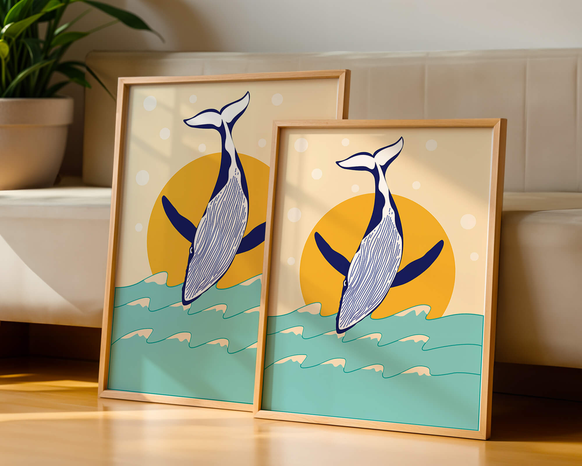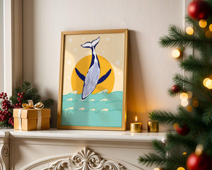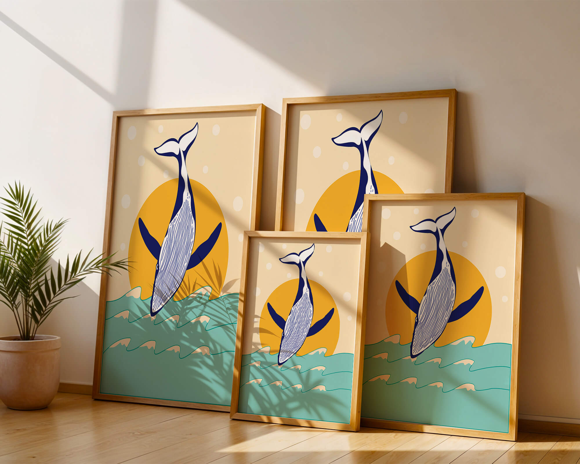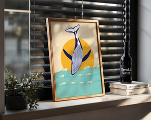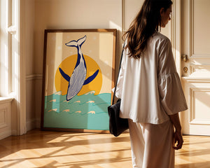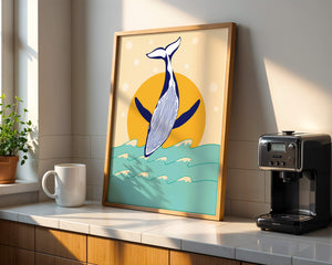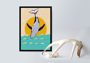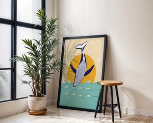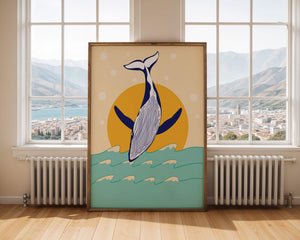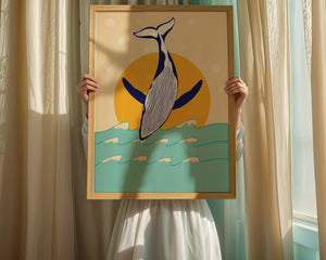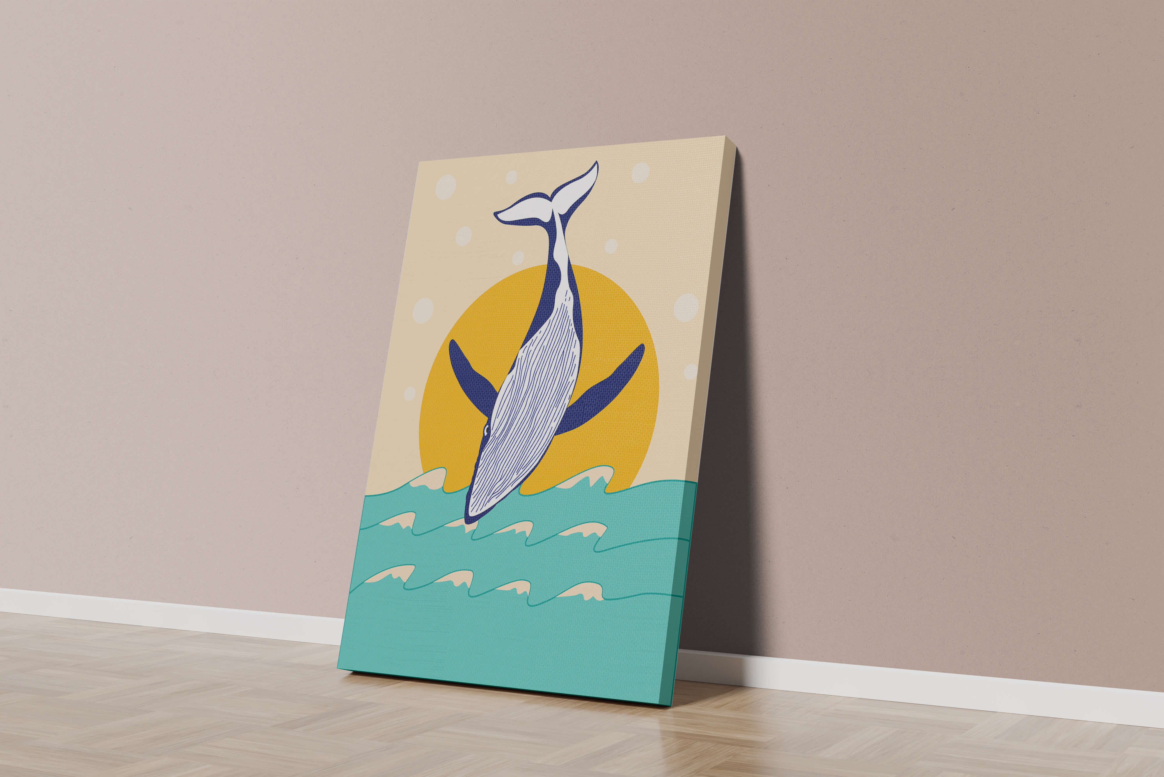 Cette œuvre d'art dynamique capture une illustration saisissante d'une baleine bondissant au-dessus des vagues de l'océan, sur fond de soleil vibrant. Les couleurs audacieuses et les formes simplifiées créent un sentiment de mouvement et de joie, faisant de cette pièce un élément captivant pour n'importe quelle pièce.