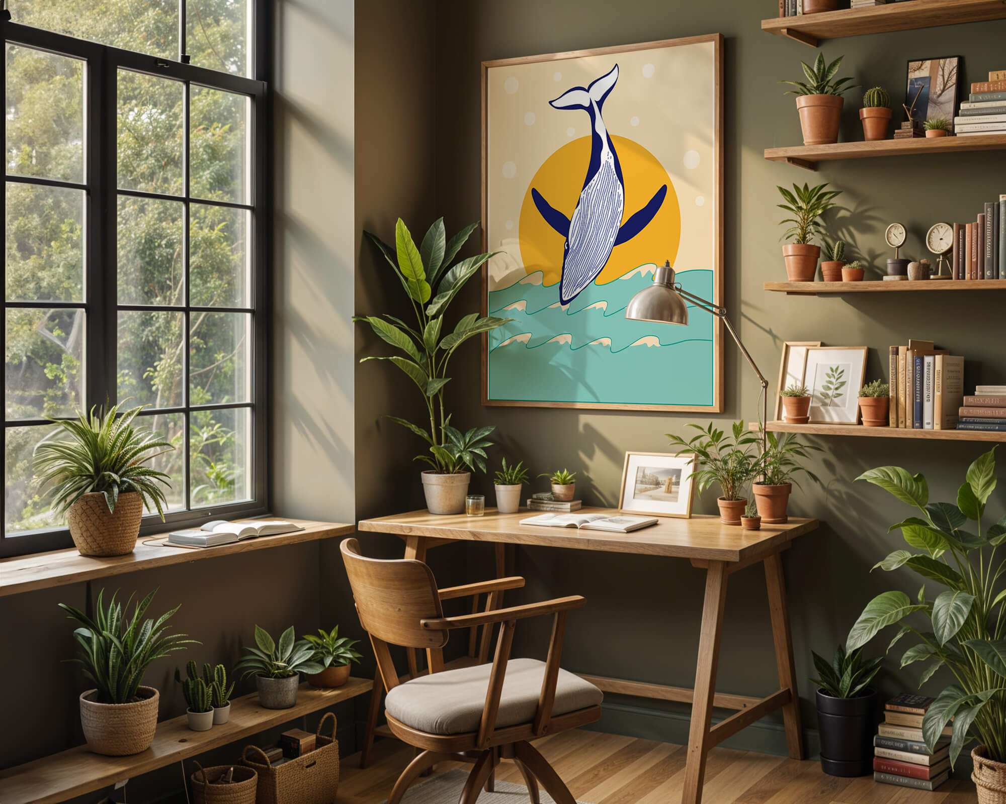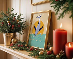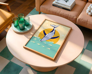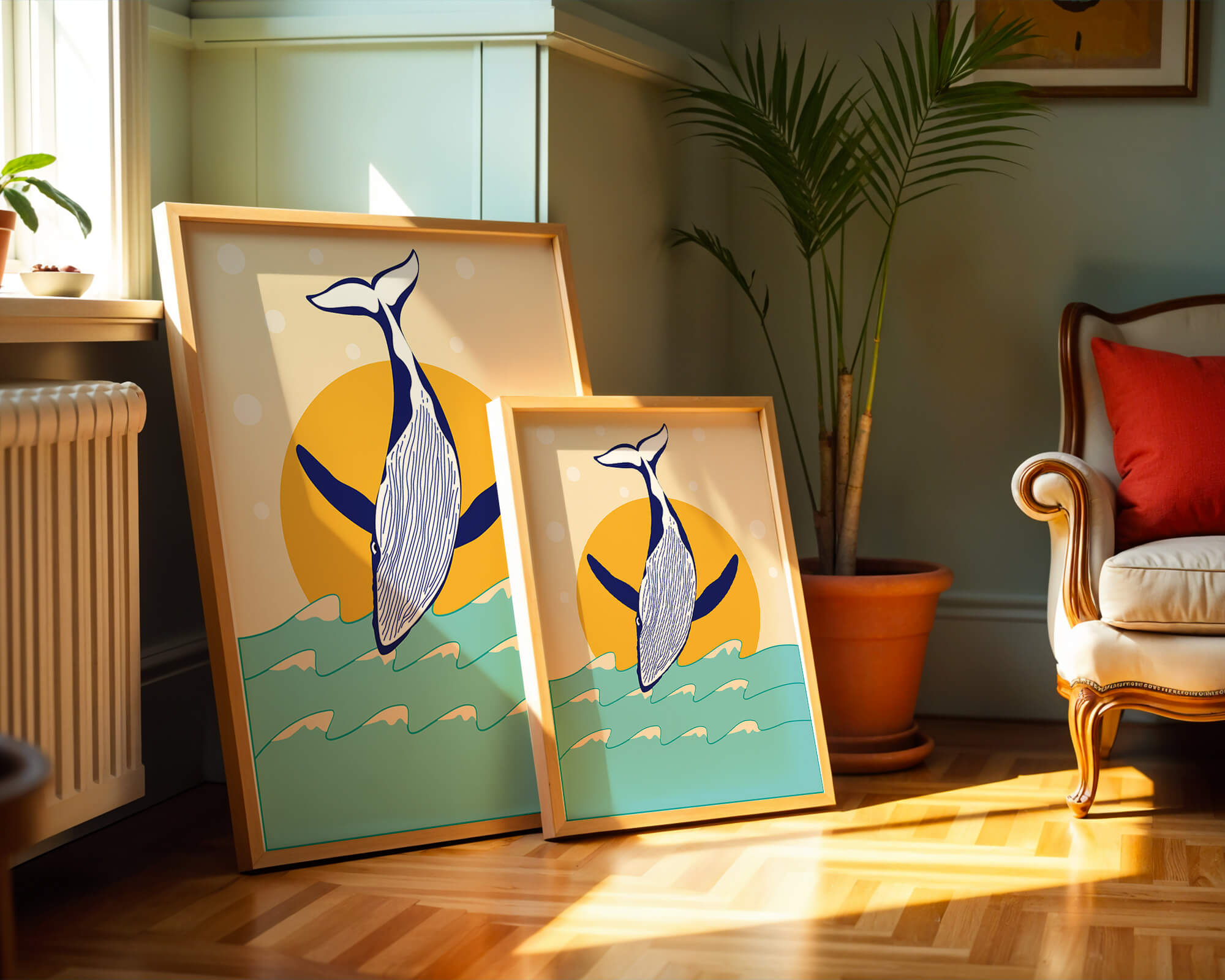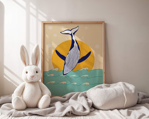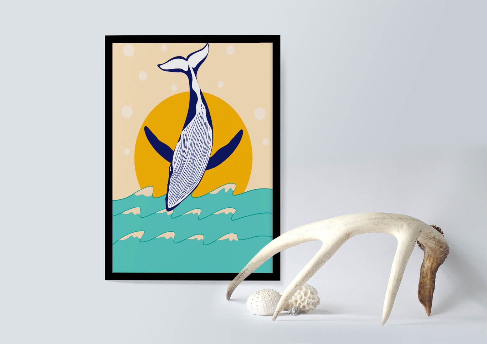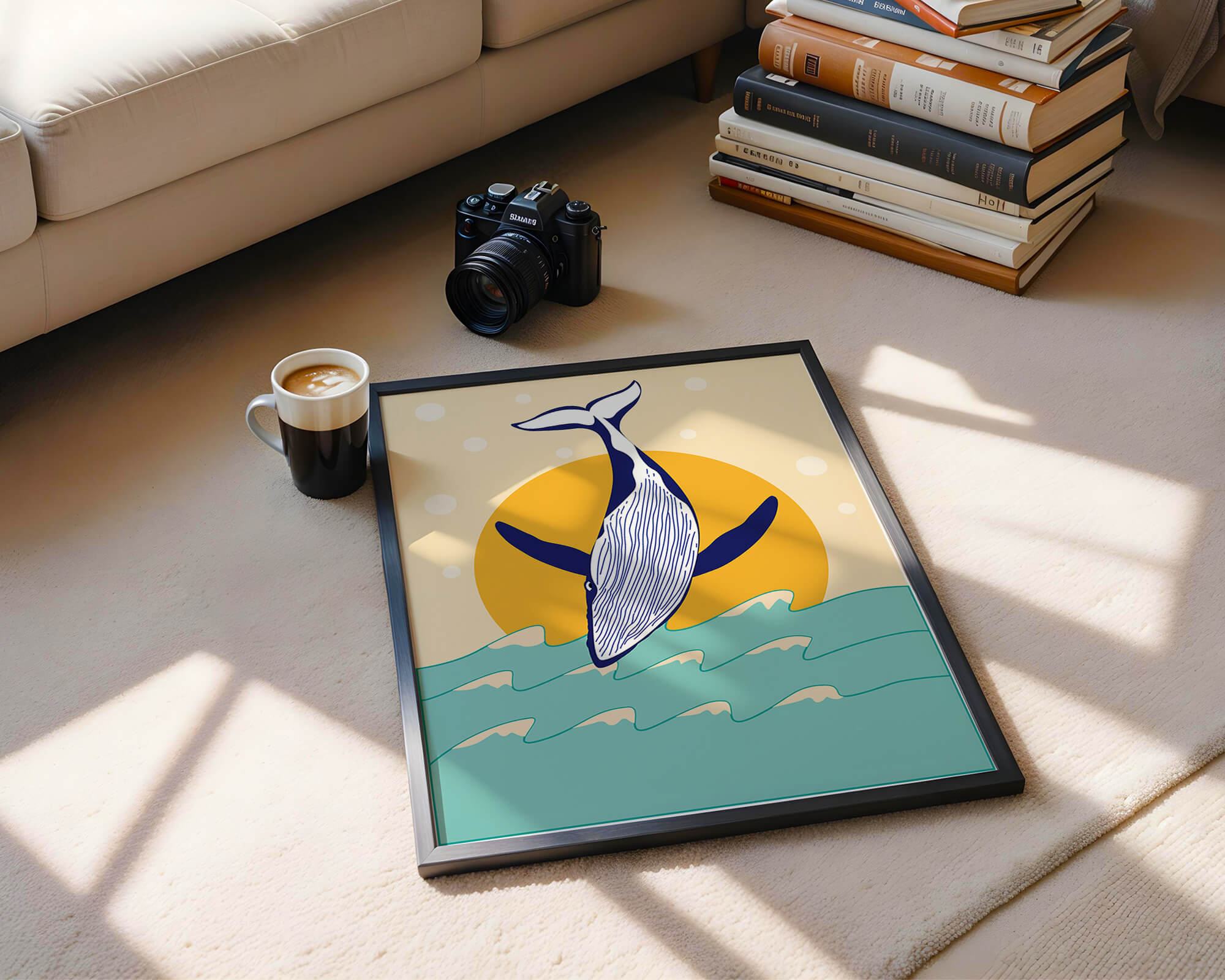Cette œuvre d'art dynamique capture une illustration saisissante d'une baleine bondissant au-dessus des vagues de l'océan, sur fond de soleil vibrant. Les couleurs audacieuses et les formes simplifiées créent un sentiment de mouvement et de joie, faisant de cette pièce un élément captivant pour n'importe quelle pièce.
