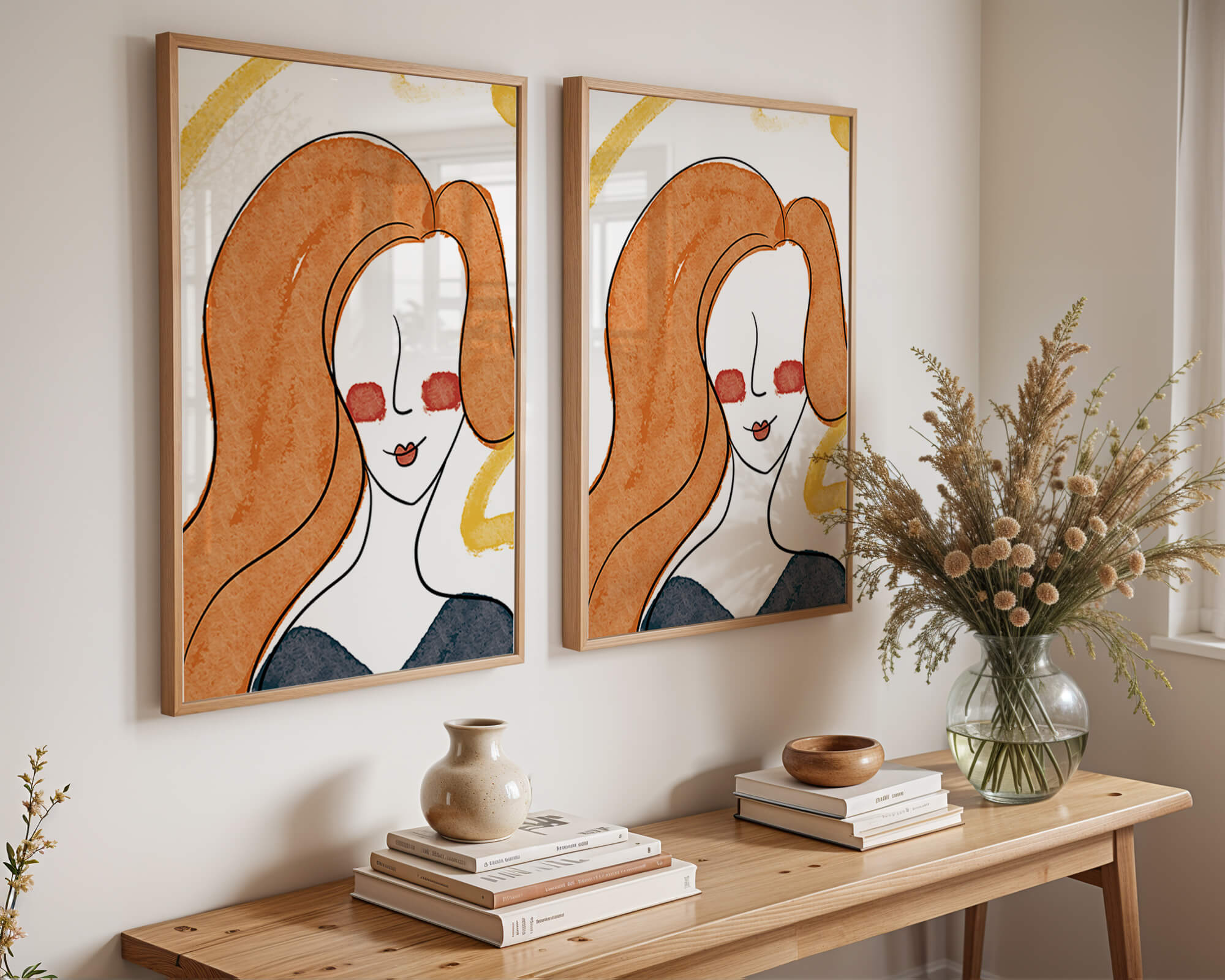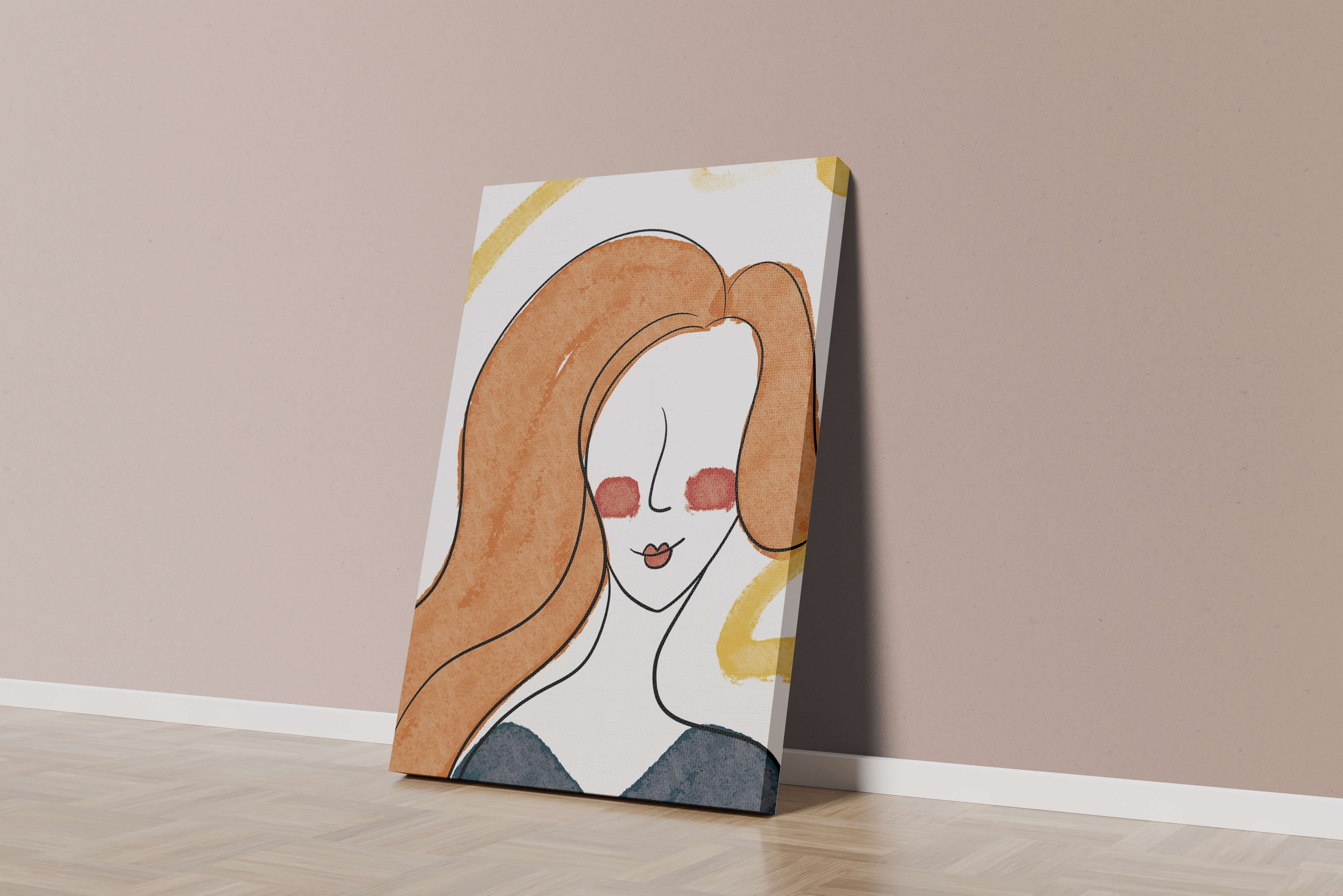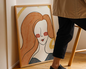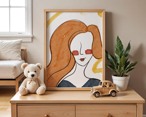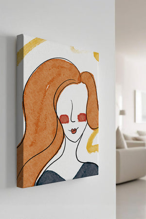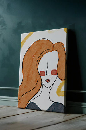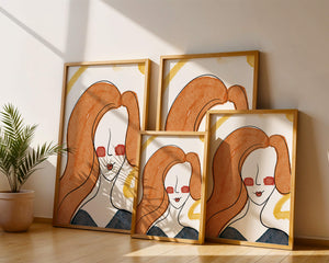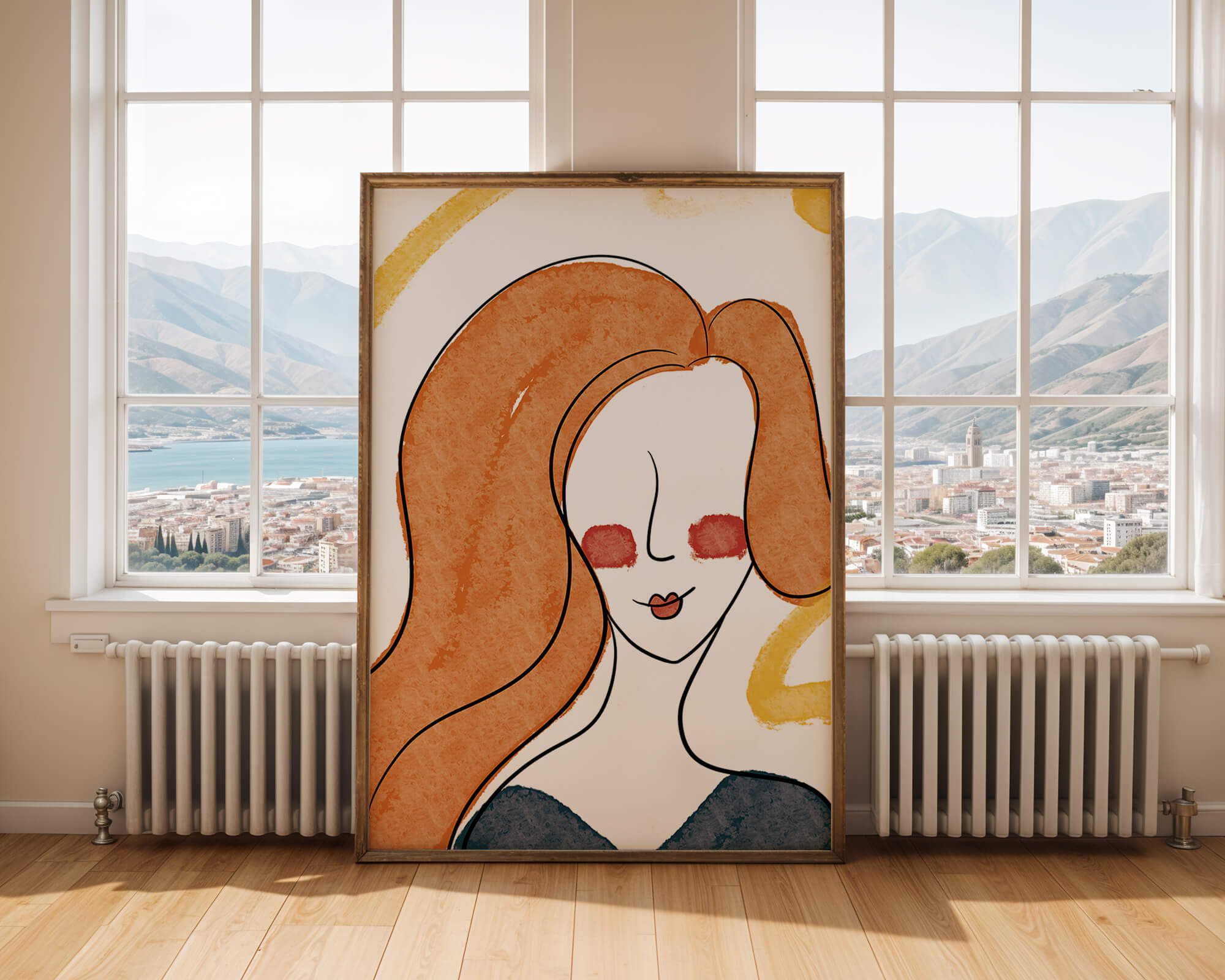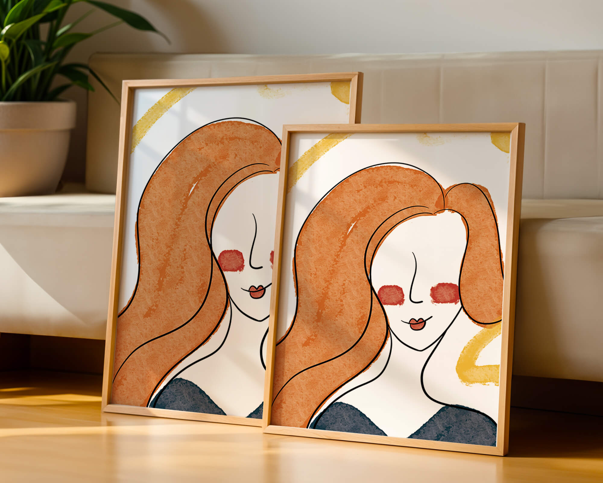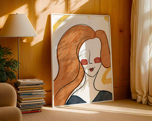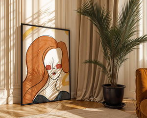 Cette œuvre présente une illustration minimaliste d'une femme aux cheveux roux, caractérisée par des lignes simples et une expression abstraite. La simplicité artistique est mise en valeur par des couleurs subtiles et une touche d'or, apportant une note moderne.