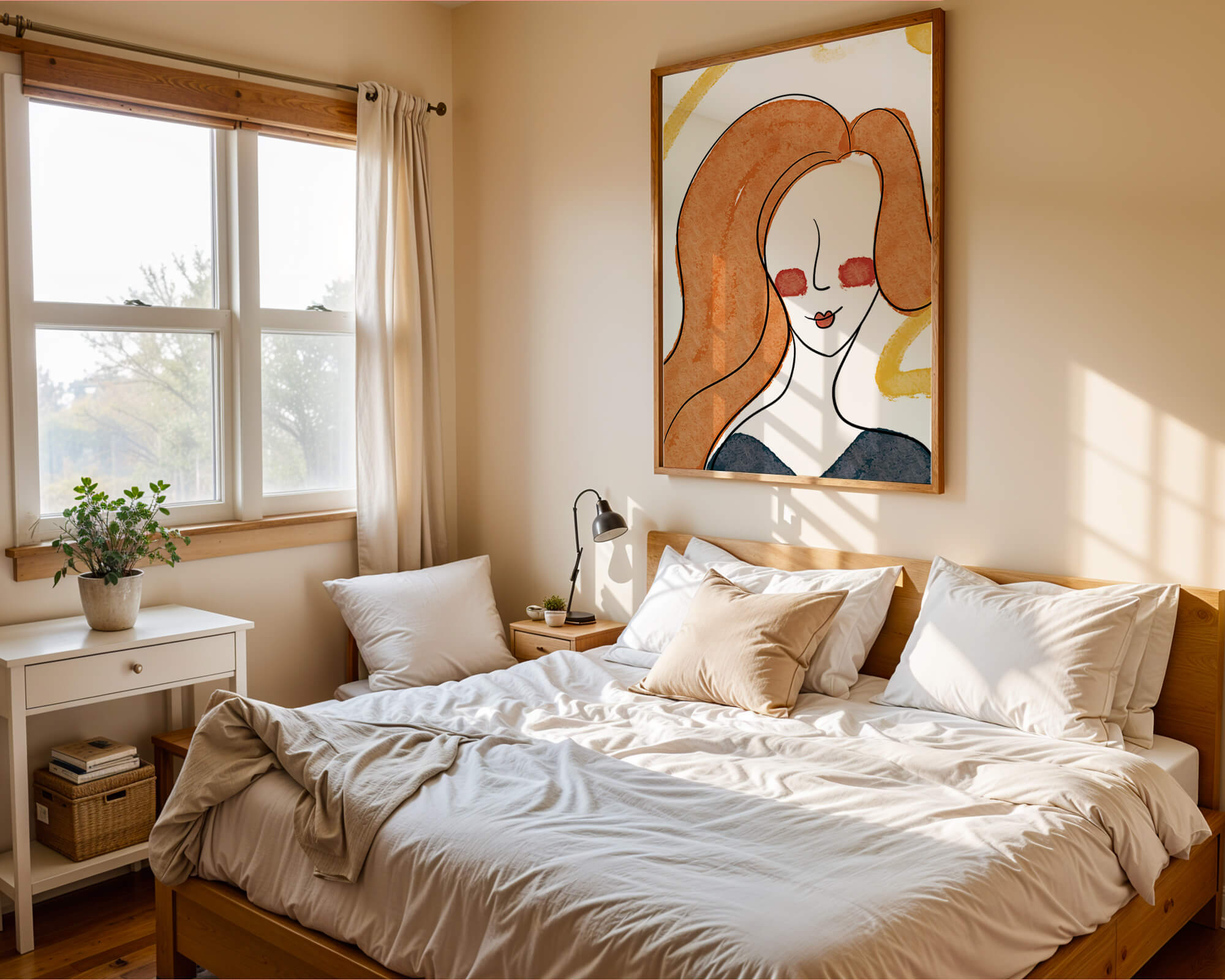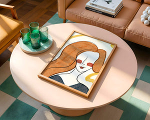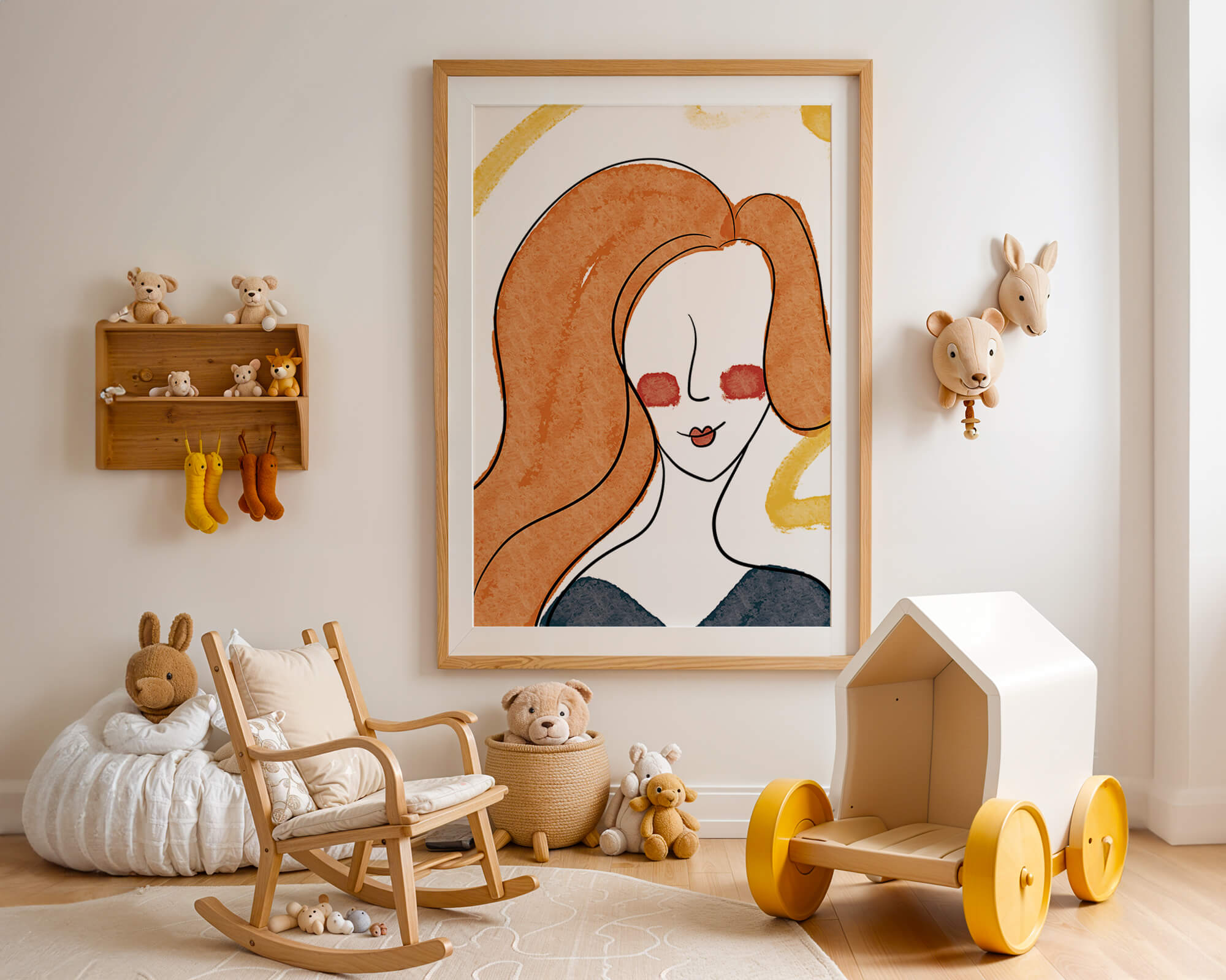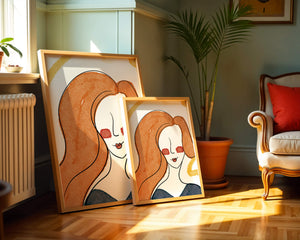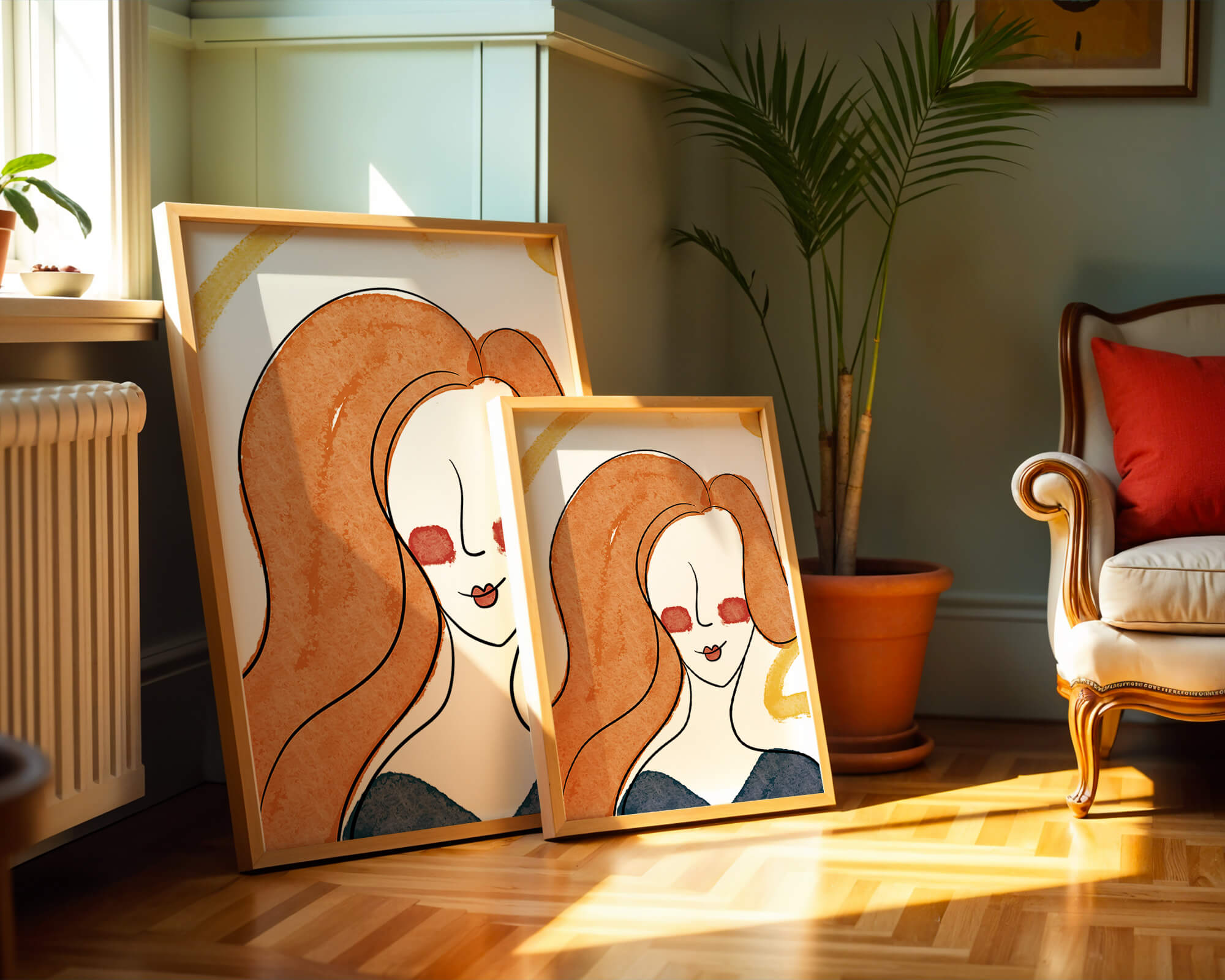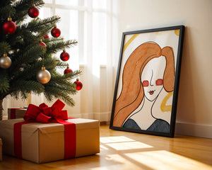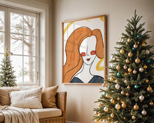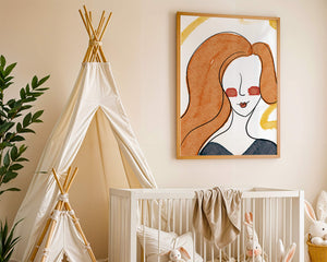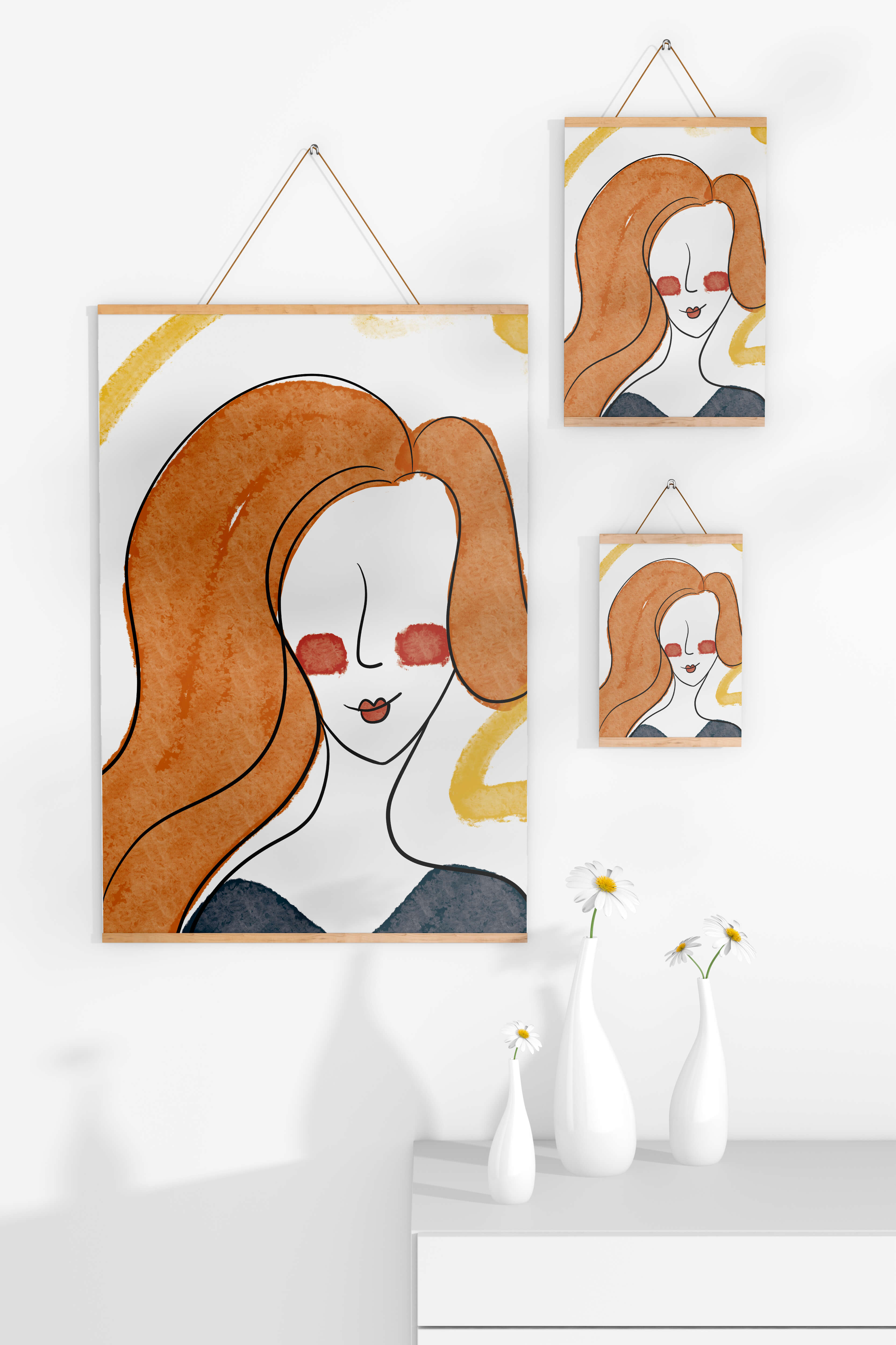 Cette œuvre présente une illustration minimaliste d'une femme aux cheveux roux, caractérisée par des lignes simples et une expression abstraite. La simplicité artistique est mise en valeur par des couleurs subtiles et une touche d'or, apportant une note moderne.