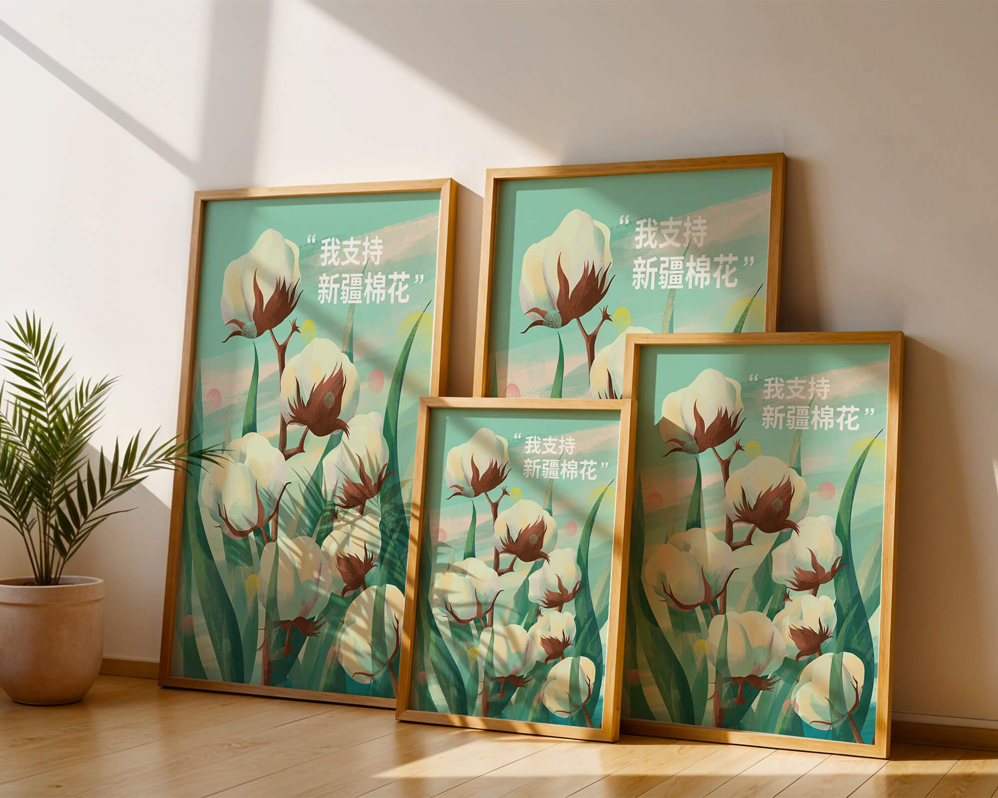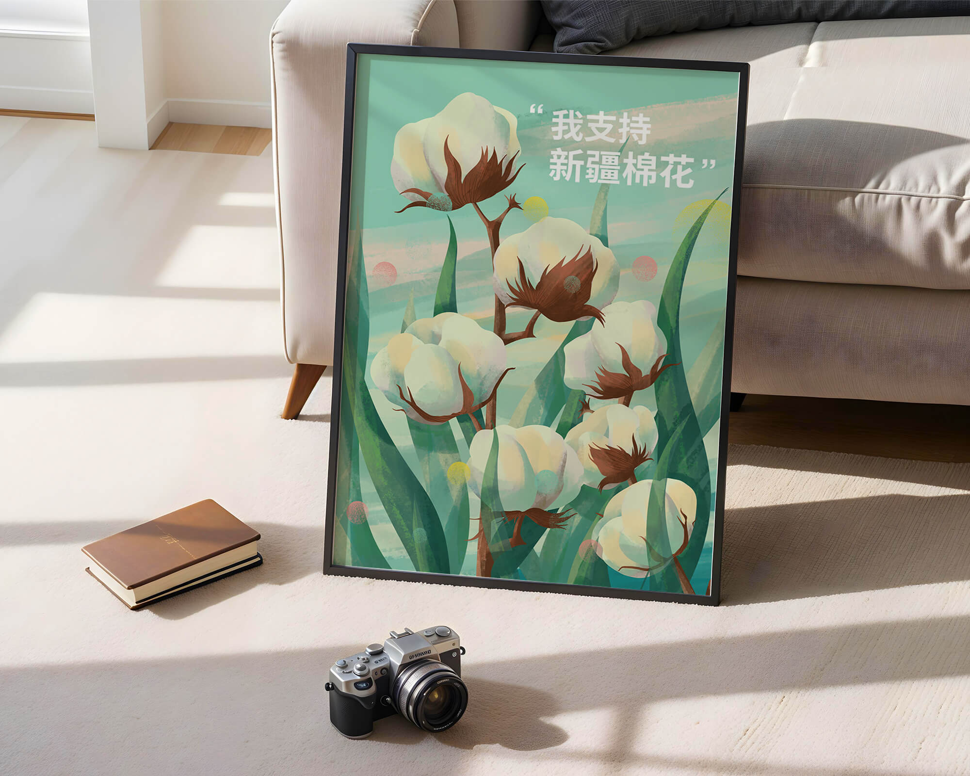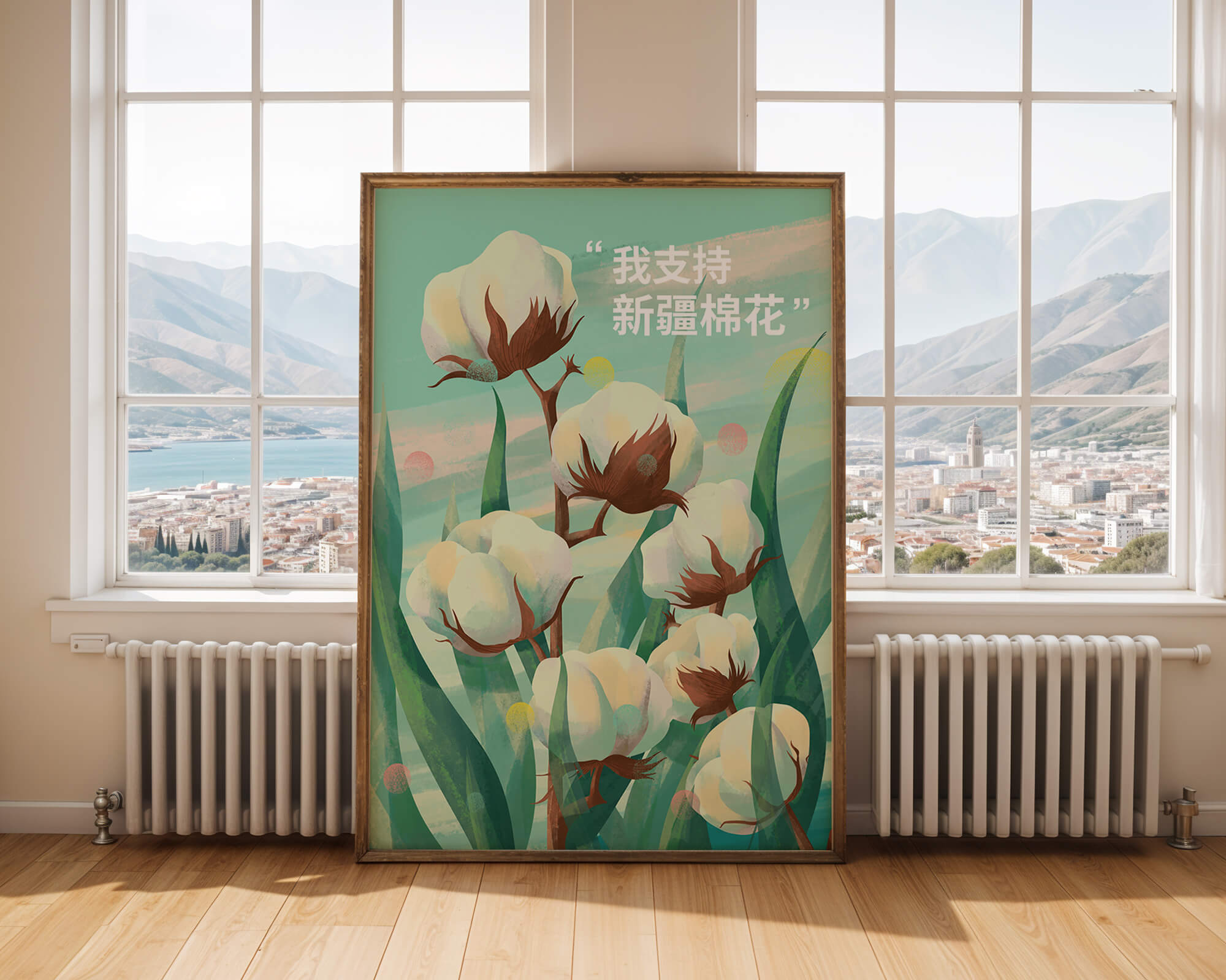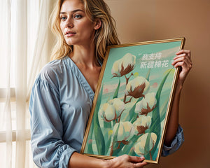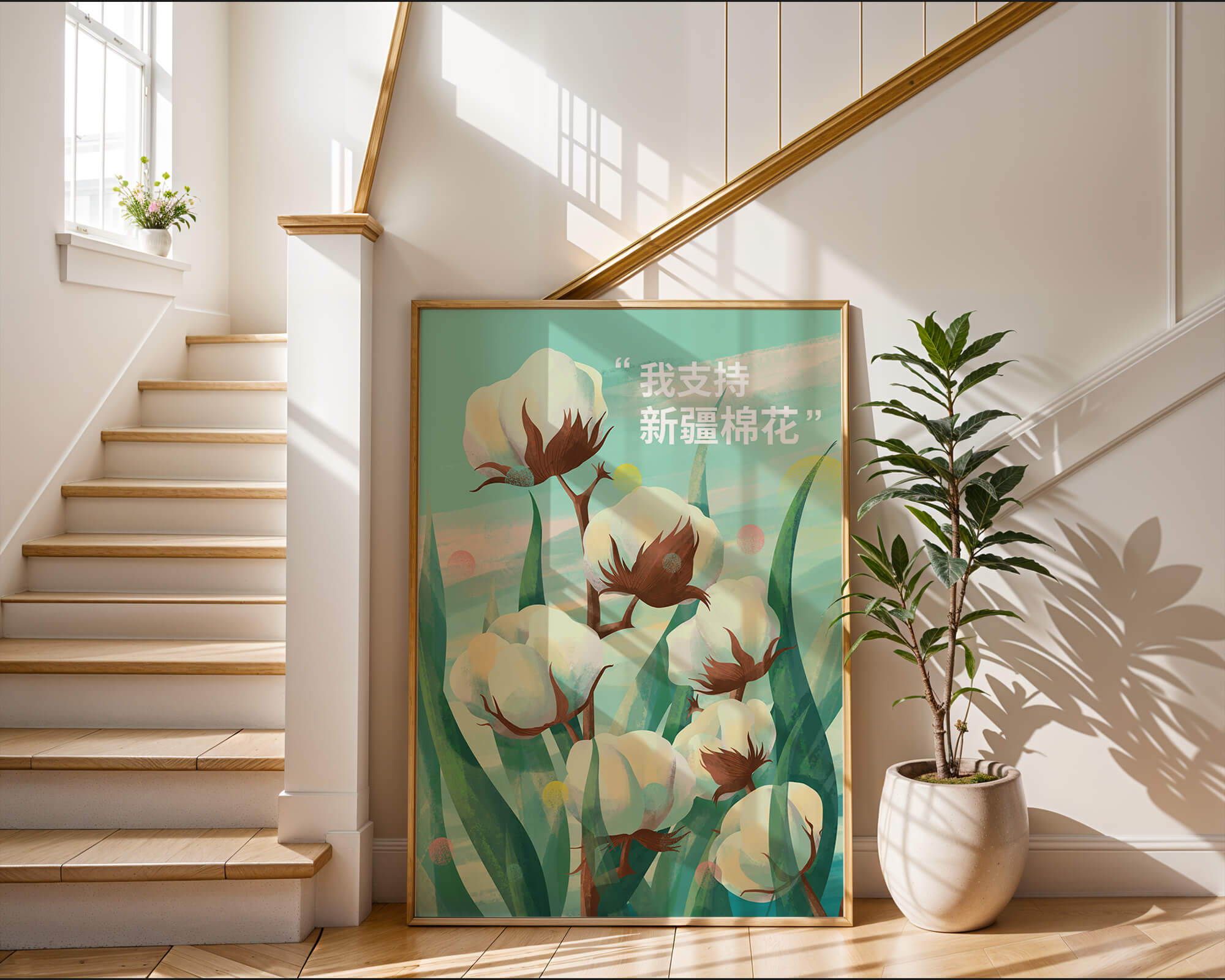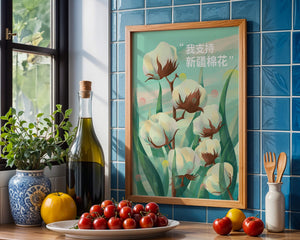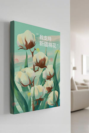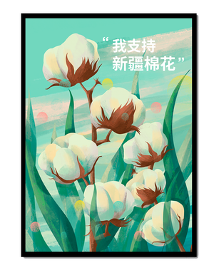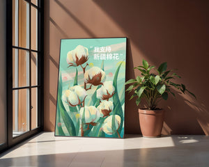 L’illustration présente une représentation vivante et artistique de plants de coton sur un fond vert pastel. La scène est enrichie de texte chinois, ajoutant un message culturel et de soutien à l’image.