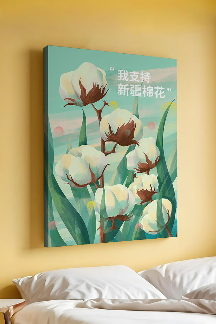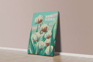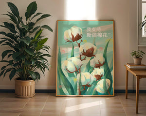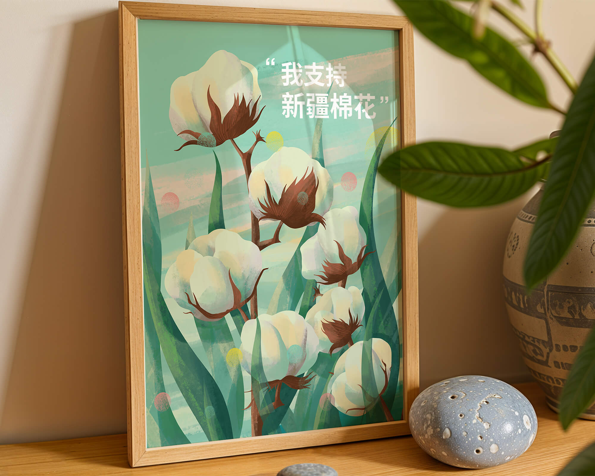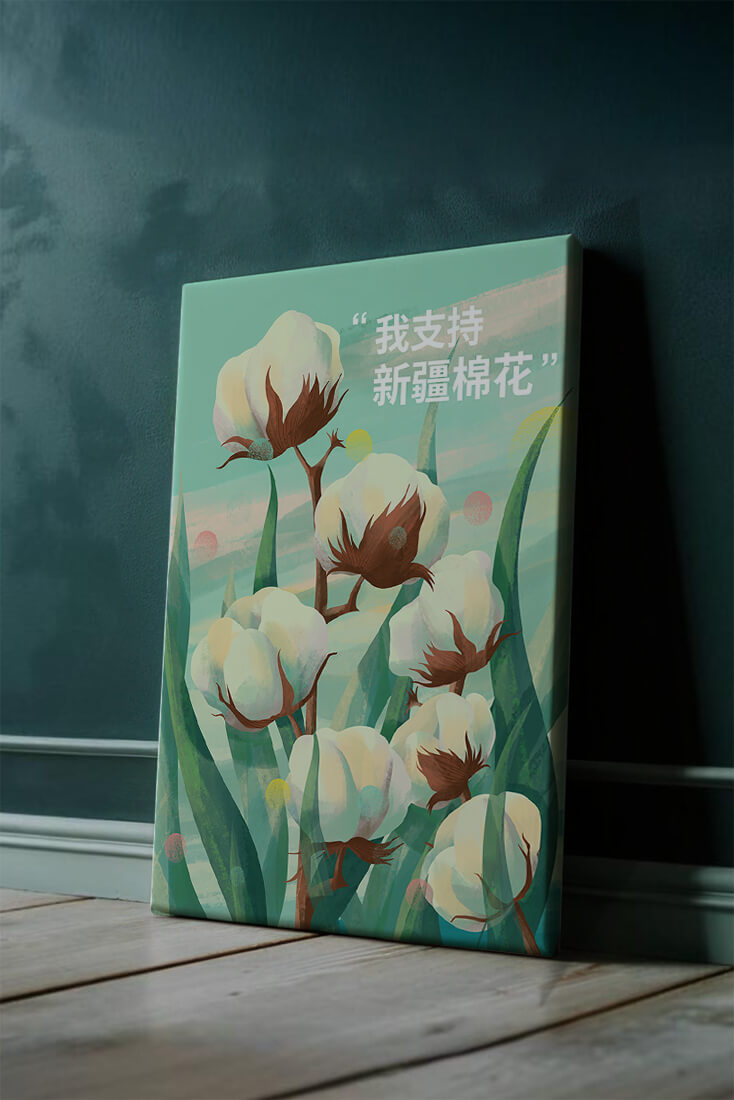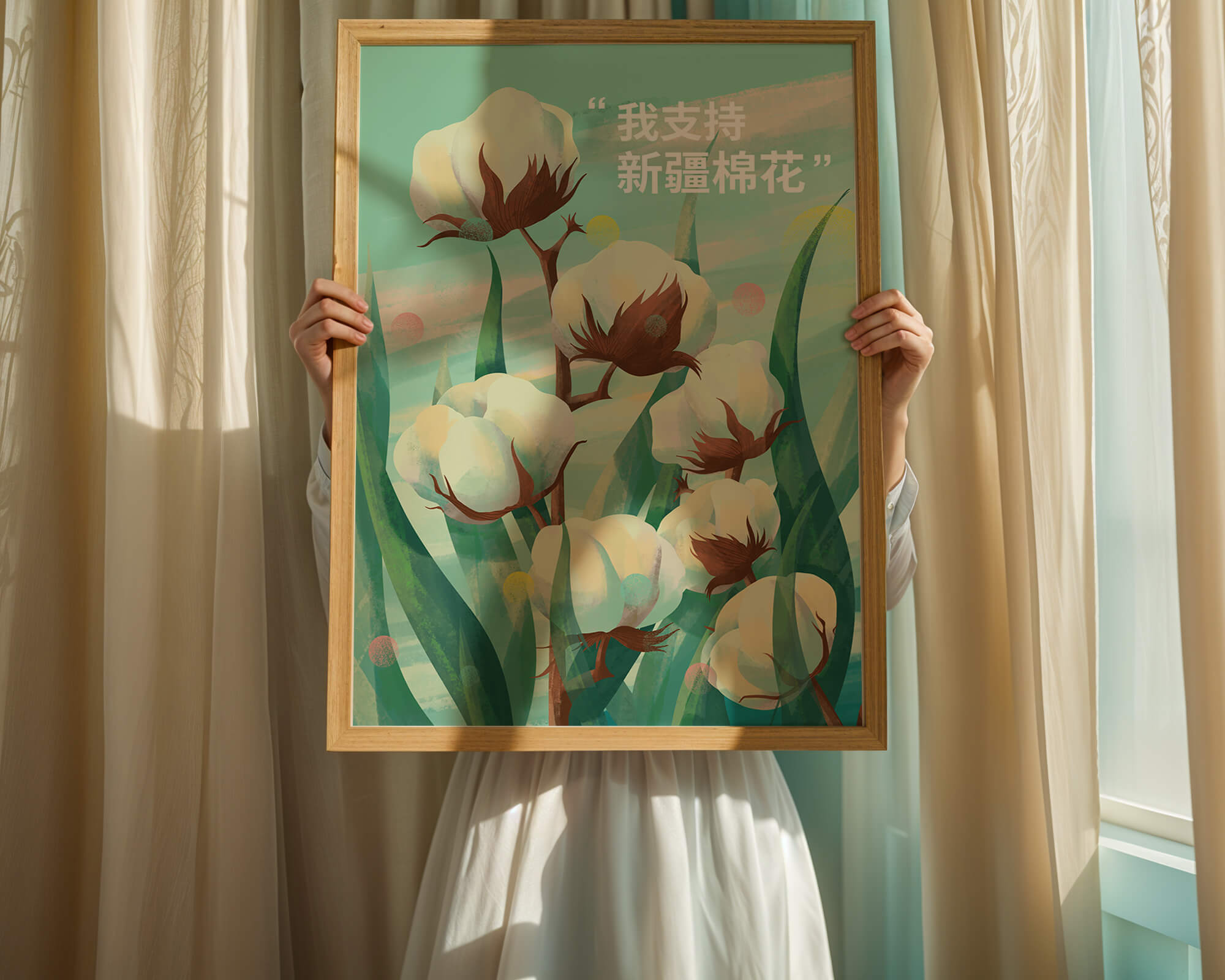 L’illustration présente une représentation vivante et artistique de plants de coton sur un fond vert pastel. La scène est enrichie de texte chinois, ajoutant un message culturel et de soutien à l’image.