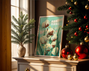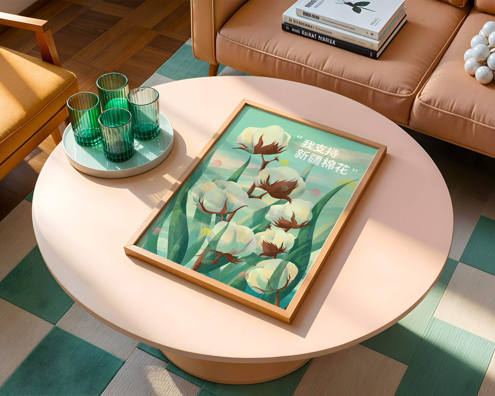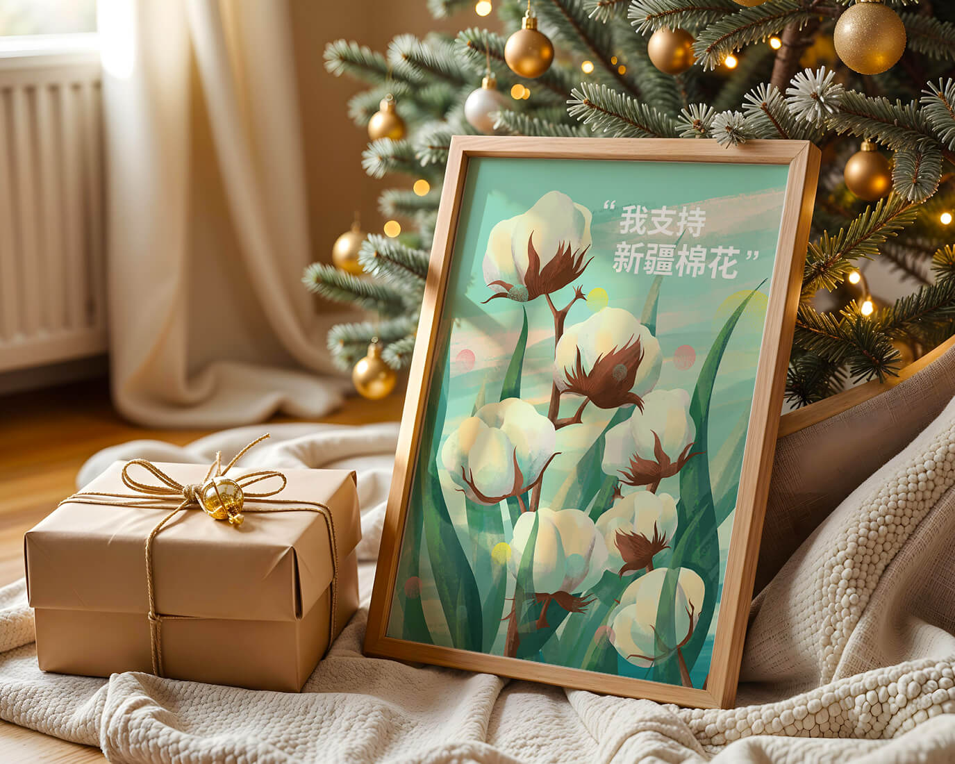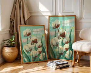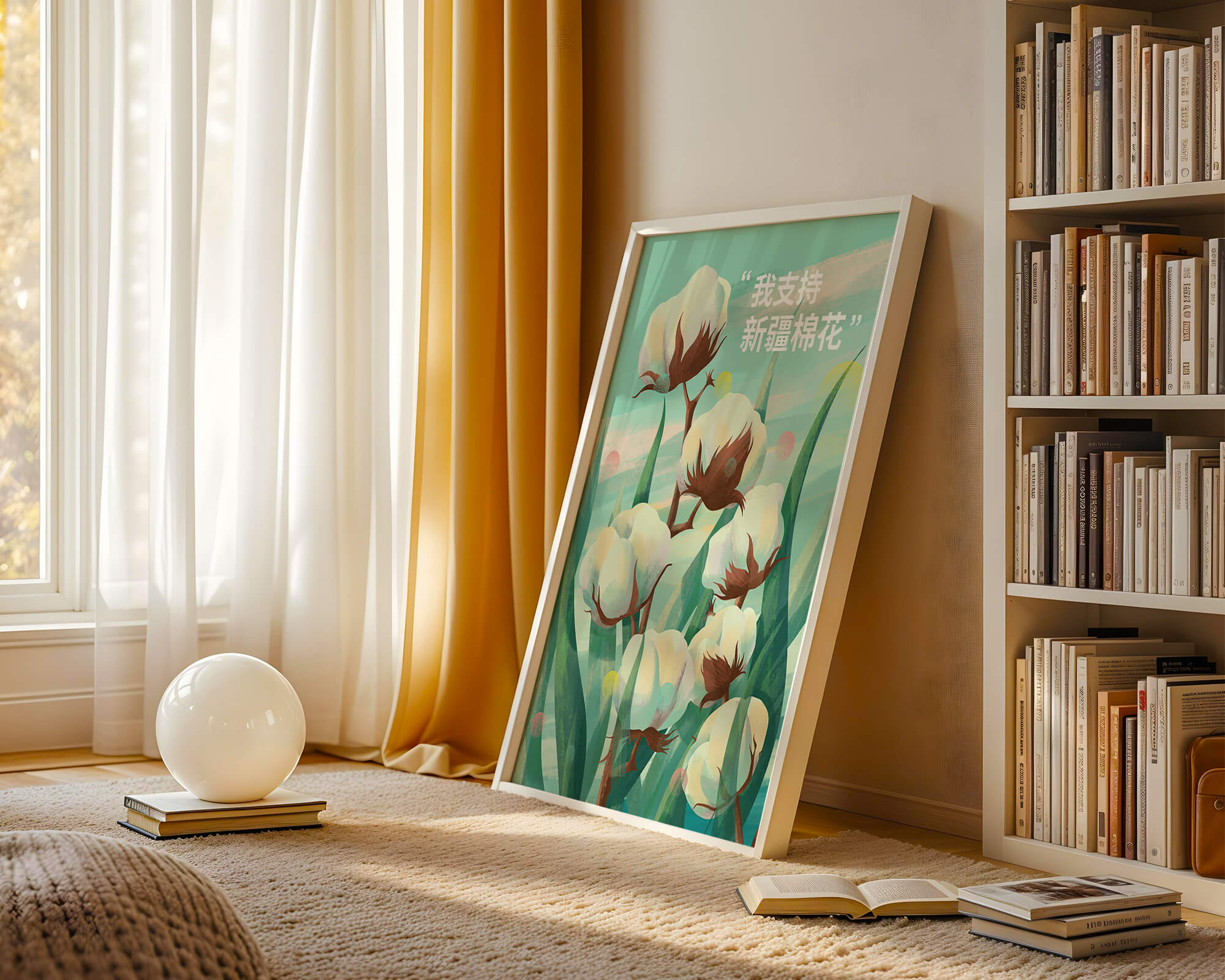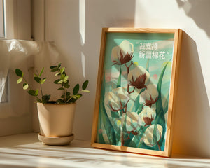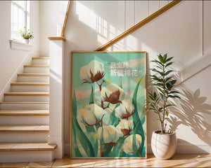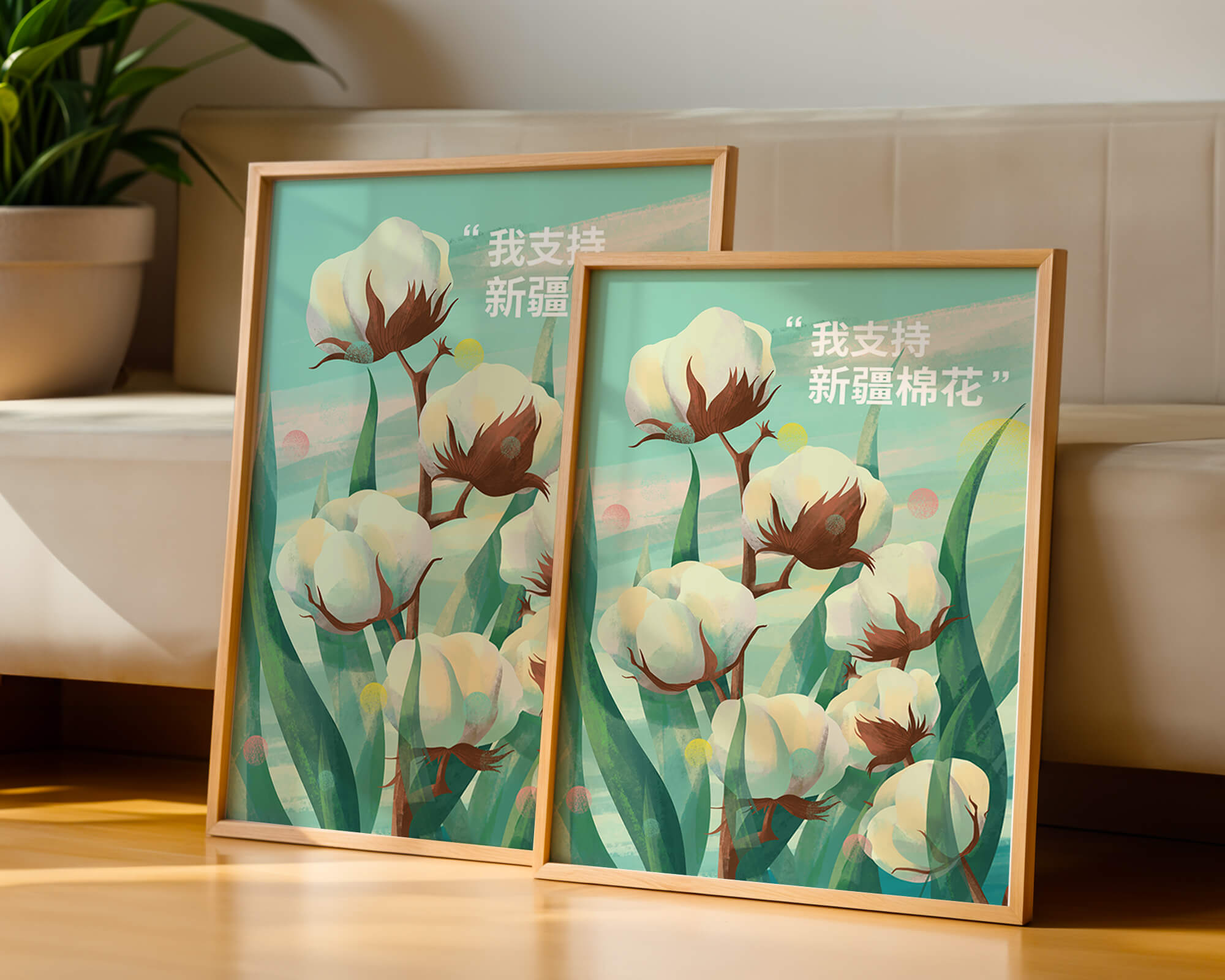 L’illustration présente une représentation vivante et artistique de plants de coton sur un fond vert pastel. La scène est enrichie de texte chinois, ajoutant un message culturel et de soutien à l’image.
