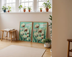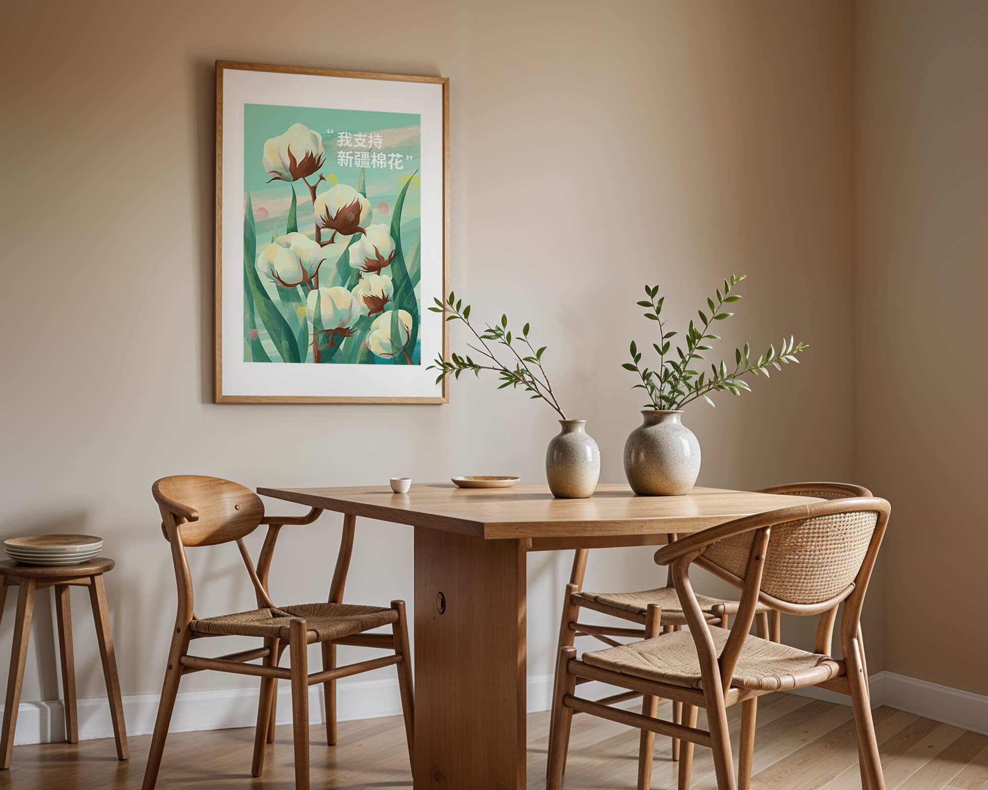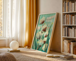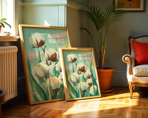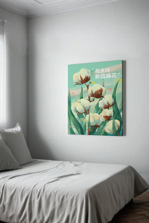 Dans cette œuvre, les plants de coton sont magnifiquement représentés avec de douces fleurs blanches duveteuses contrastant avec des tiges brunes profondes et des feuilles vertes luxuriantes. Le fond pastel offre une atmosphère sereine et apaisante, complétée par les points multicolores qui ajoutent une touche de fantaisie. Le texte chinois superposé apporte un contexte culturel, suggérant des thèmes de soutien ou d’encouragement. Cette pièce serait un bel ajout à tout intérieur, s’intégrant parfaitement dans des pièces comme le salon ou la chambre. Son thème doux et botanique apporte chaleur et nature à l’intérieur, offrant à la fois un plaisir visuel et une touche de sentiment culturel.| Taper |