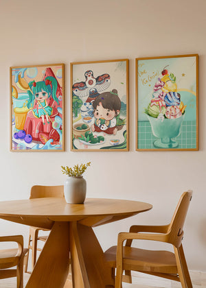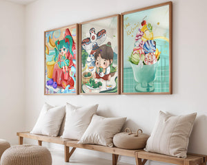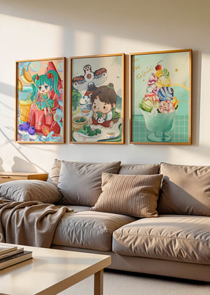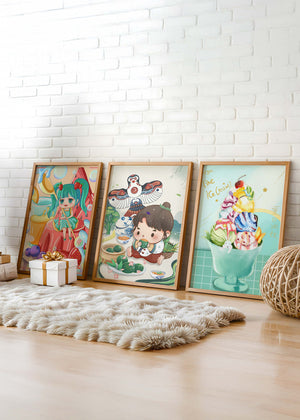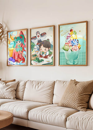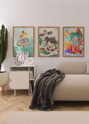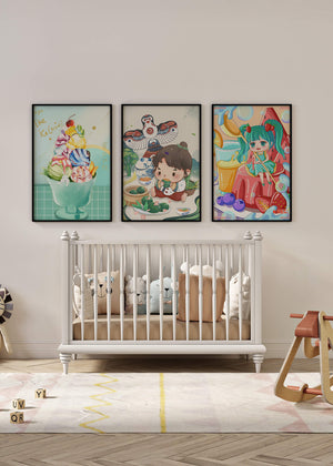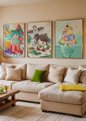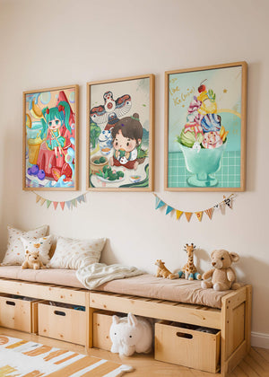 Ces illustrations artistiques présentent une utilisation saisissante des couleurs et des personnages animés dans un design moderne. Chaque pièce affiche un style unique et vibrant, parfait pour décorer des chambres au ton enfantin ou créatif.