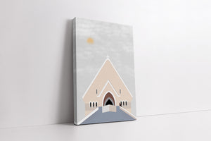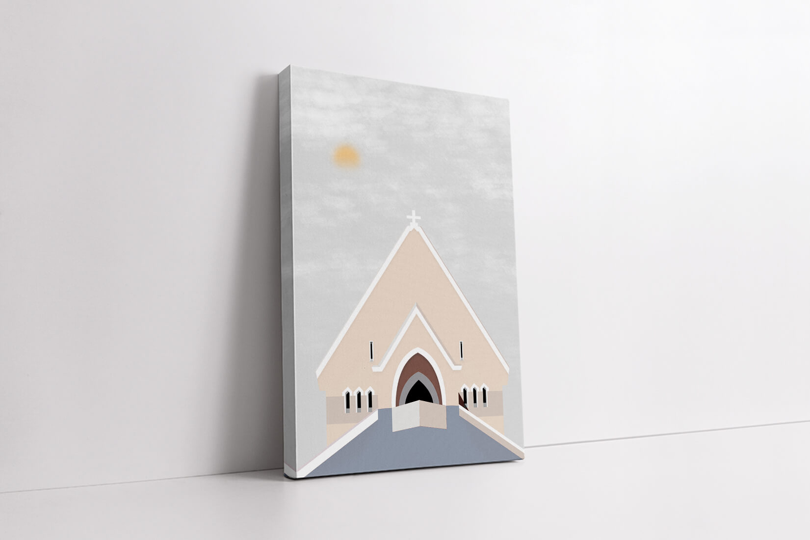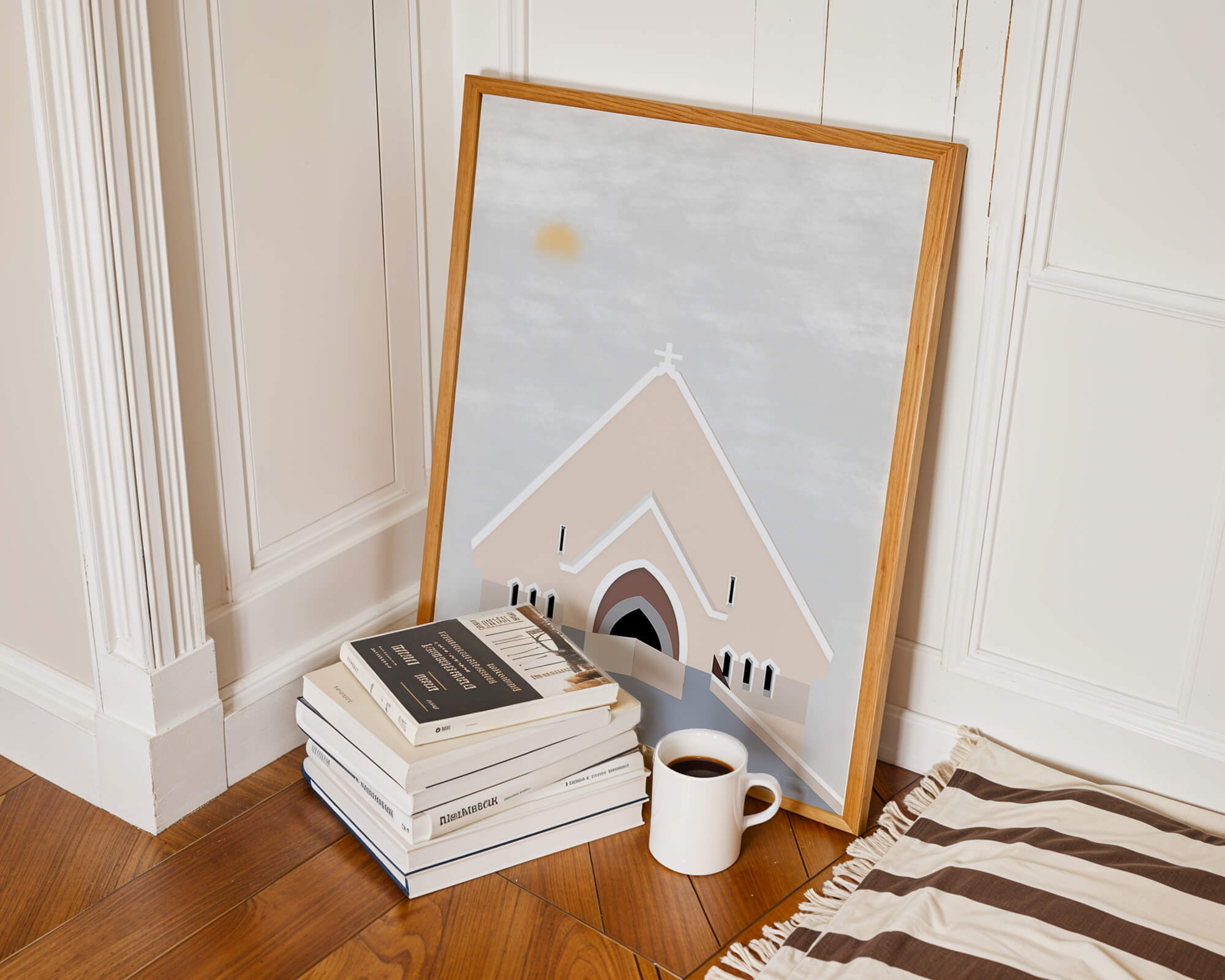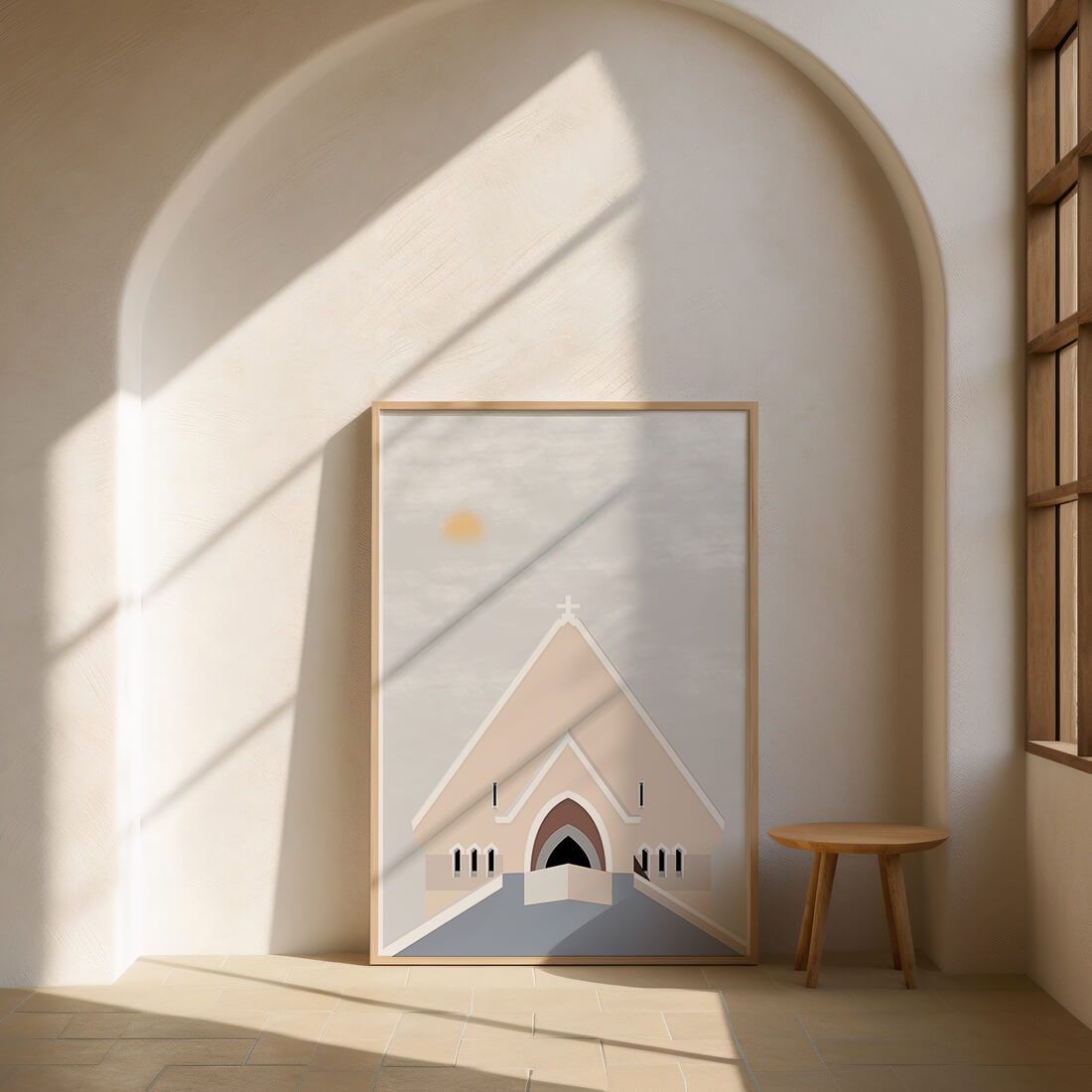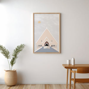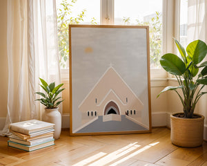 La représentation minimaliste de cette église met en évidence sa structure élégante et sa signification religieuse. Les couleurs pastel douces créent une atmosphère tranquille, évoquant paix et harmonie.