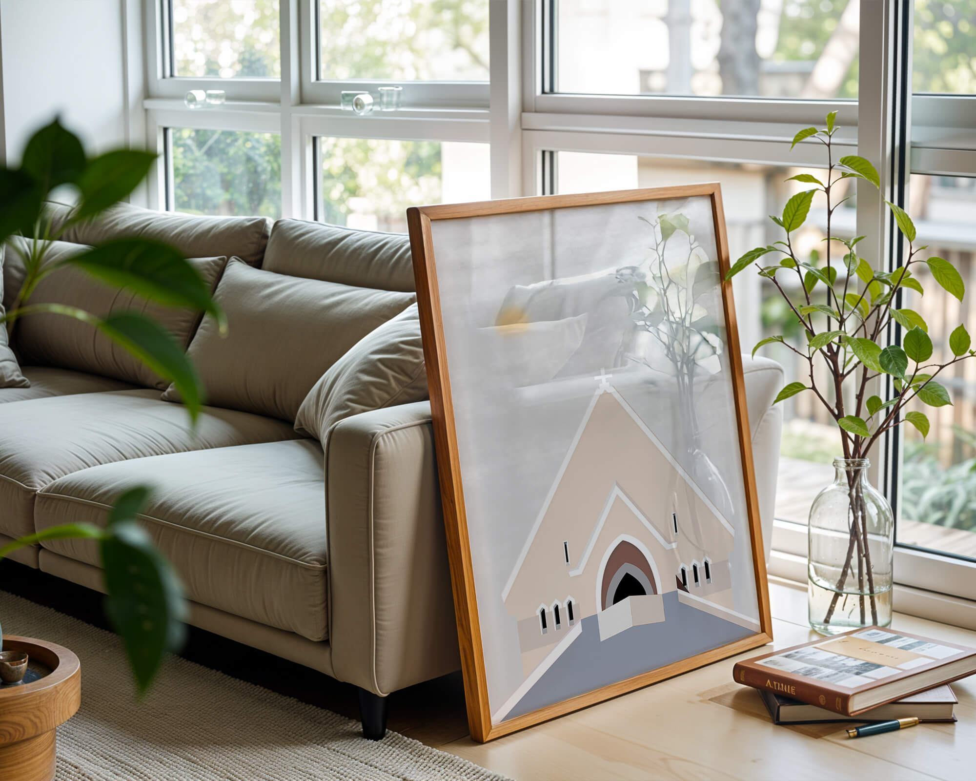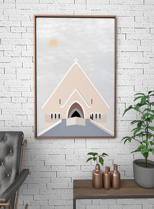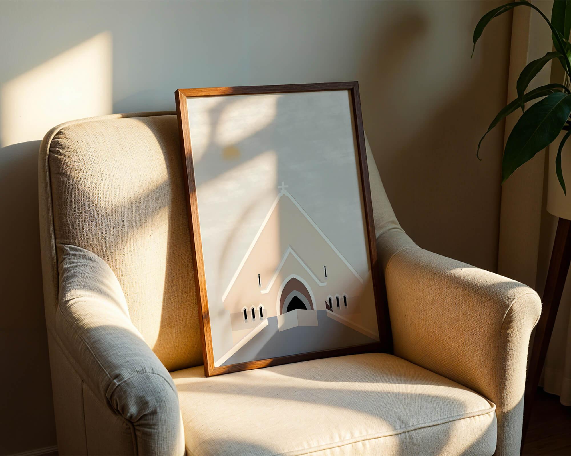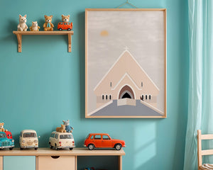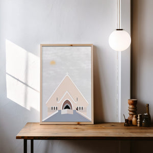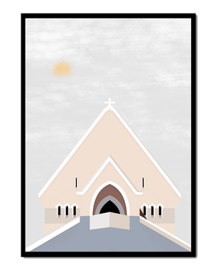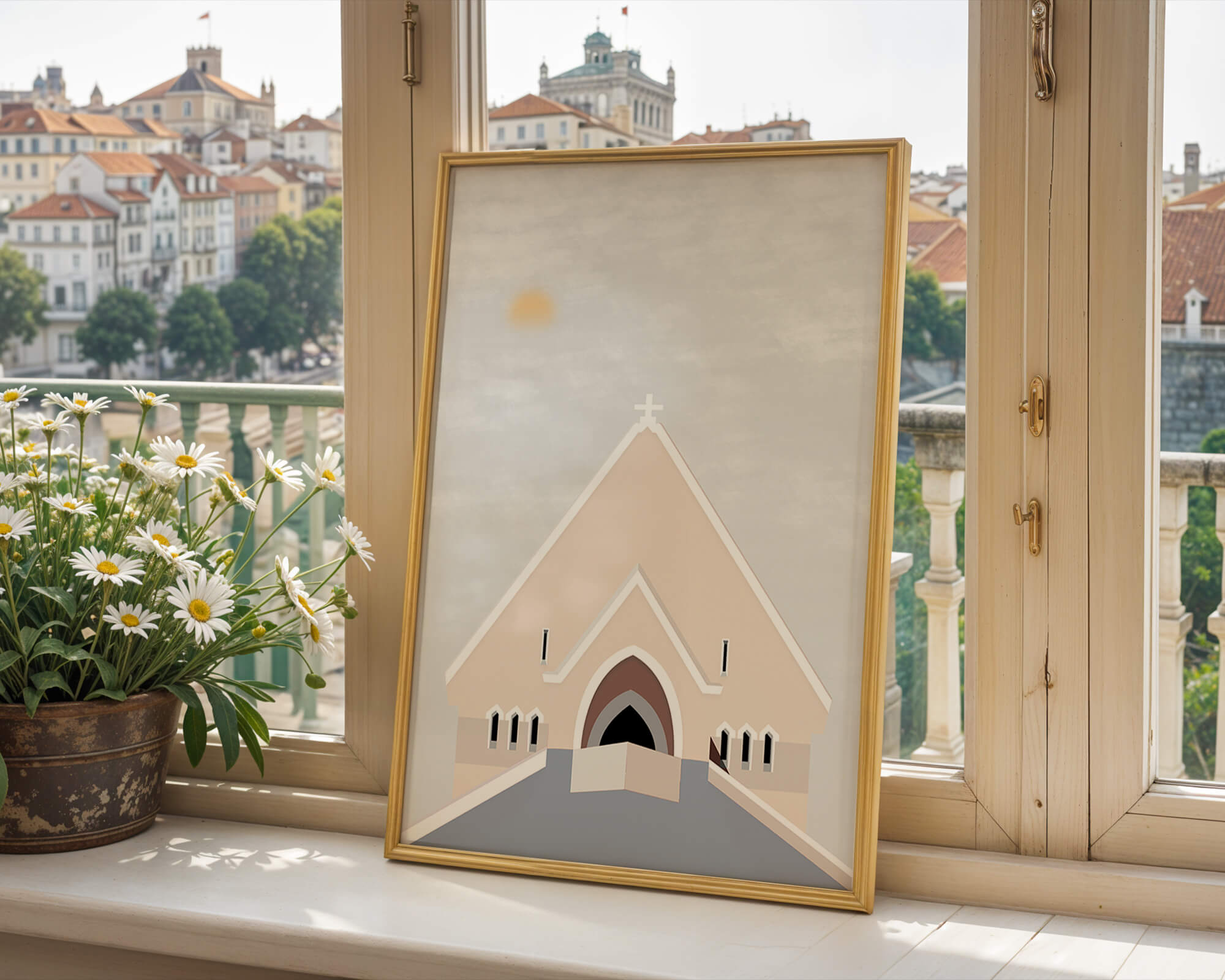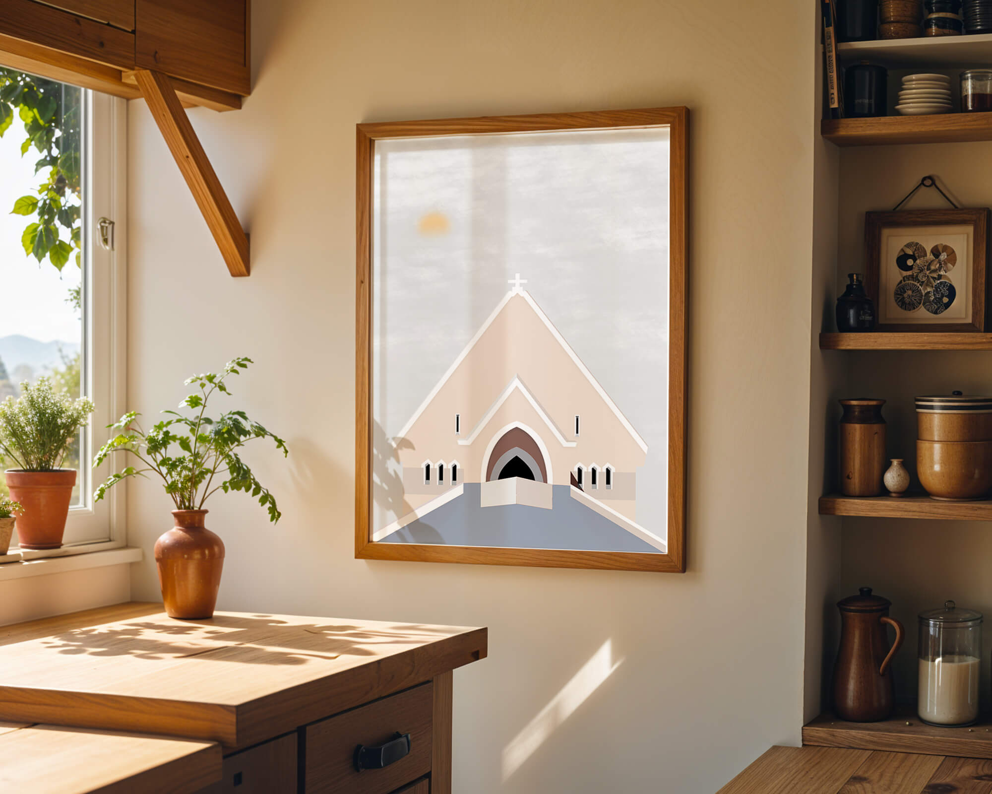 La représentation minimaliste de cette église met en évidence sa structure élégante et sa signification religieuse. Les couleurs pastel douces créent une atmosphère tranquille, évoquant paix et harmonie.