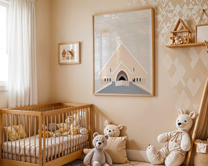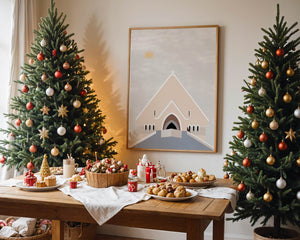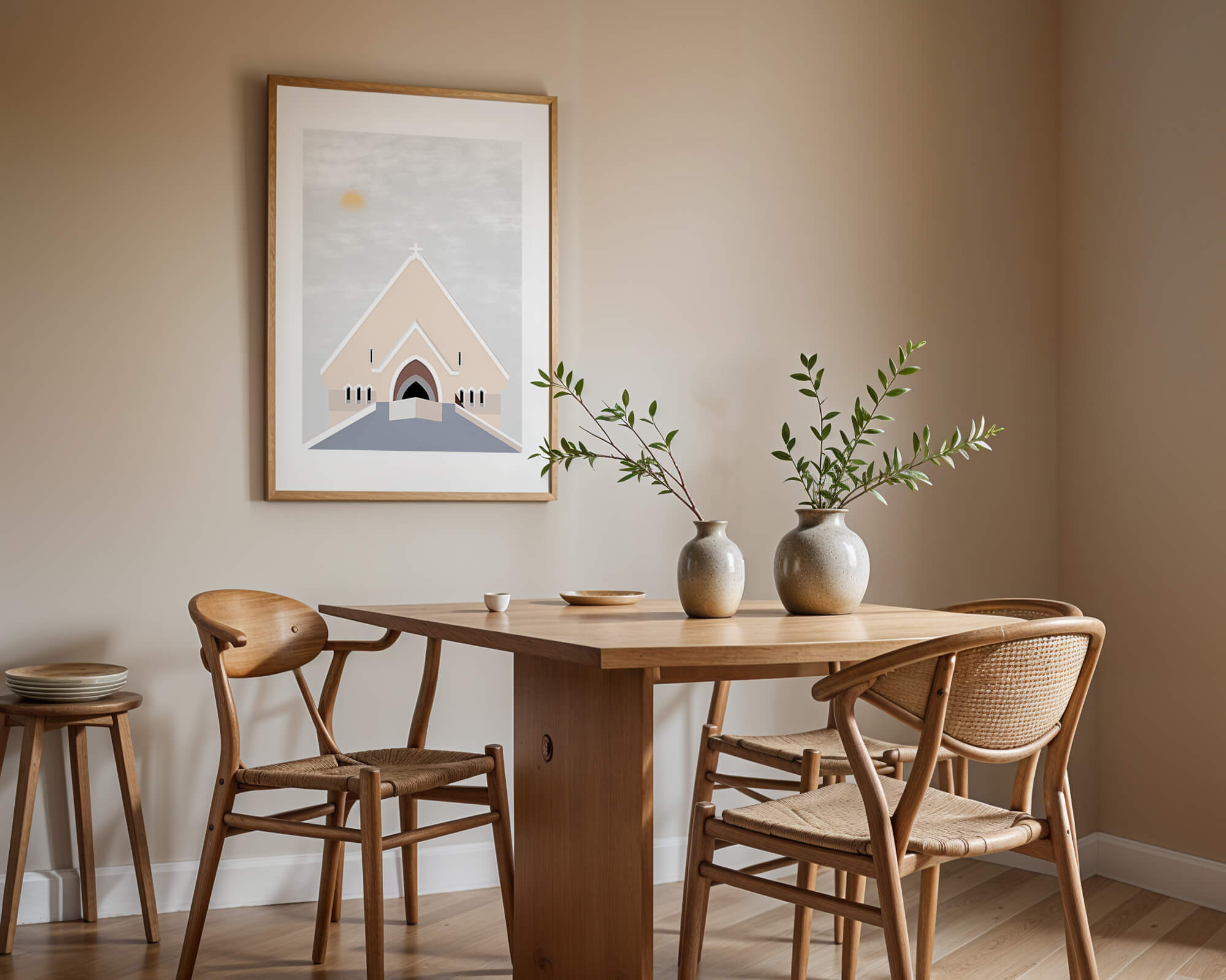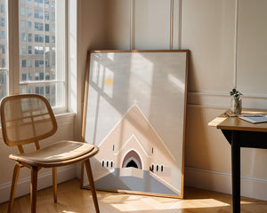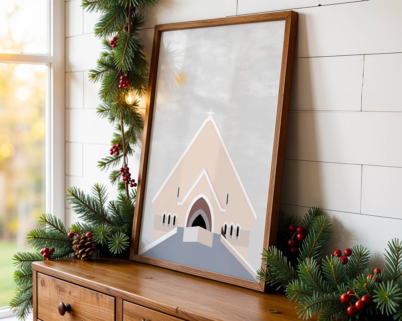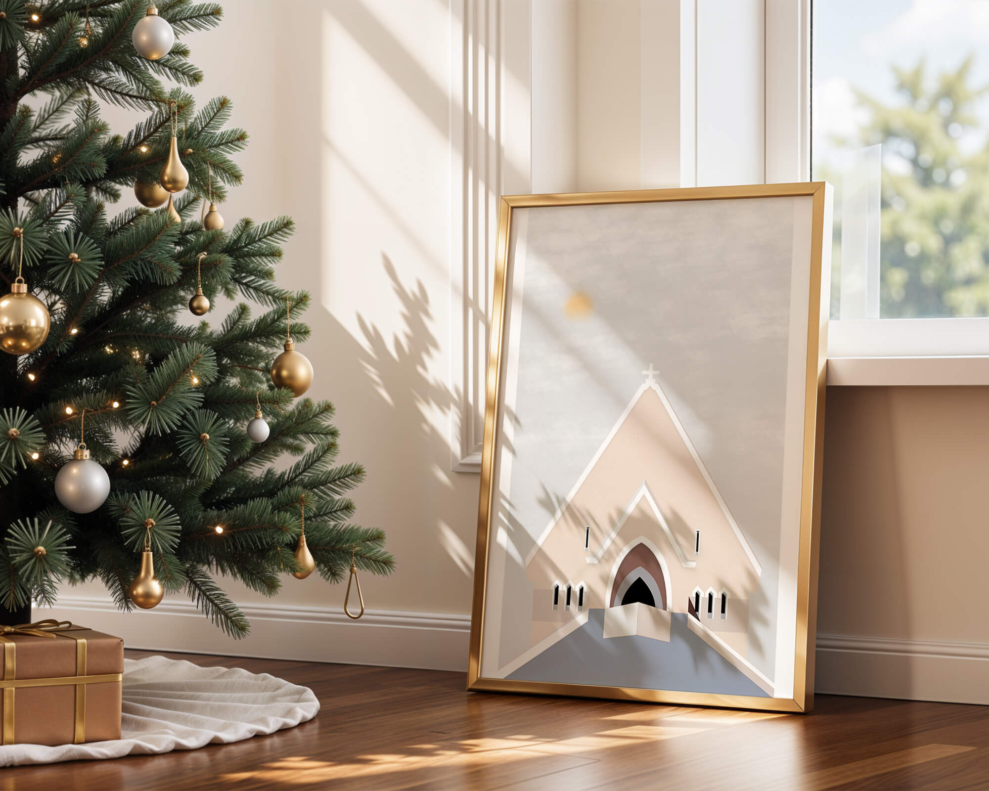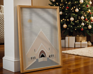 La représentation minimaliste de cette église met en évidence sa structure élégante et sa signification religieuse. Les couleurs pastel douces créent une atmosphère tranquille, évoquant paix et harmonie.