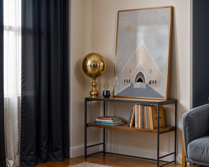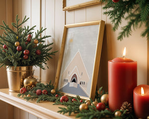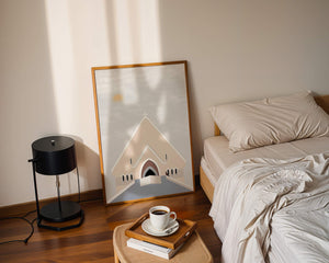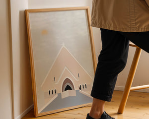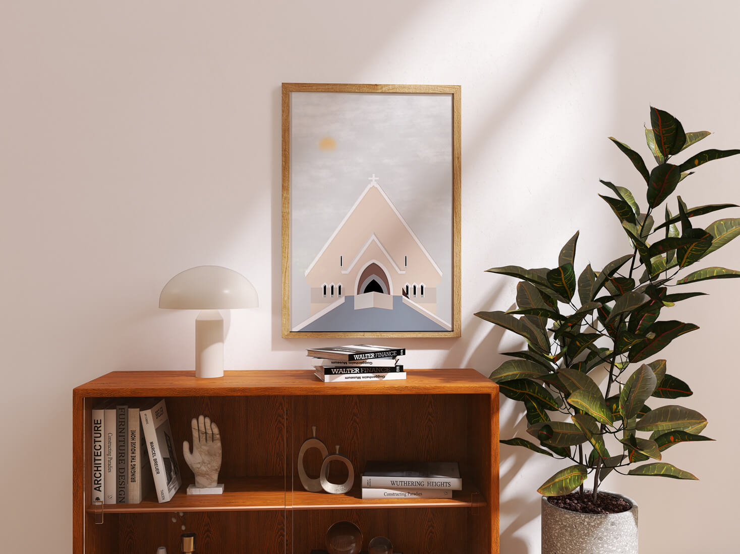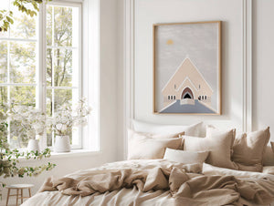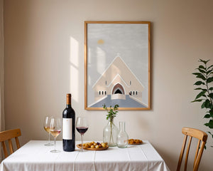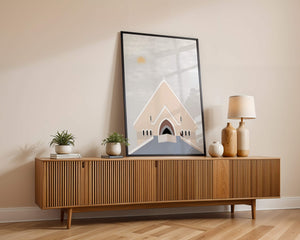 L'œuvre combine des éléments abstraits avec une architecture traditionnelle, offrant une interprétation contemporaine des espaces spirituels. Le lever de soleil subtil ajoute une touche de chaleur et de sérénité, rehaussant la composition globale.