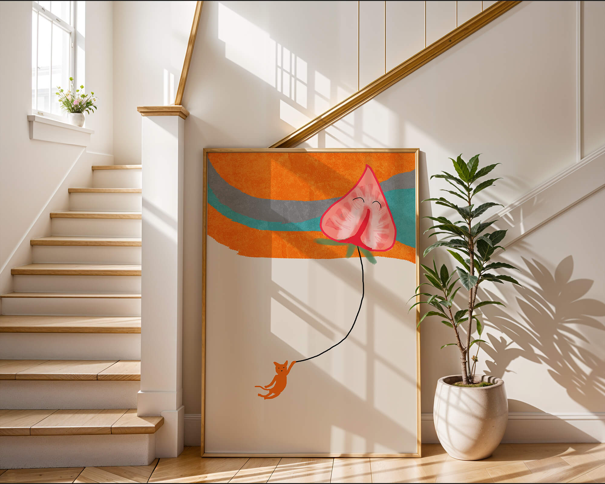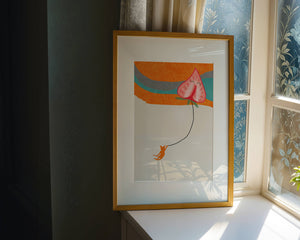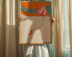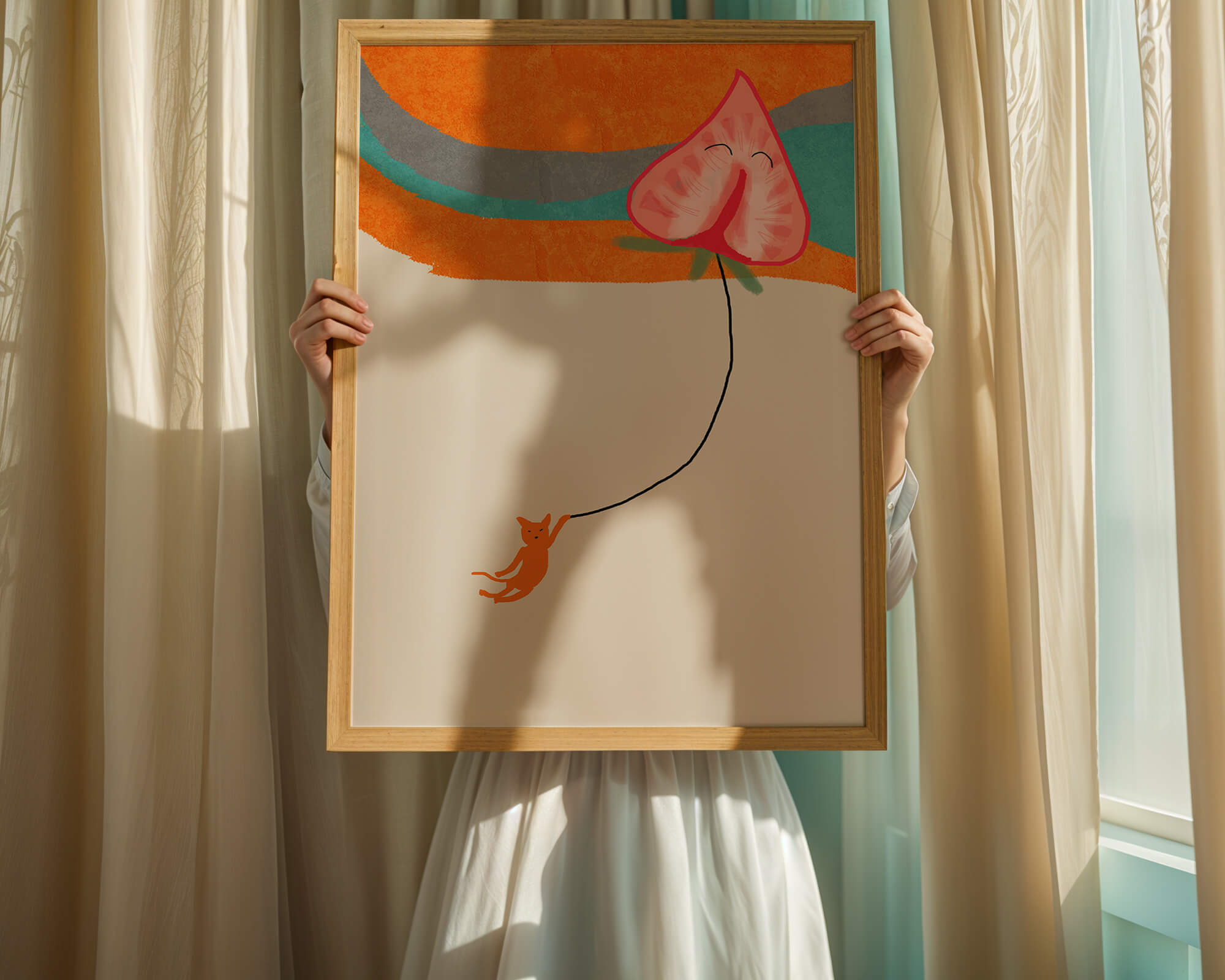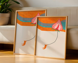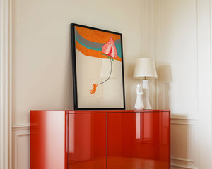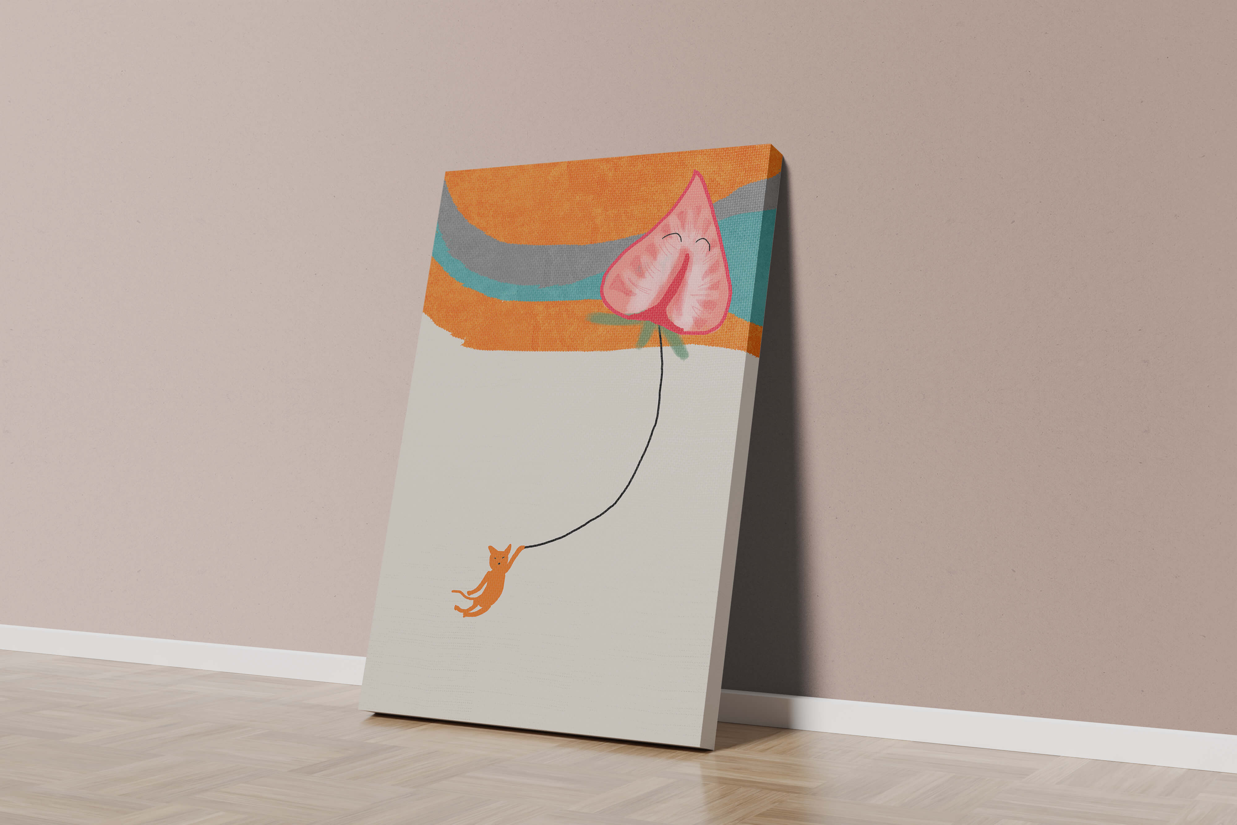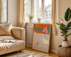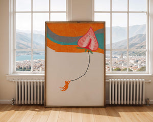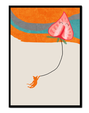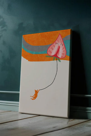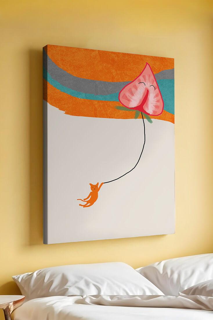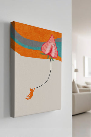 Dans cette œuvre, l'association de formes abstraites et de couleurs vives attire le regard. Le chat orange, suspendu à un ballon en forme de cœur, apporte une touche de fantaisie, contrastant joliment avec le fond coloré. La simplicité du design renforce son charme ludique tout en conservant une esthétique attrayante. Cette œuvre est un parfait exemple d'art moderne et décoratif qui apporte une touche de couleur et de gaieté à tout espace. Qu'elle soit accrochée dans un salon ou une chambre d'enfant, elle saura susciter le sourire et stimuler l'imagination.| Taper |