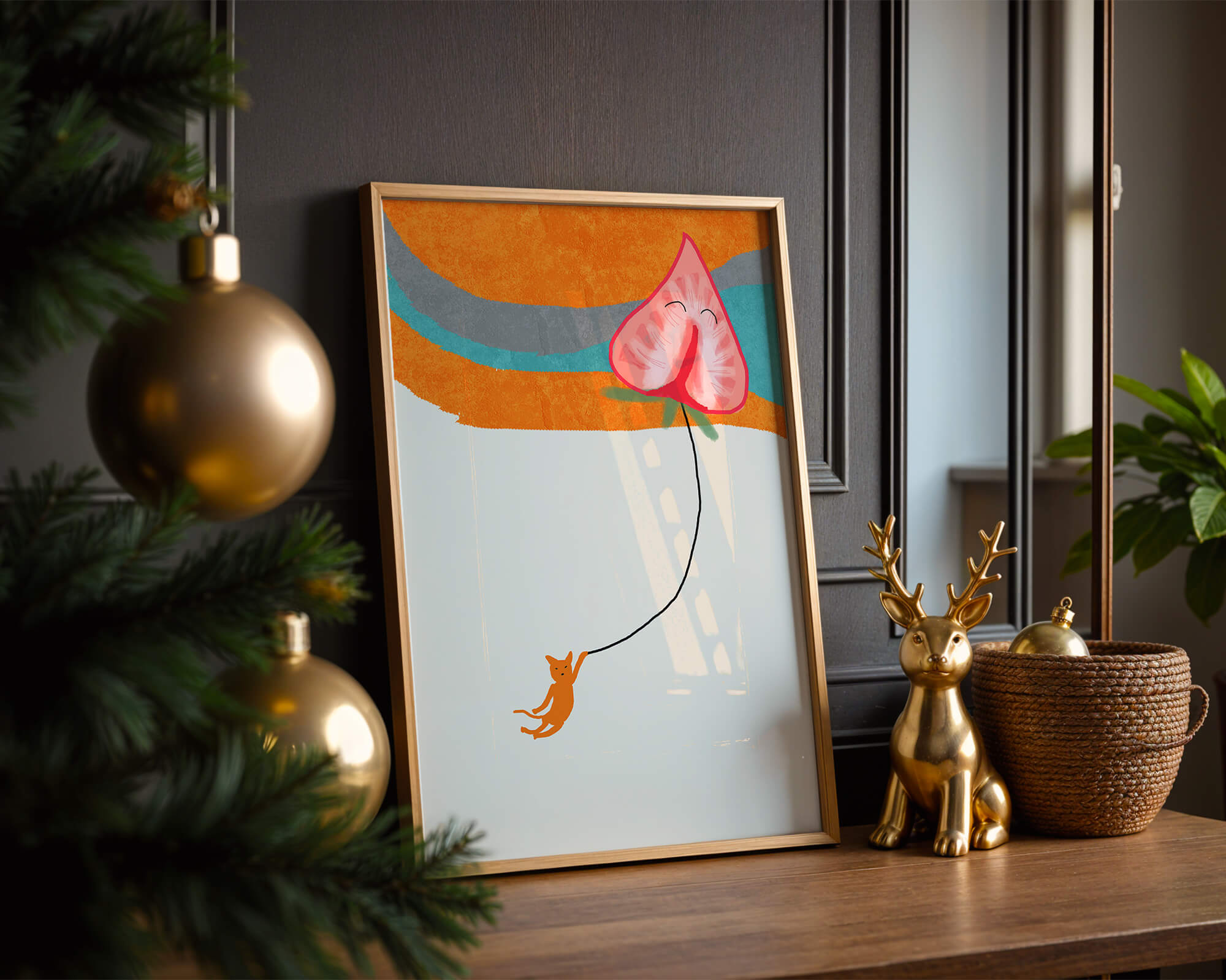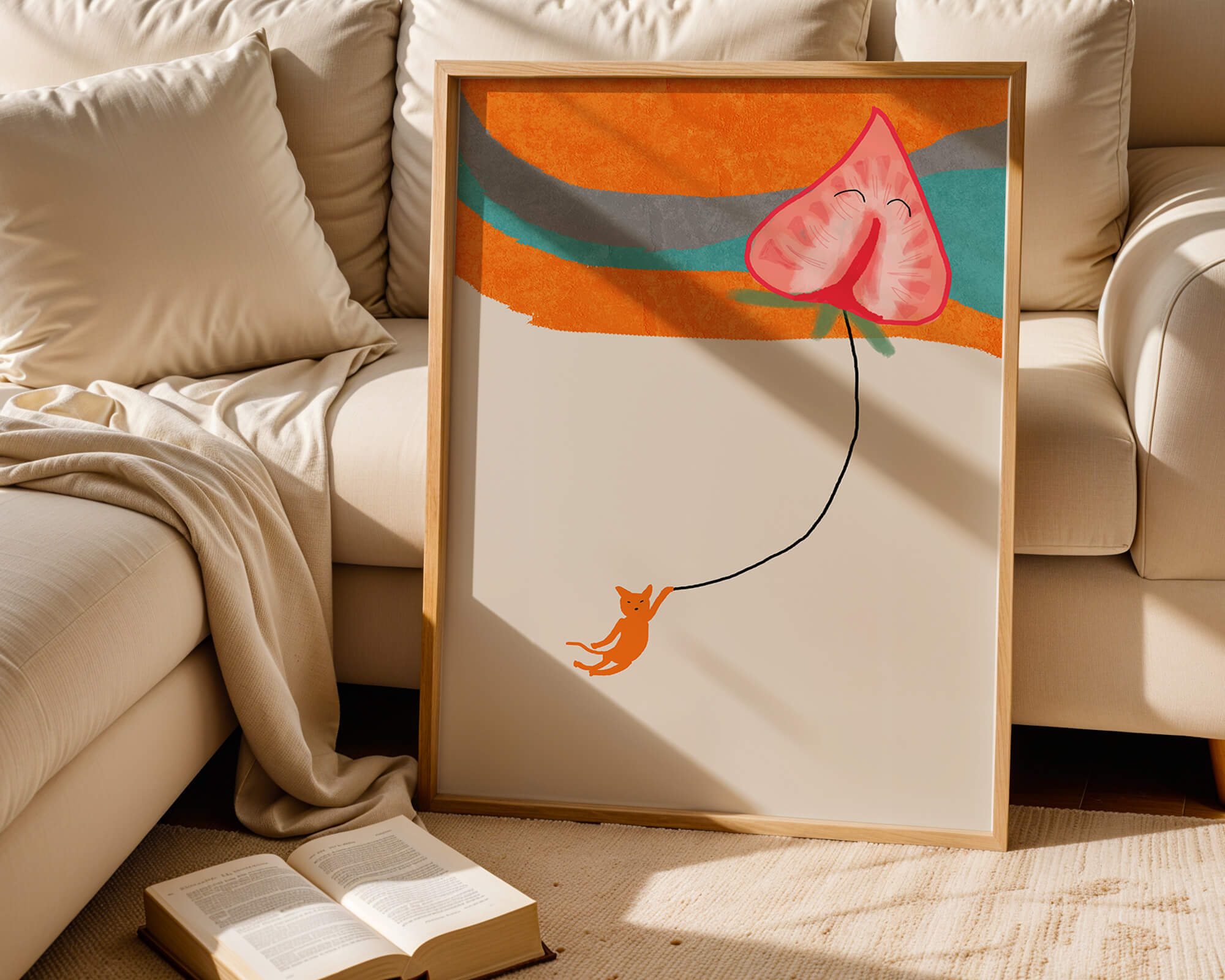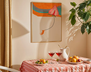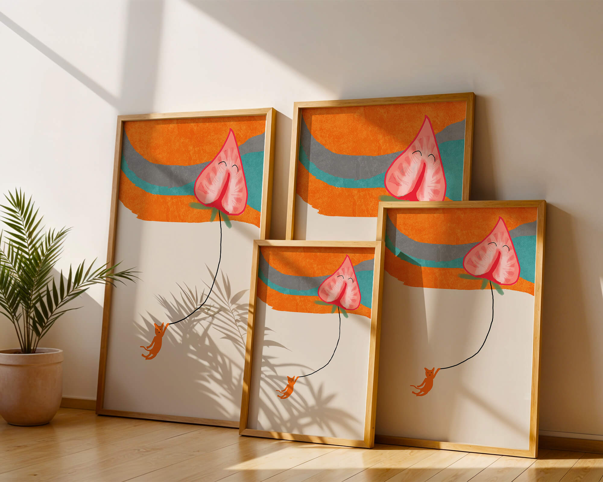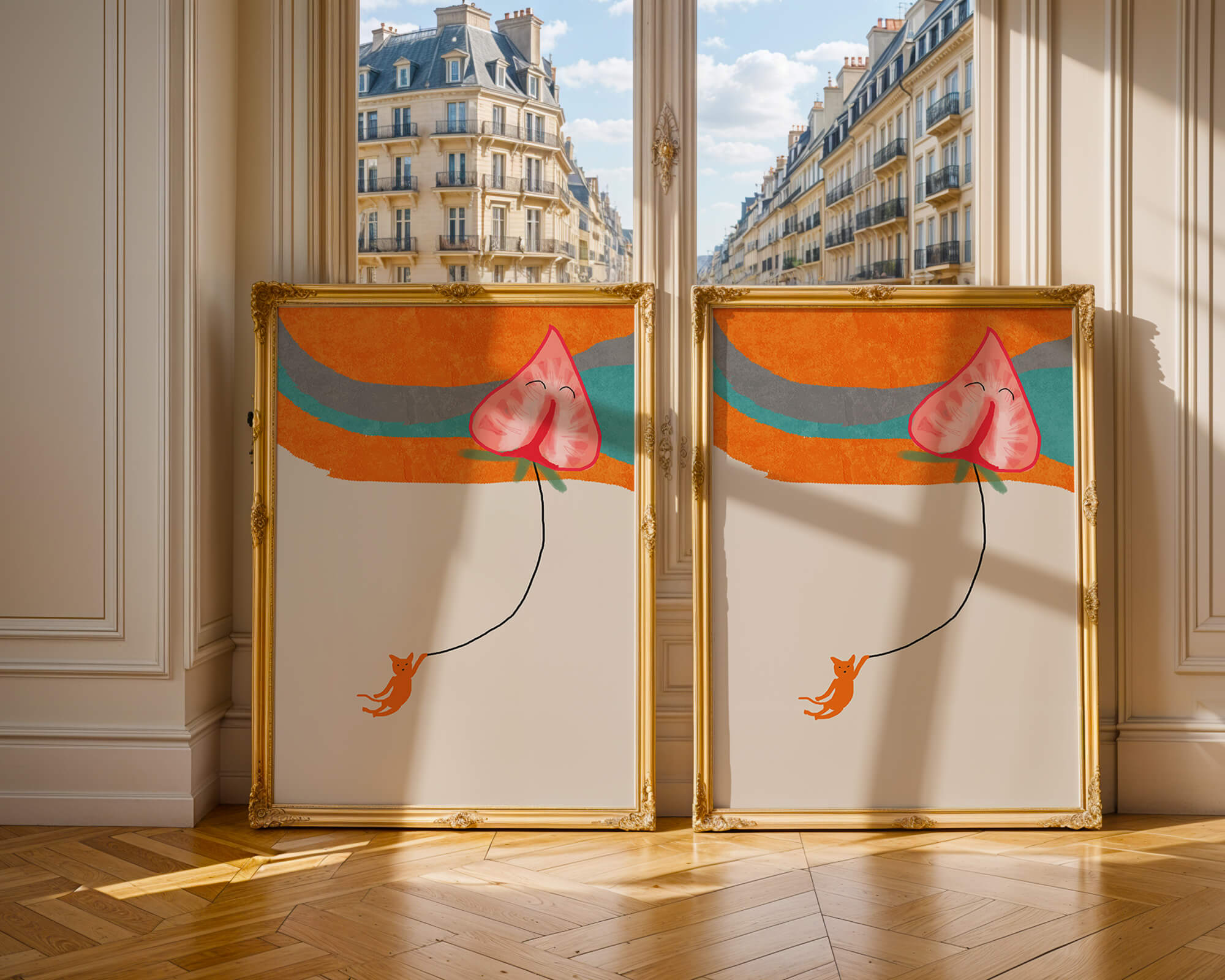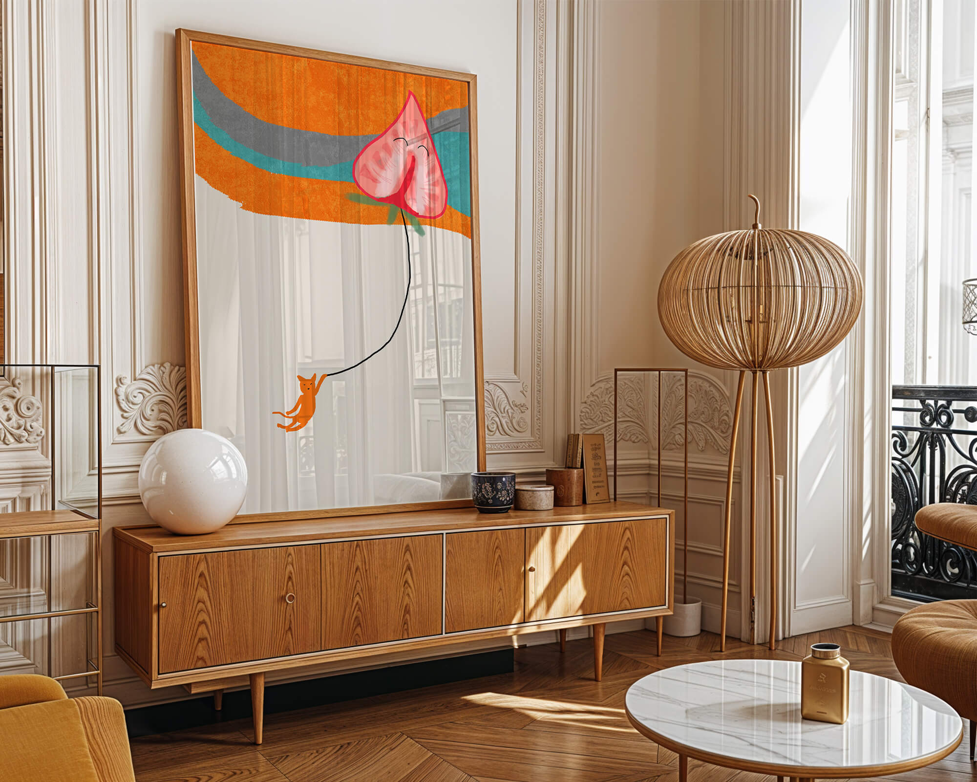 Dans cette œuvre, l'association de formes abstraites et de couleurs vives attire le regard. Le chat orange, suspendu à un ballon en forme de cœur, apporte une touche de fantaisie, contrastant joliment avec le fond coloré. La simplicité du design renforce son charme ludique tout en conservant une esthétique attrayante. Cette œuvre est un parfait exemple d'art moderne et décoratif qui apporte une touche de couleur et de gaieté à tout espace. Qu'elle soit accrochée dans un salon ou une chambre d'enfant, elle saura susciter le sourire et stimuler l'imagination.| Taper |