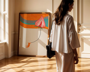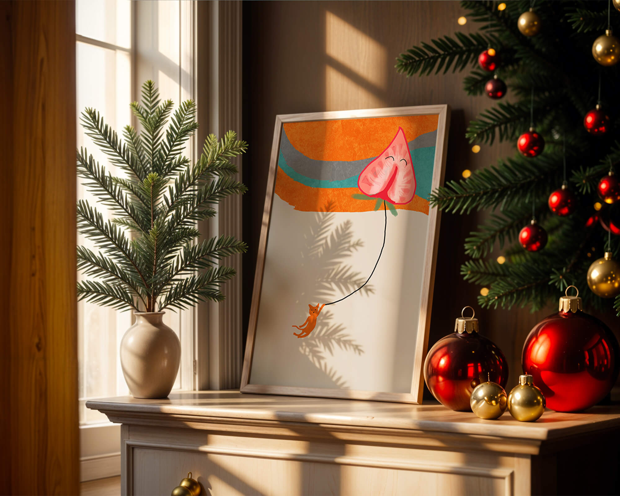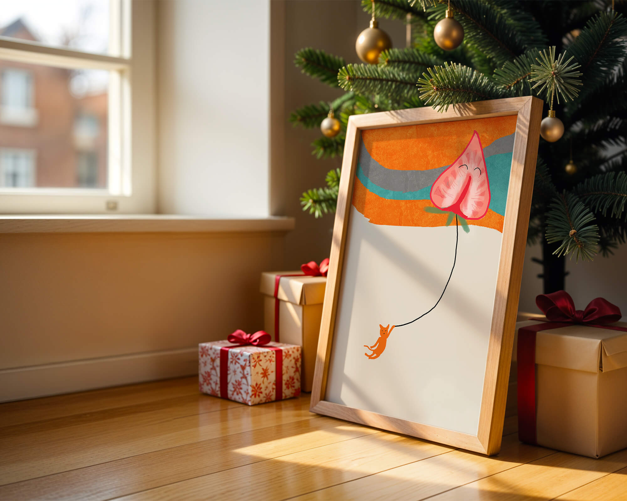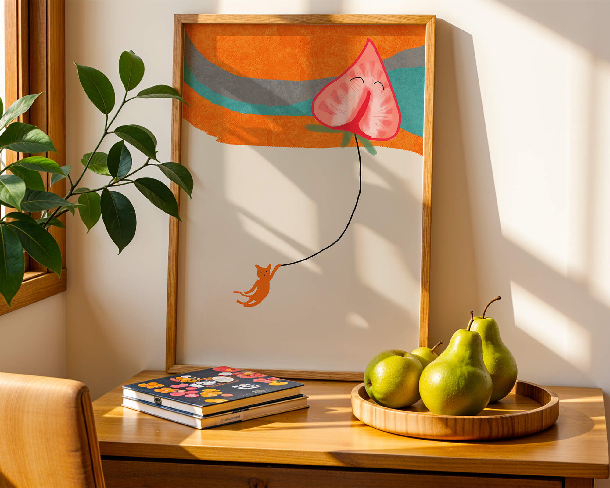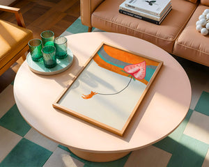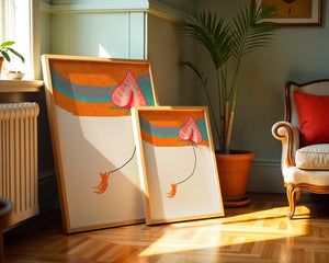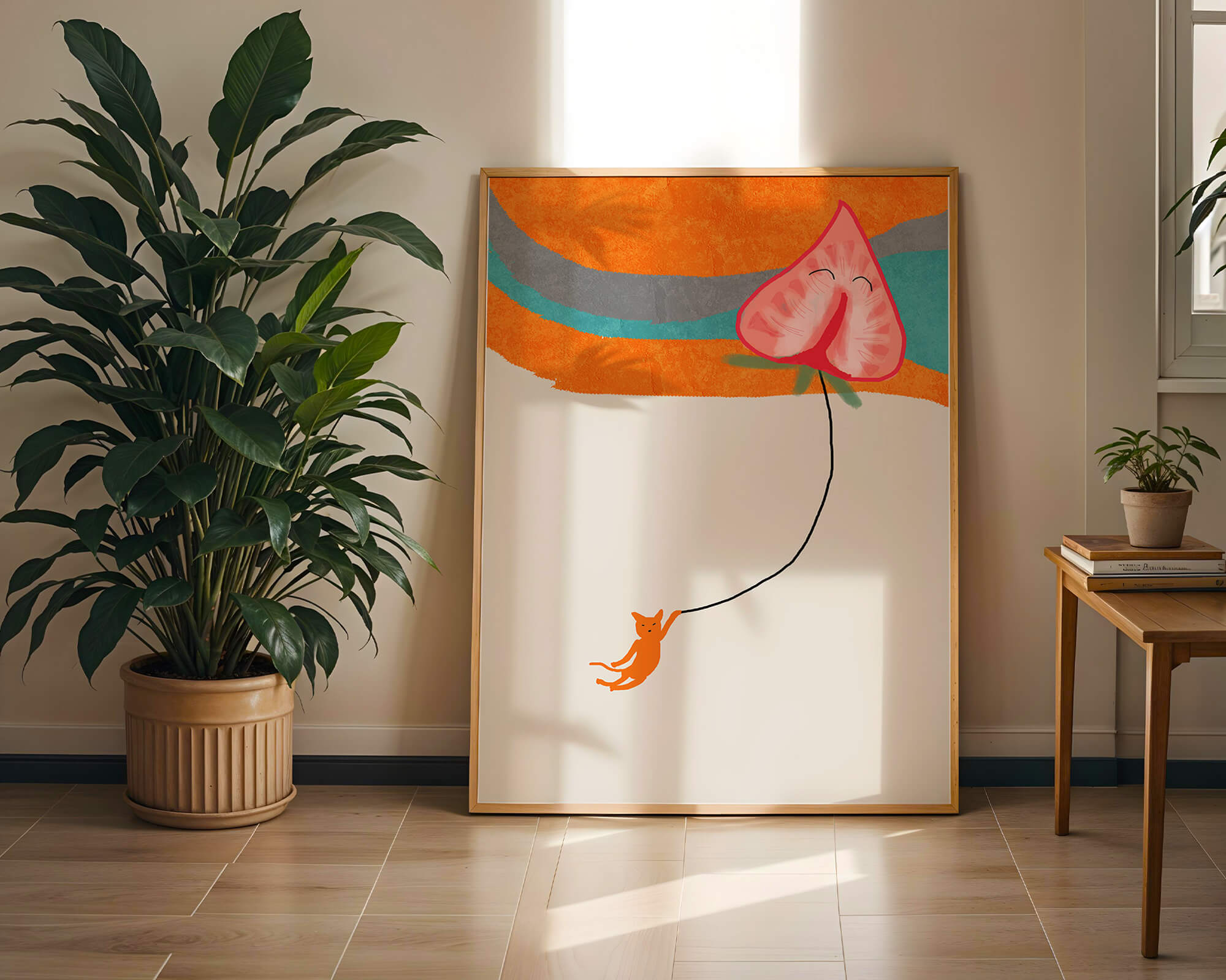 Dans cette œuvre, l'association de formes abstraites et de couleurs vives attire le regard. Le chat orange, suspendu à un ballon en forme de cœur, apporte une touche de fantaisie, contrastant joliment avec le fond coloré. La simplicité du design renforce son charme ludique tout en conservant une esthétique attrayante. Cette œuvre est un parfait exemple d'art moderne et décoratif qui apporte une touche de couleur et de gaieté à tout espace. Qu'elle soit accrochée dans un salon ou une chambre d'enfant, elle saura susciter le sourire et stimuler l'imagination.| Taper |