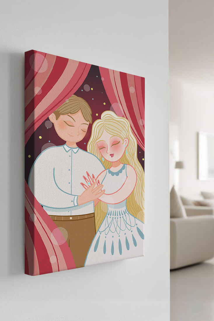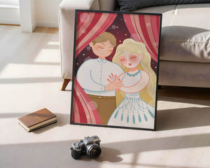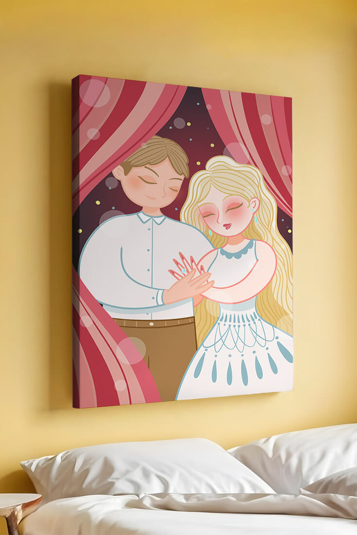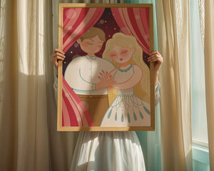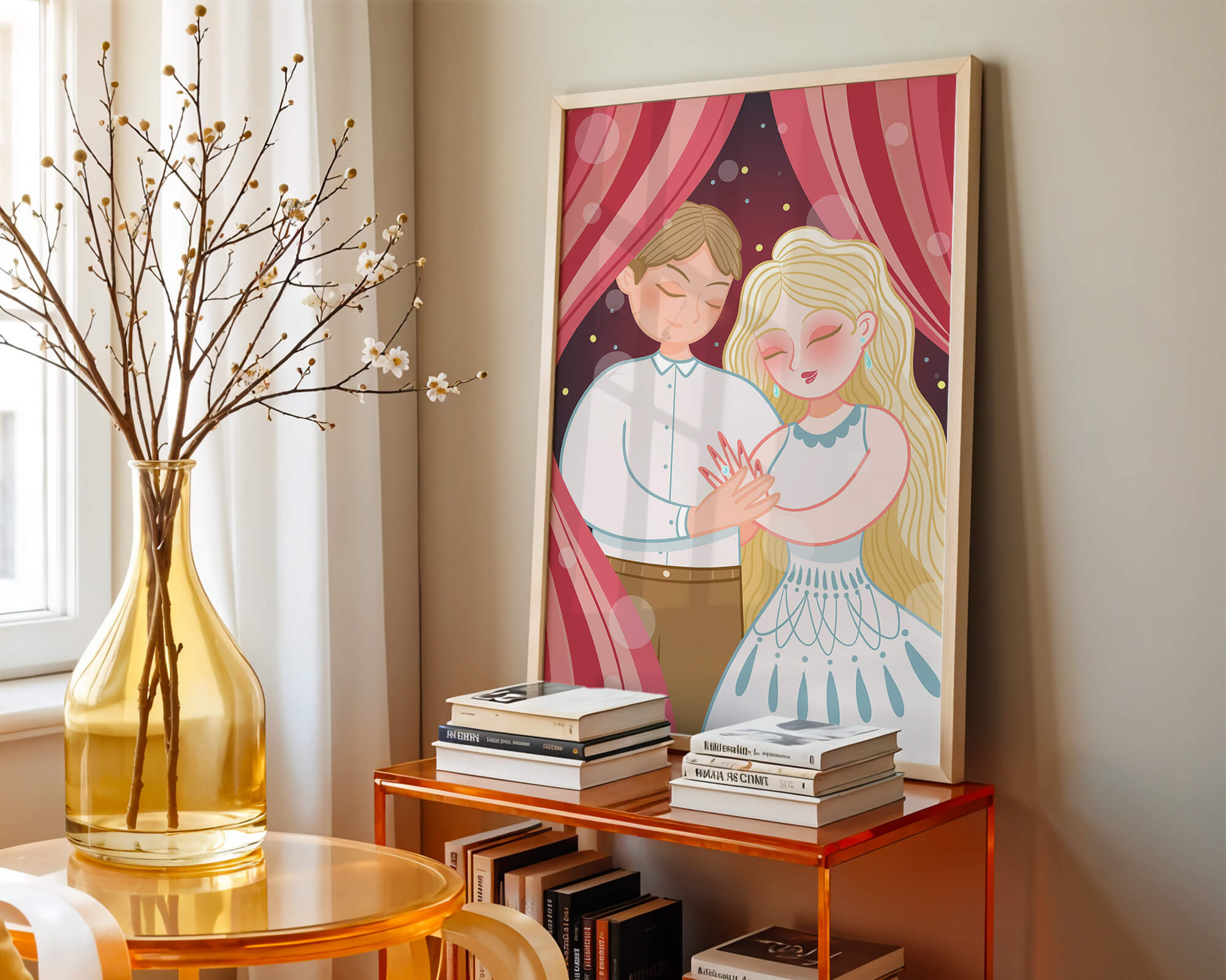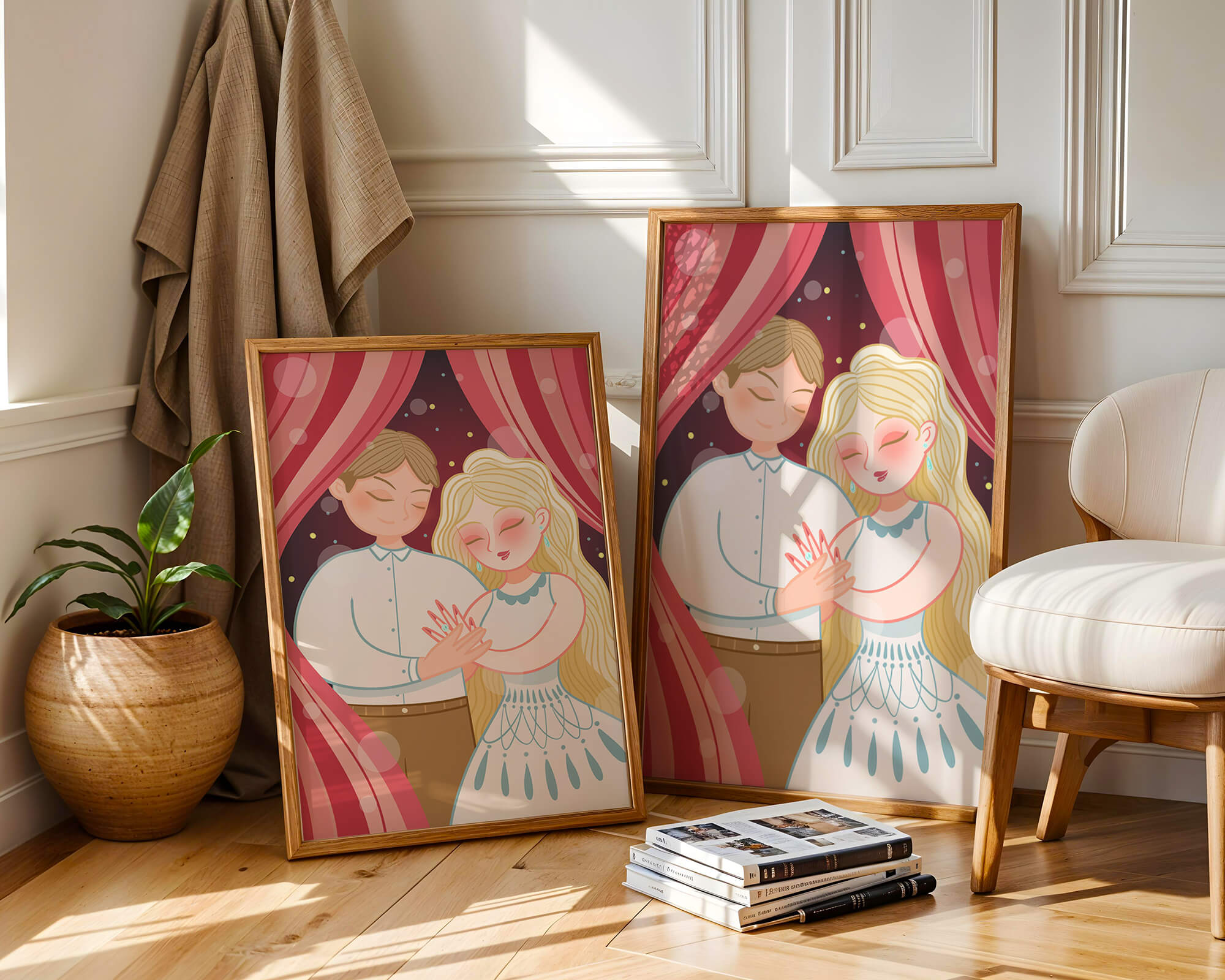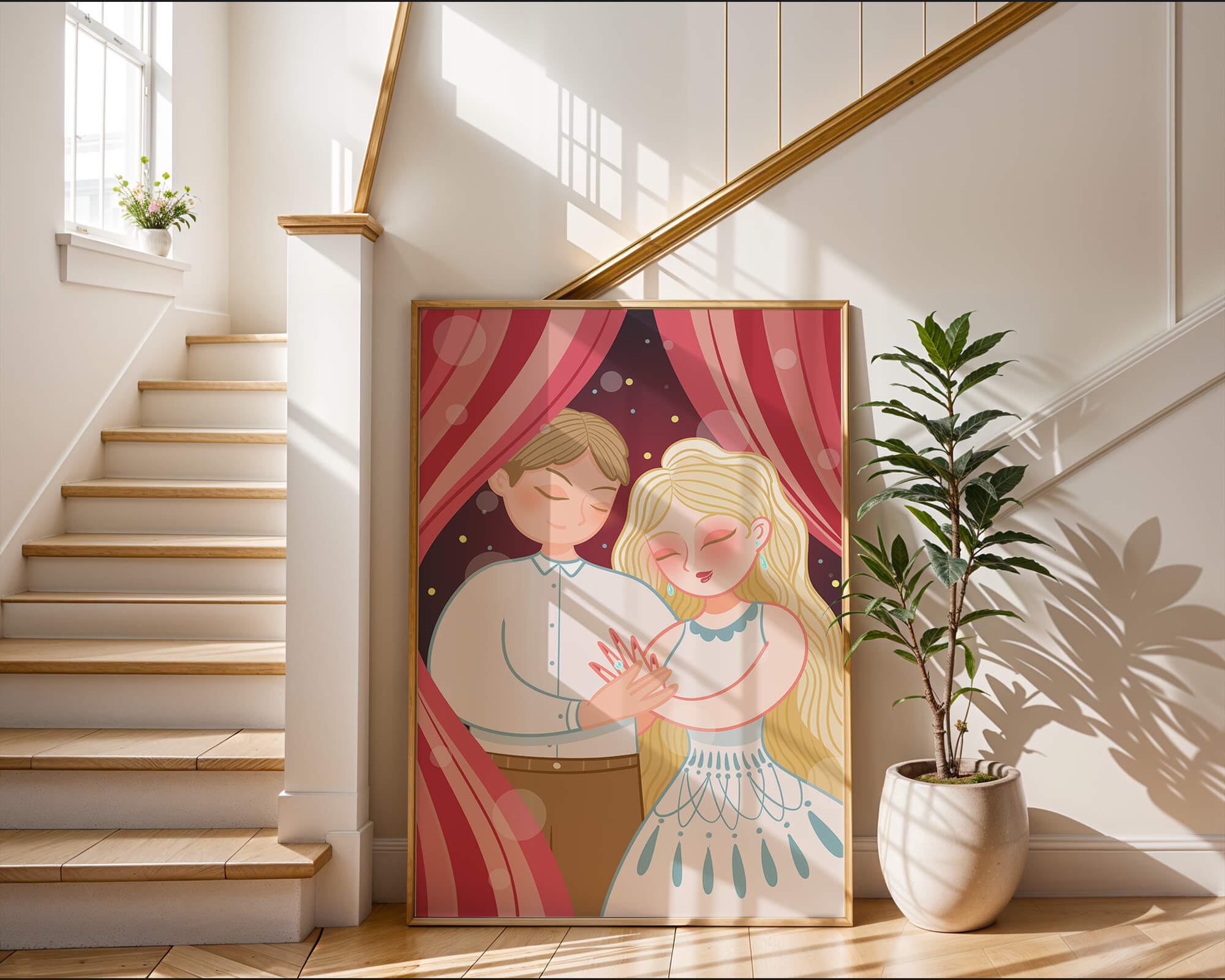 Dans cette illustration captivante, un homme et une femme sont représentés dans une étreinte intime, leurs expressions exprimant chaleur et contentement. Les yeux de l'homme sont doucement clos, soulignant la tendresse du moment. La femme, aux longs cheveux blonds flottants, est vêtue d'une robe blanche aux motifs délicats, ajoutant une touche de sophistication à la scène. L'ambiance est renforcée par la présence de rideaux rouges stylisés qui encadrent le couple, suggérant une ambiance théâtrale ou festive. L'utilisation de couleurs chaudes et de lignes douces crée une atmosphère onirique, presque fantaisiste, invitant le spectateur à un moment intime d'amour et d'harmonie.| Taper |