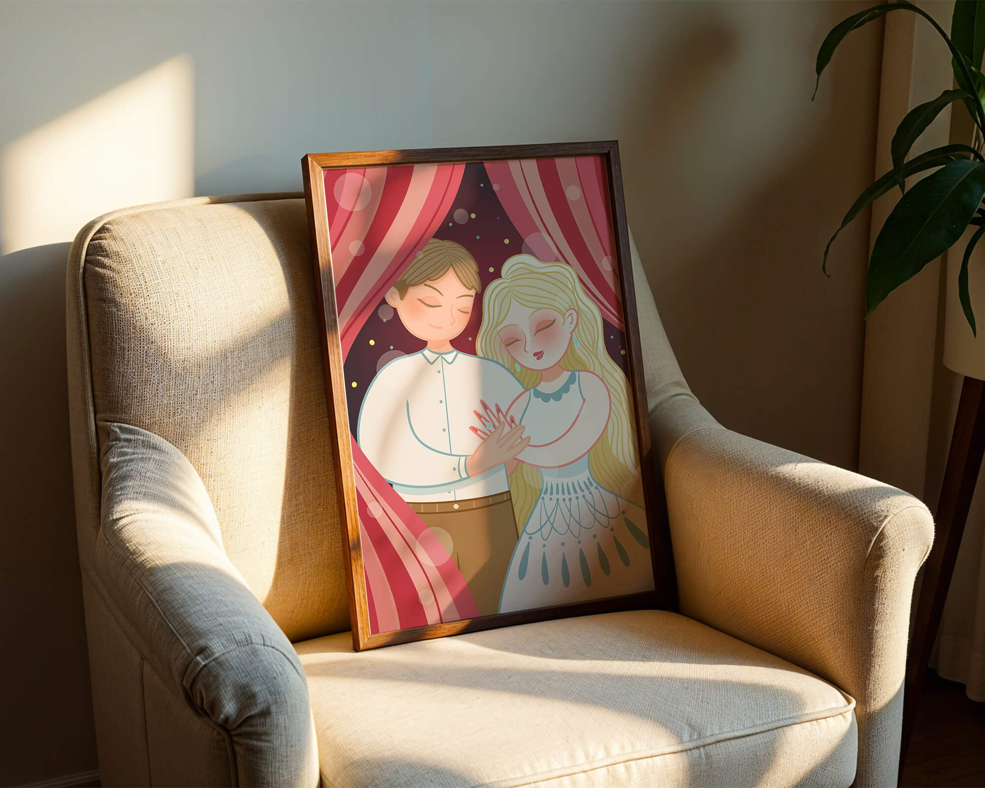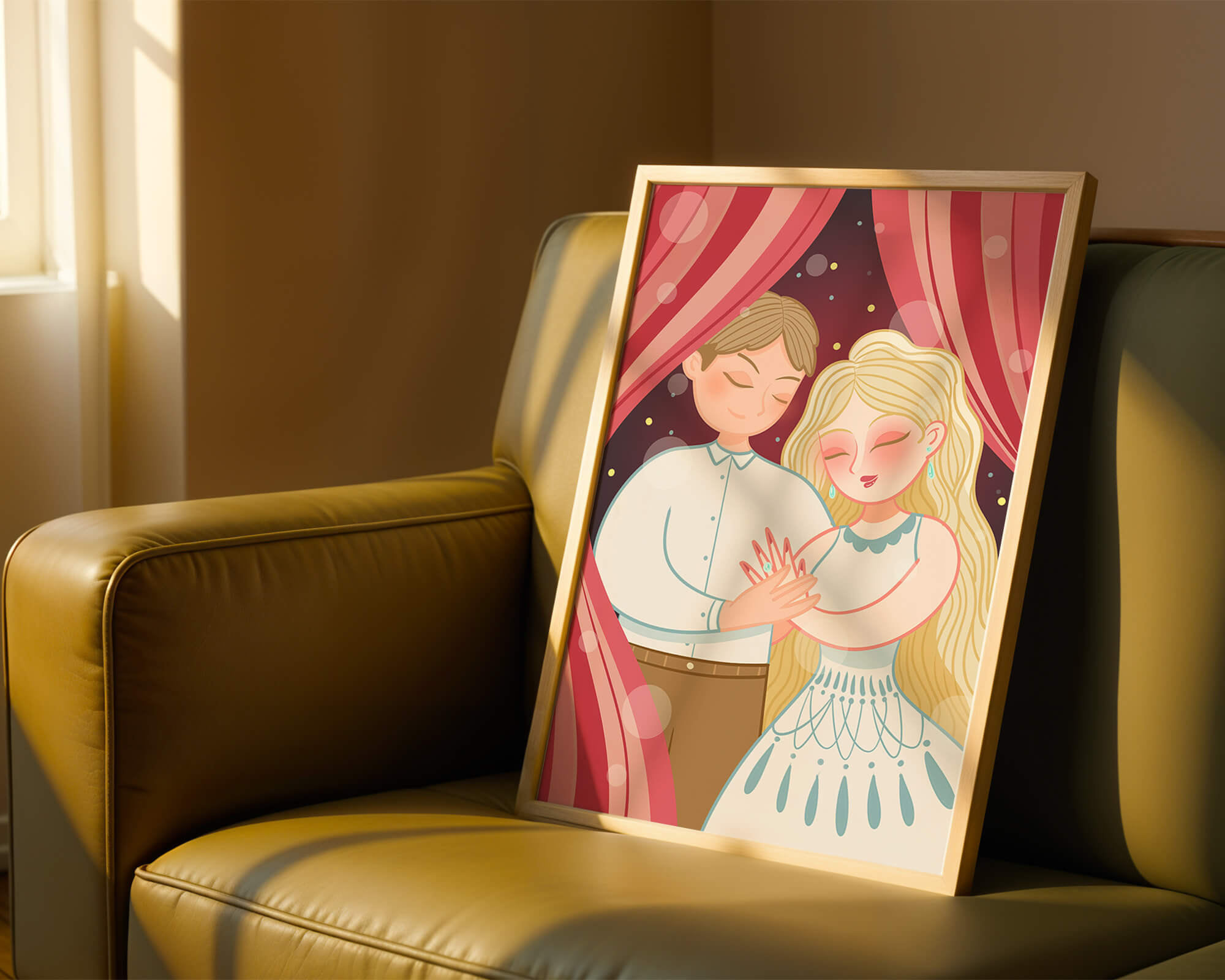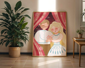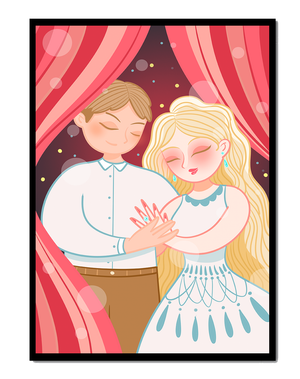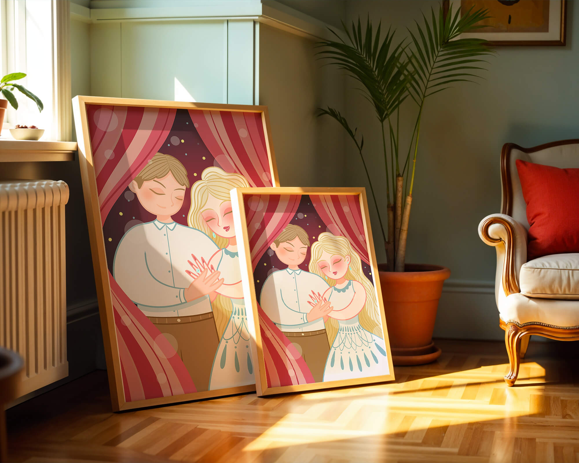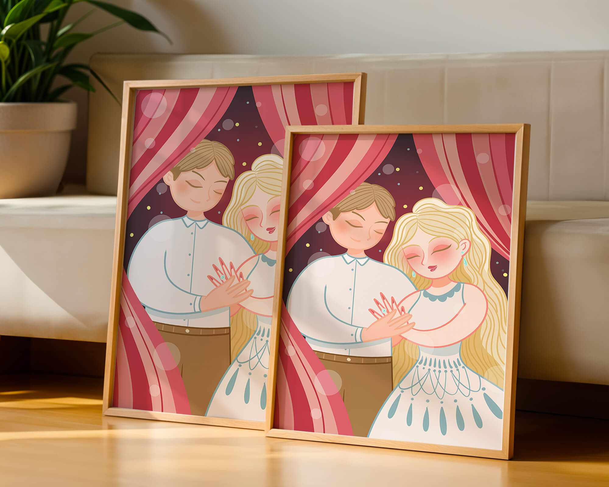 Dans cette illustration captivante, un homme et une femme sont représentés dans une étreinte intime, leurs expressions exprimant chaleur et contentement. Les yeux de l'homme sont doucement clos, soulignant la tendresse du moment. La femme, aux longs cheveux blonds flottants, est vêtue d'une robe blanche aux motifs délicats, ajoutant une touche de sophistication à la scène. L'ambiance est renforcée par la présence de rideaux rouges stylisés qui encadrent le couple, suggérant une ambiance théâtrale ou festive. L'utilisation de couleurs chaudes et de lignes douces crée une atmosphère onirique, presque fantaisiste, invitant le spectateur à un moment intime d'amour et d'harmonie.| Taper |