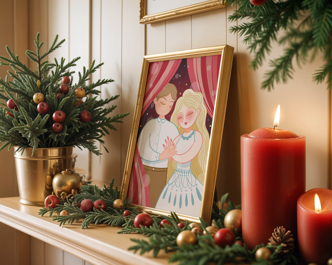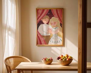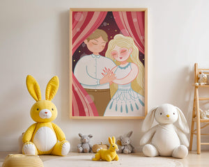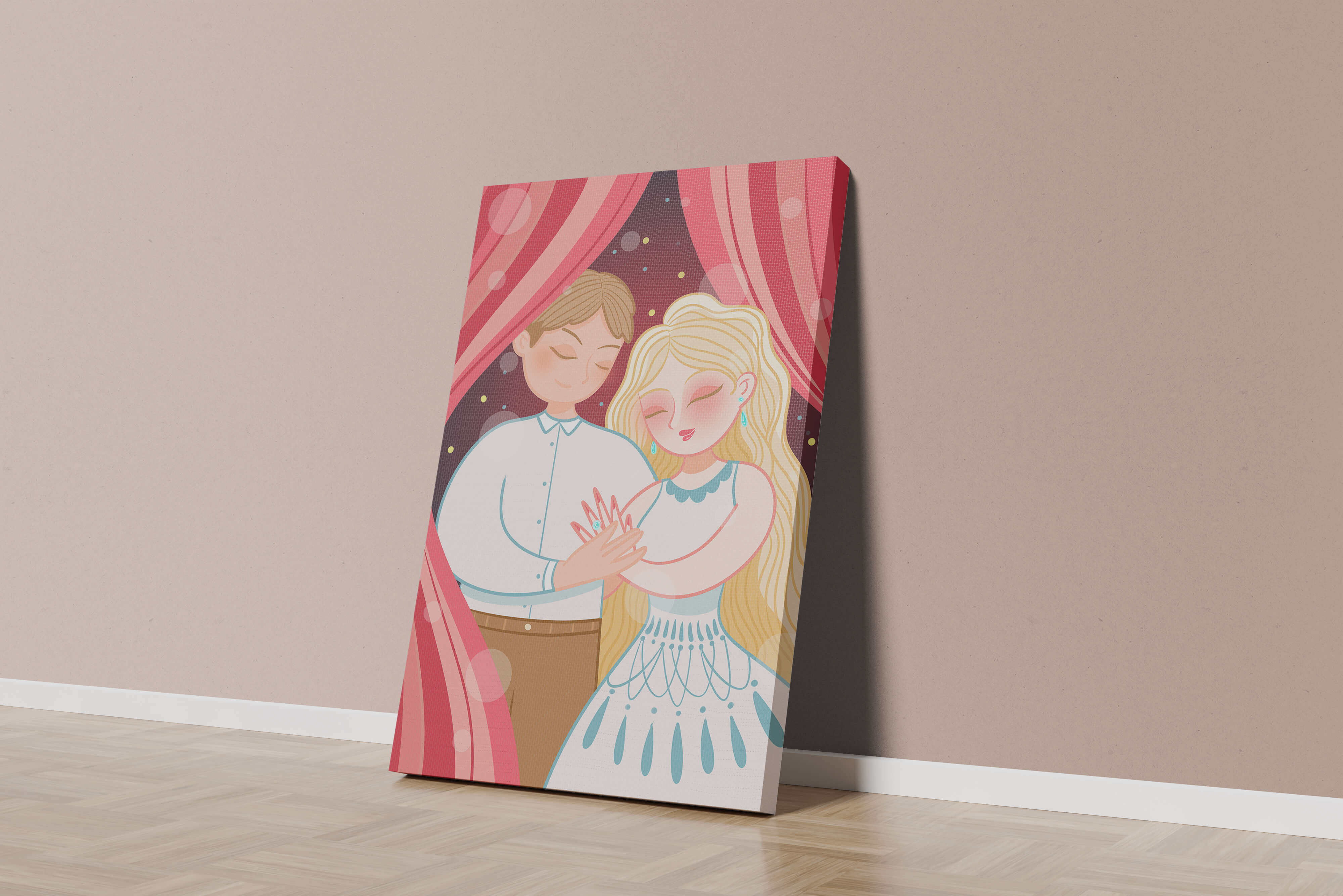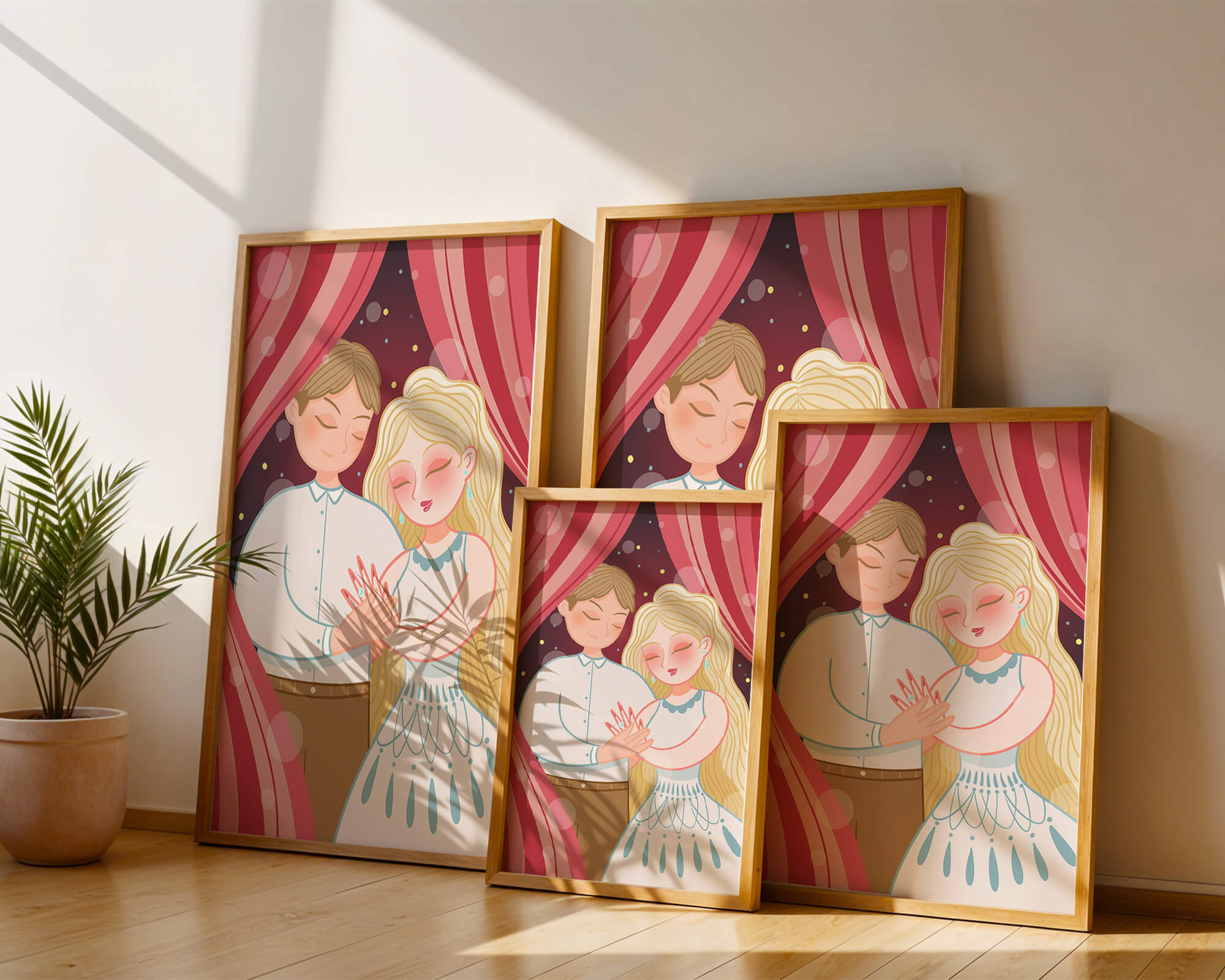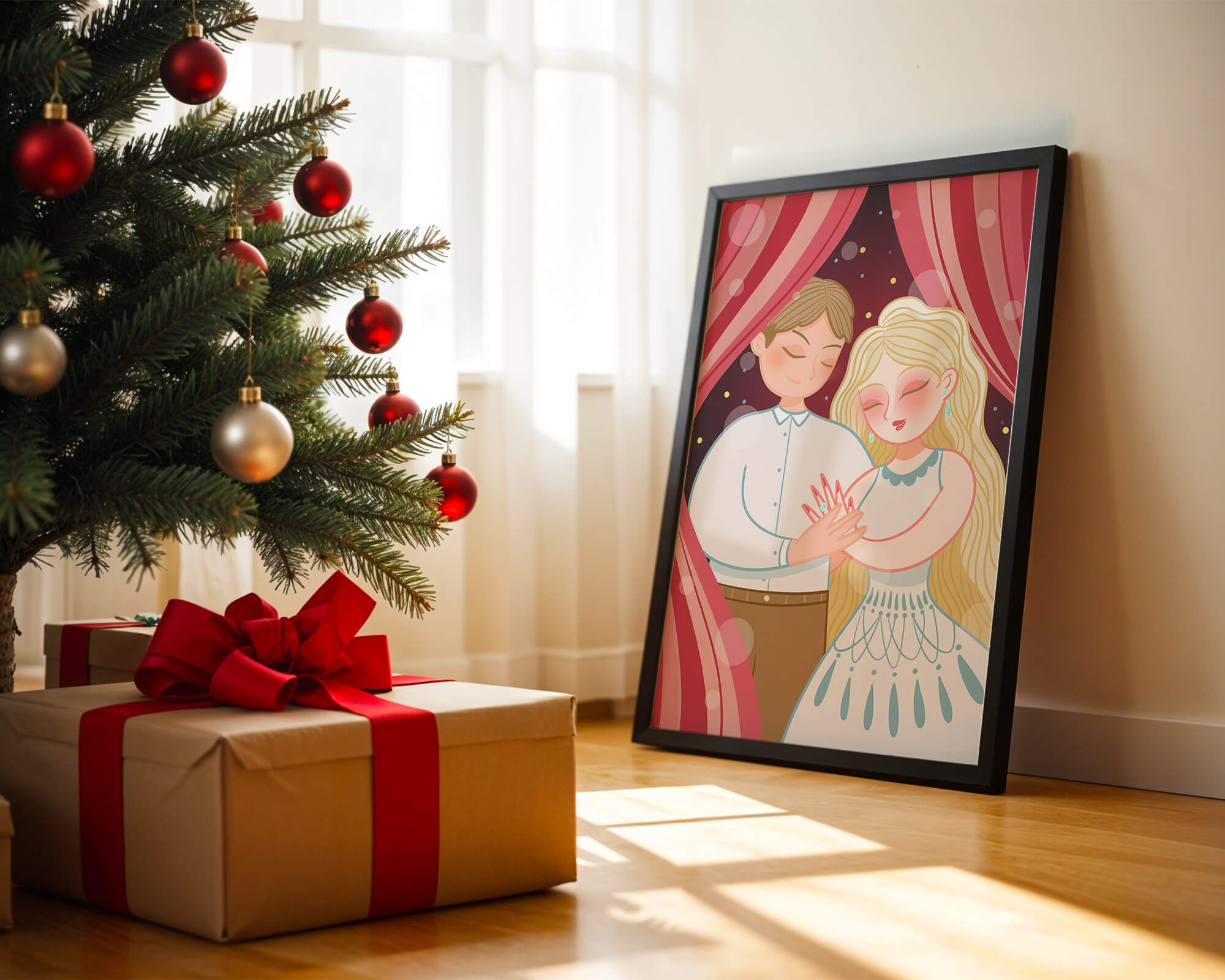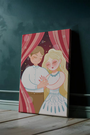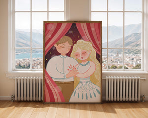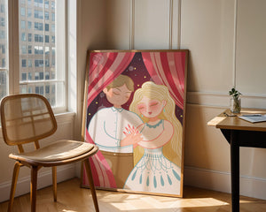 Dans cette illustration captivante, un homme et une femme sont représentés dans une étreinte intime, leurs expressions exprimant chaleur et contentement. Les yeux de l'homme sont doucement clos, soulignant la tendresse du moment. La femme, aux longs cheveux blonds flottants, est vêtue d'une robe blanche aux motifs délicats, ajoutant une touche de sophistication à la scène. L'ambiance est renforcée par la présence de rideaux rouges stylisés qui encadrent le couple, suggérant une ambiance théâtrale ou festive. L'utilisation de couleurs chaudes et de lignes douces crée une atmosphère onirique, presque fantaisiste, invitant le spectateur à un moment intime d'amour et d'harmonie.| Taper |